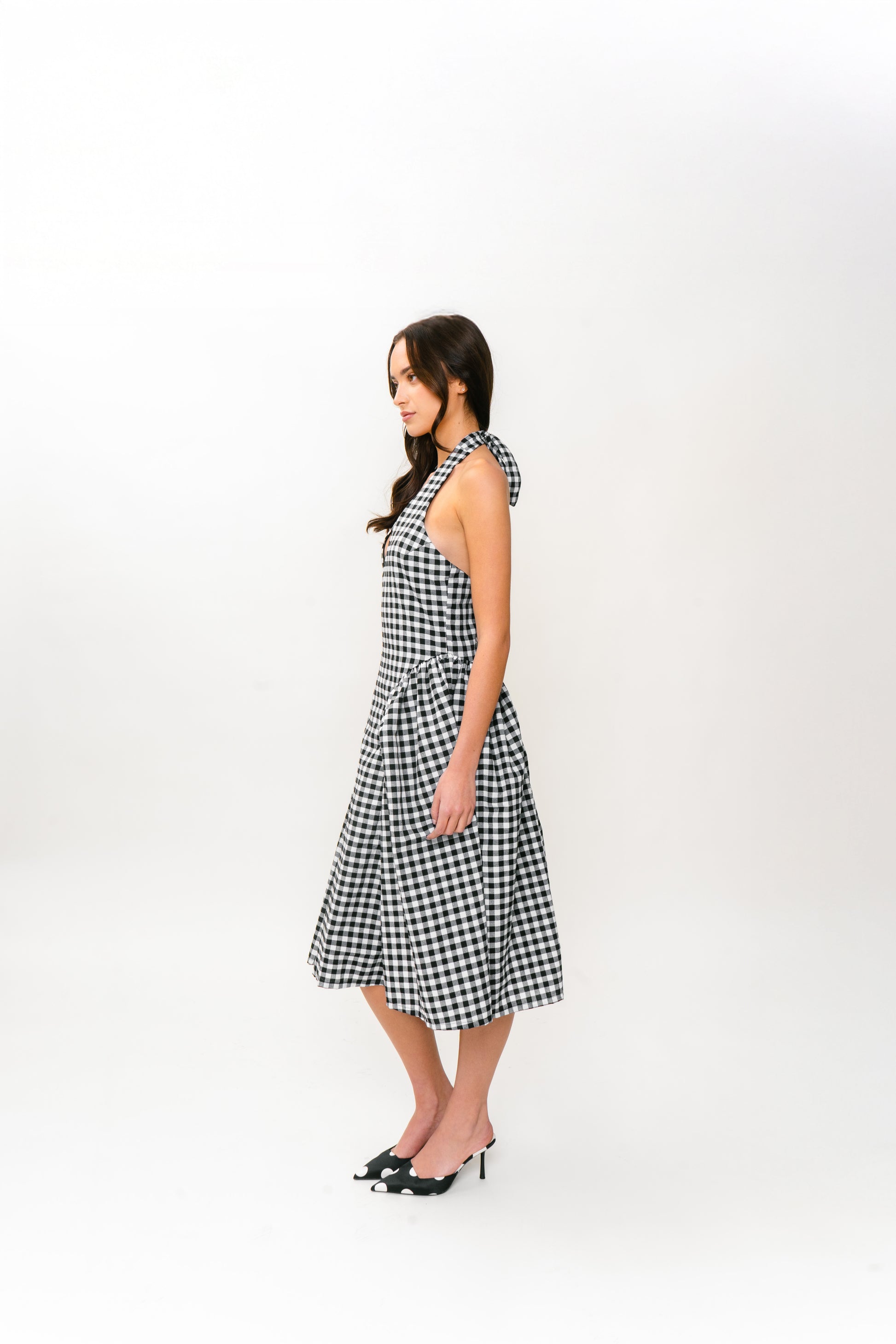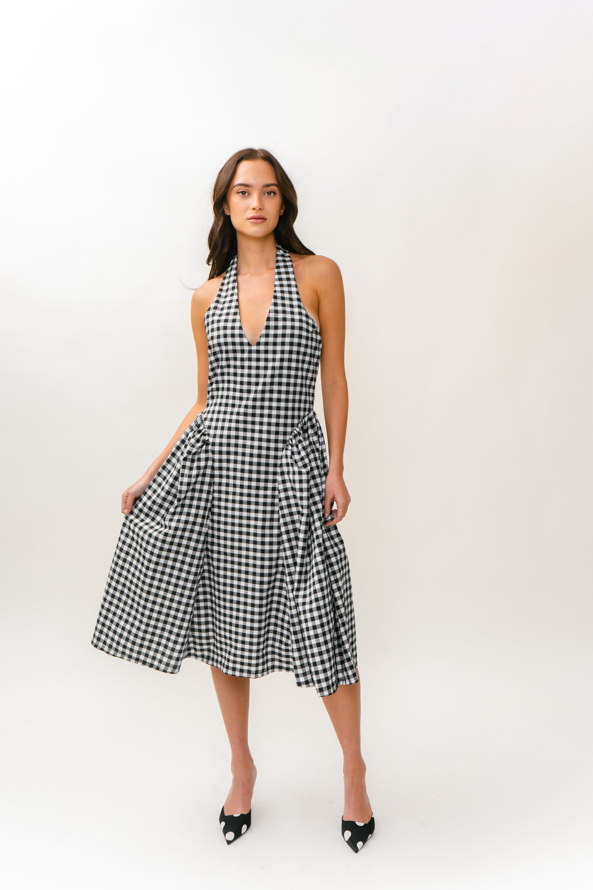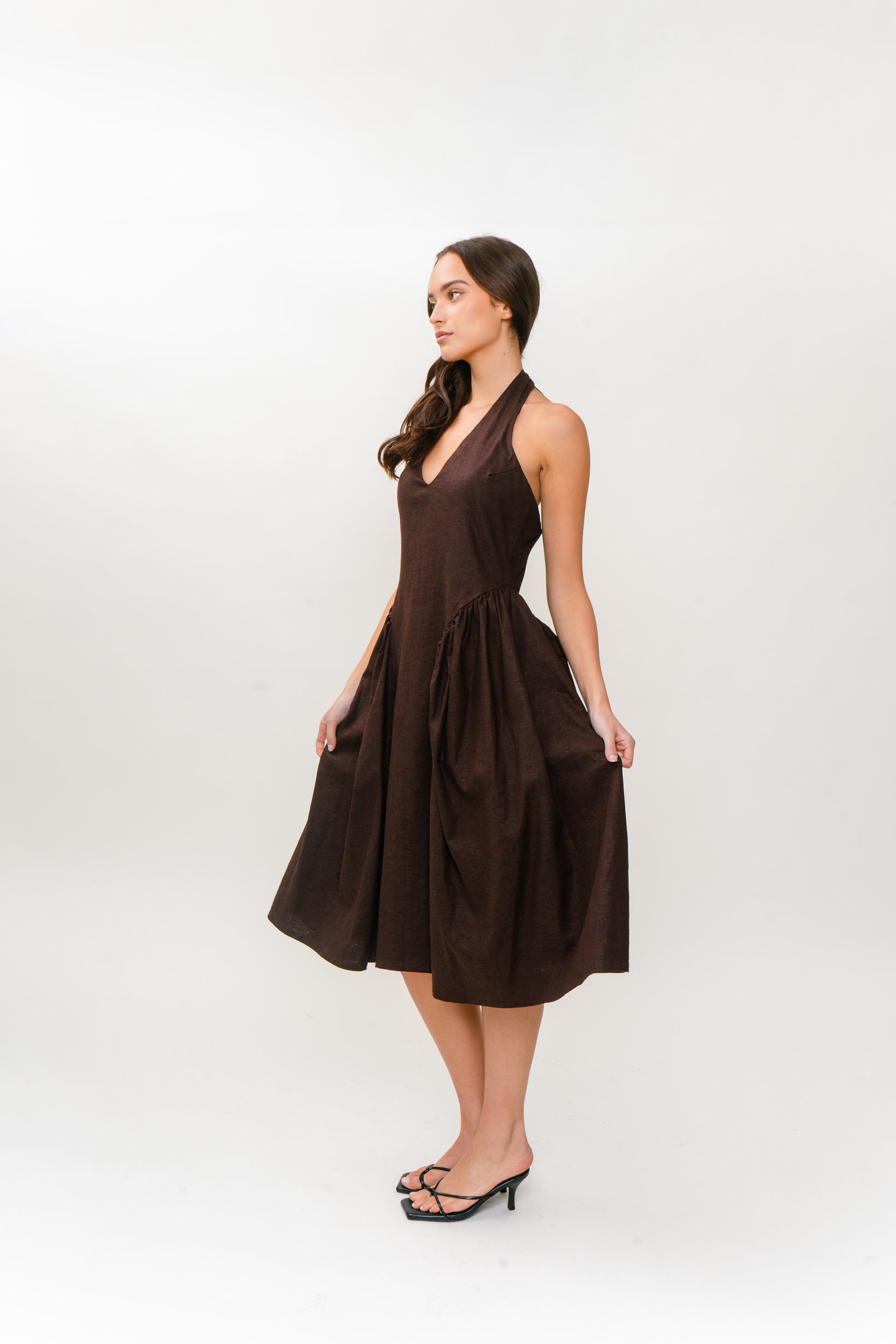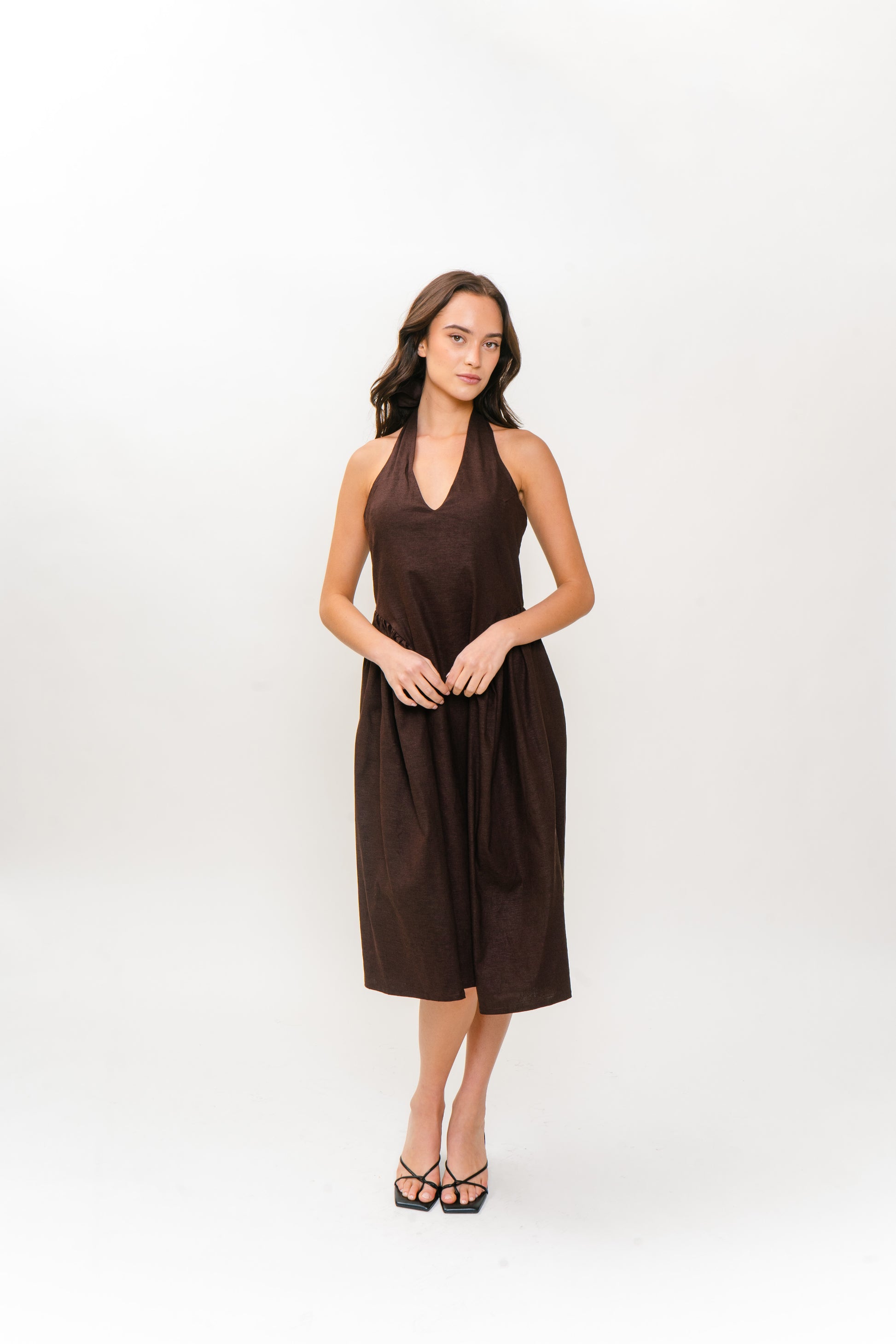 The Alima Midi Dress is an adjustable halter dress with flattering flowy pleat panel details at the waist. The dress is fully lined. Brown, Light blue and Gingham is made in Linen white Polka Dots in made in Cotton. Models wears XS.