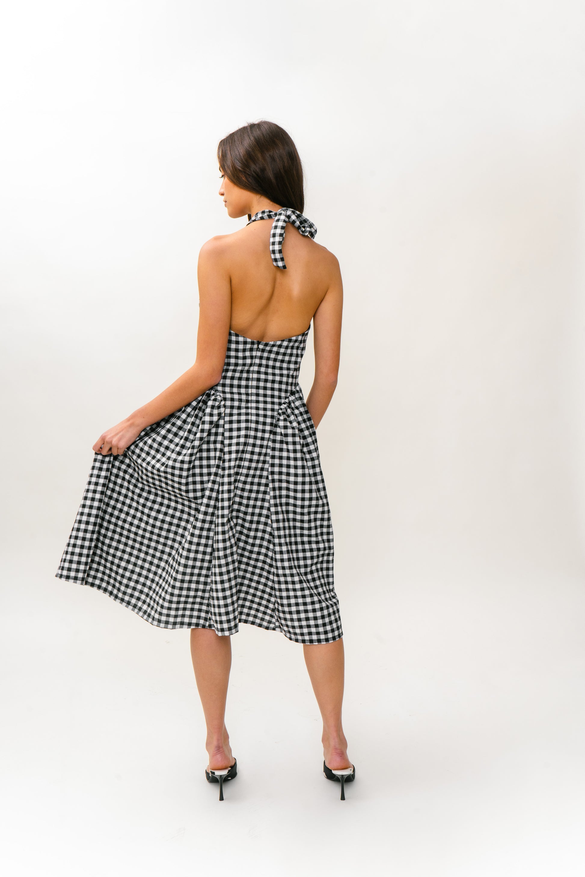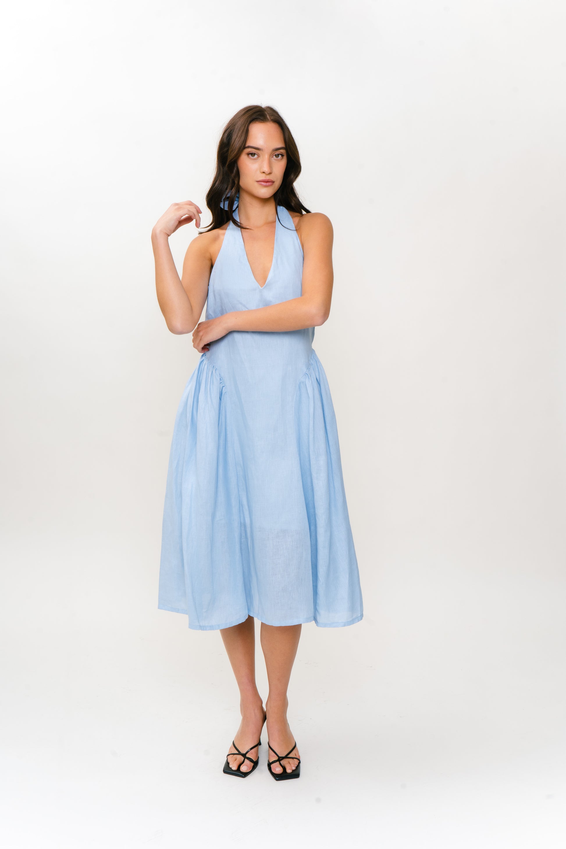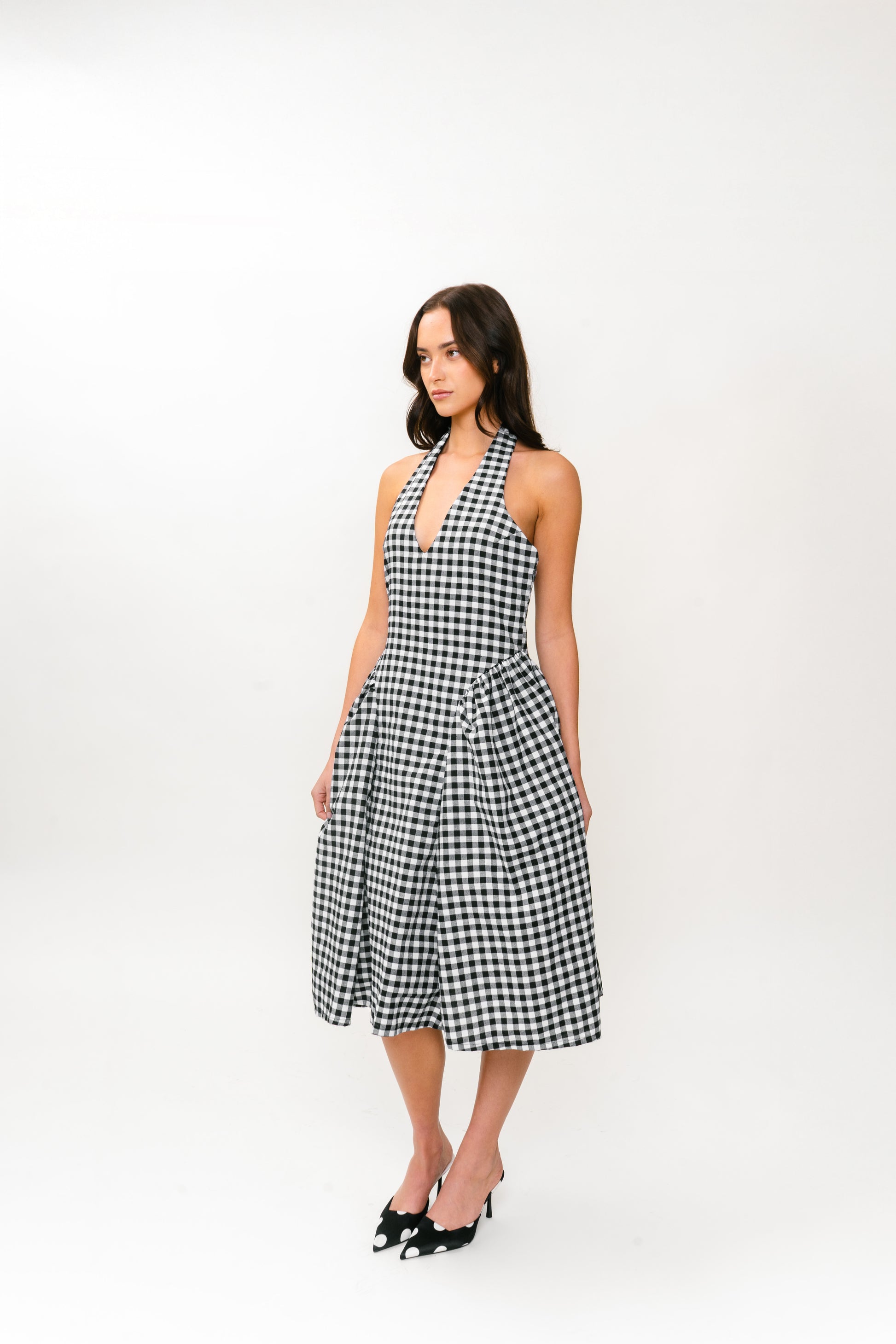 The Alima Midi Dress is an adjustable halter dress with flattering flowy pleat panel details at the waist. The dress is fully lined. Brown, Light blue and Gingham is made in Linen white Polka Dots in made in Cotton. Models wears XS.