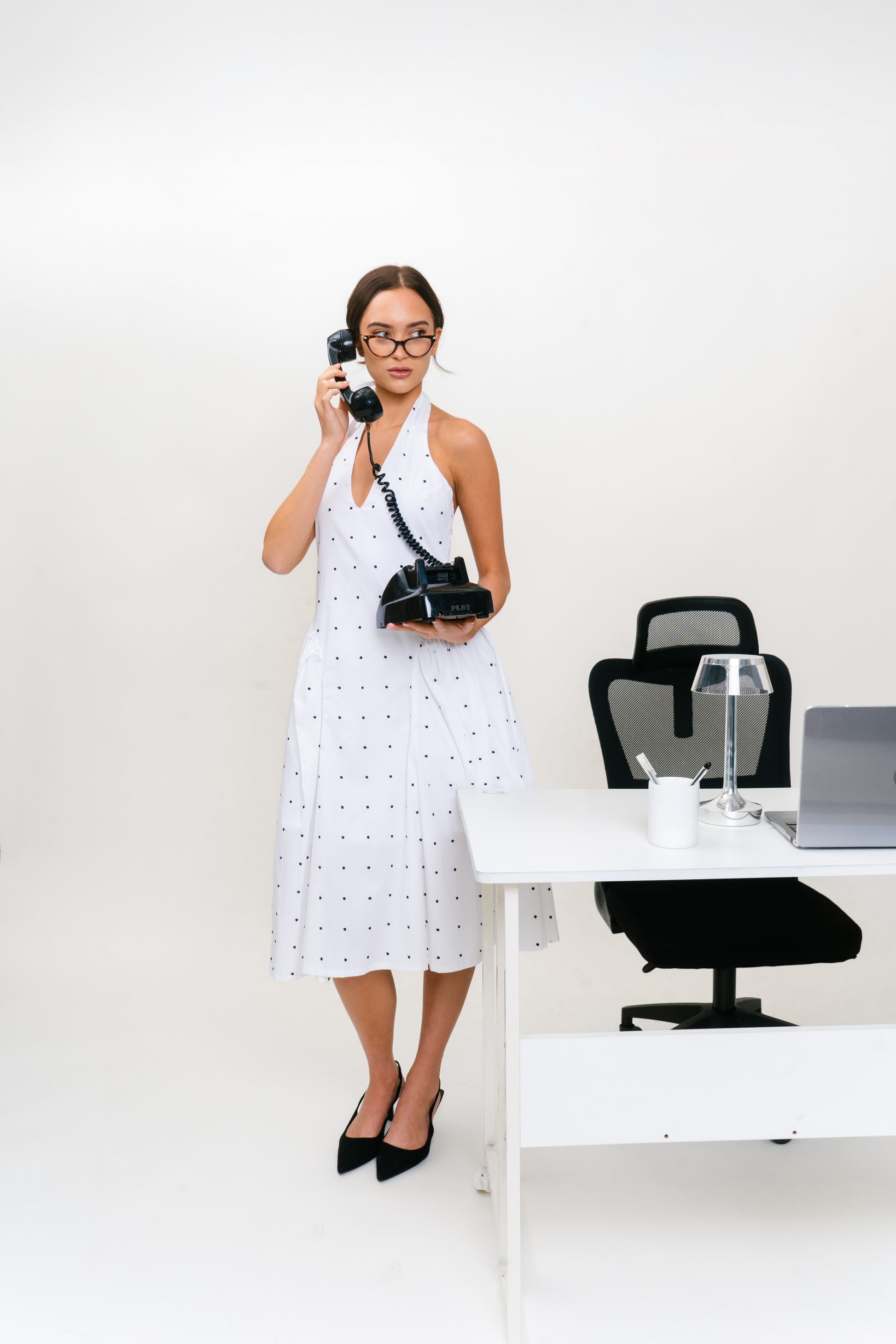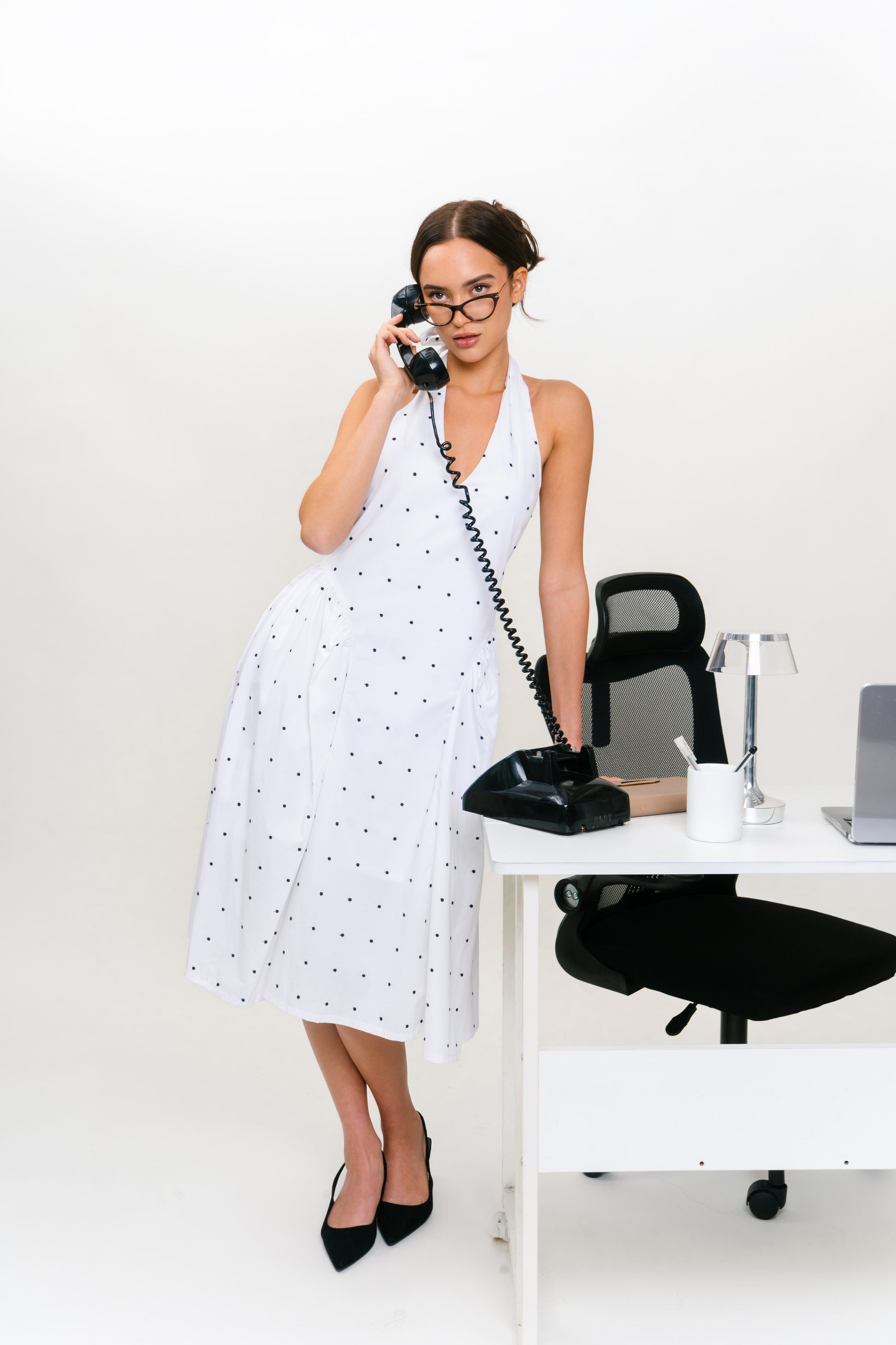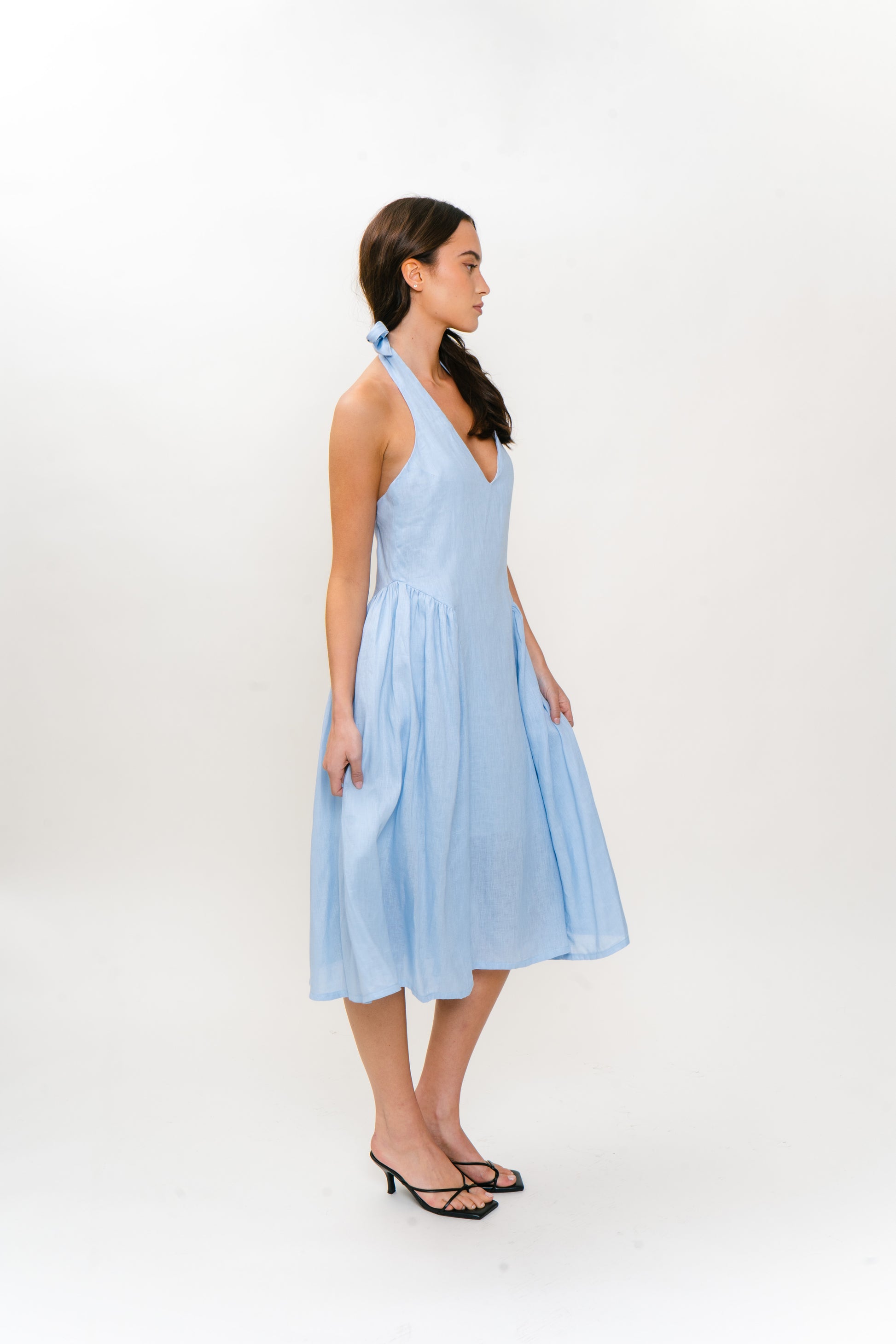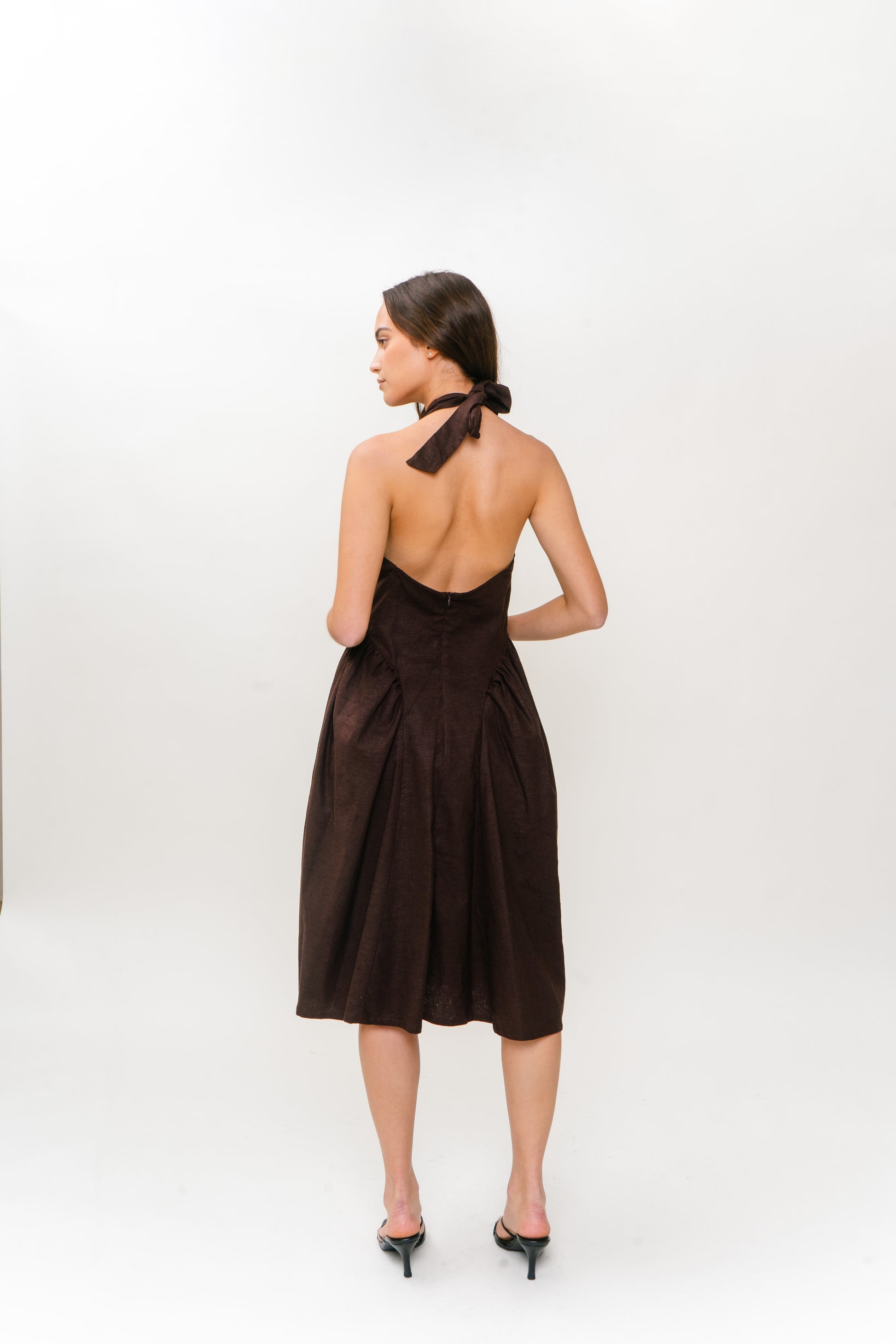 The Alima Midi Dress is an adjustable halter dress with flattering flowy pleat panel details at the waist. The dress is fully lined. Brown, Light blue and Gingham is made in Linen white Polka Dots in made in Cotton. Models wears XS.