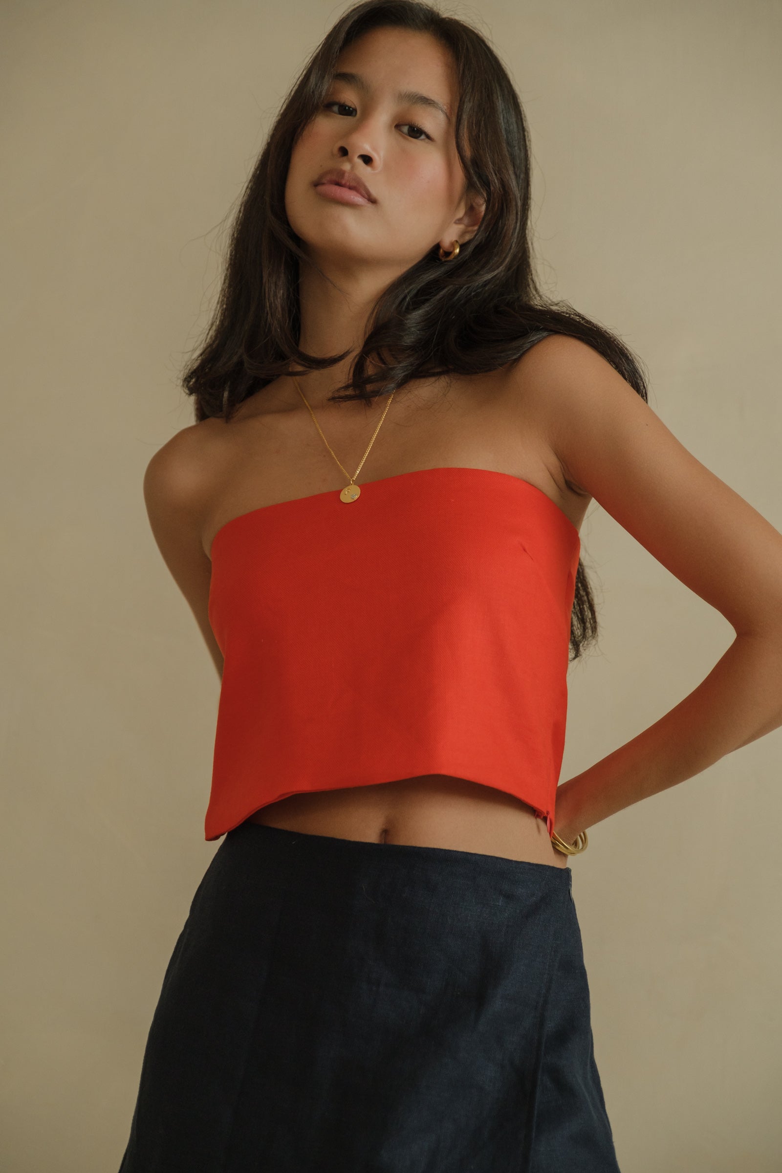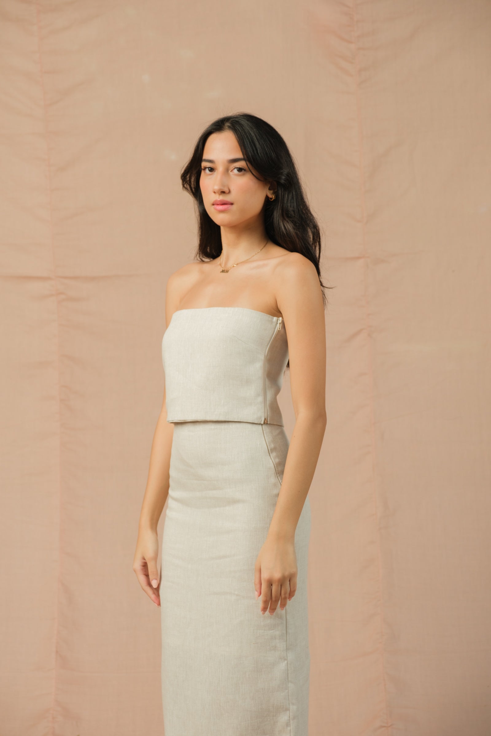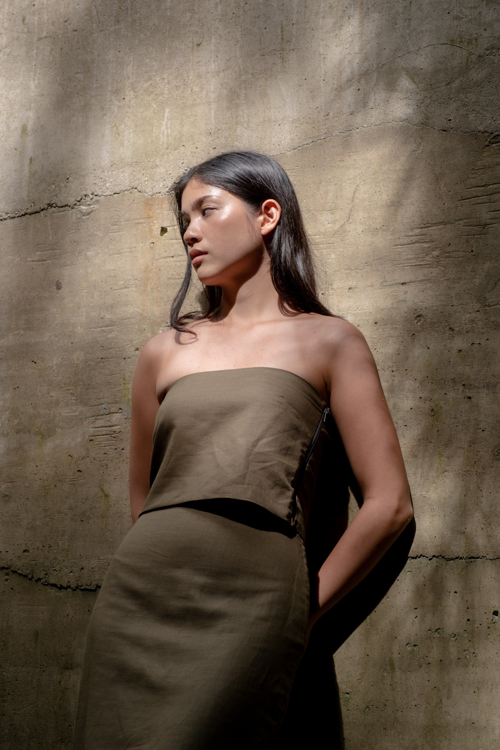 A tube top you can dress up or down. Features a side zipper and adjustable back for easy wear. Can be worn either front or back. Models wear Extra Small. Made in Cotton Linen.