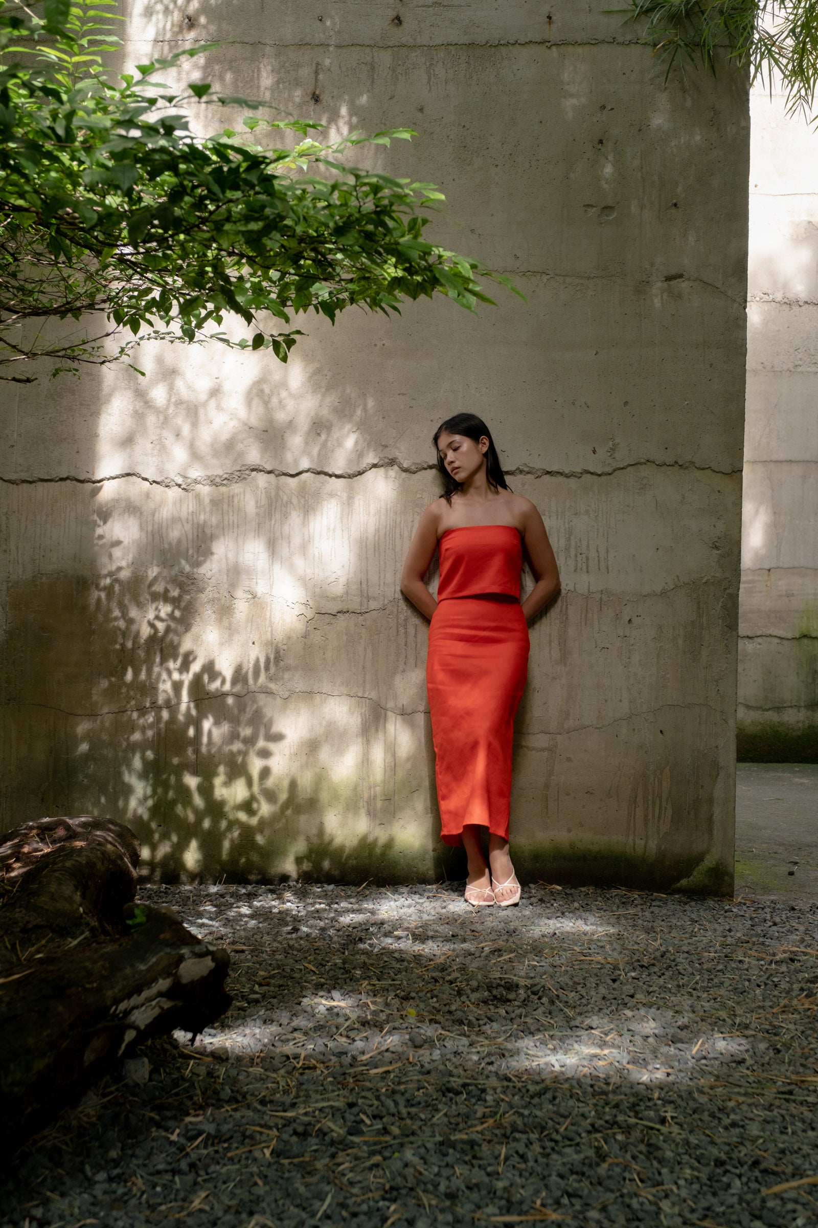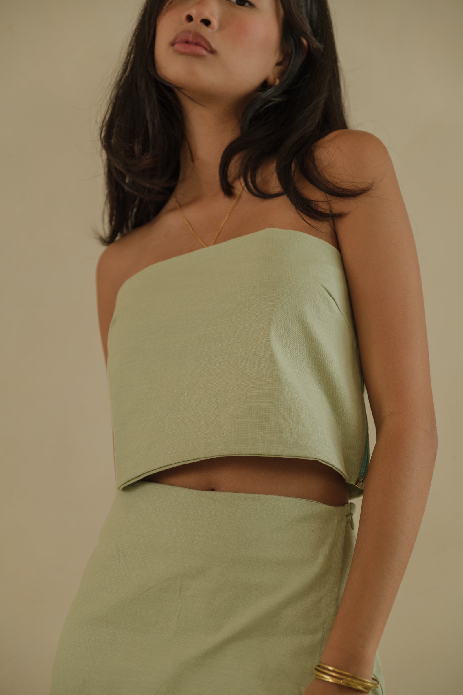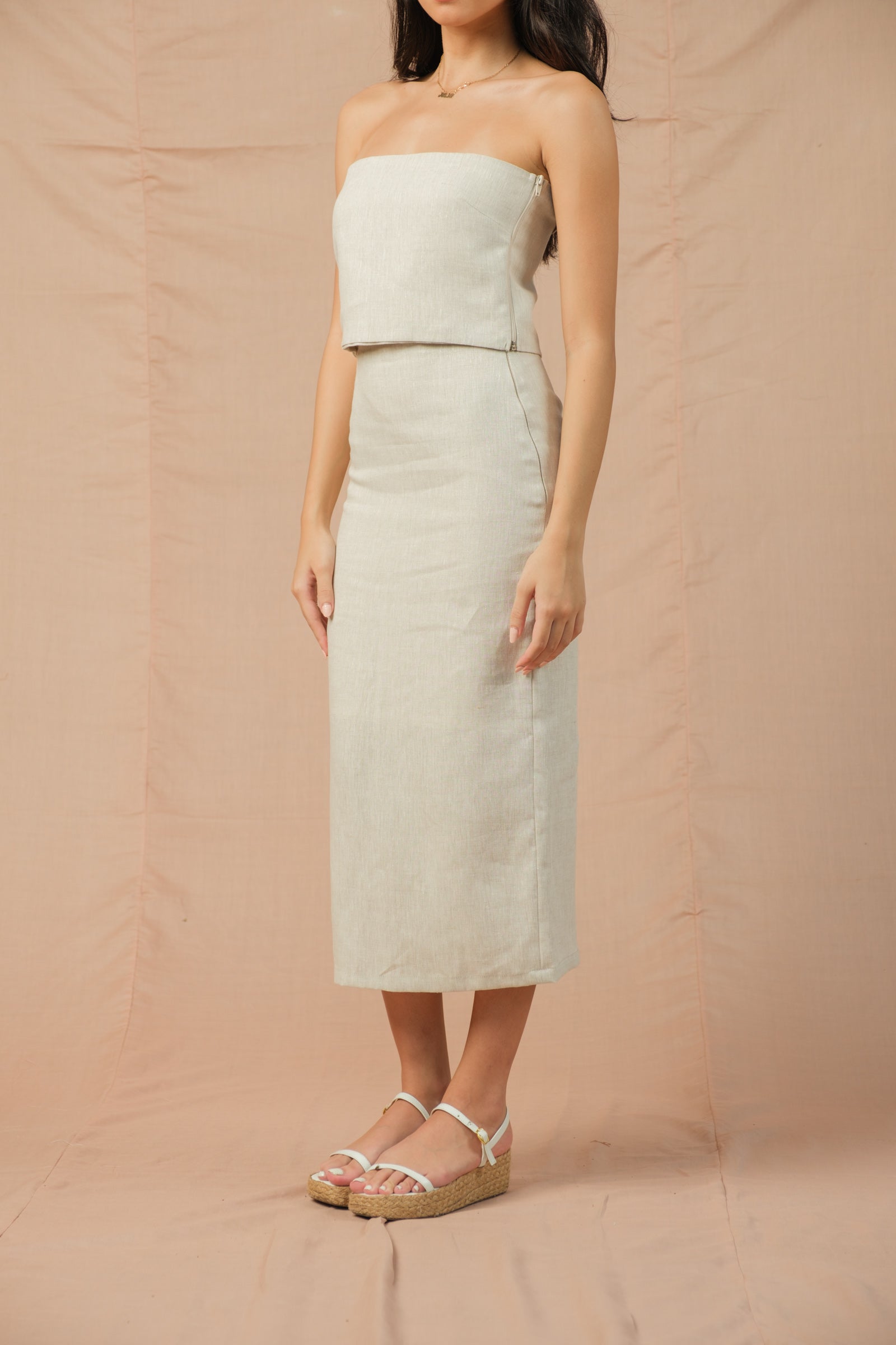 A tube top you can dress up or down. Features a side zipper and adjustable back for easy wear. Can be worn either front or back. Models wear Extra Small. Made in Cotton Linen.
