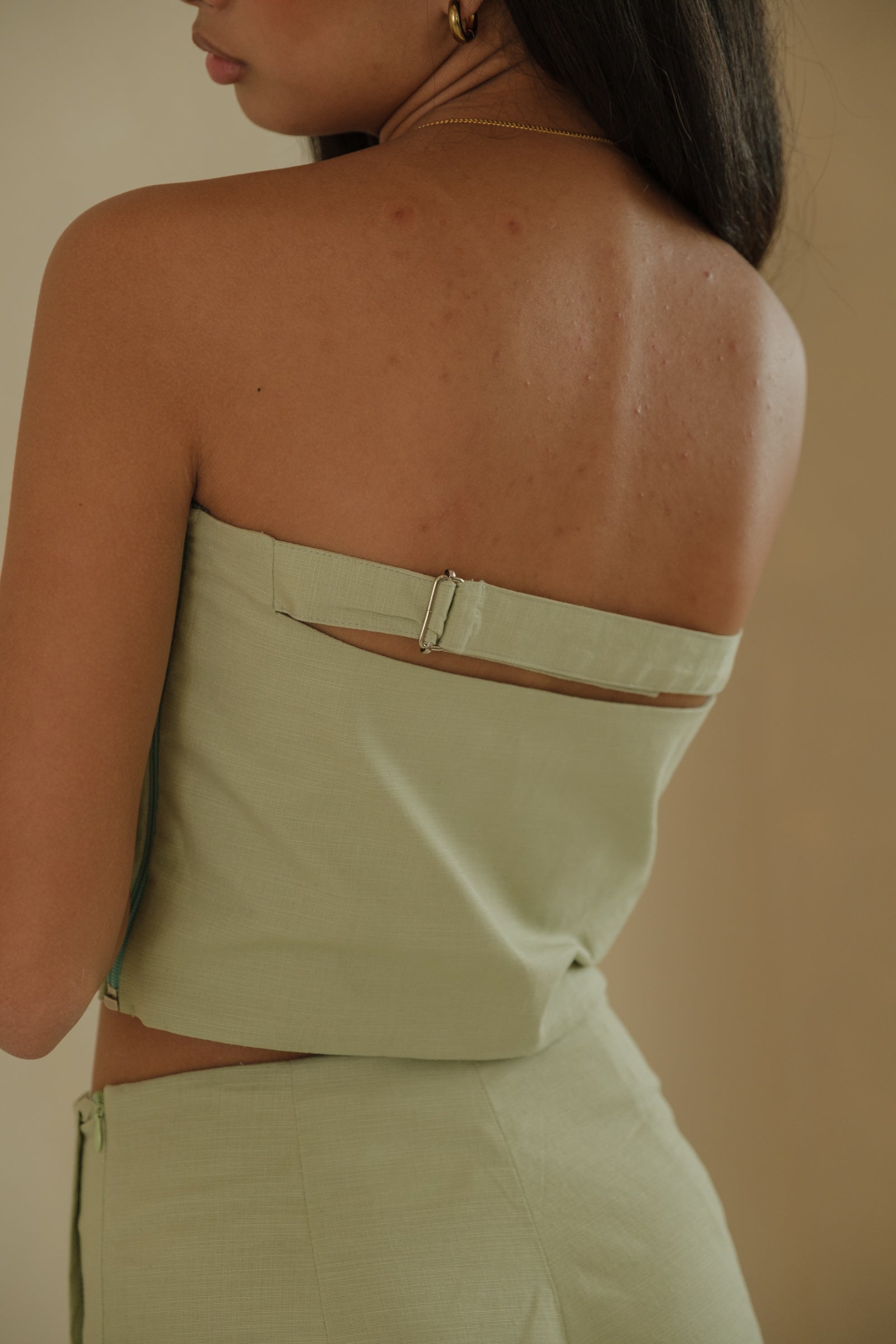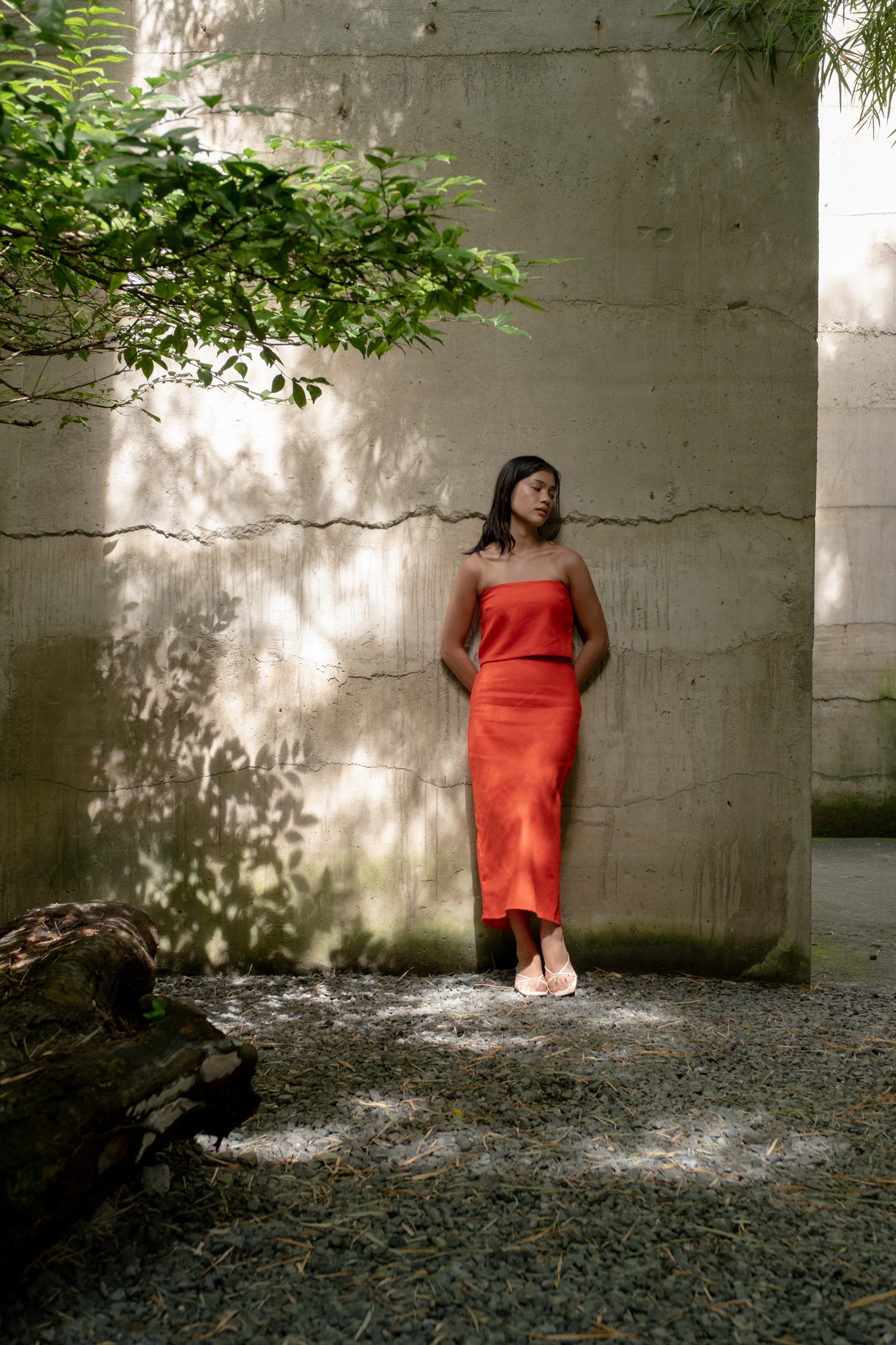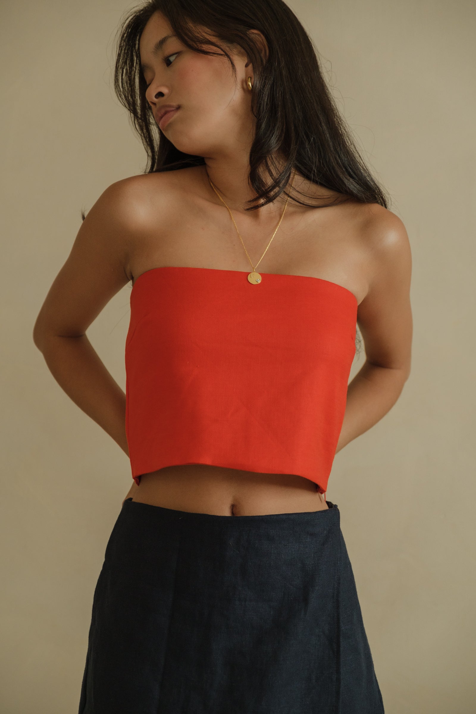 A tube top you can dress up or down. Features a side zipper and adjustable back for easy wear. Can be worn either front or back. Models wear Extra Small. Made in Cotton Linen.