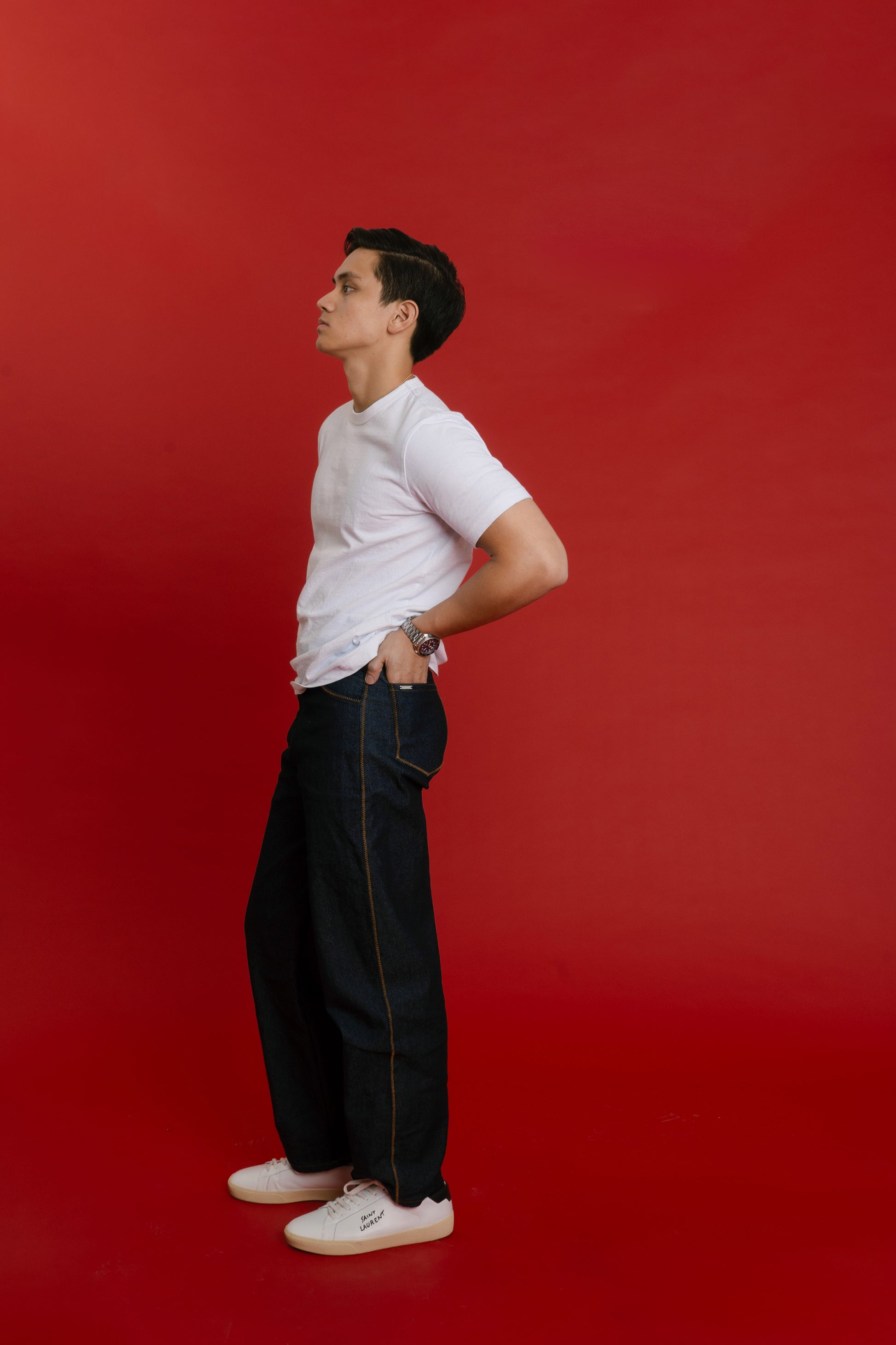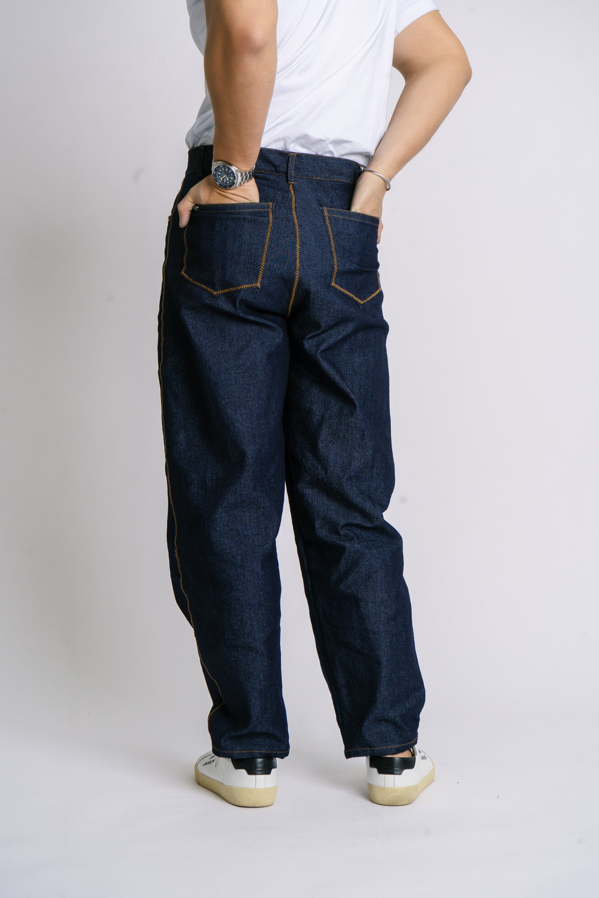 Please note that raw denim can have some color transfer on white items when left unwashed. We recommend to doing an 8 hour cold wash with a cup of vinegar and a pinch of salt to remove excess dye. Repeat 2-3 times and then you can do a regular wash. We recommend not to wear with white clothes or shoes for the first few wears.