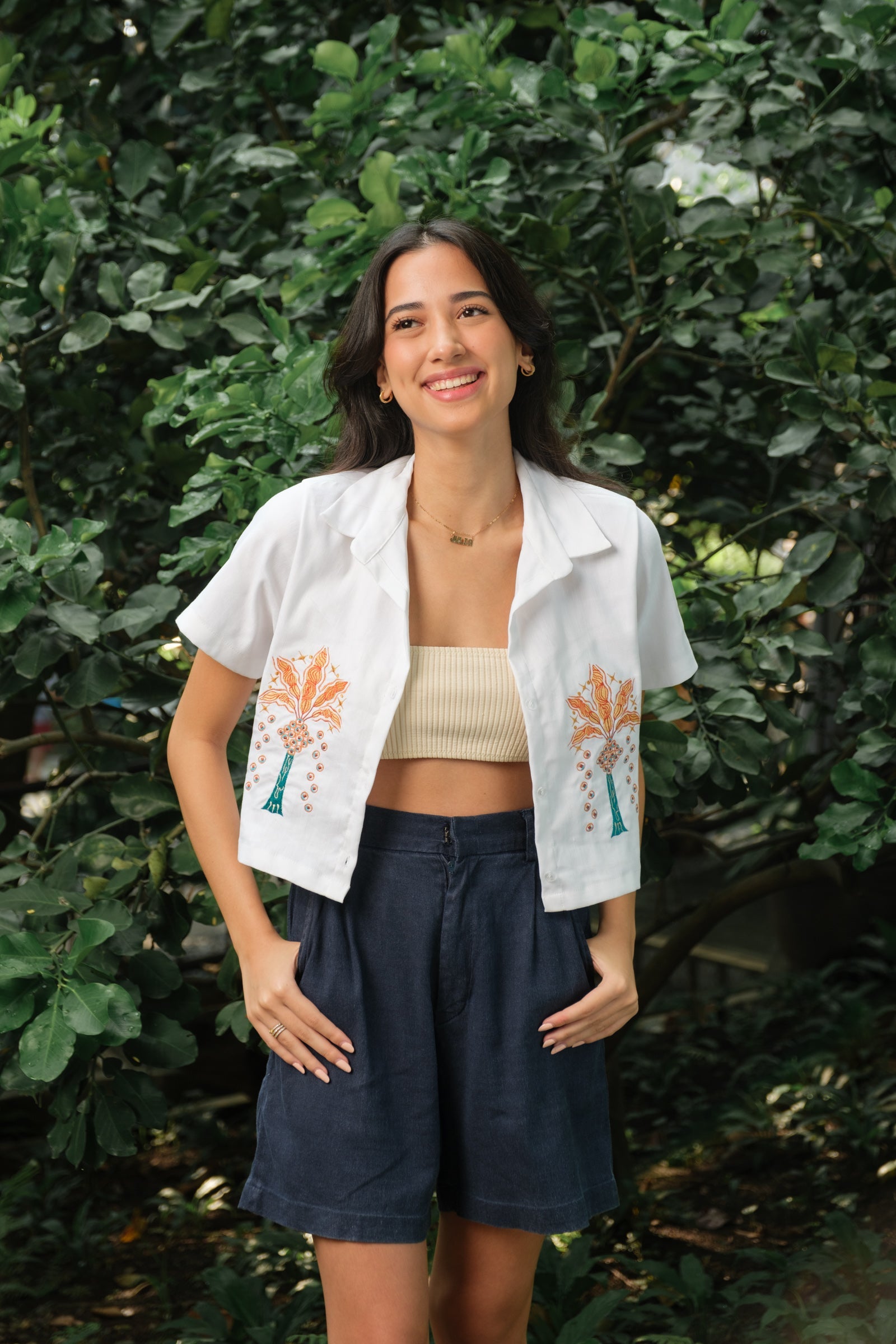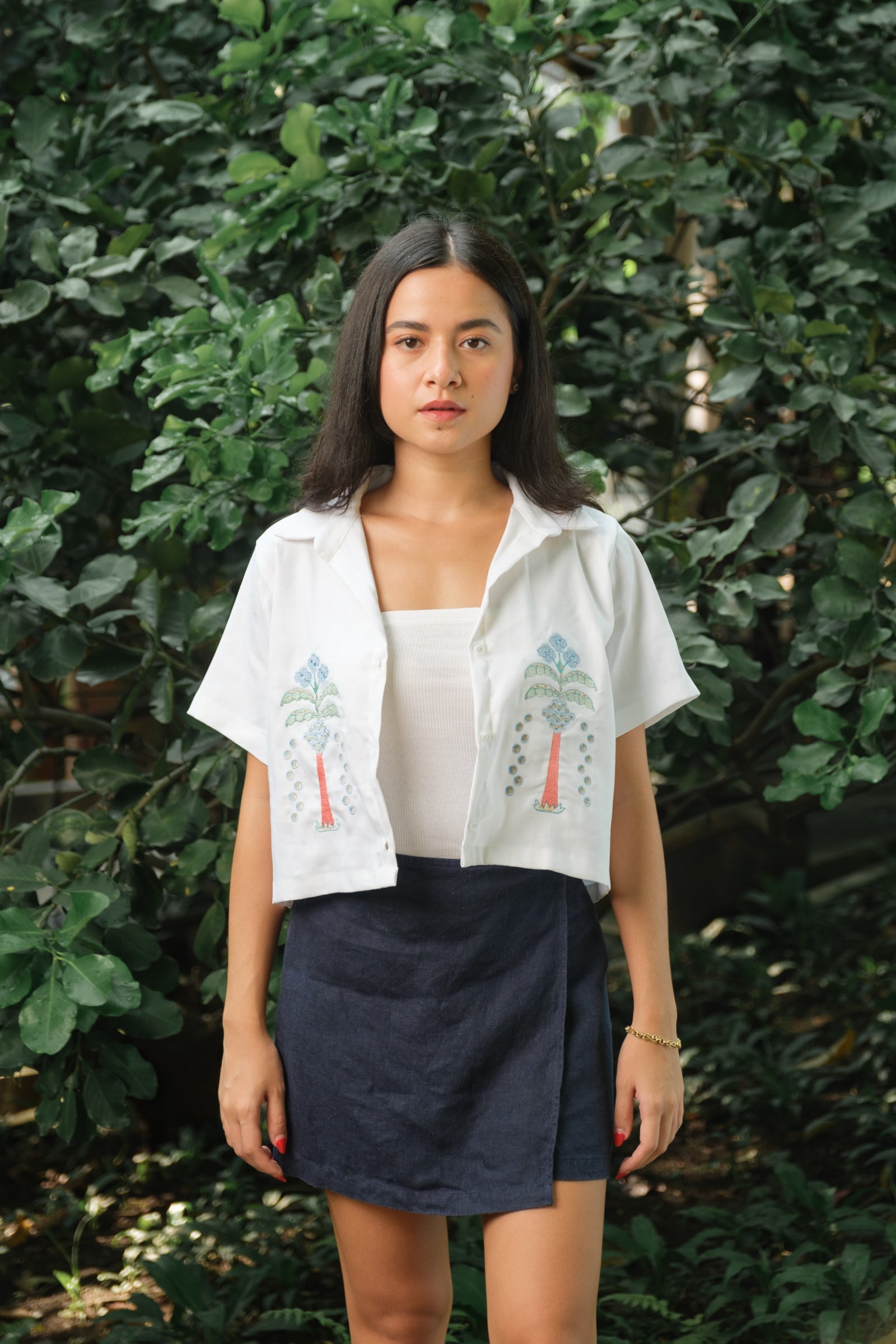 The Palmera Polo is a reminder of warm summers and breezy days. Classic cropped polo silhouette with intricate palm tree hand-guided embroidery. Models wear Extra Small. Made in Linen.