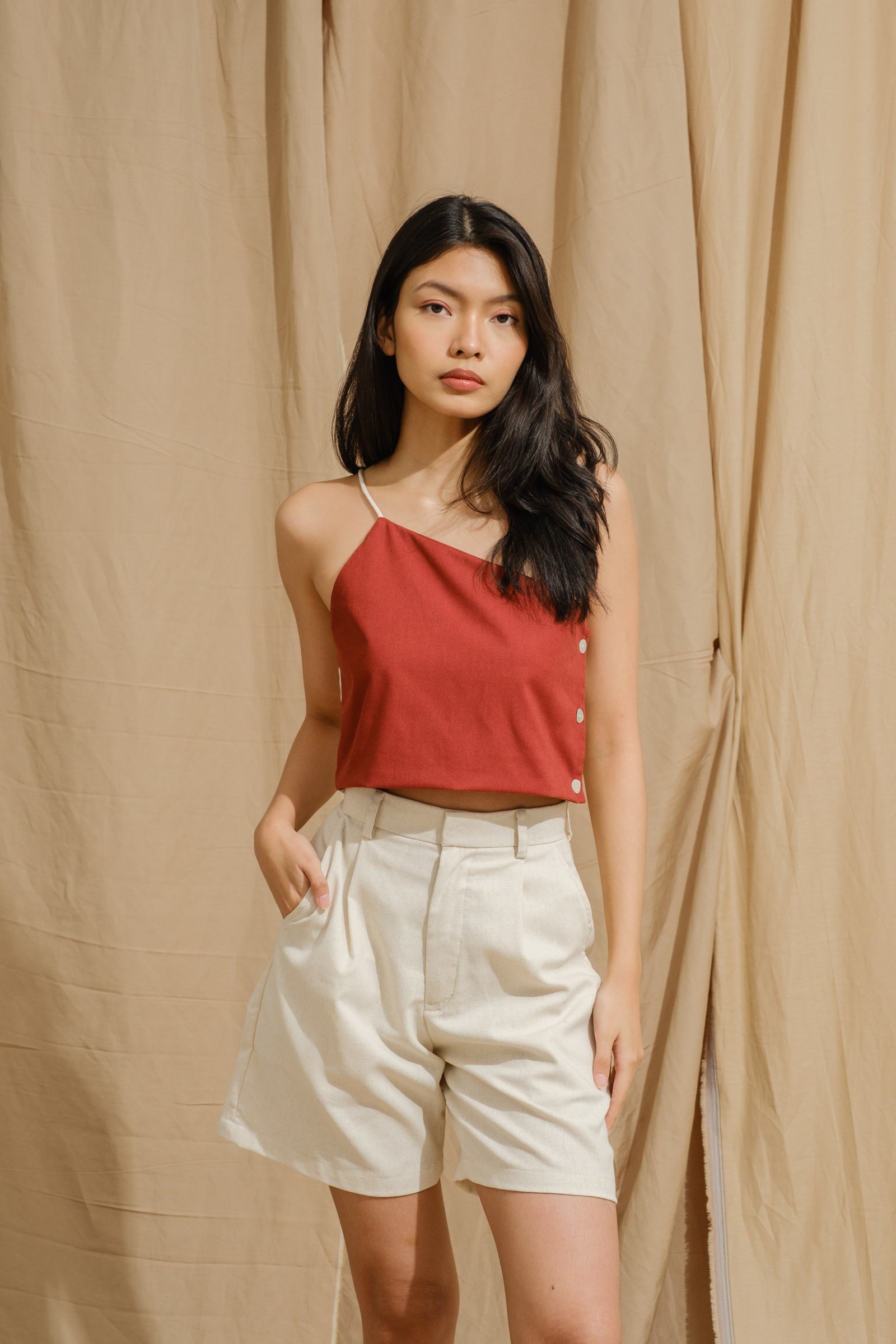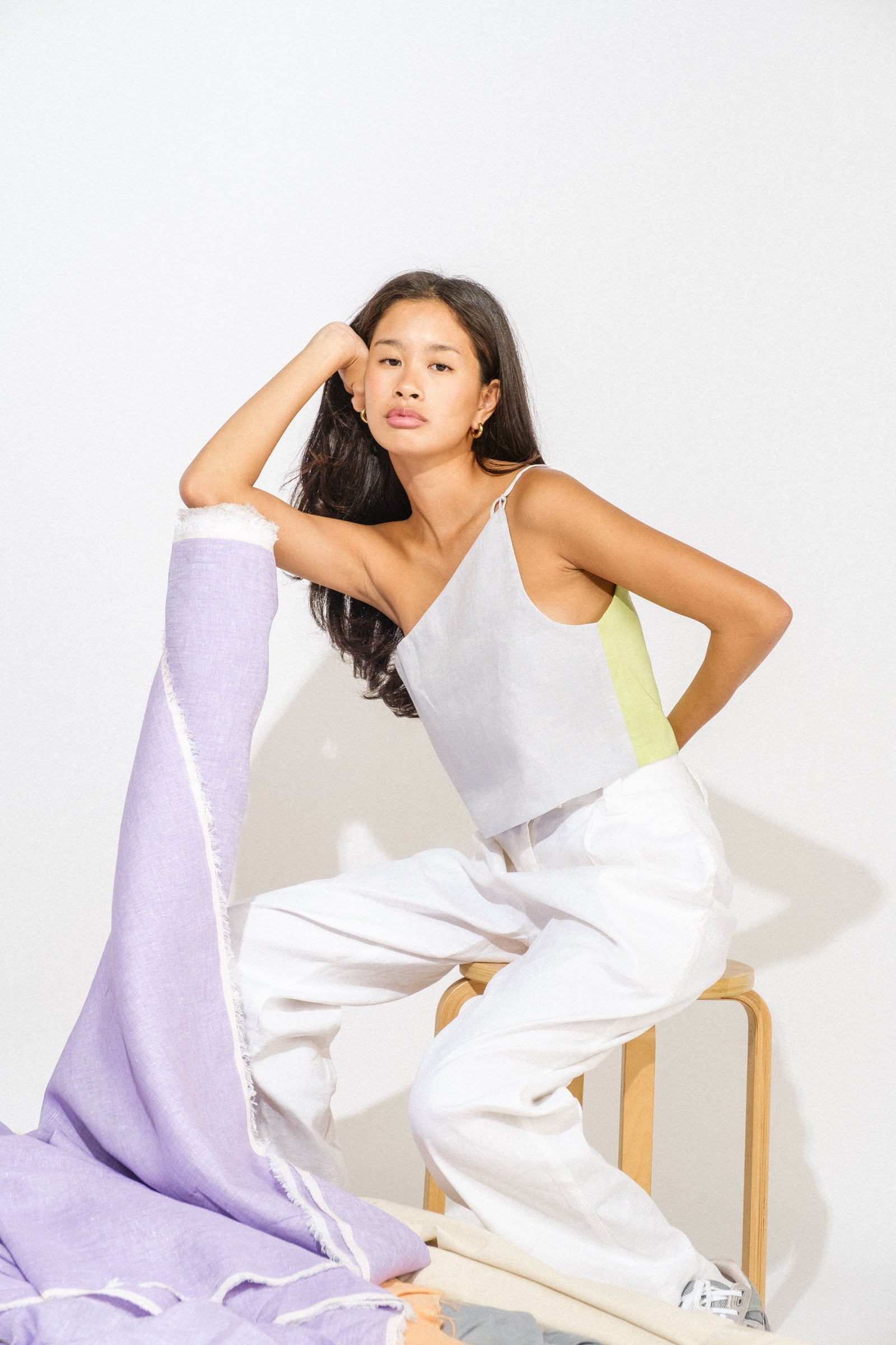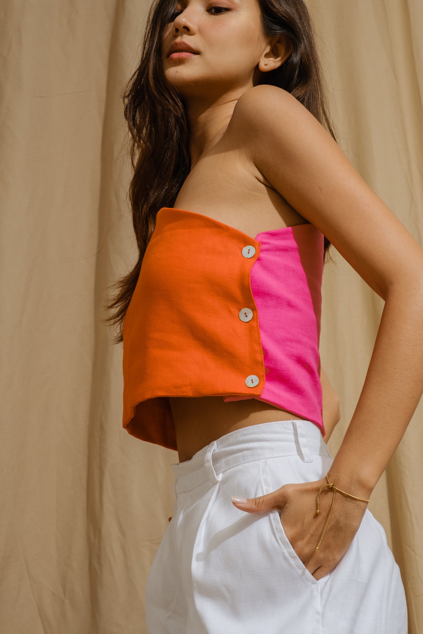 Two-toned asymmetrical top with side button closures and adjustable tie straps. Double lined. Can be worn front or back depending on the your color mood. Models wear Extra Small and Medium.