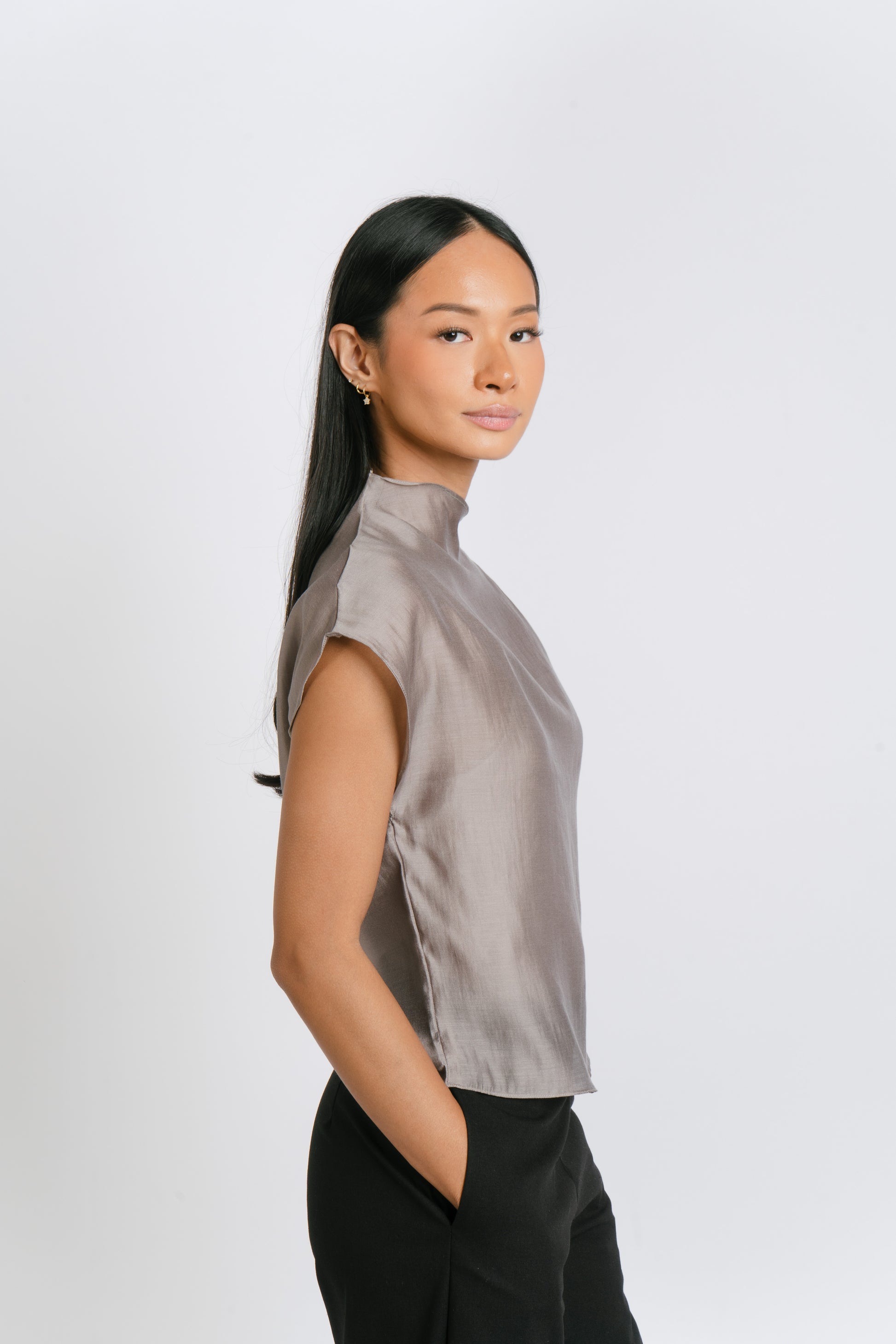 The Demi Top has a sheer cap sleeve outer layer with an asymmetric neckline opening. It is paired with a bias cut sleeveless top inside. Made in Chiffon and Lyocell. Model wears XS.