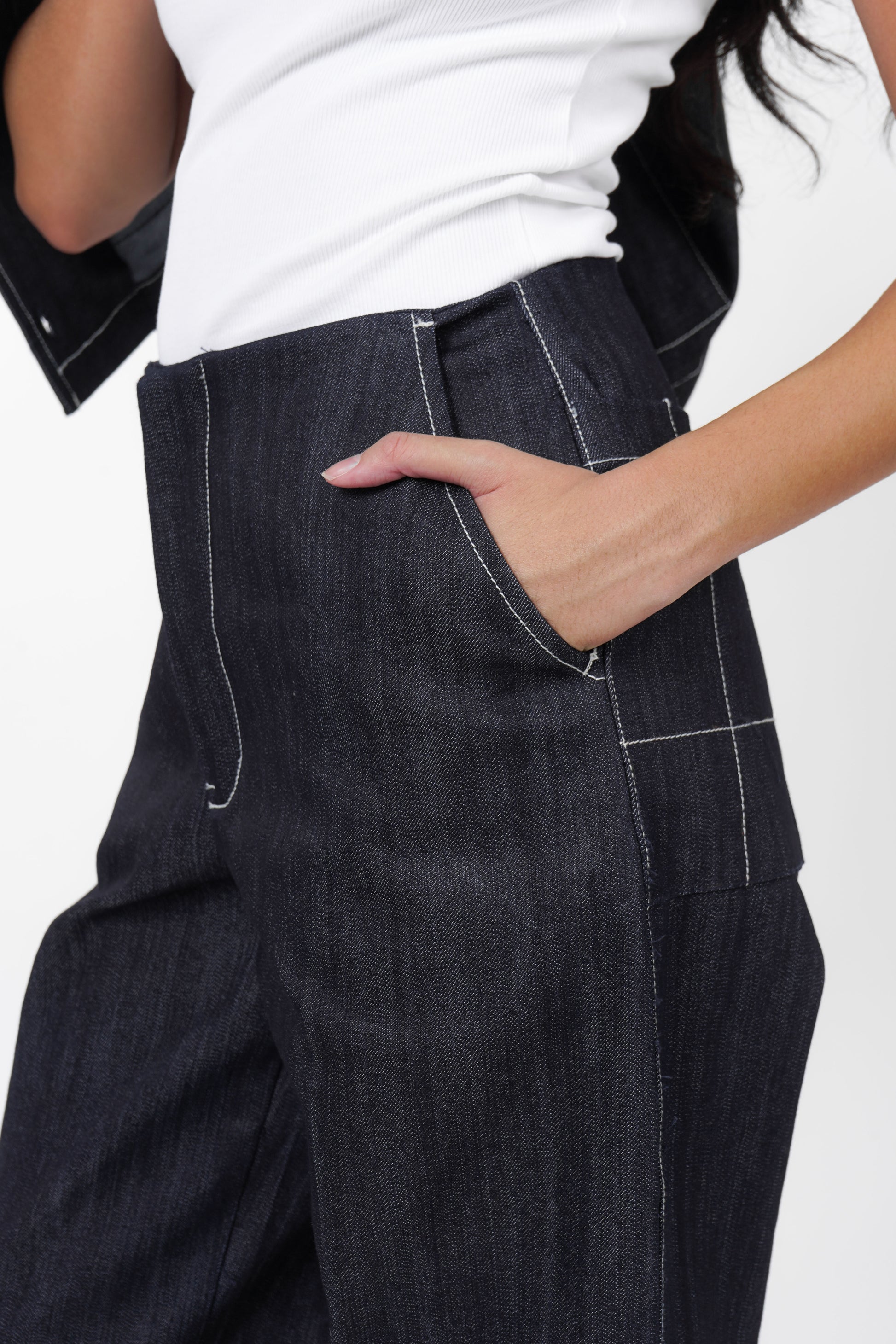 Please note that dark wash denim can have some color transfer on white items when wet or rubbed. We recommend to doing a cold wash with vinegar prior to first wear to avoid dye bleed.