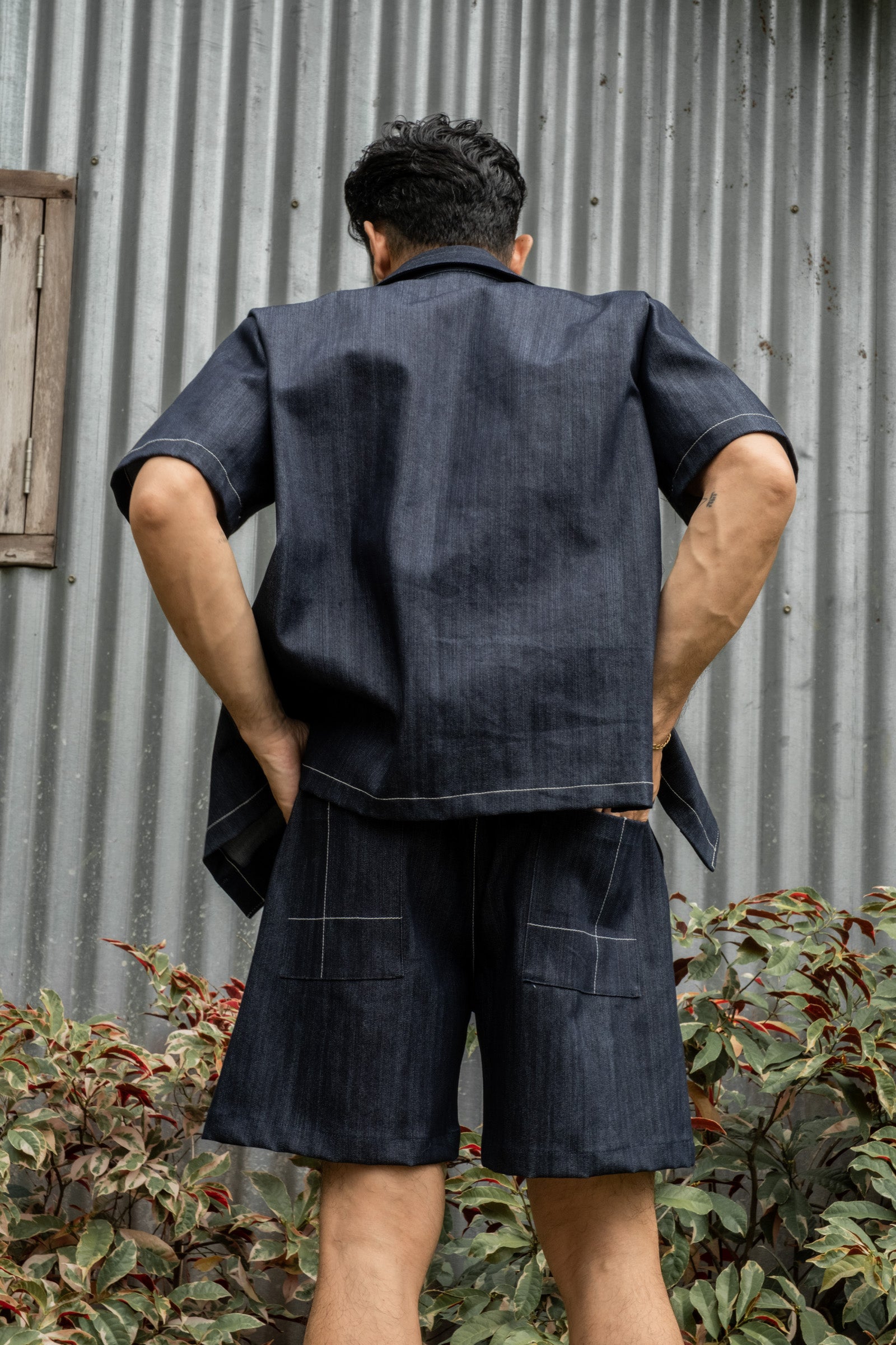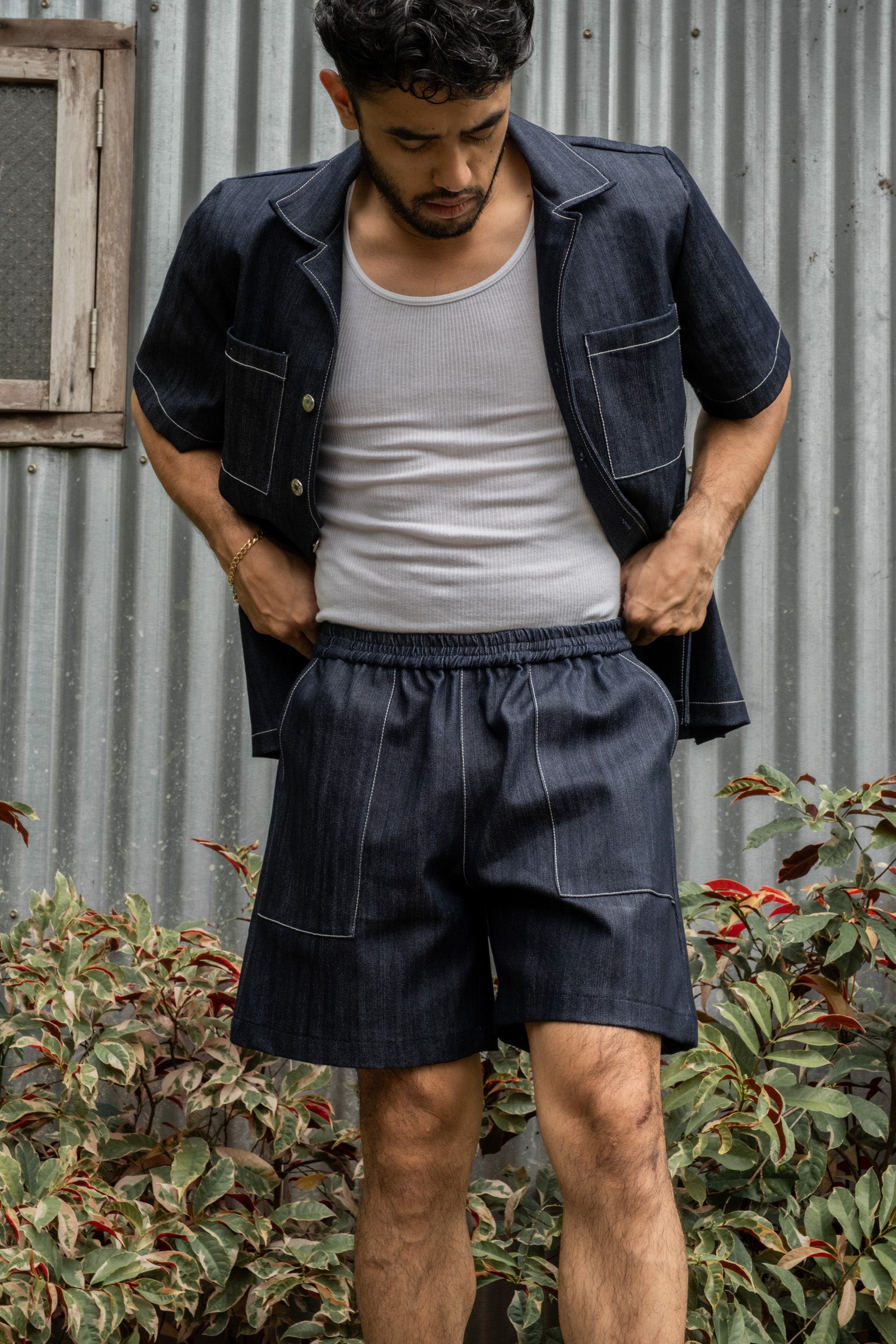 A new take one your jean shorts. Features a garterized waist and contrast stitch with abstract pocket details.