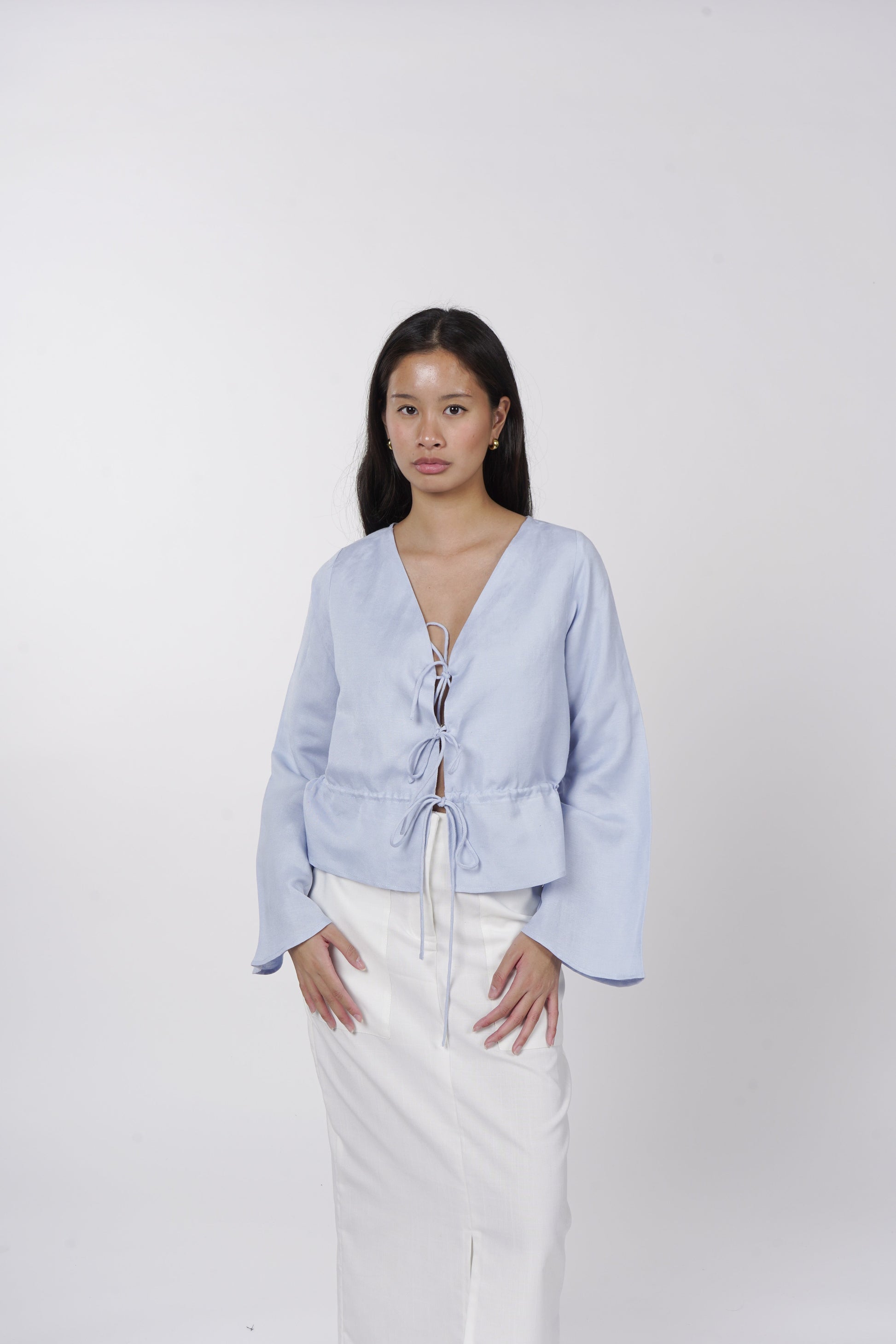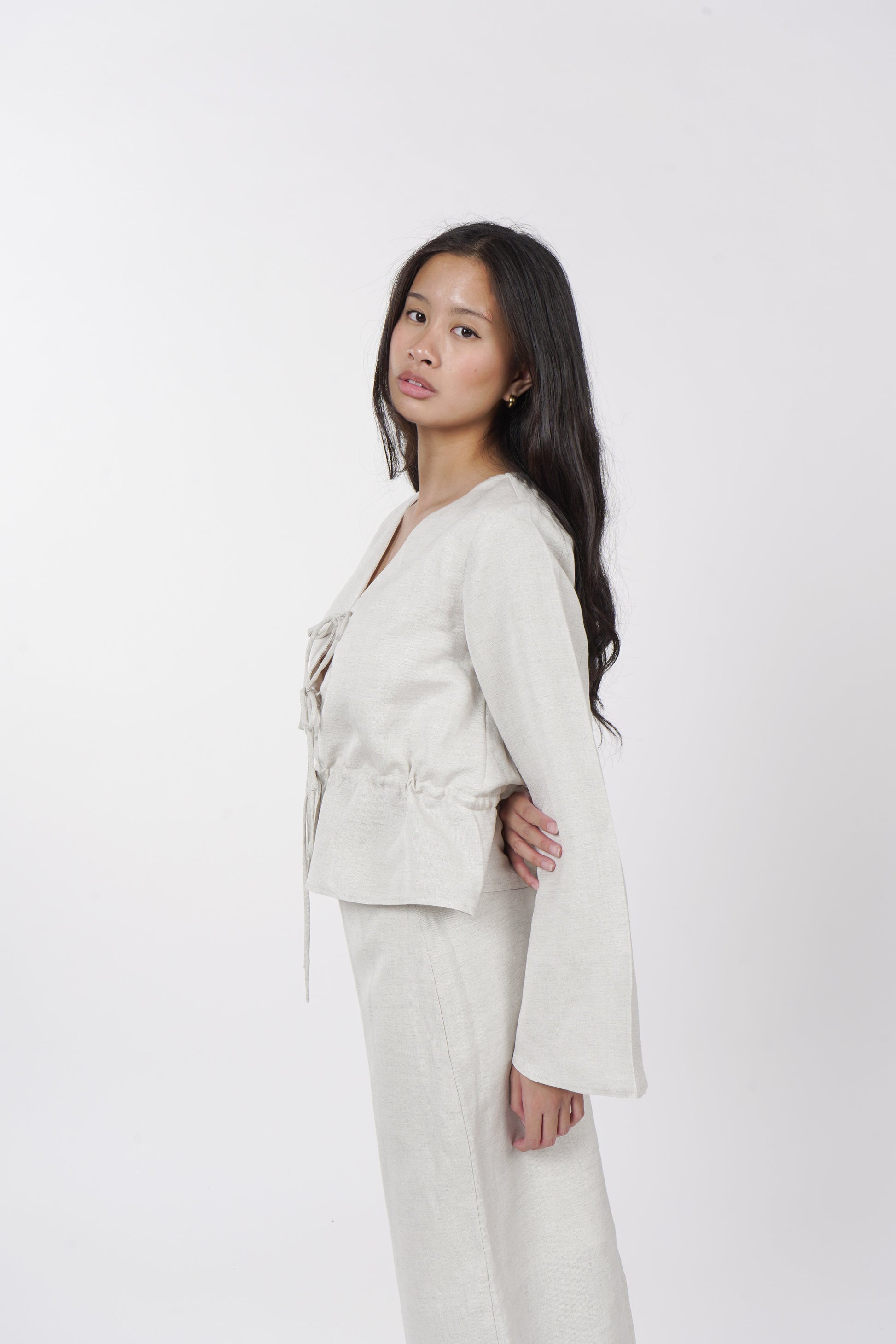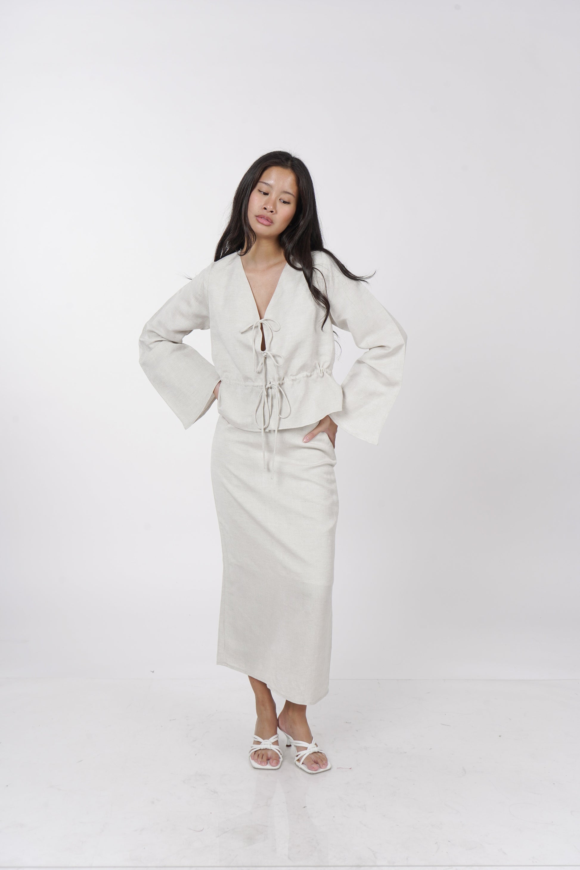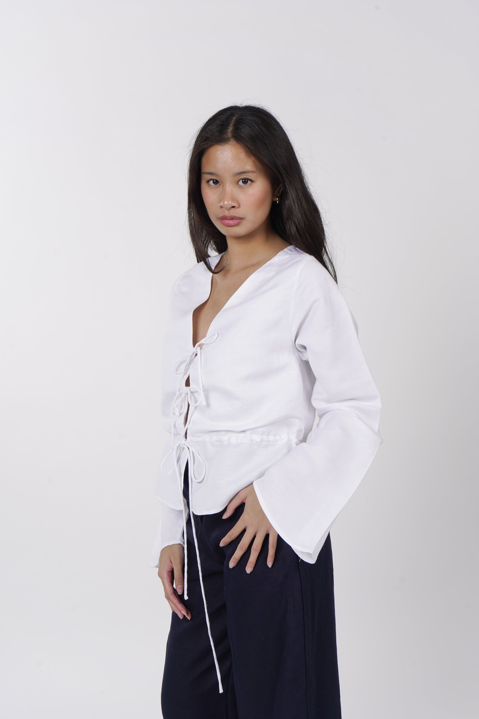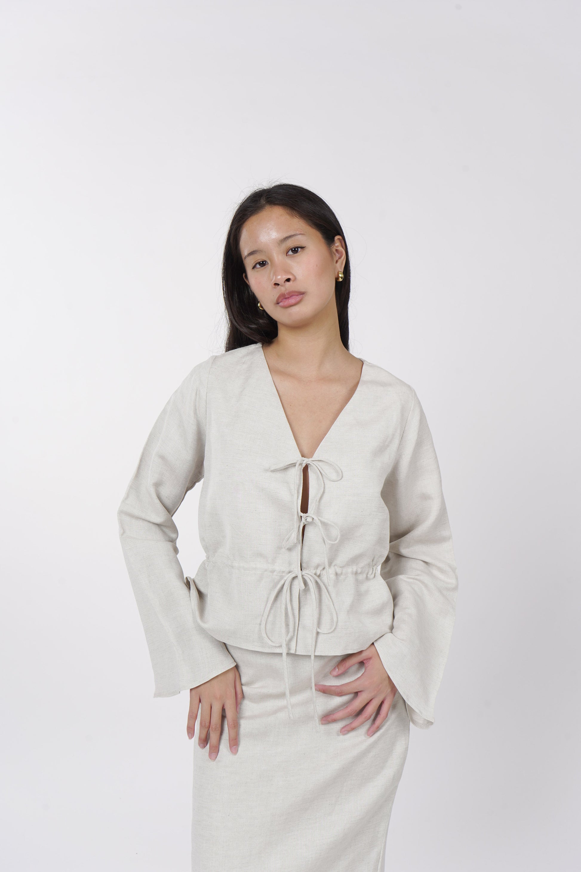 An new take on our Eliana Top. The Eliah Top features a V neckline with bow details with hidden hook closures. Best Paired with the Mira Pants or Anita Midi Skirt. Made in Linen. Model wears Extra Small.