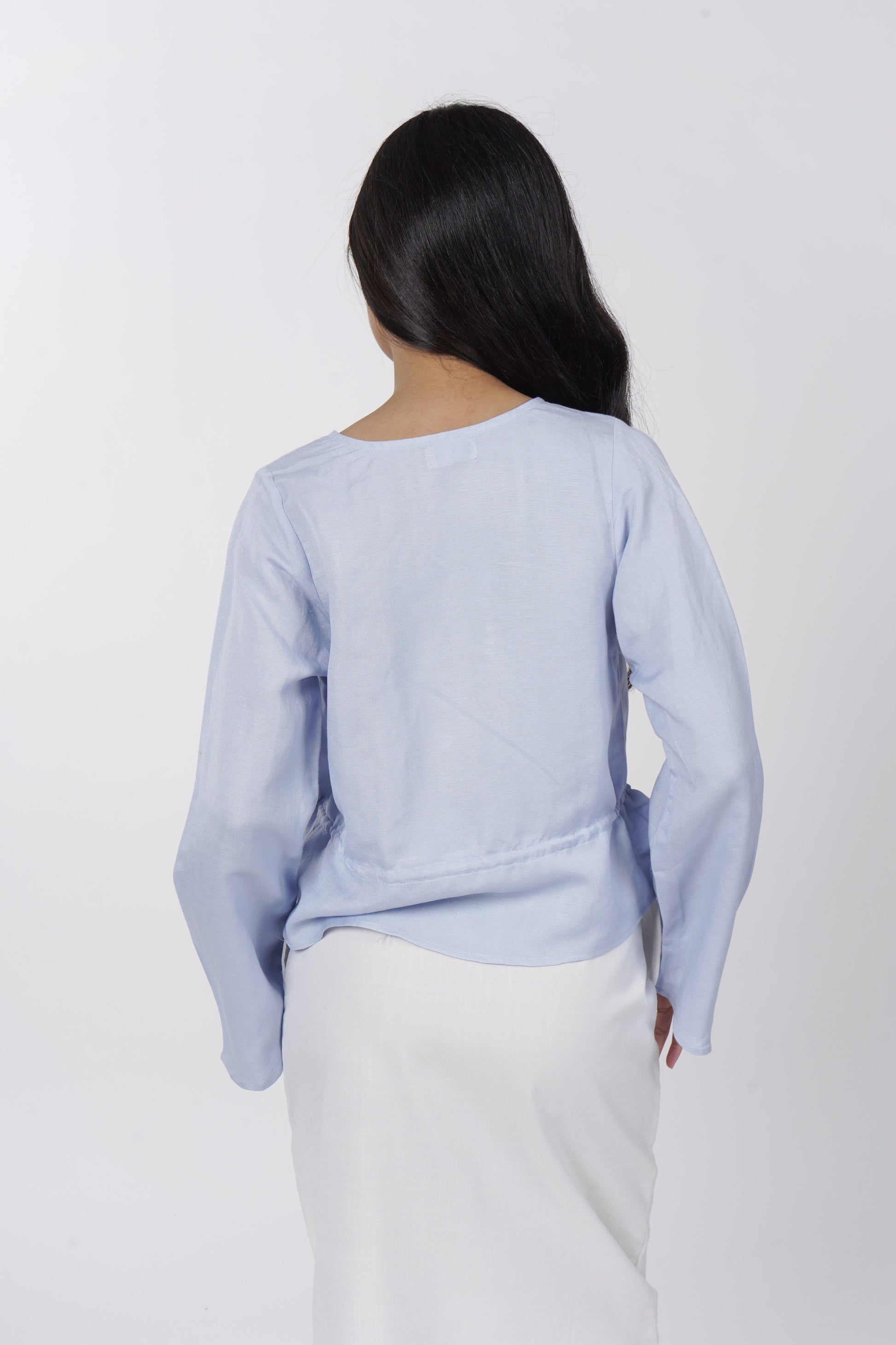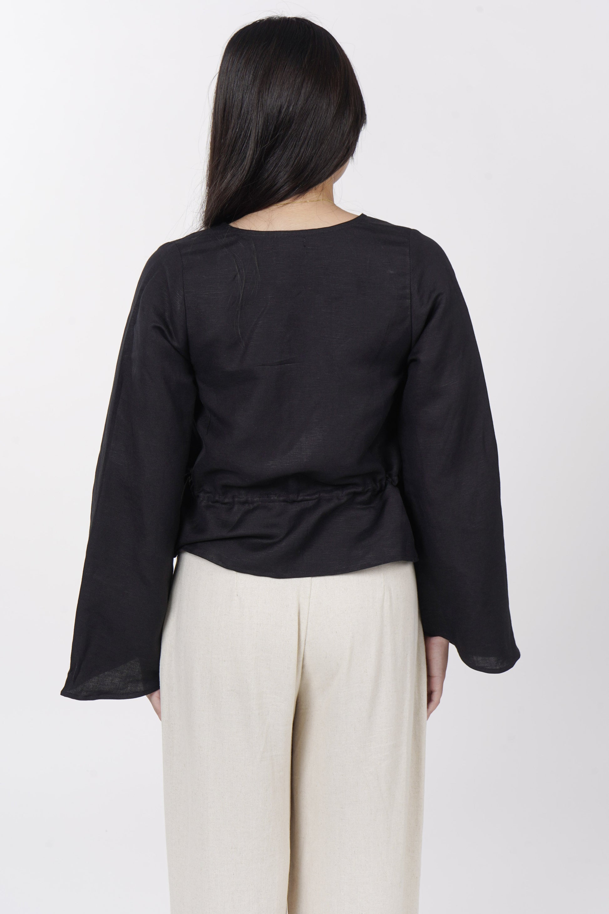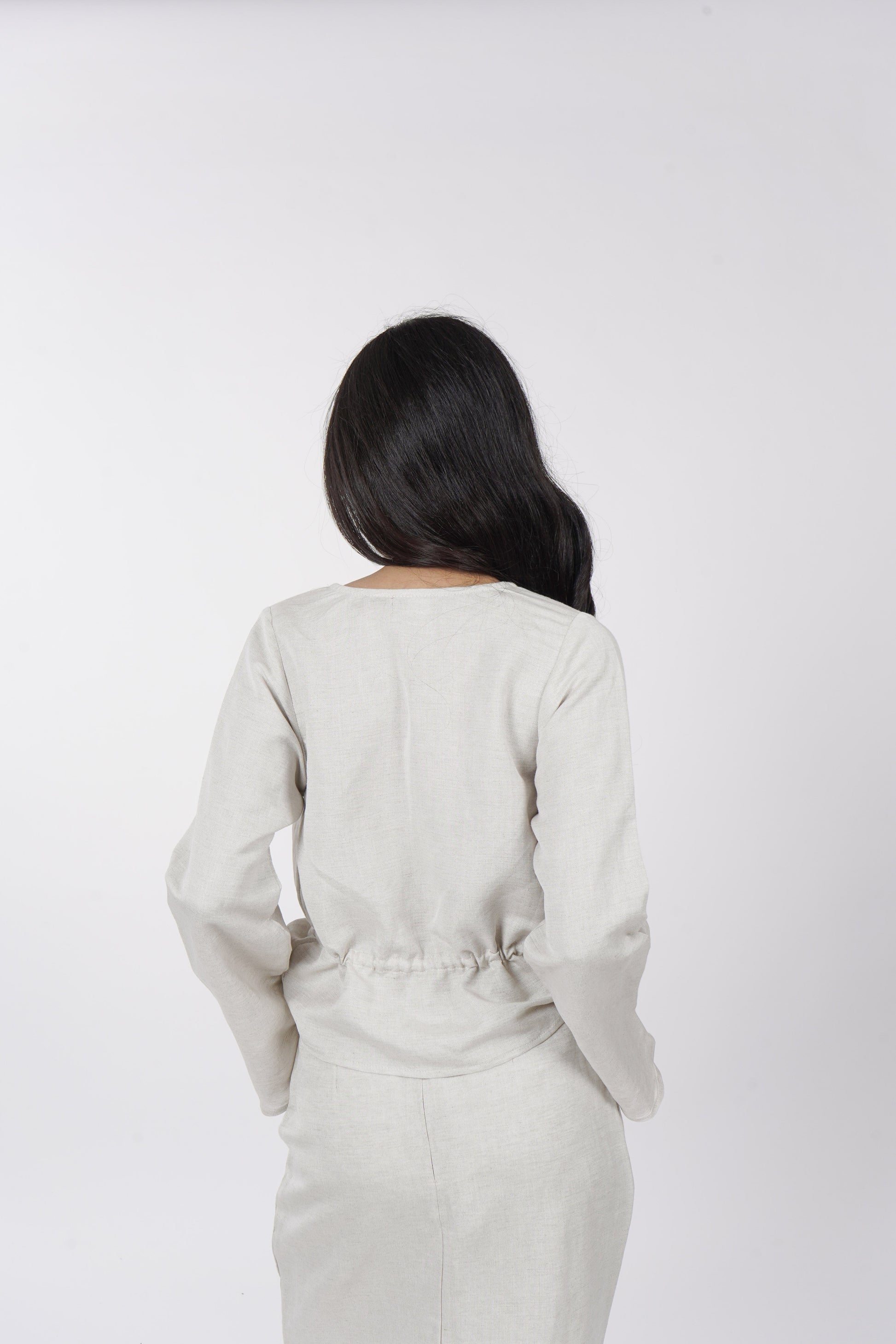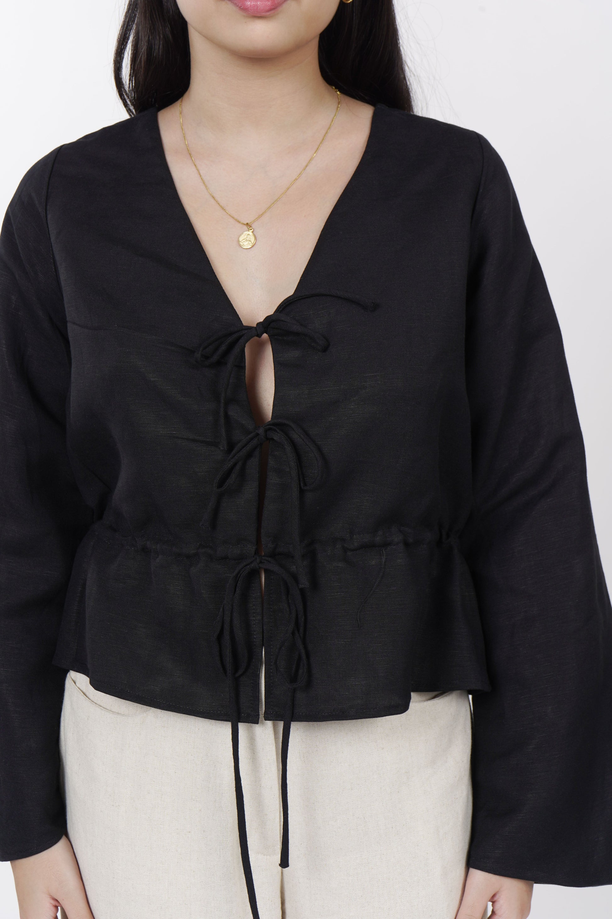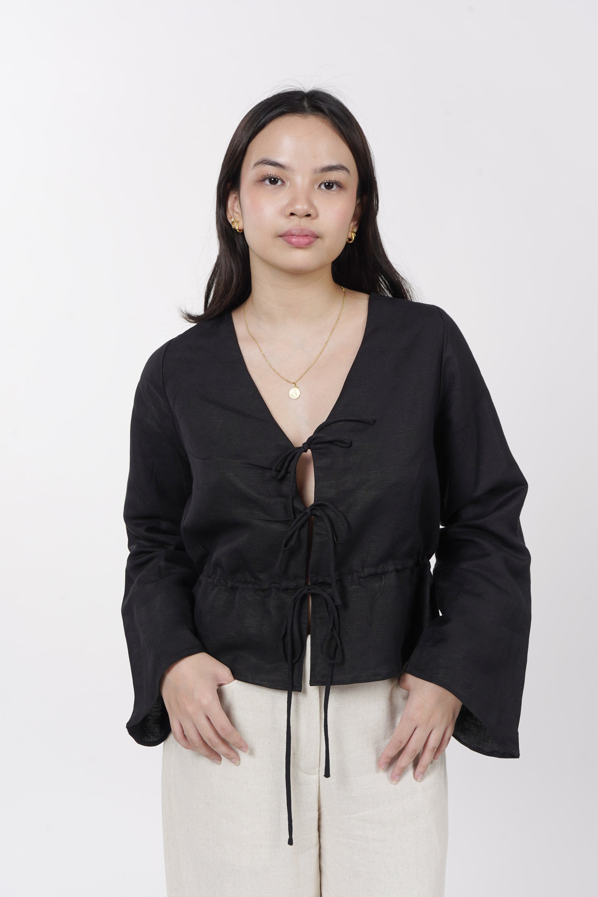 An new take on our Eliana Top. The Eliah Top features a V neckline with bow details with hidden hook closures. Best Paired with the Mira Pants or Anita Midi Skirt. Made in Linen. Model wears Extra Small.