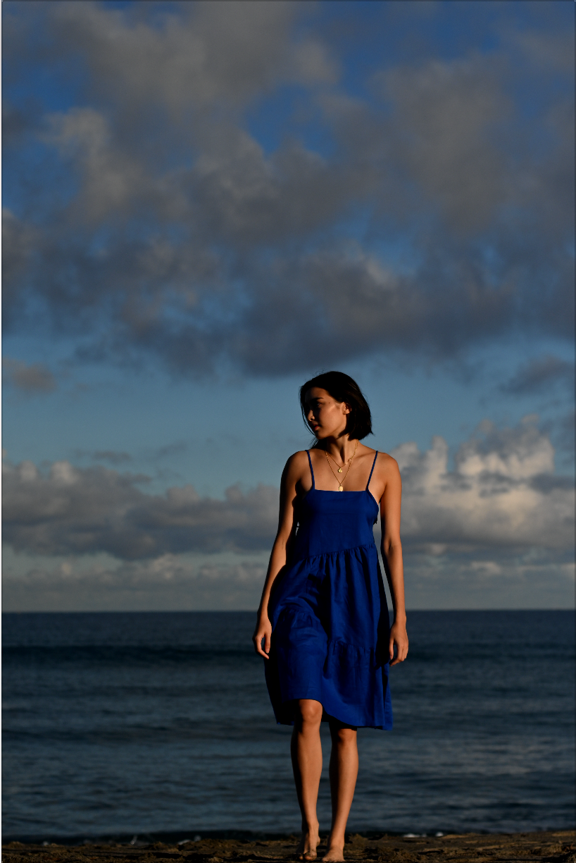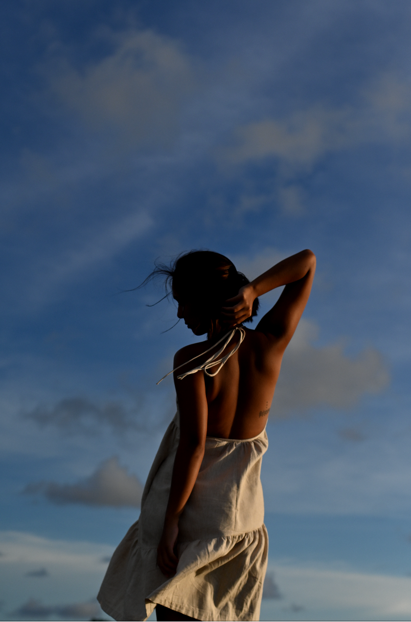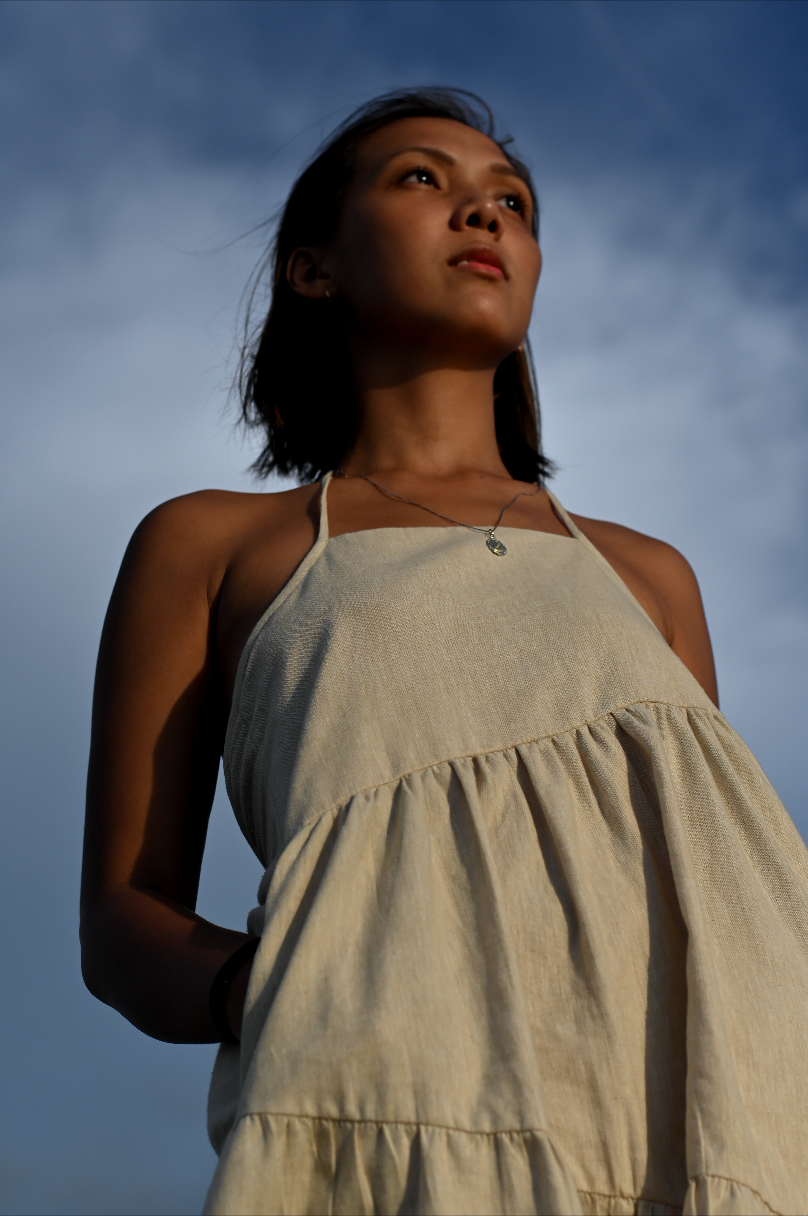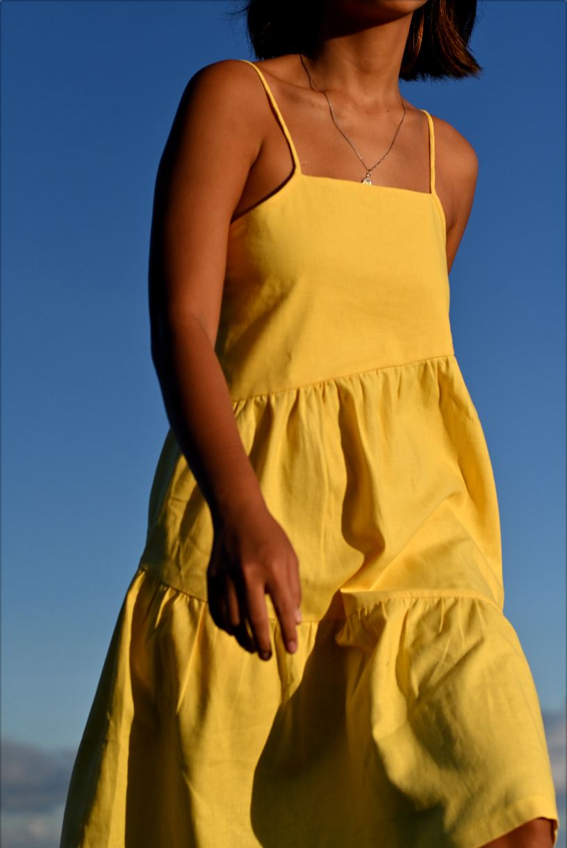 Low back asymmetrical tier dress with adjustable multi-way tie straps. Features a side zipper and two hidden pockets. Models wear Extra Small.