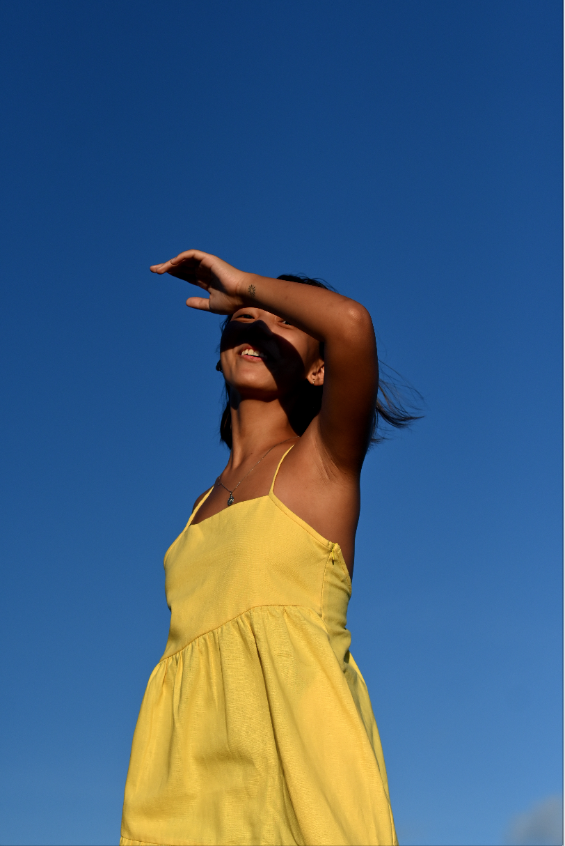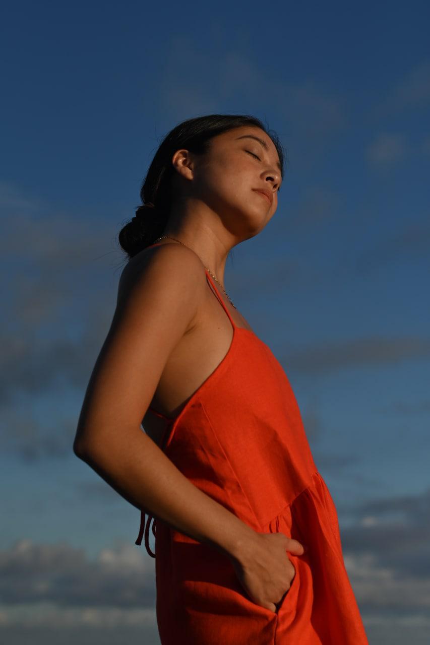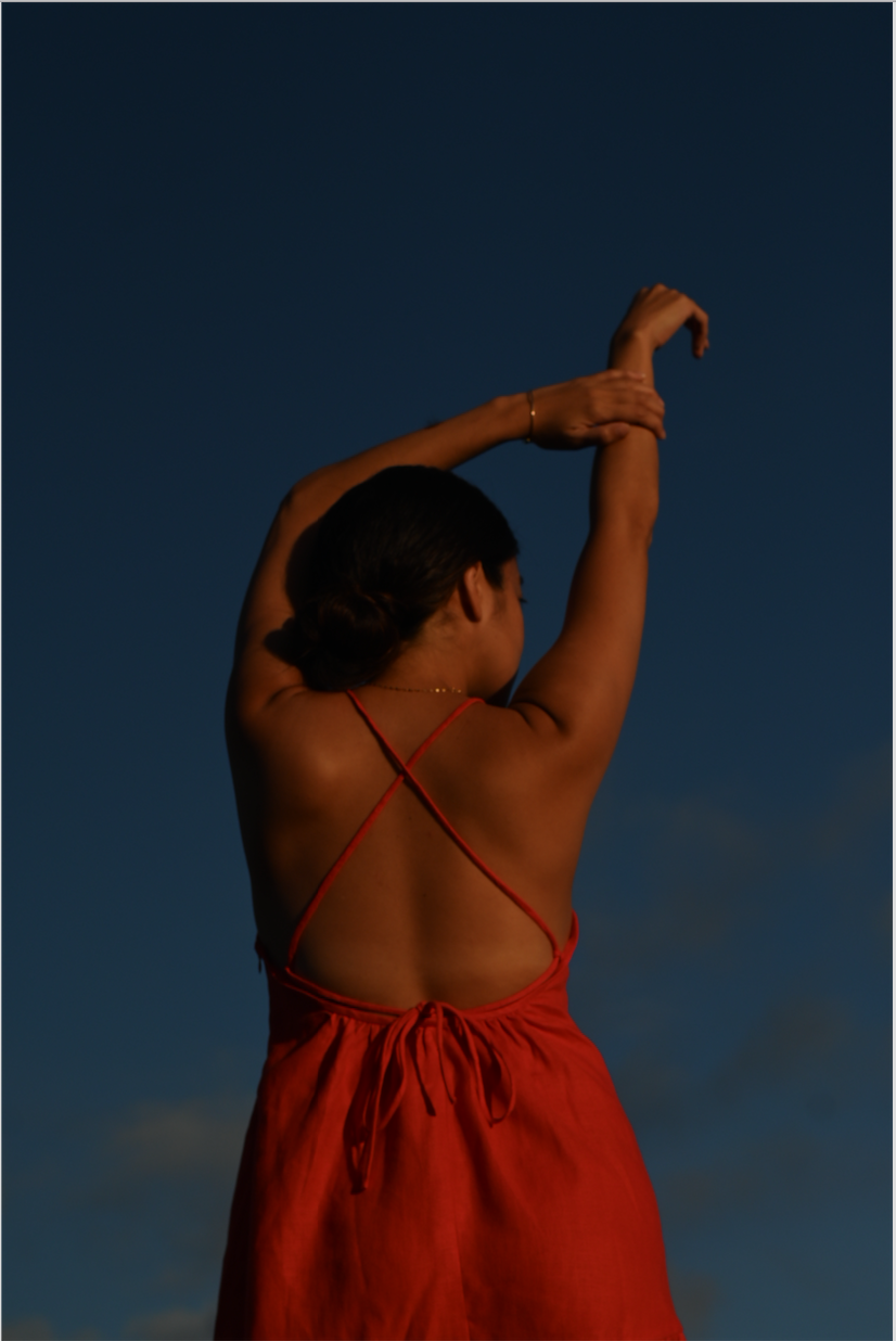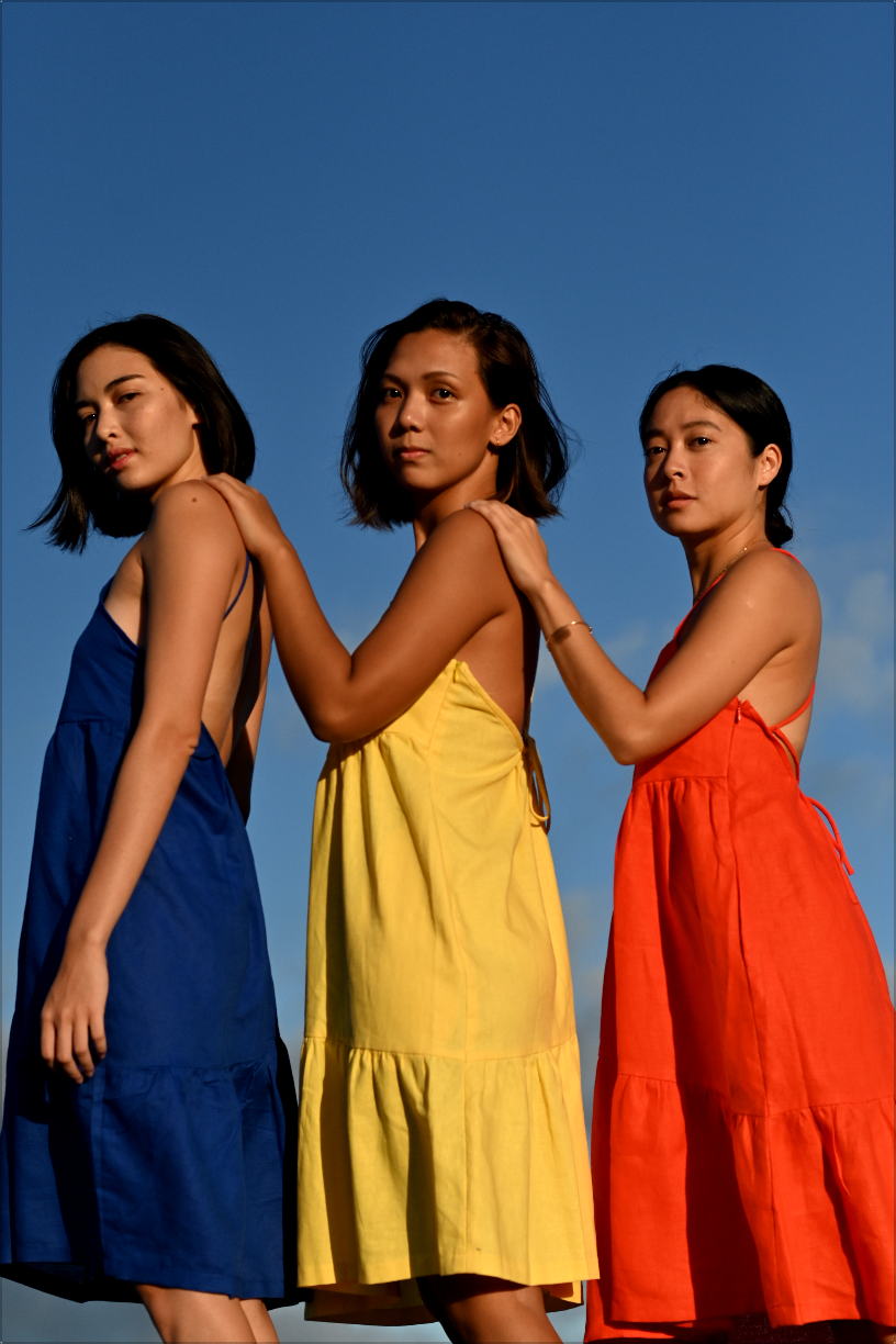 Low back asymmetrical tier dress with adjustable multi-way tie straps. Features a side zipper and two hidden pockets. Models wear Extra Small.