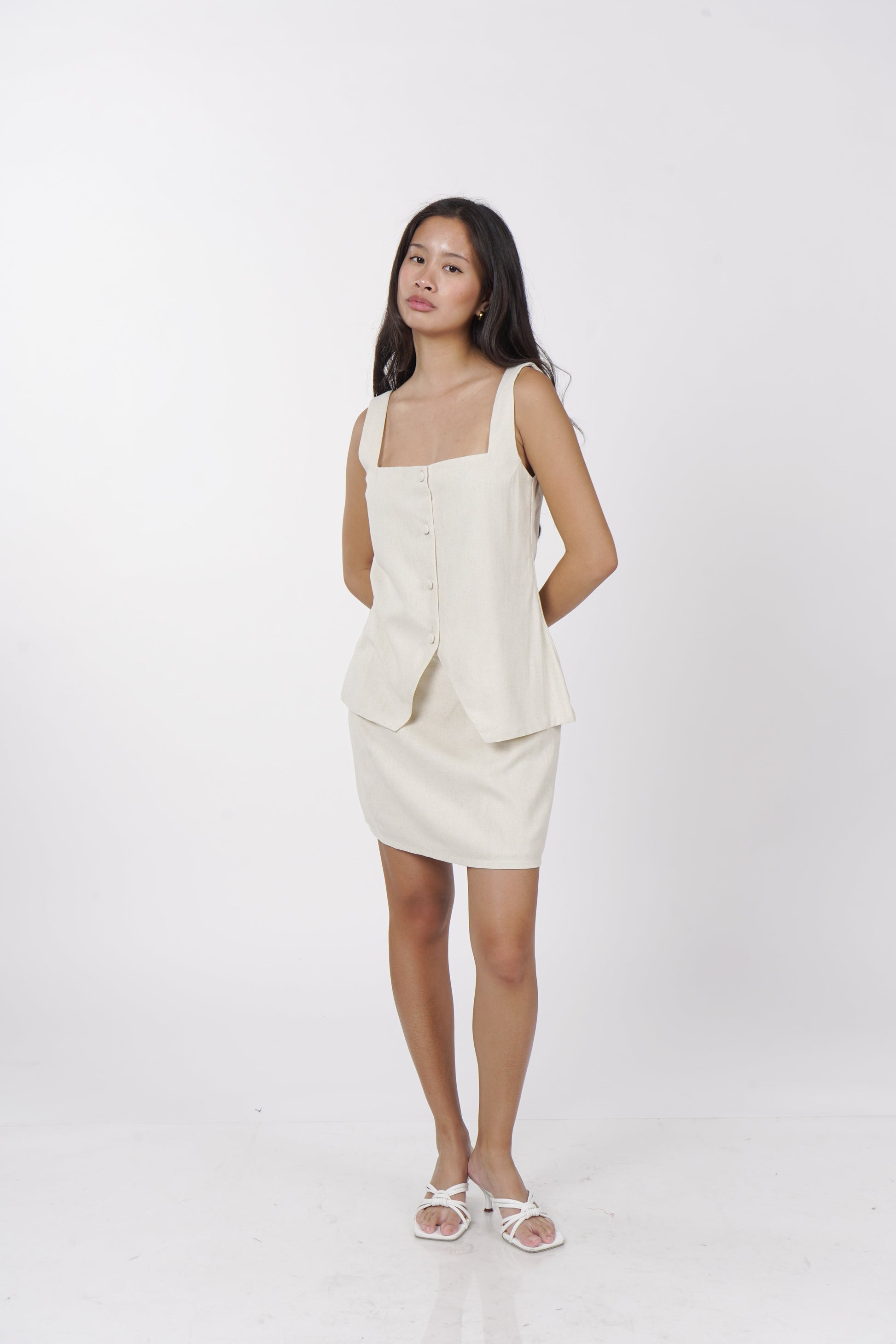 A classy day to night set. The Lara Skirt is a fully lined low waist mini skirt with slit panel pockets. Best paired with the Anna Vest or Lara Vest. Model wear Extra Small. Made in Linen.