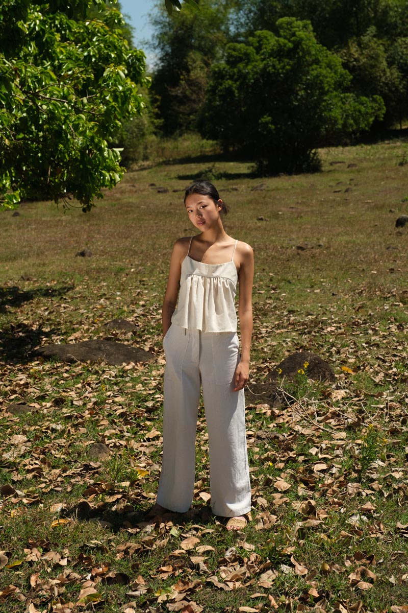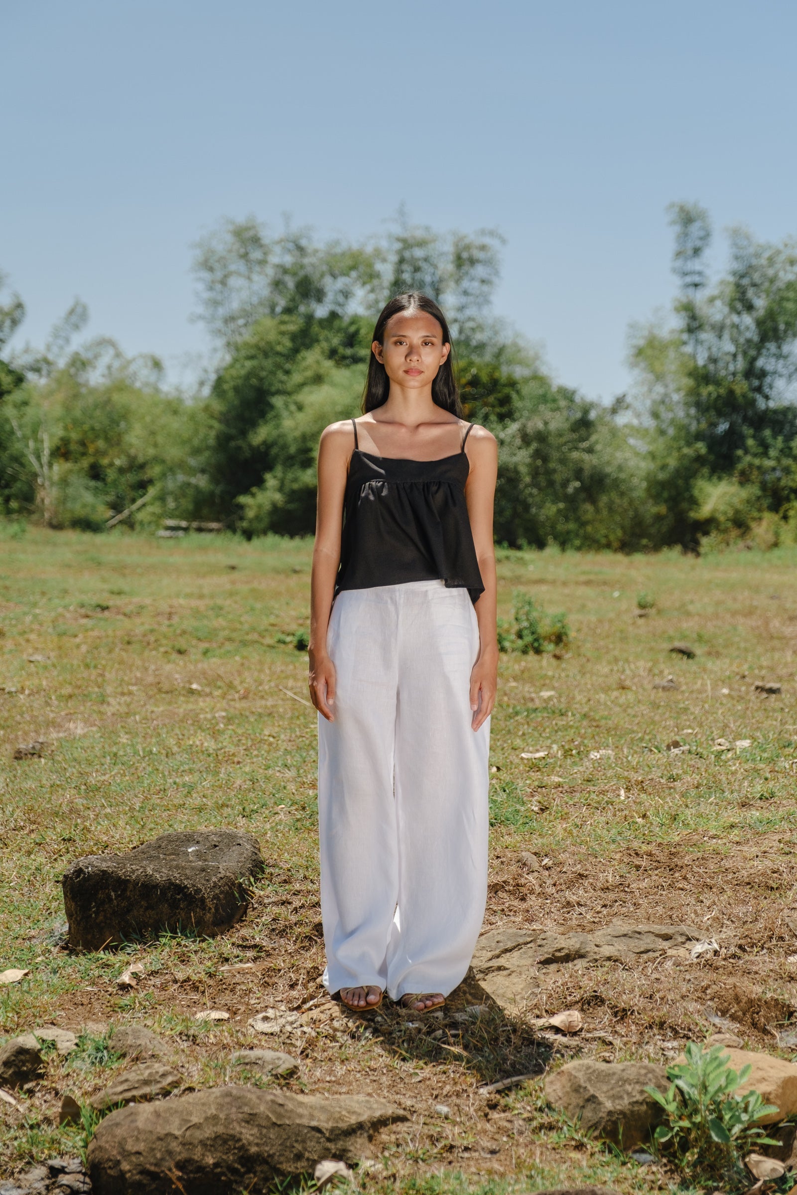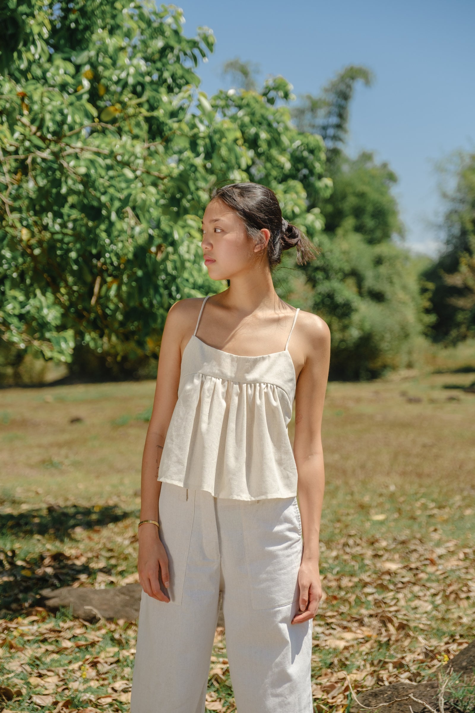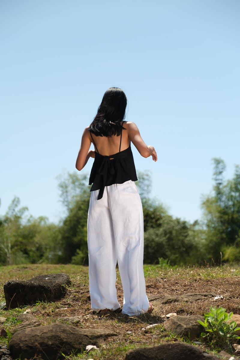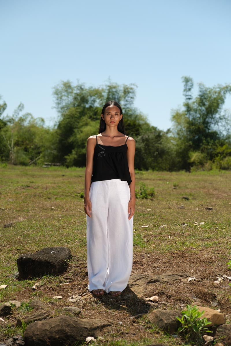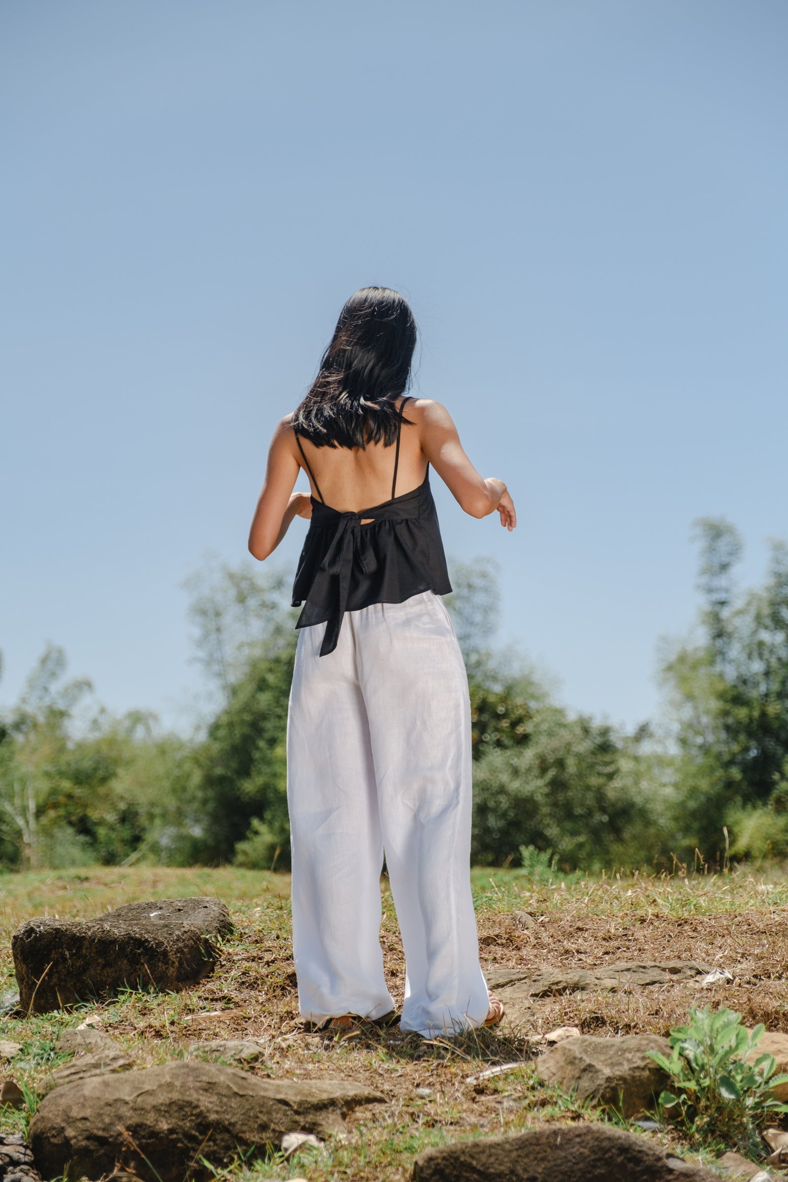 A new play on one of our best sellers. Flowy top with front ruffle details and back tie detail. Models wear Extra Small. Made in Linen.