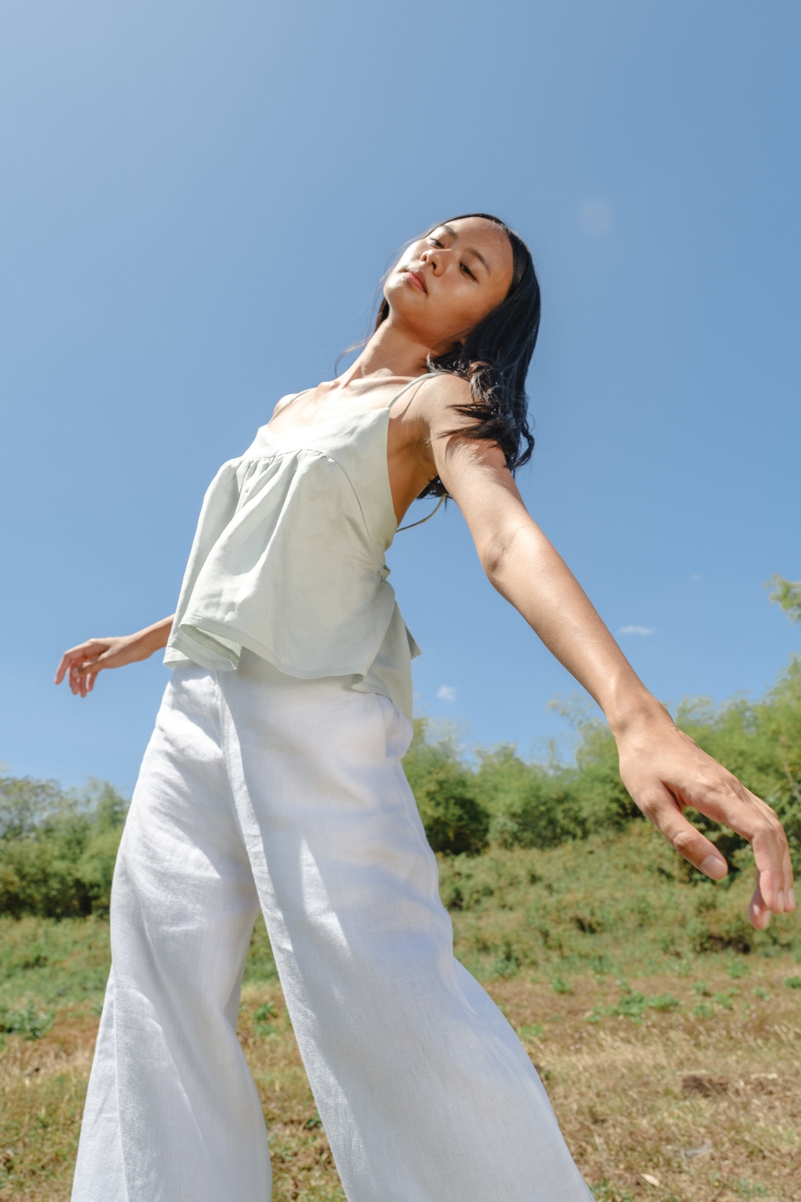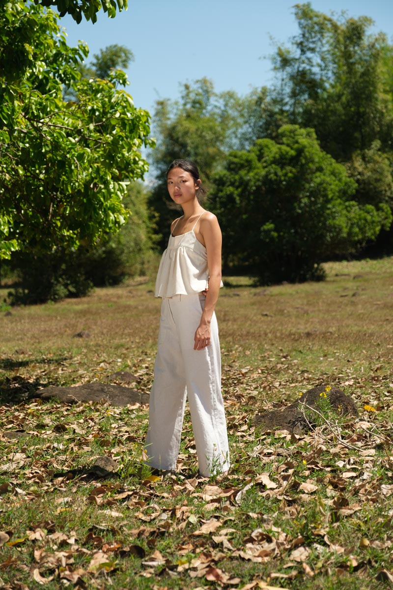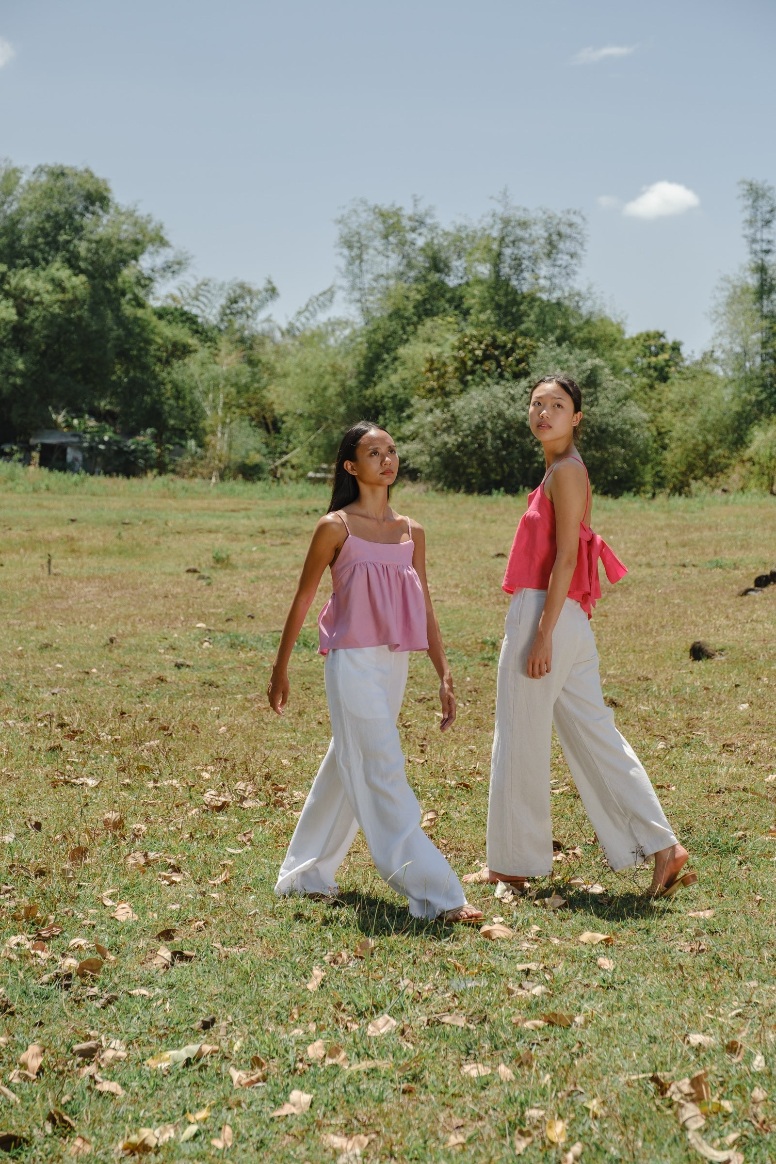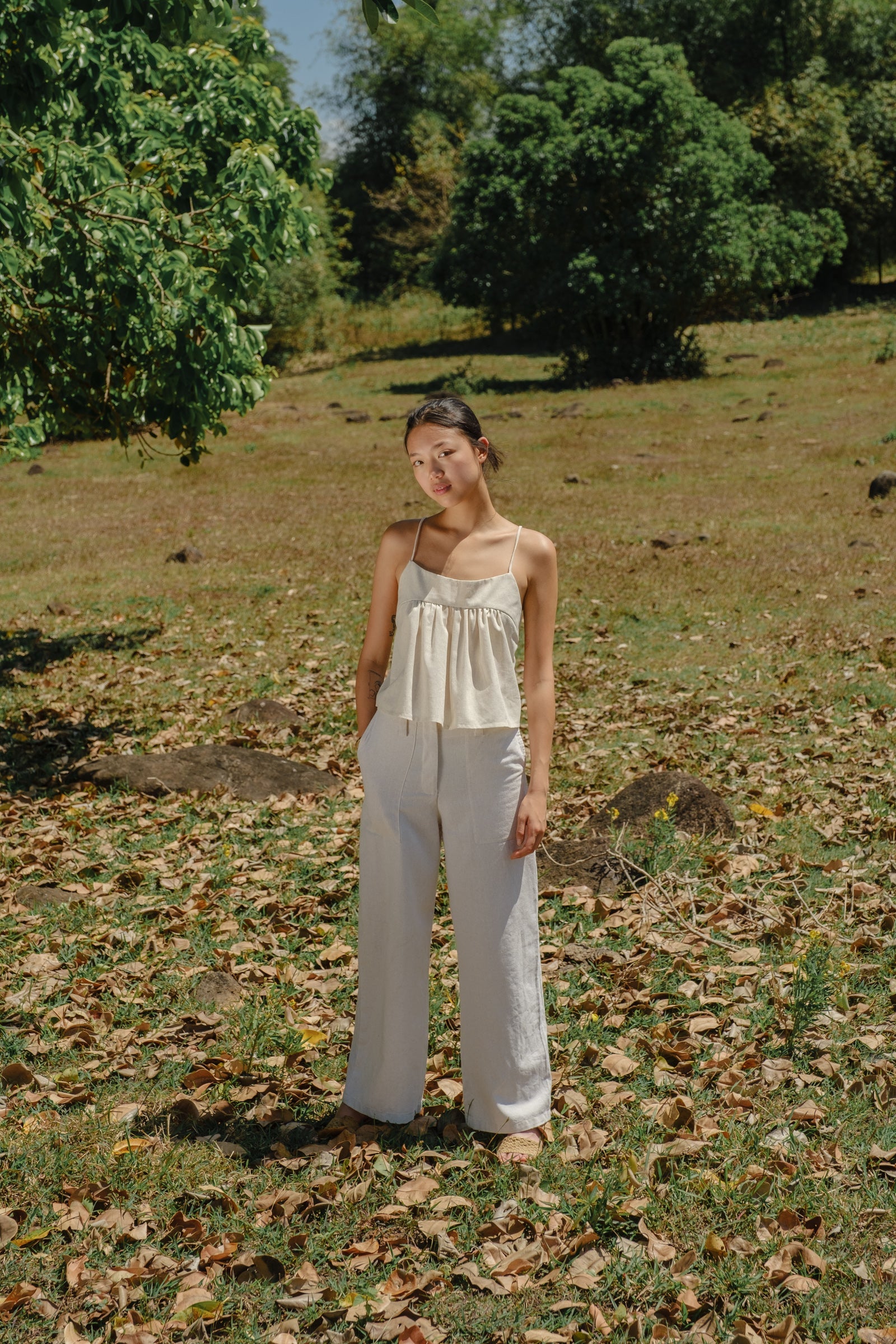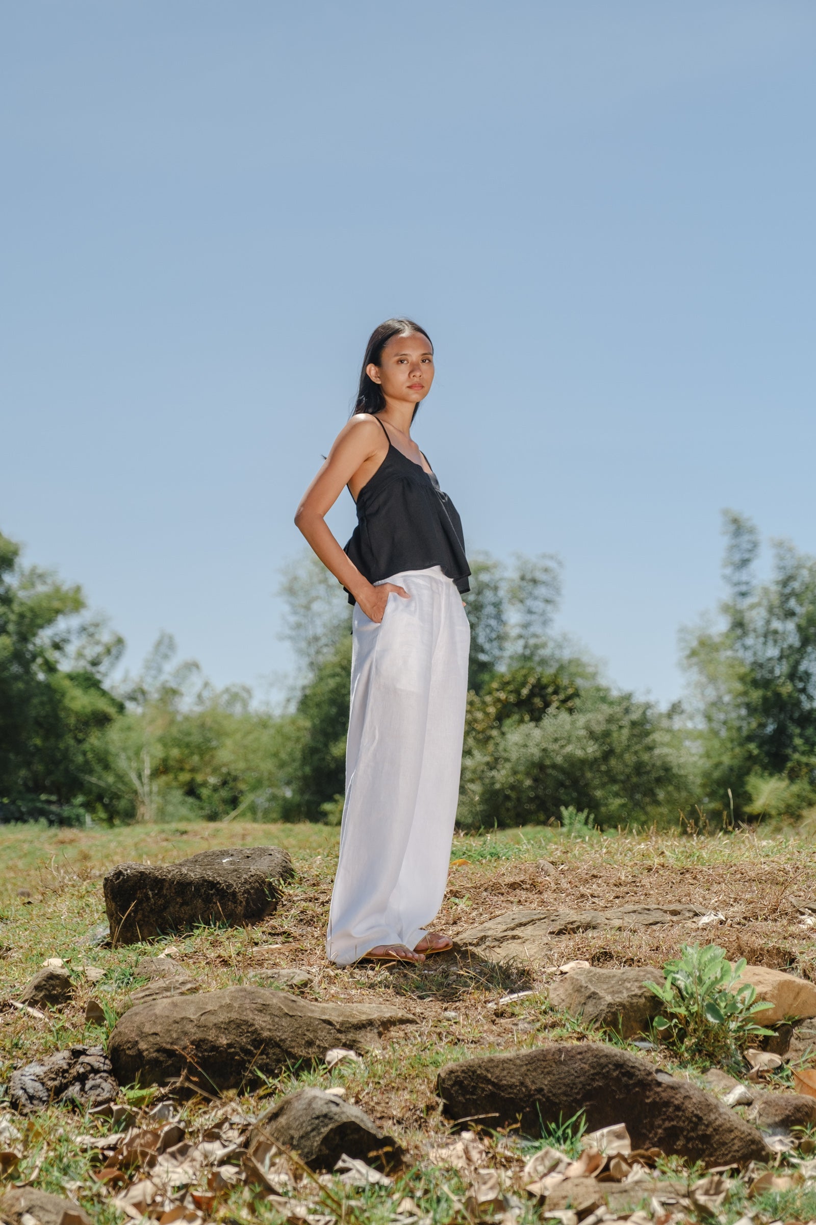 A new play on one of our best sellers. Flowy top with front ruffle details and back tie detail. Models wear Extra Small. Made in Linen.