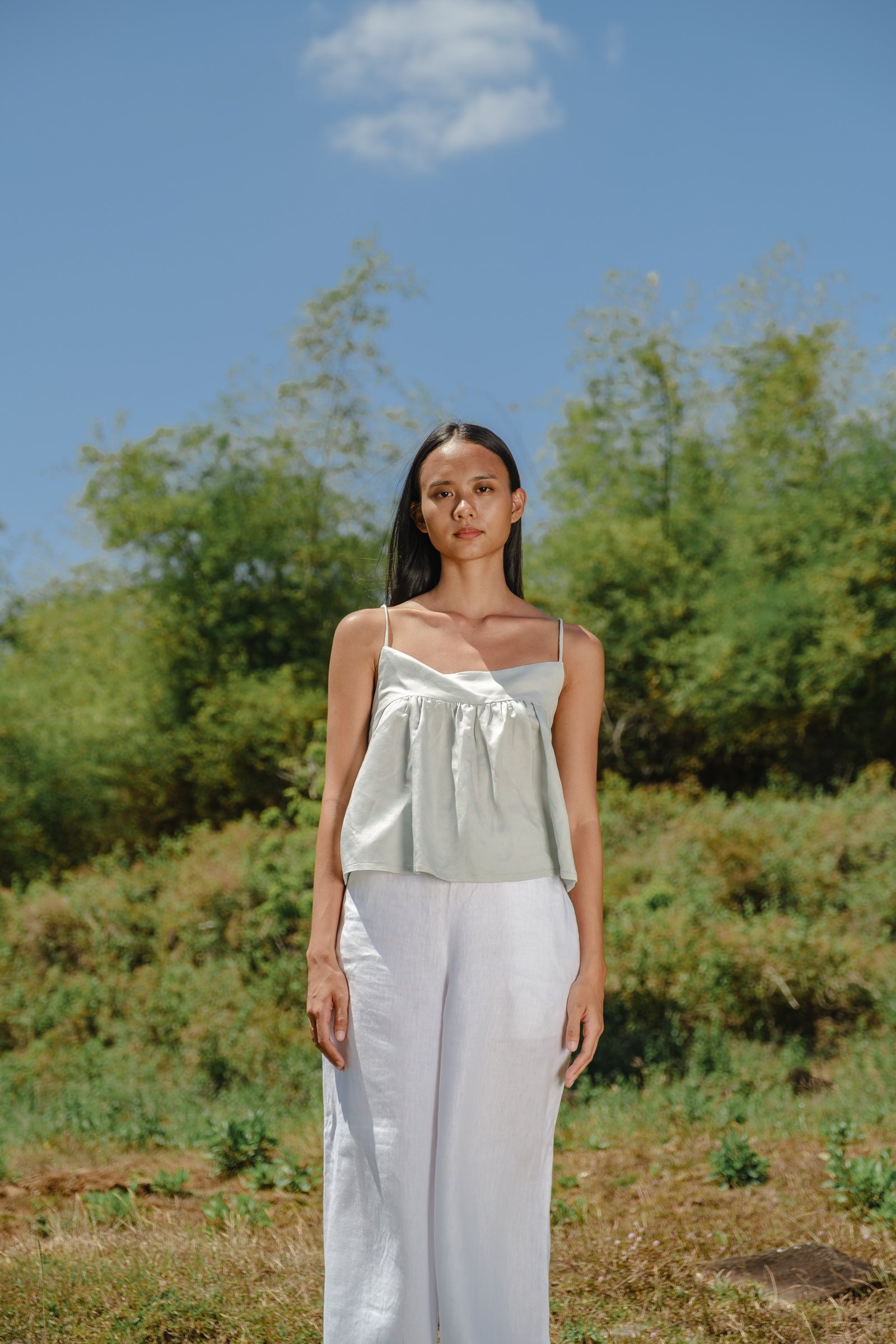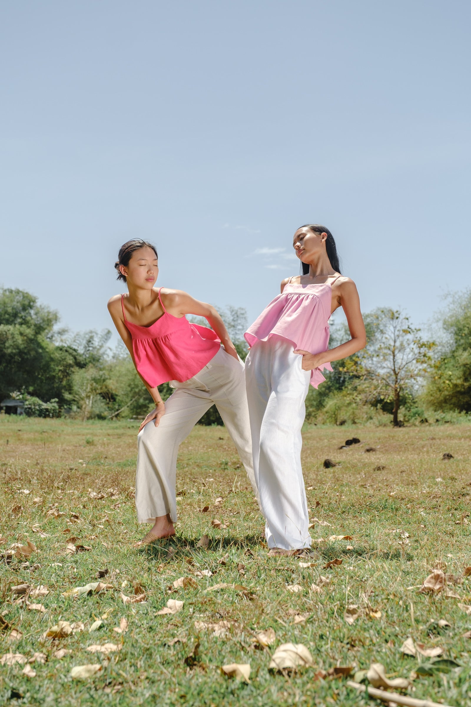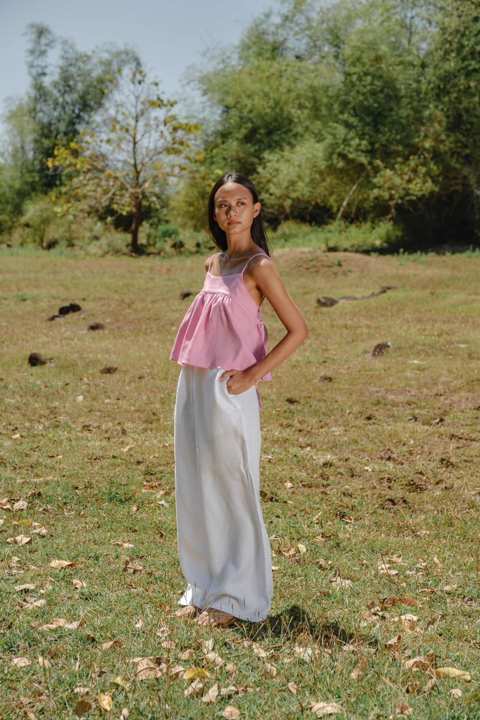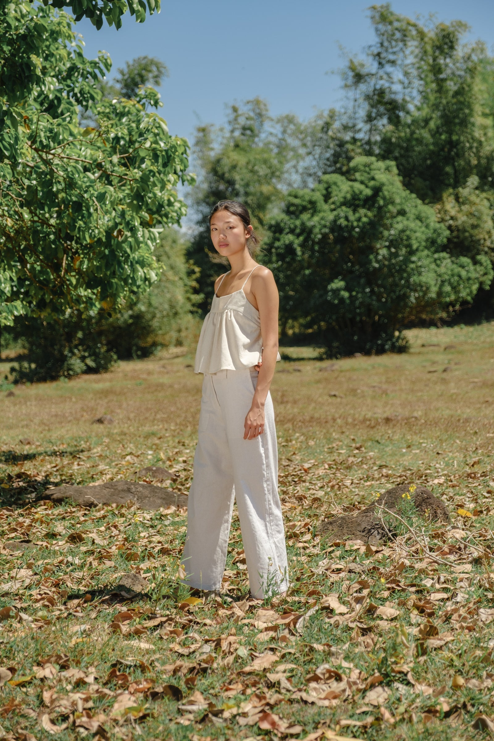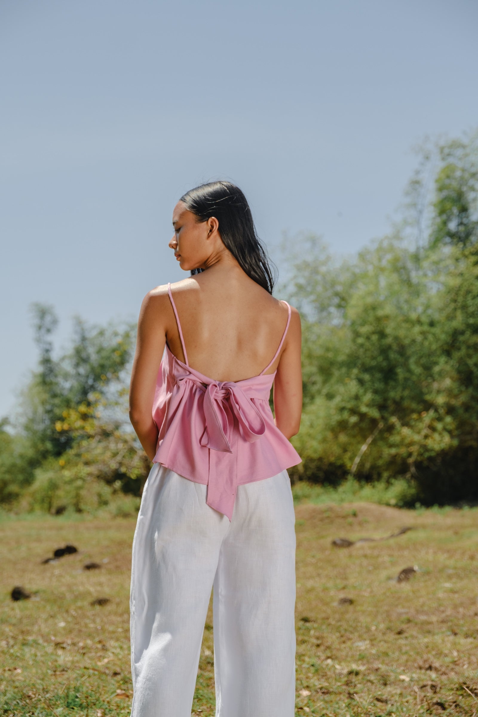 A new play on one of our best sellers. Flowy top with front ruffle details and back tie detail. Models wear Extra Small. Made in Linen.