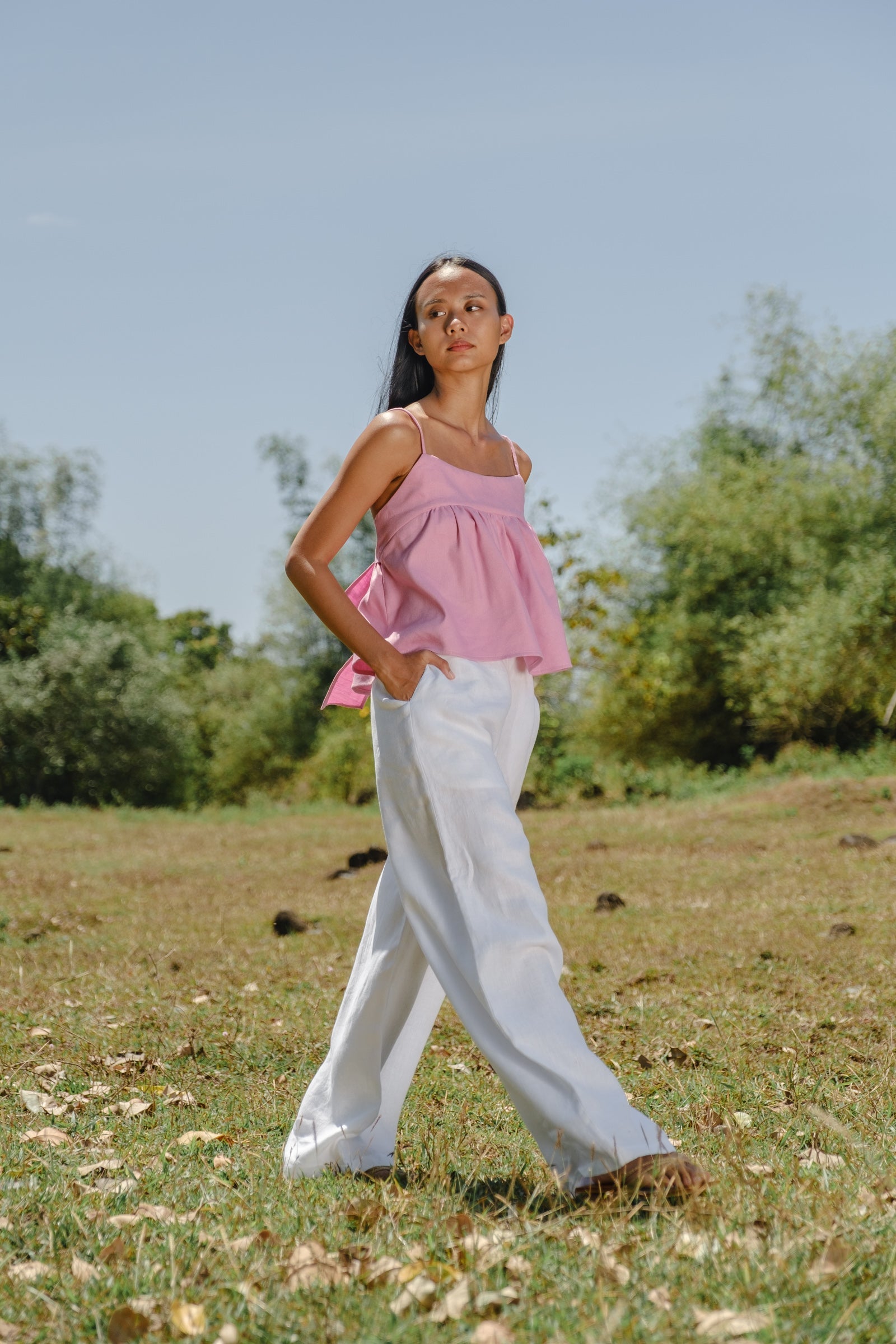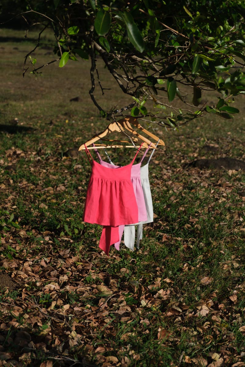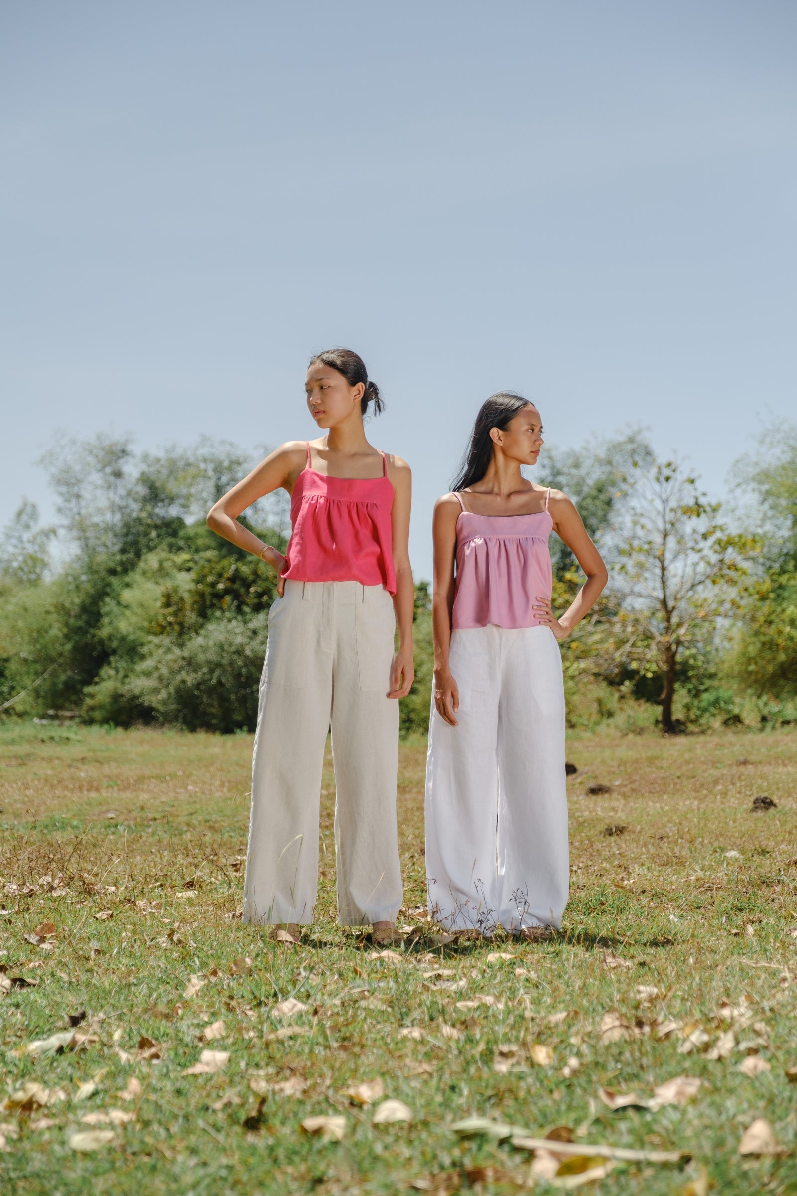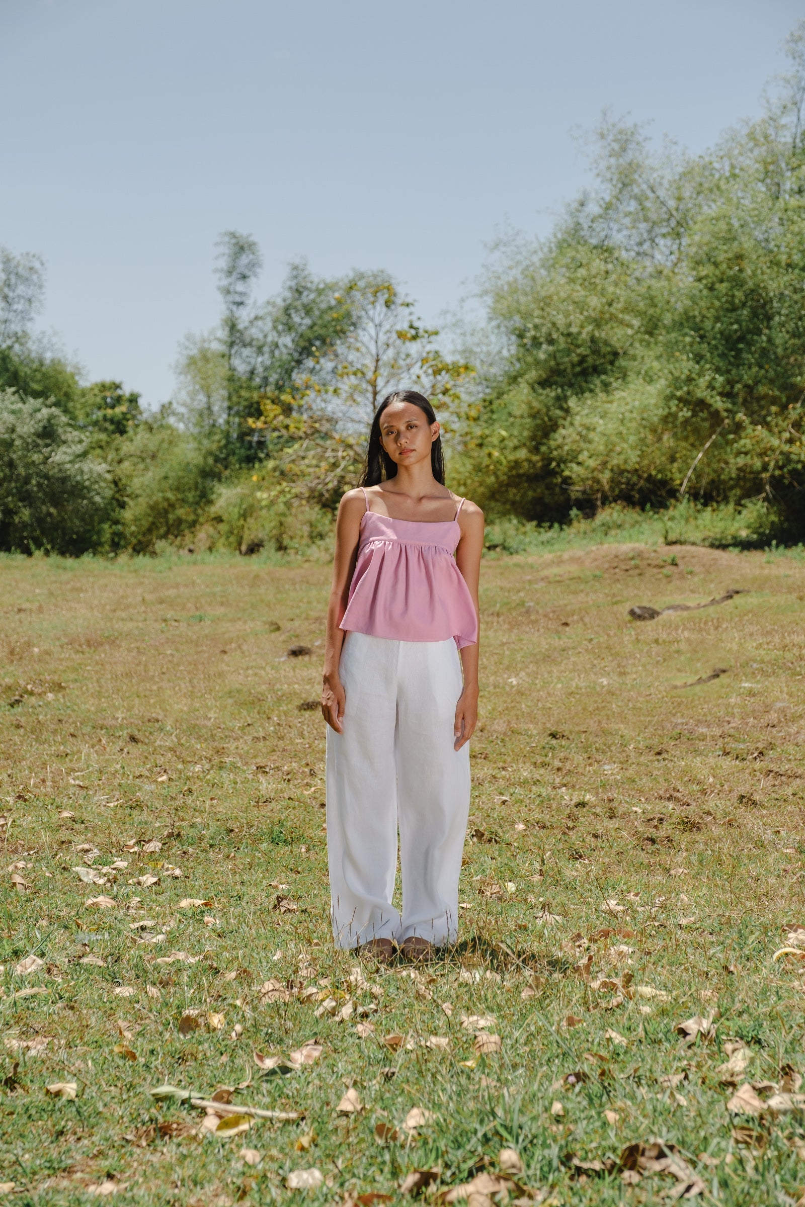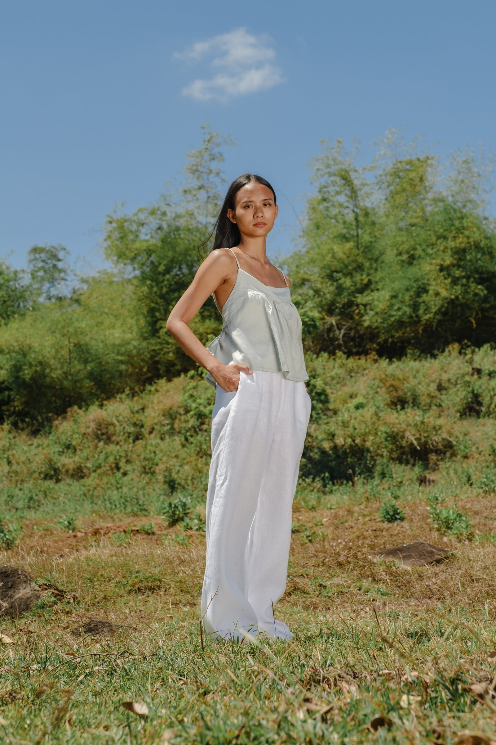 A new play on one of our best sellers. Flowy top with front ruffle details and back tie detail. Models wear Extra Small. Made in Linen.