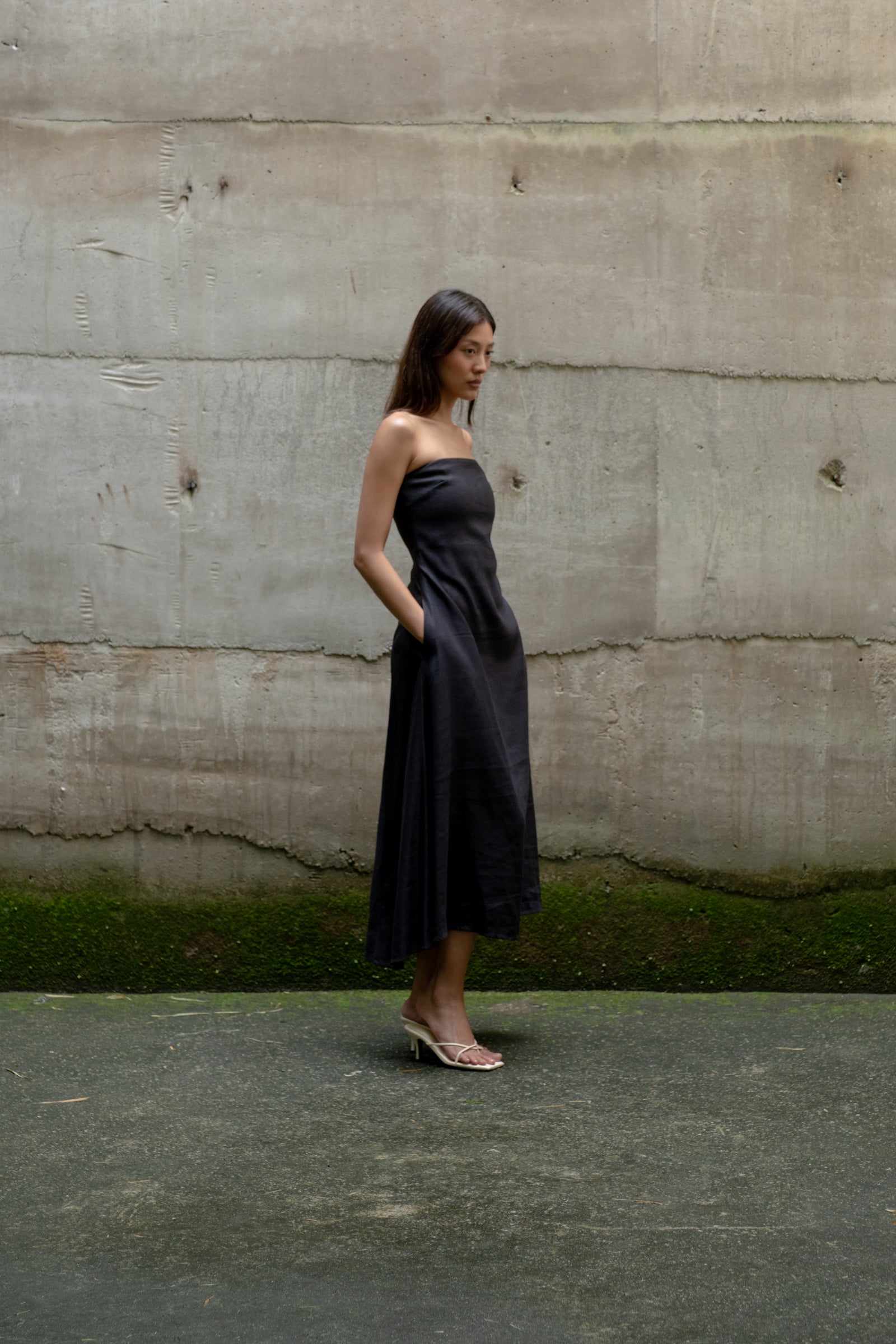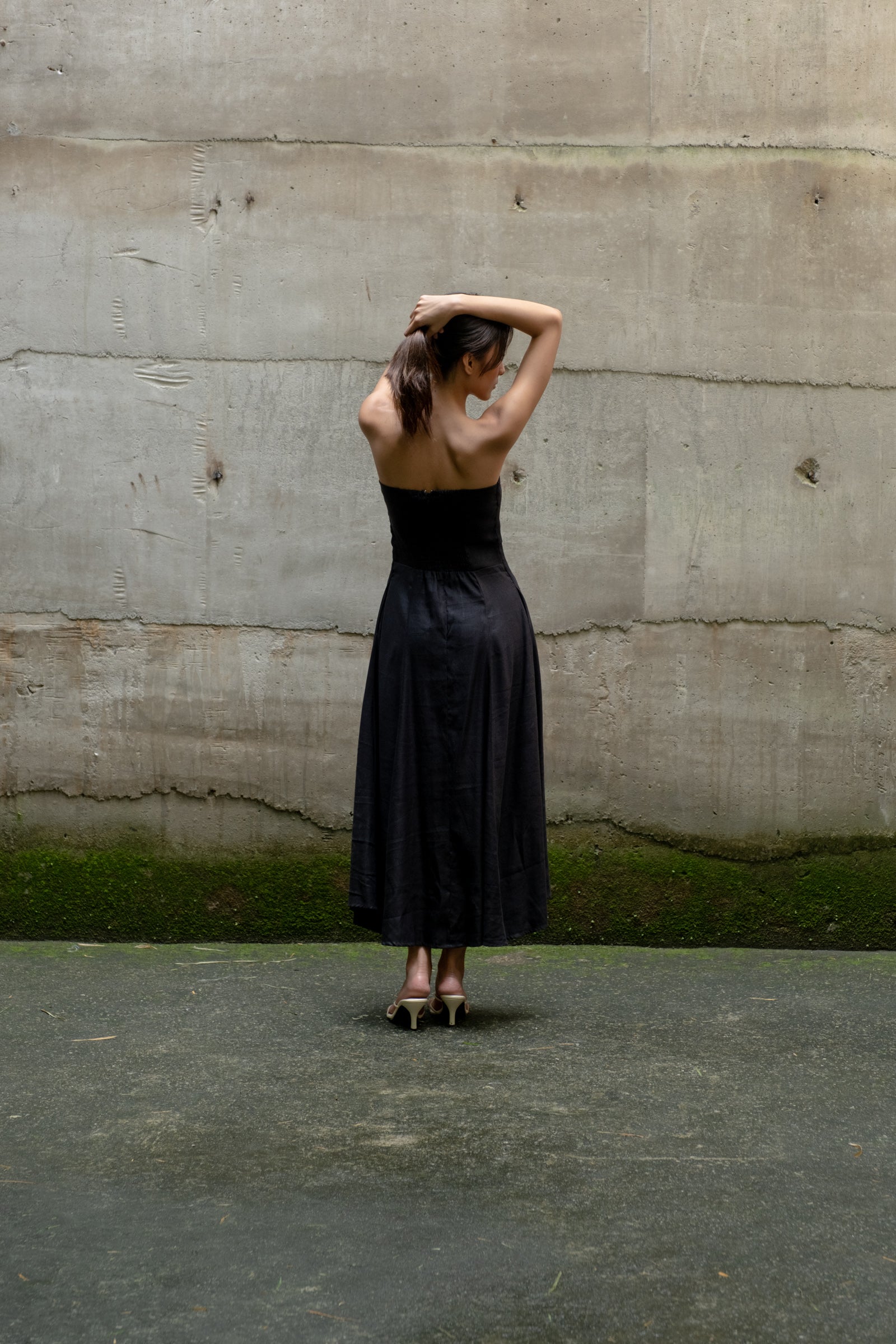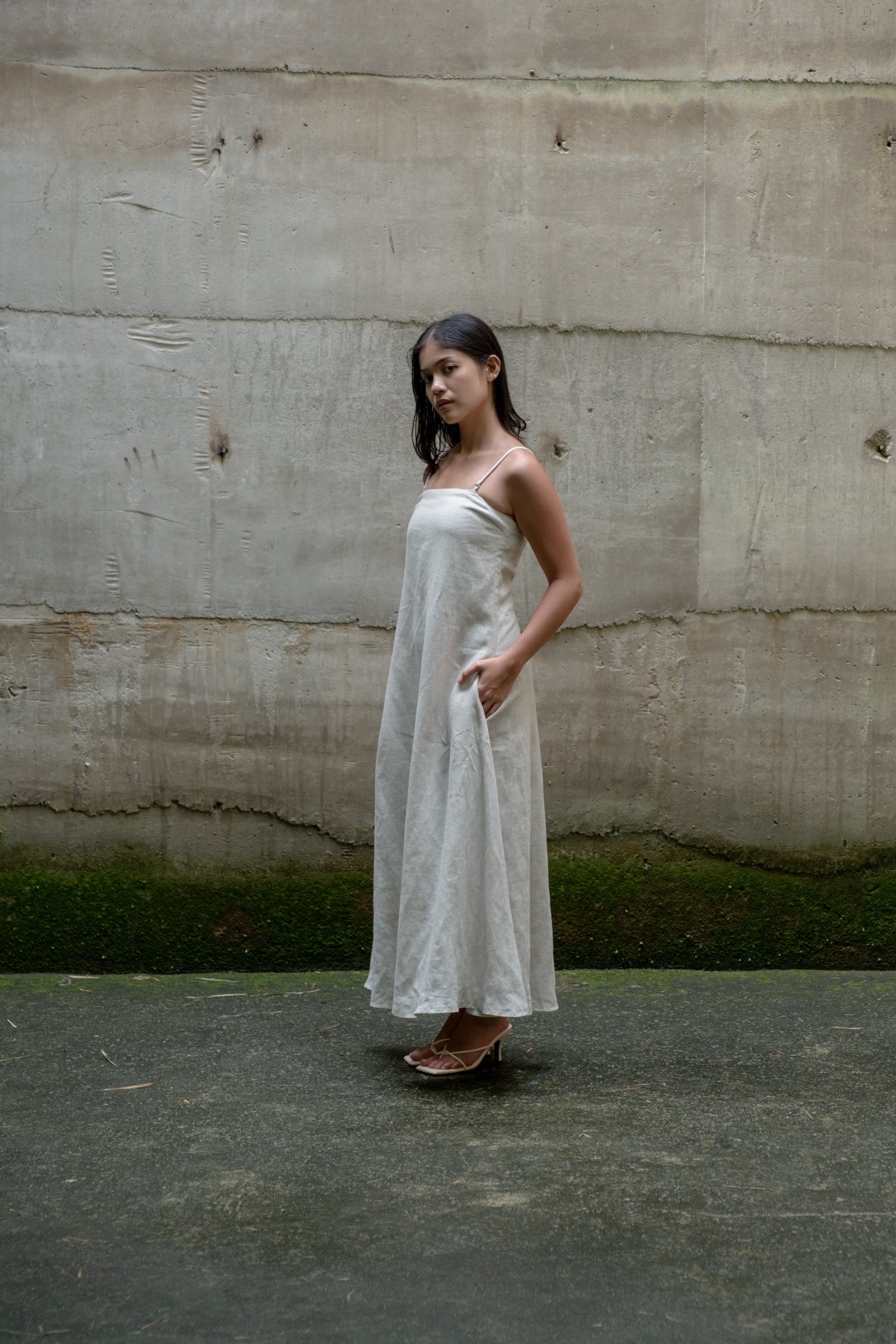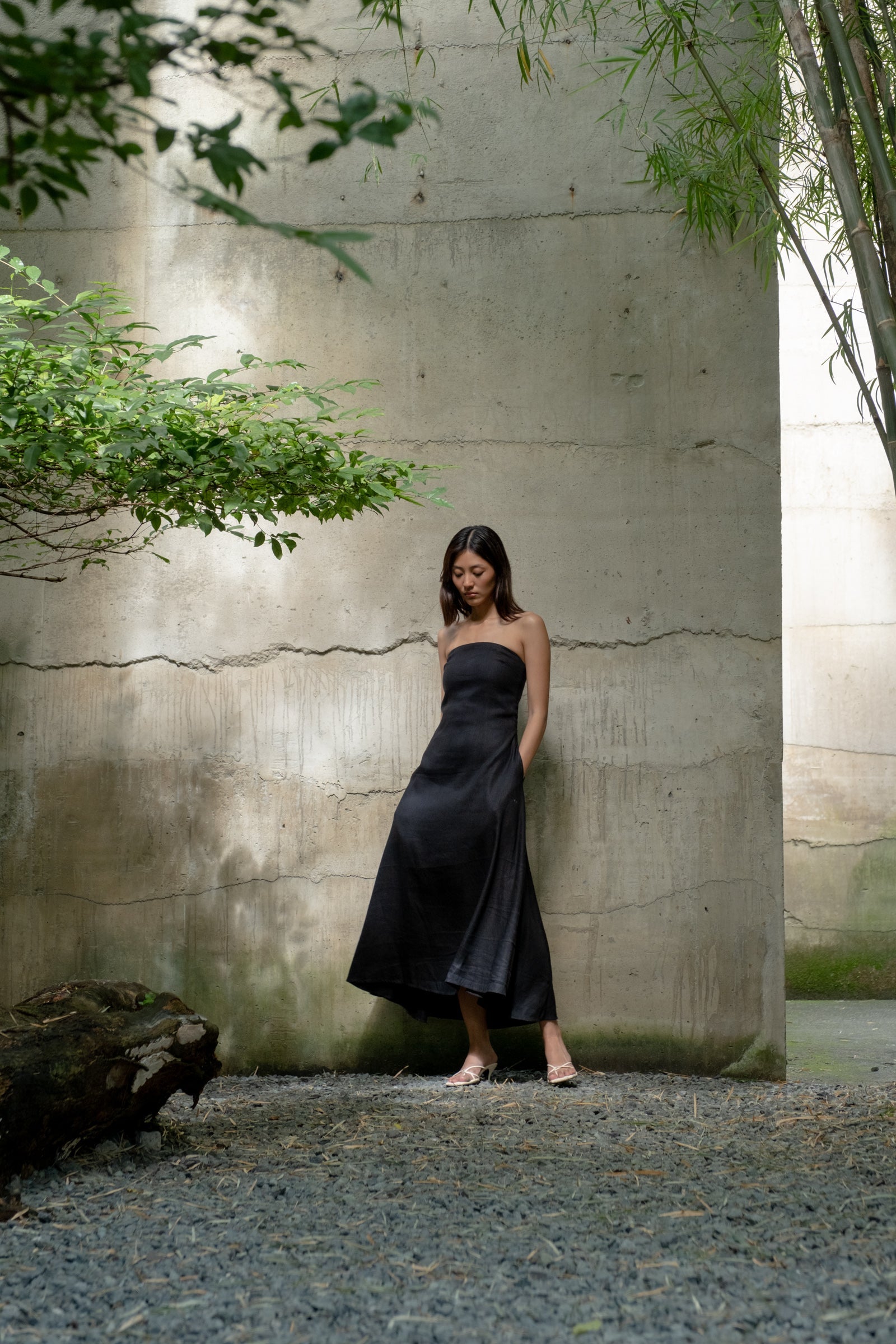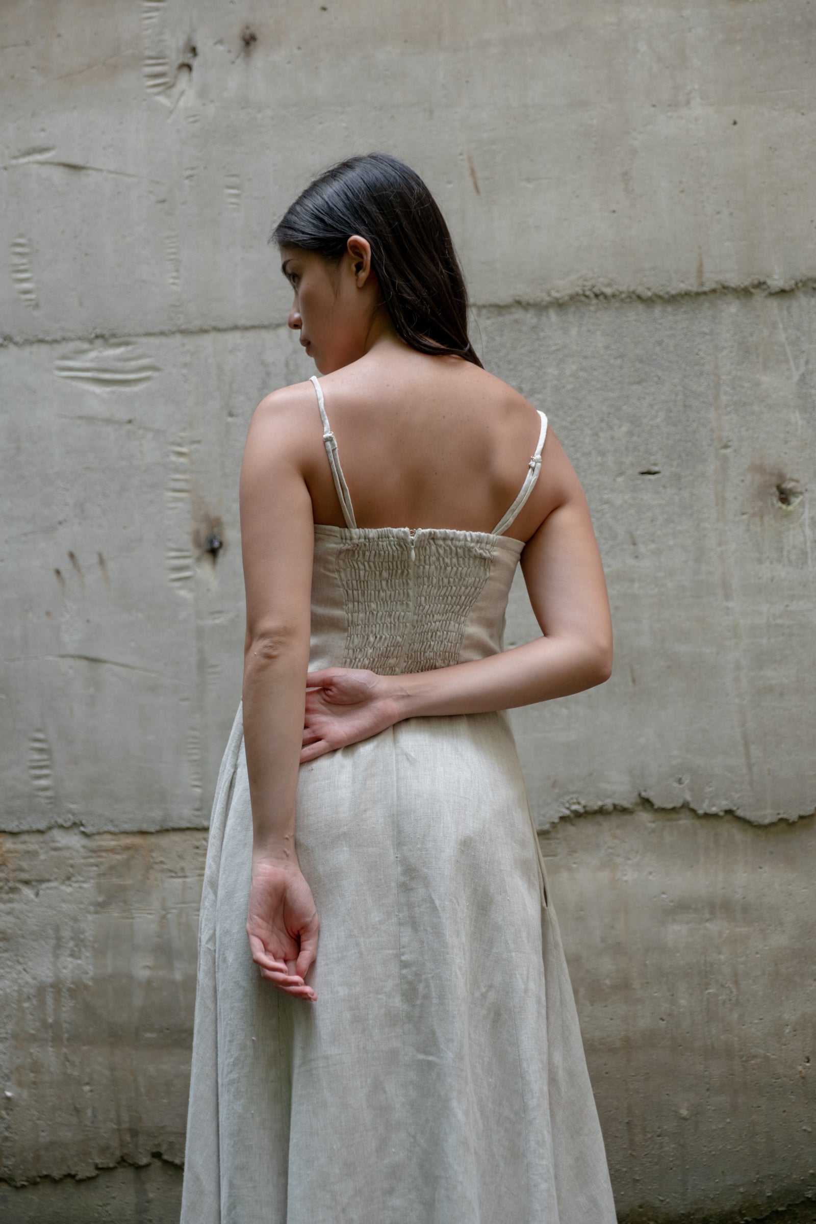 A 3in1 Maxi Dress. Features a breezy and flowy fit with a garterized back. Can be worn as a tube, with thin adjustable straps or with a garterized sleeve. Removable straps and sleeves are provided. Model wears Extra Small. Made in Linen.