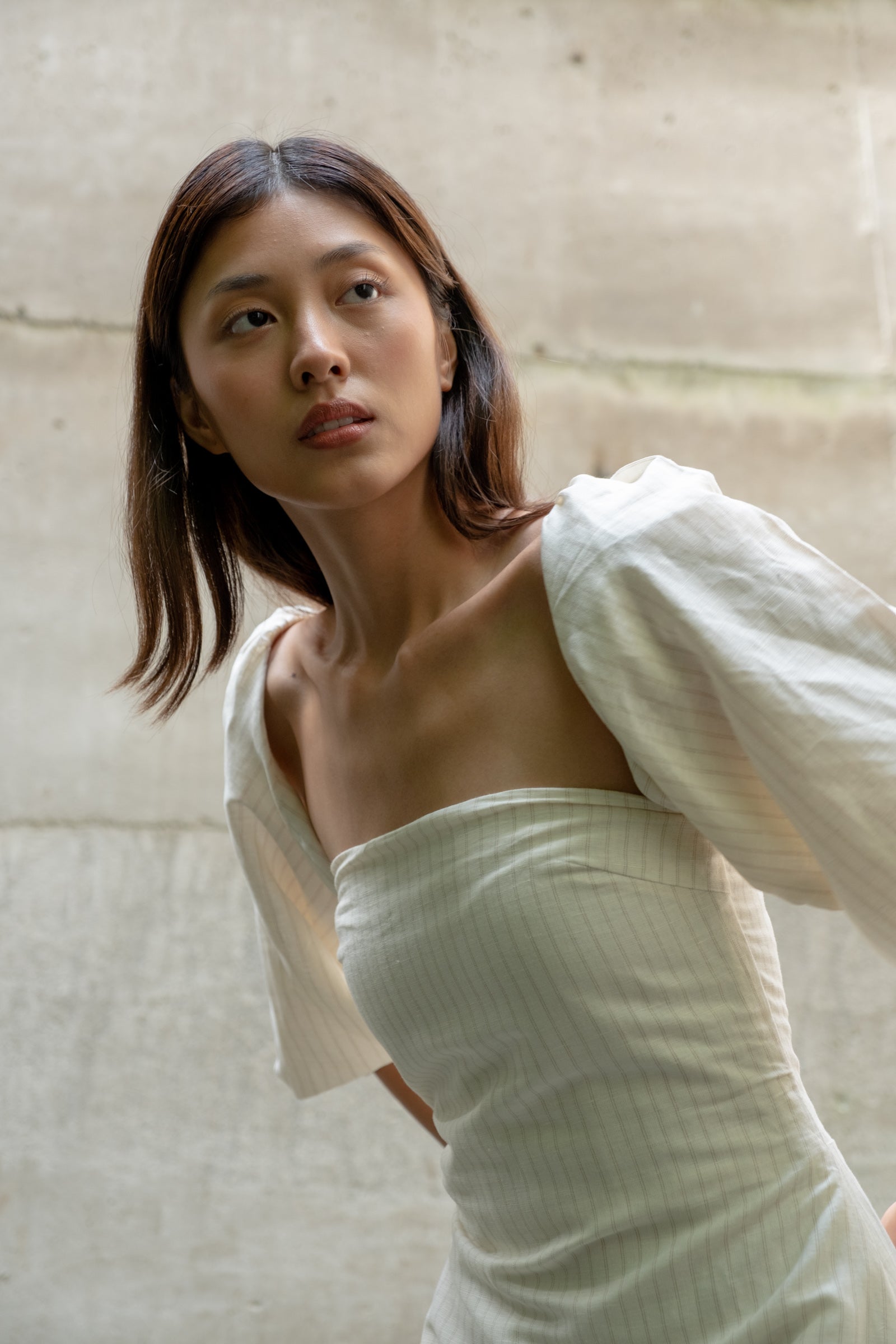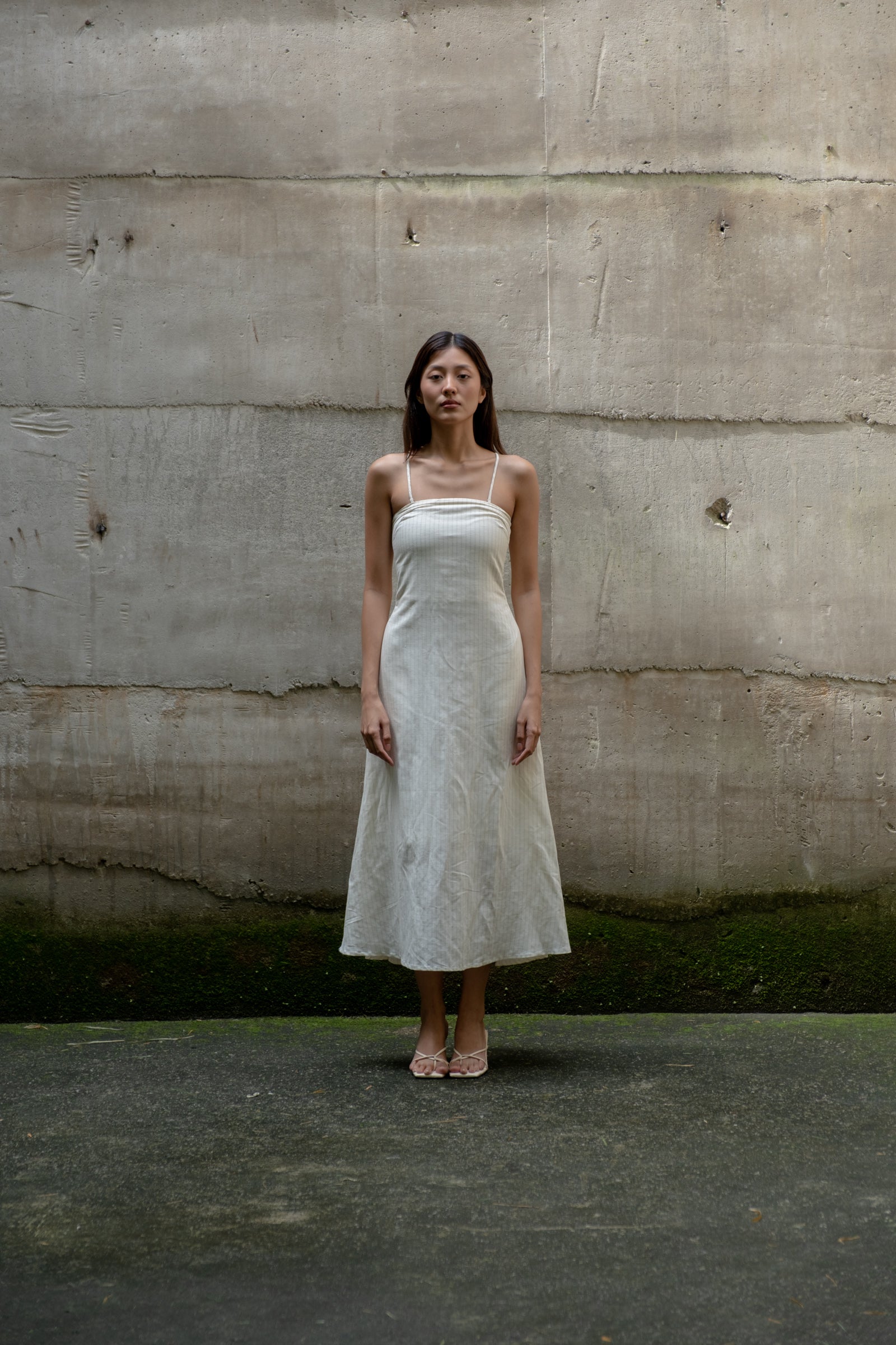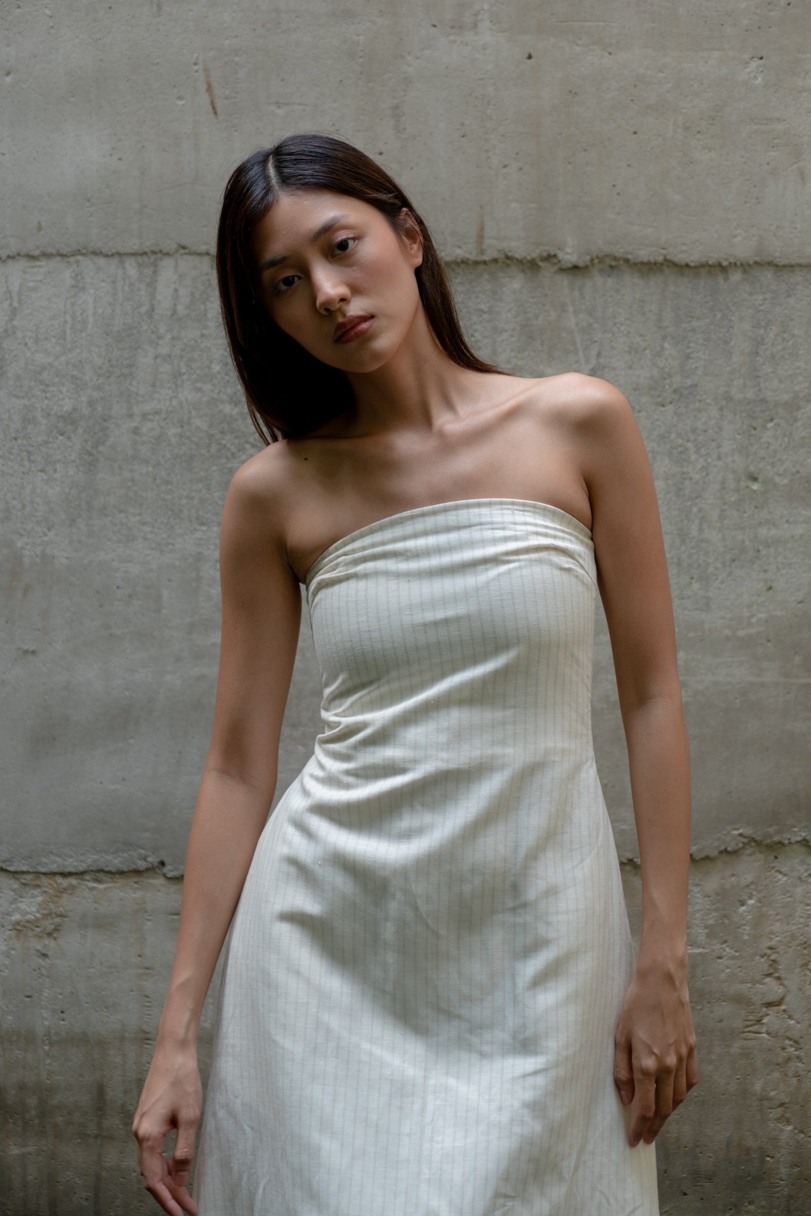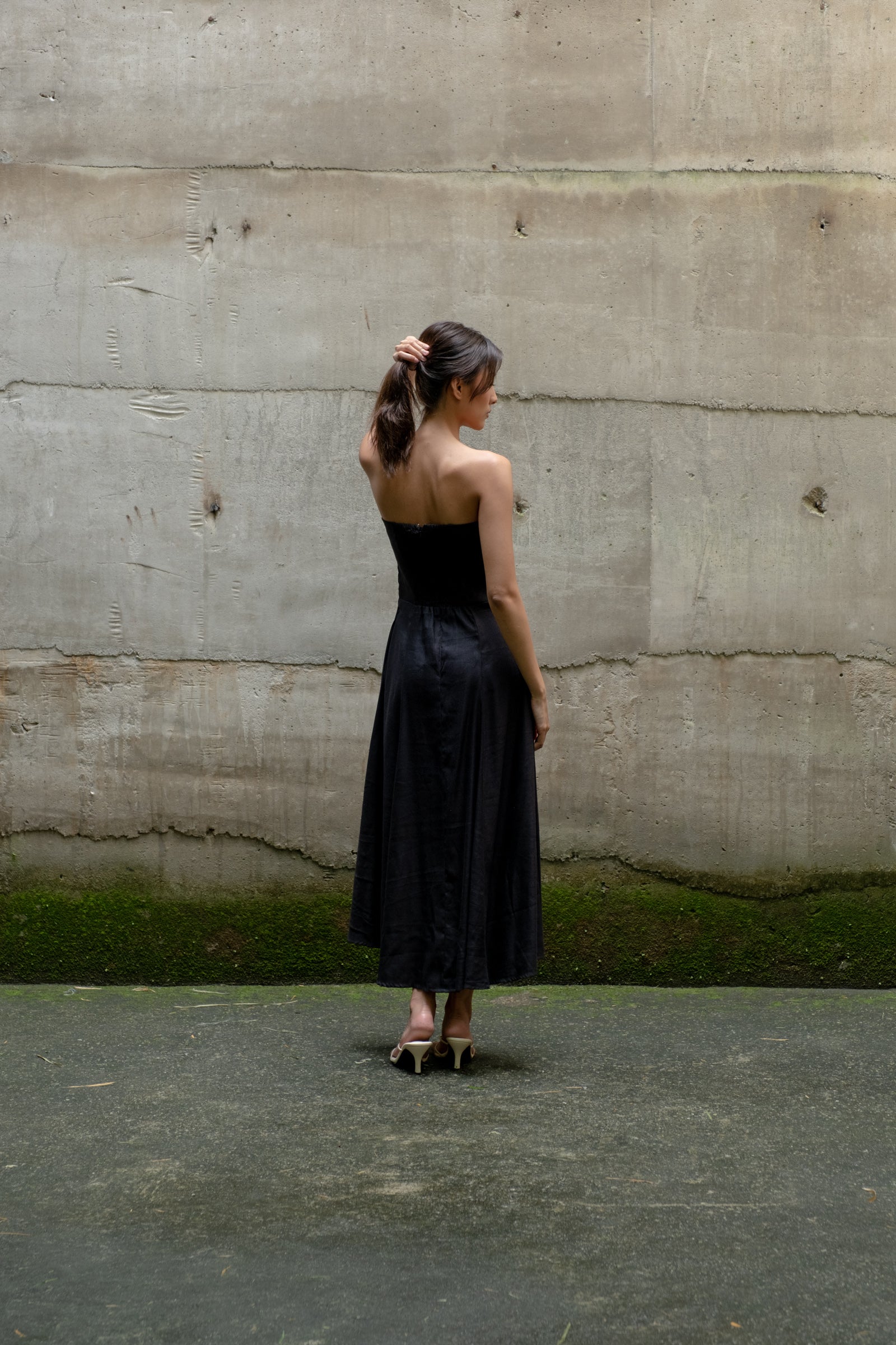 A 3in1 Maxi Dress. Features a breezy and flowy fit with a garterized back. Can be worn as a tube, with thin adjustable straps or with a garterized sleeve. Removable straps and sleeves are provided. Model wears Extra Small. Made in Linen.
