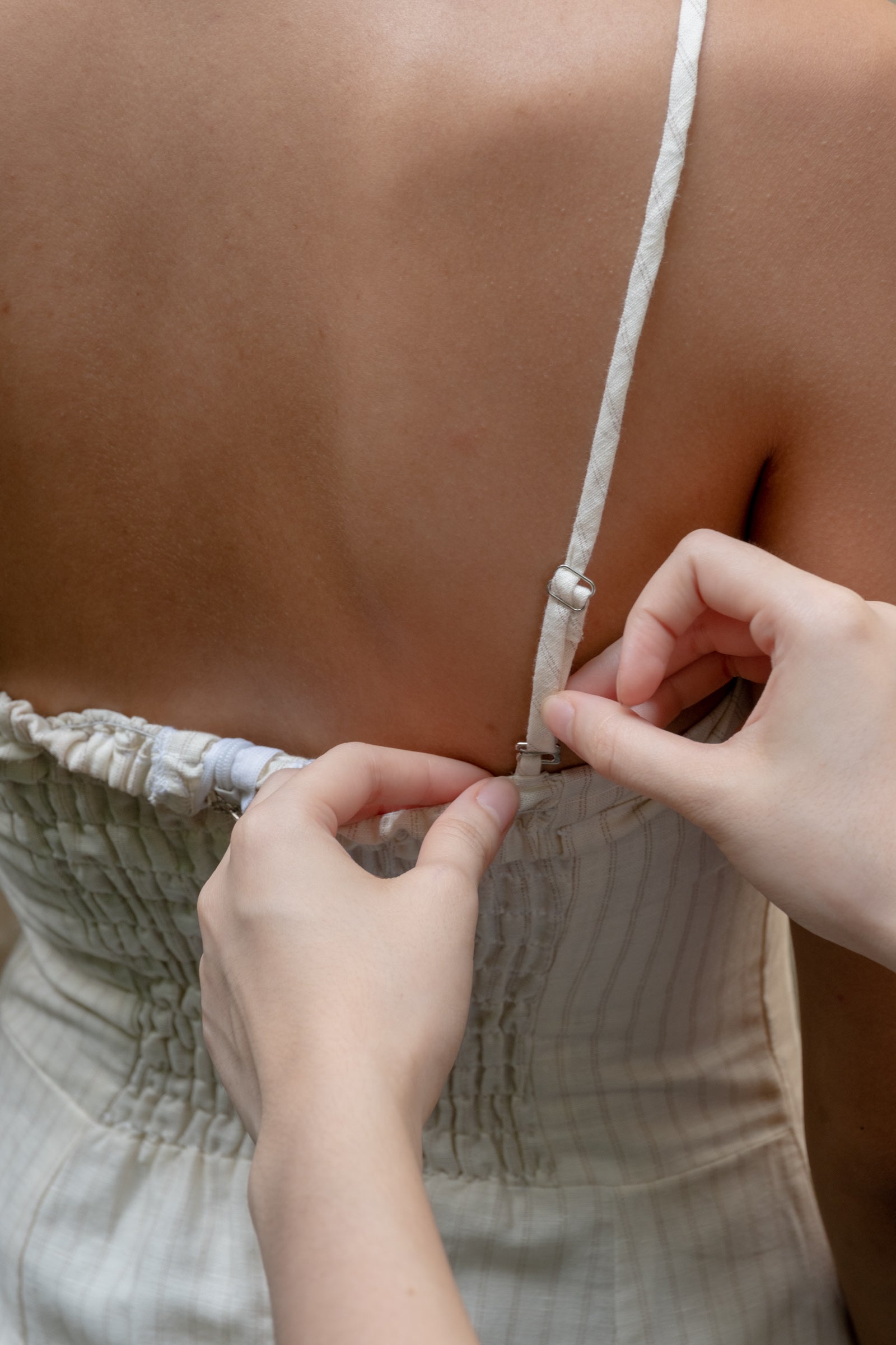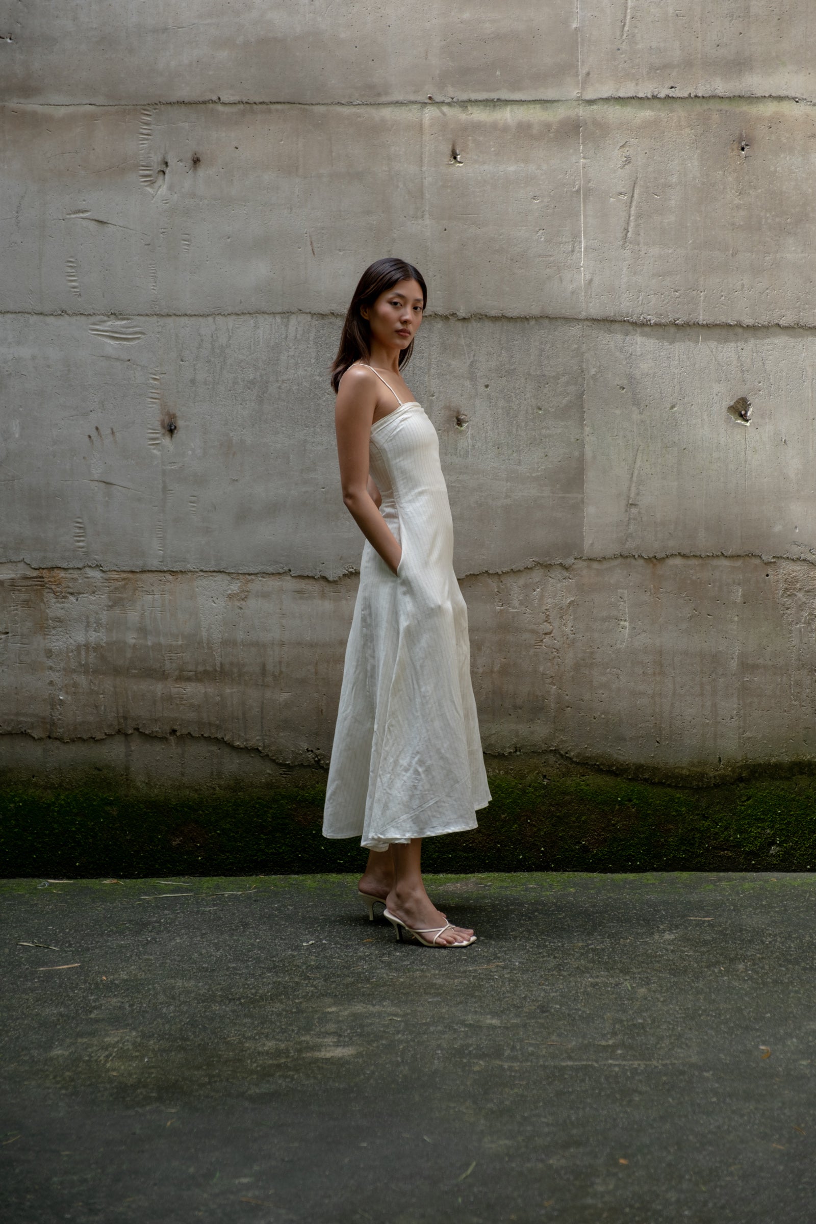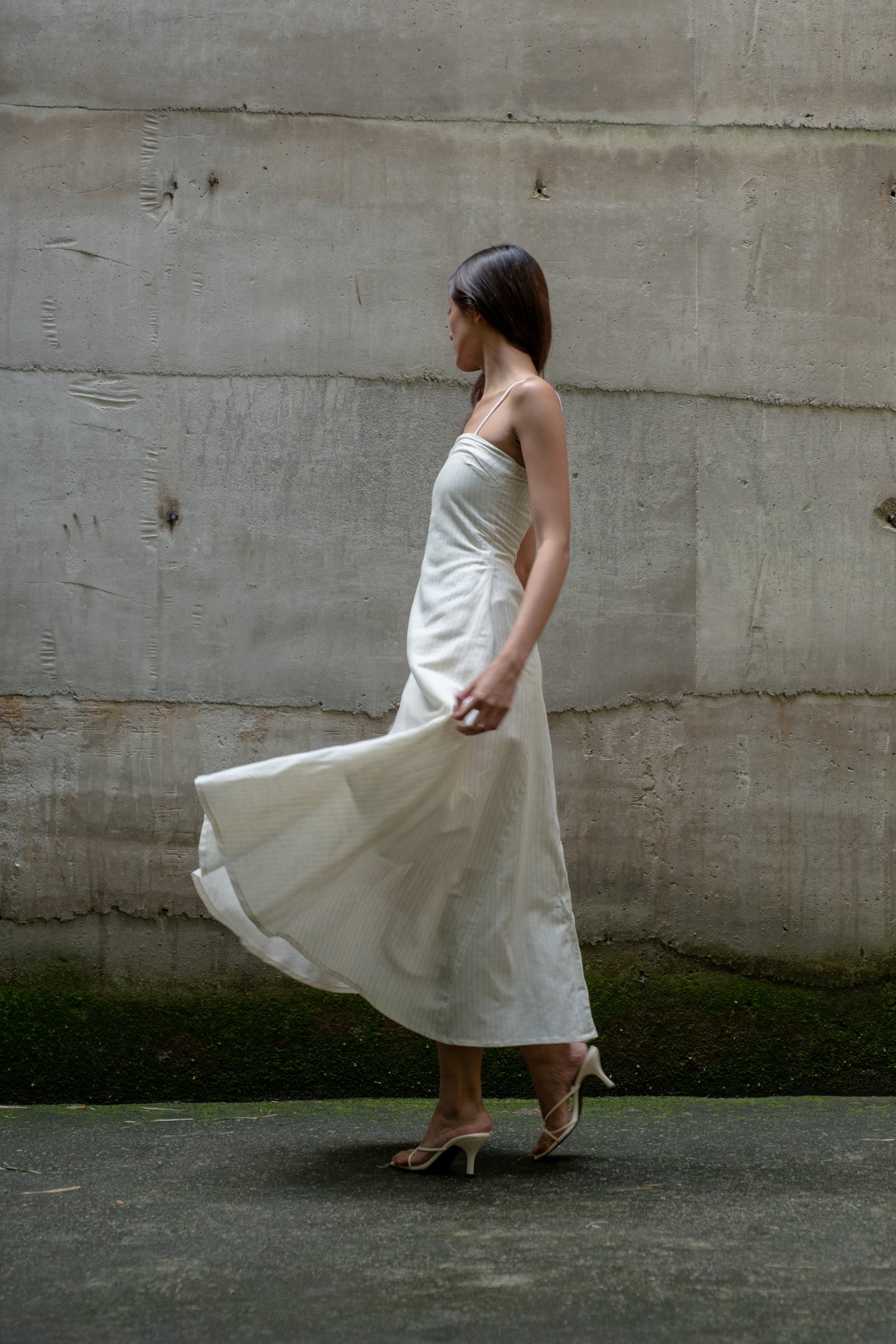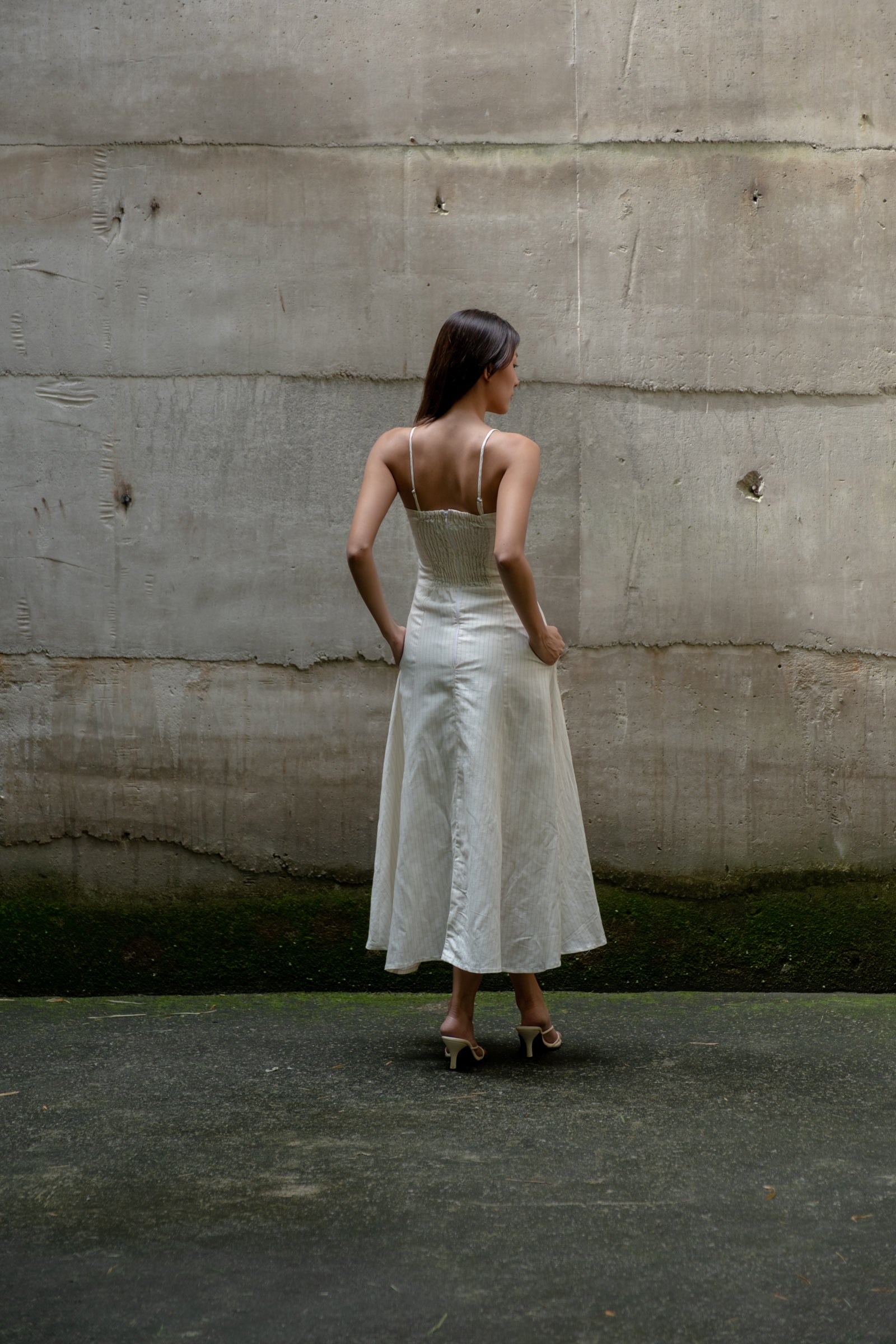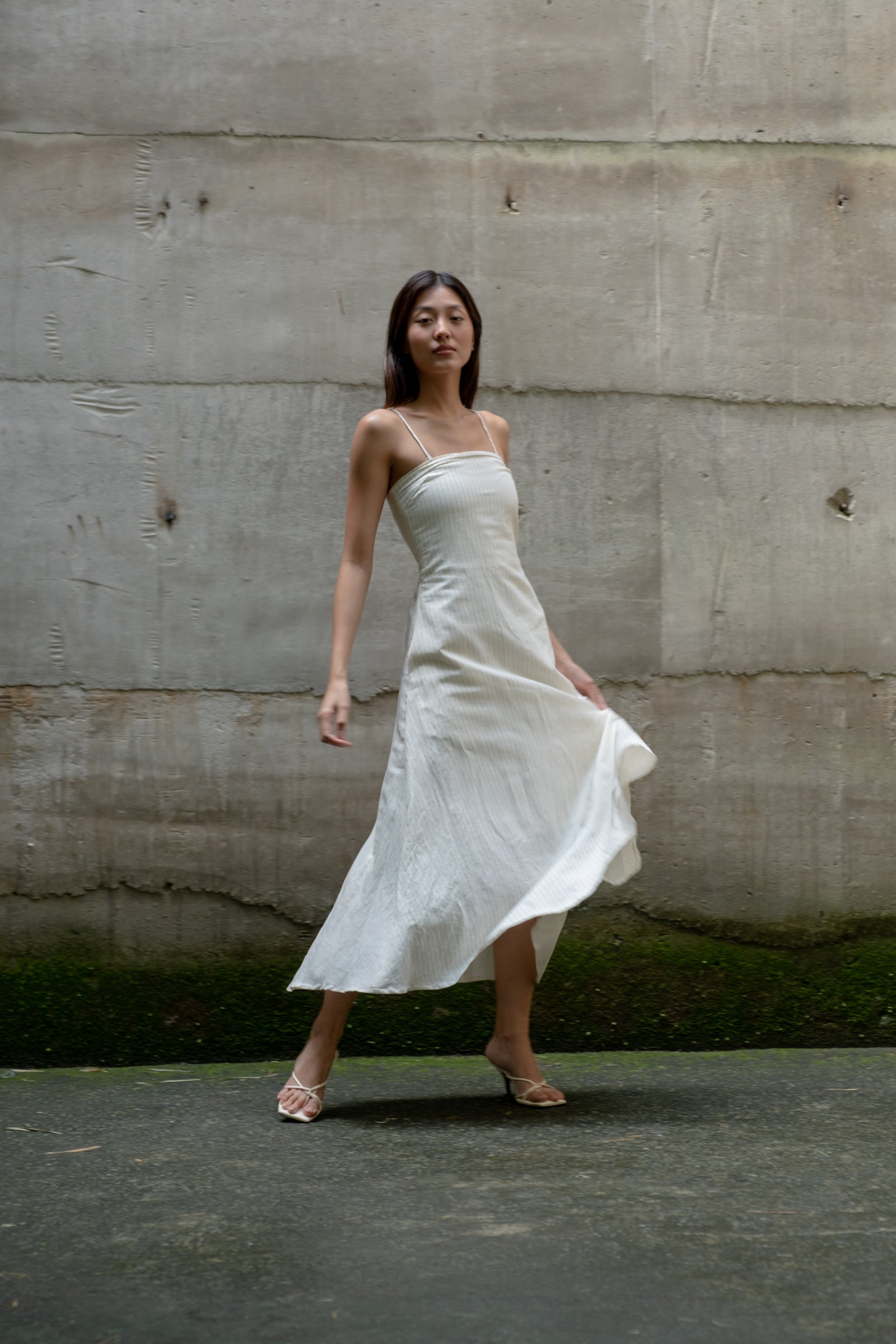 A 3in1 Maxi Dress. Features a breezy and flowy fit with a garterized back. Can be worn as a tube, with thin adjustable straps or with a garterized sleeve. Removable straps and sleeves are provided. Model wears Extra Small. Made in Linen.