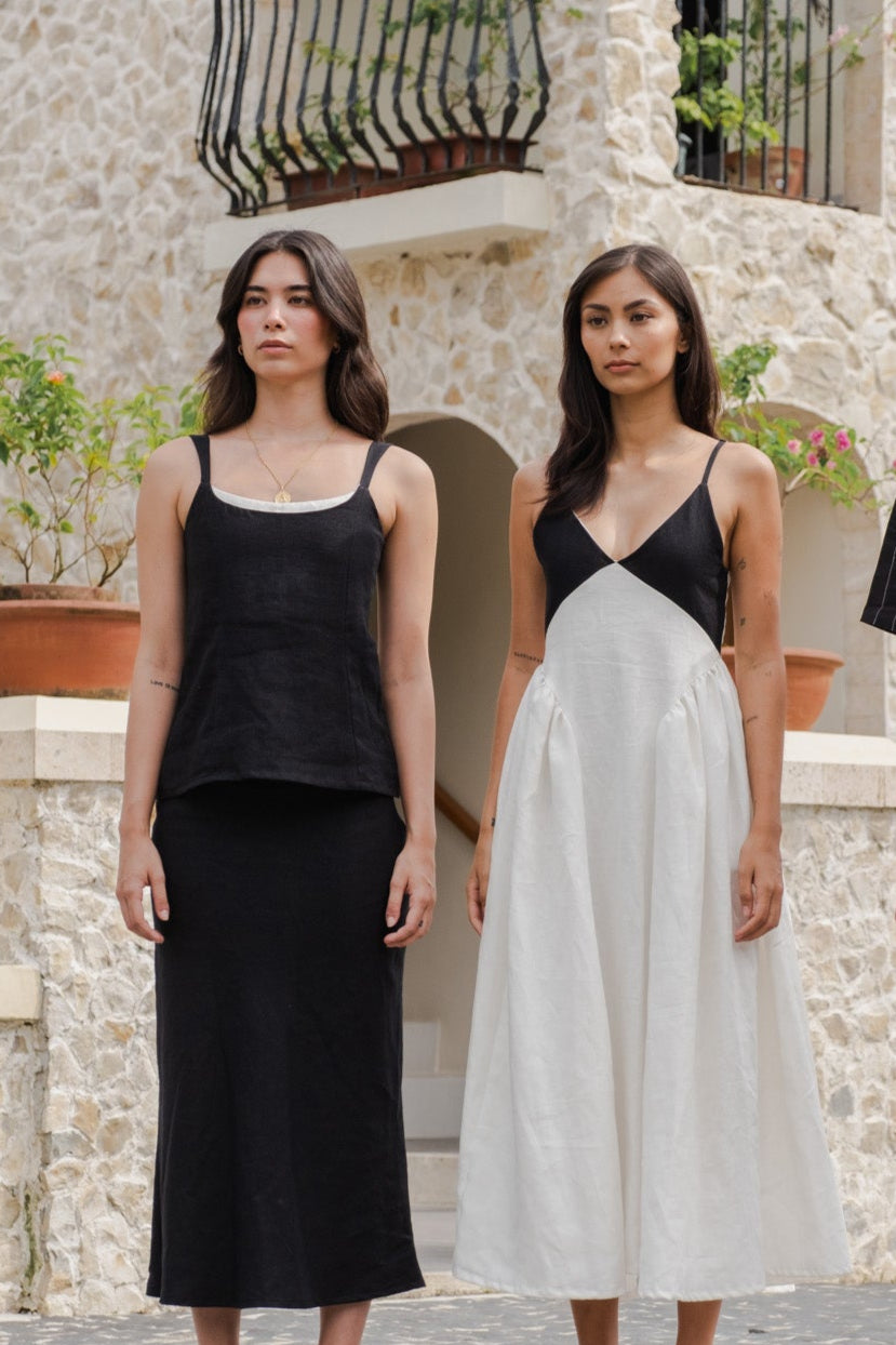 The Mina Top features a flattering scoop neckline with thinning straps. It features a contrast inner top detail with front and back tucks for a slimming fit. Best paired with the Cami Bias Skirt or Colina Mini Skirt. Made in Linen. Model wears Extra Small.