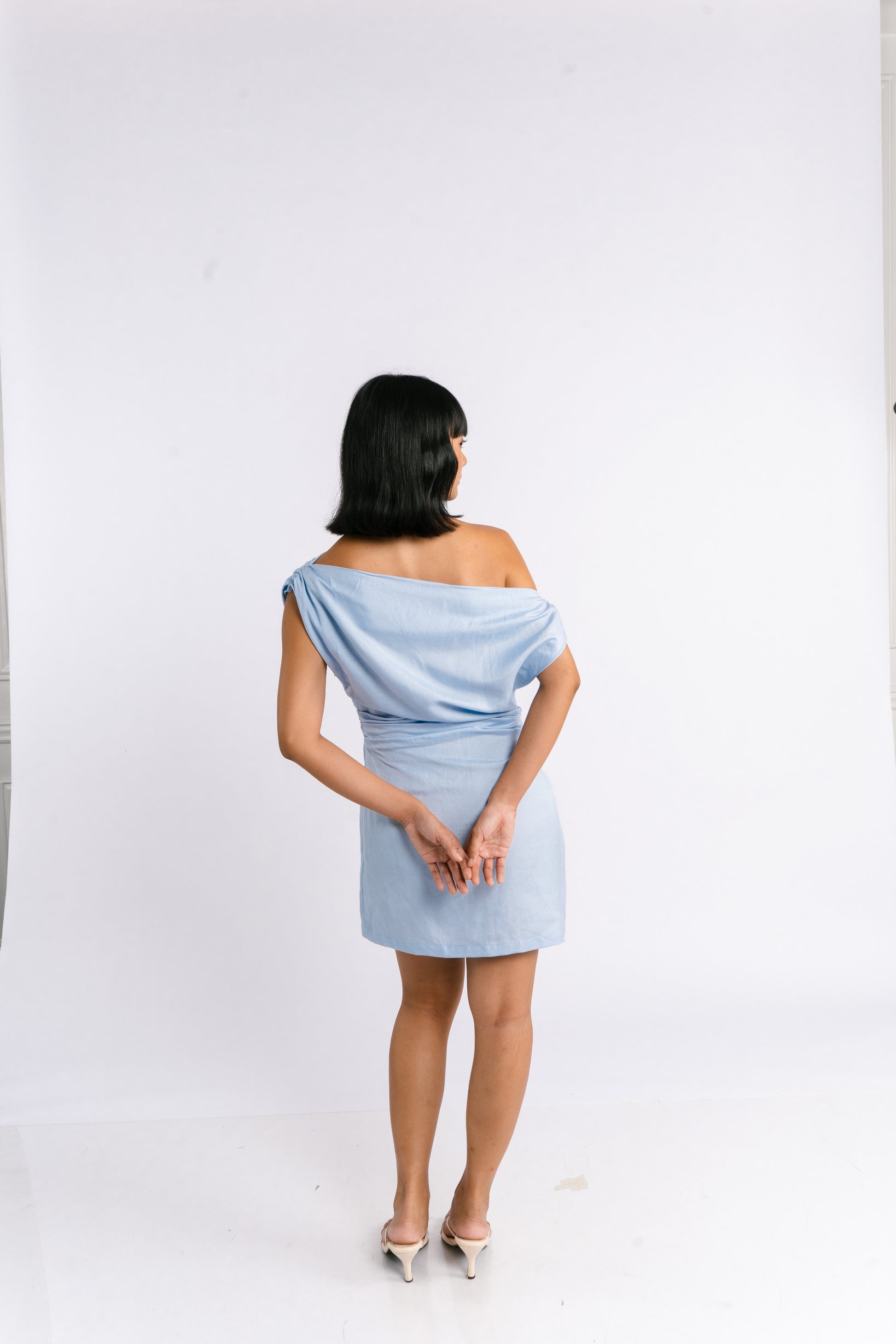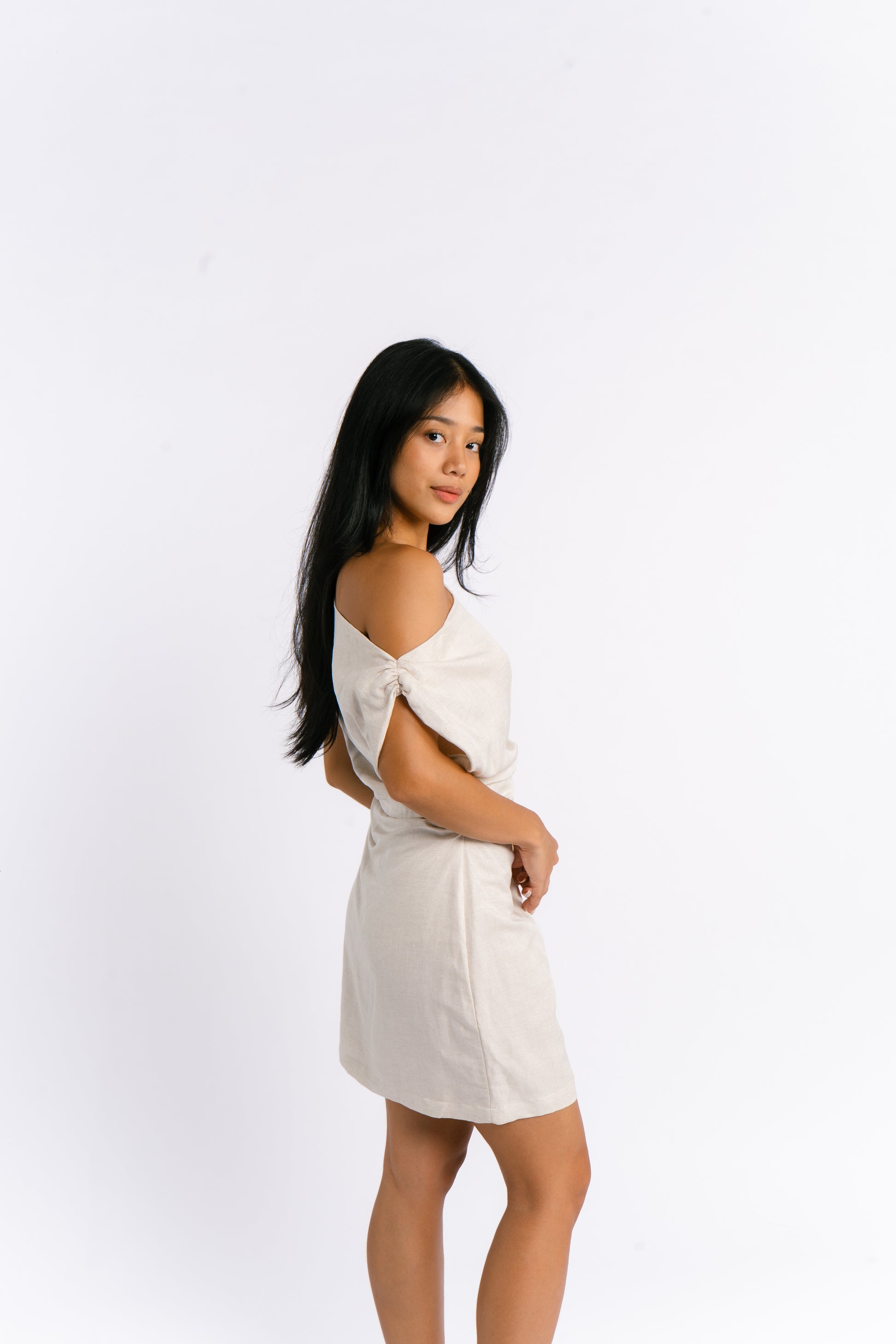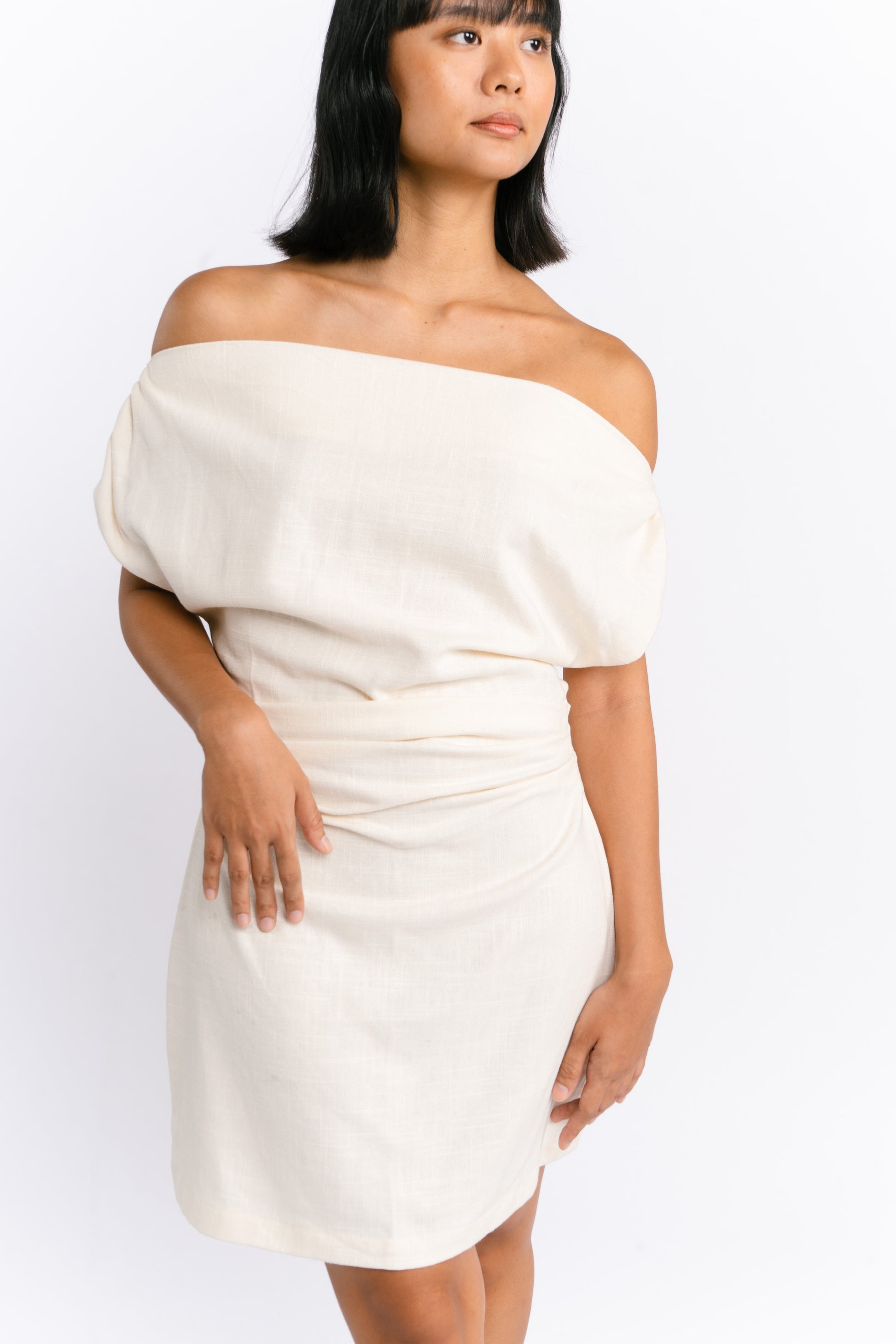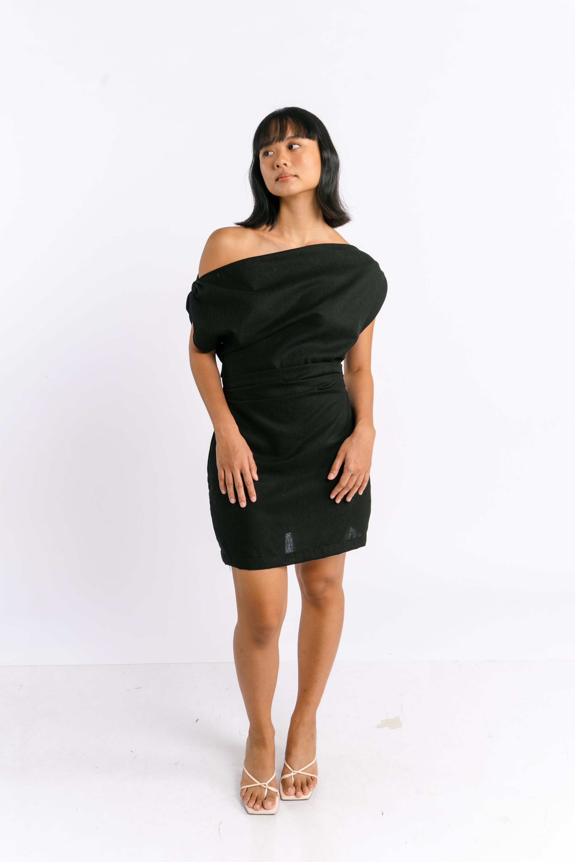 The Aitana Mini Dress features shoulder and waist pleat details. It comes with a side zipper and can be styled off shoulder or asymmetrical neckline. Made in Linen. Models wear XS.