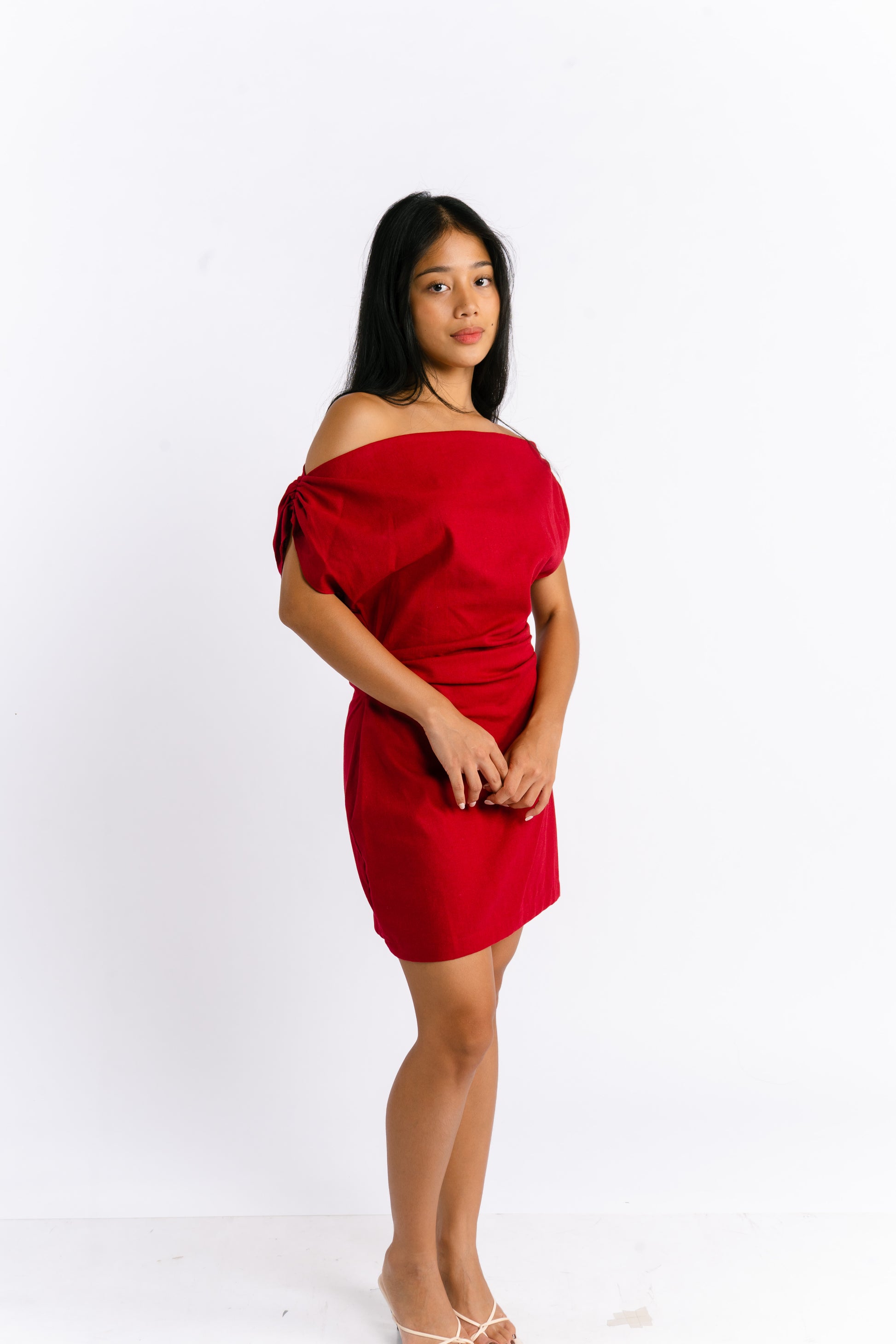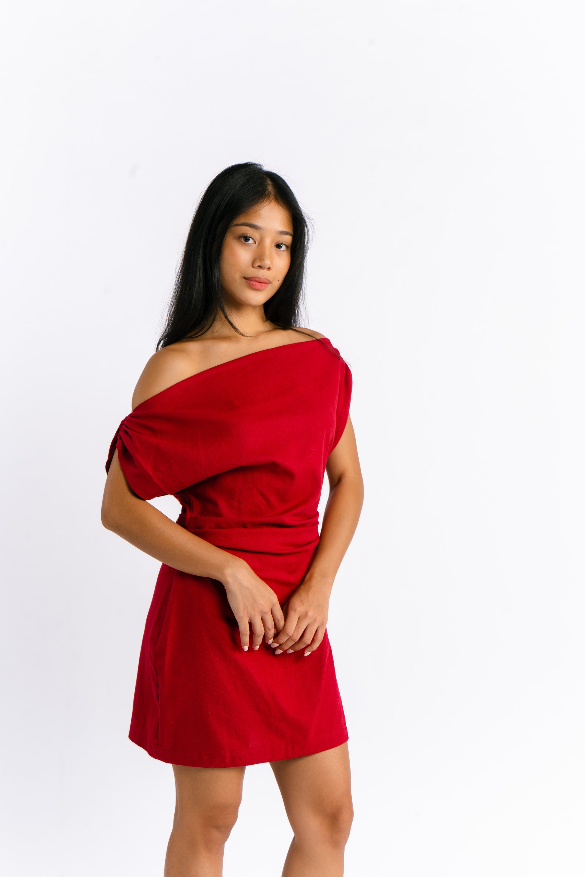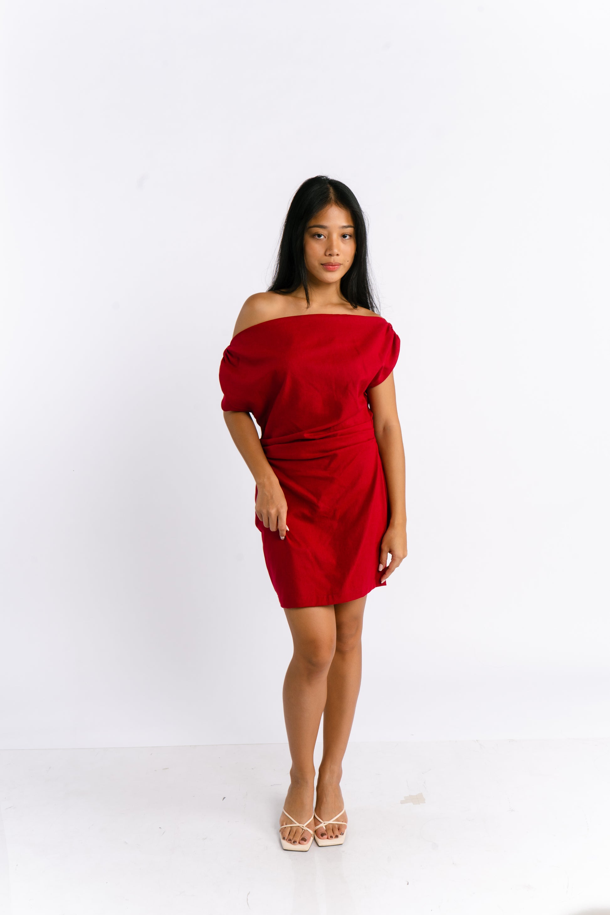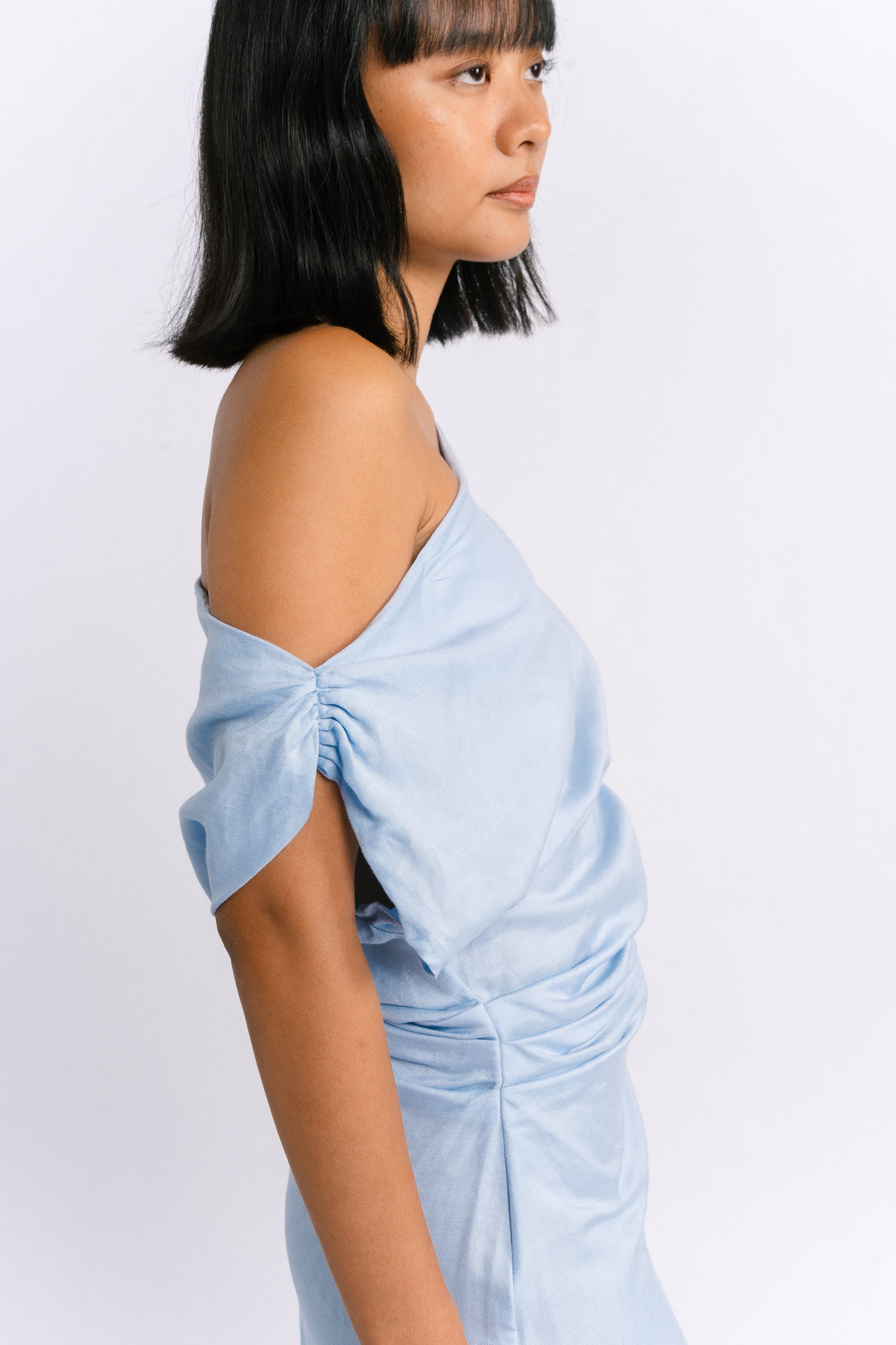 The Aitana Mini Dress features shoulder and waist pleat details. It comes with a side zipper and can be styled off shoulder or asymmetrical neckline. Made in Linen. Models wear XS.