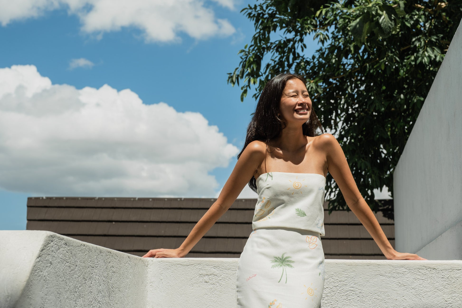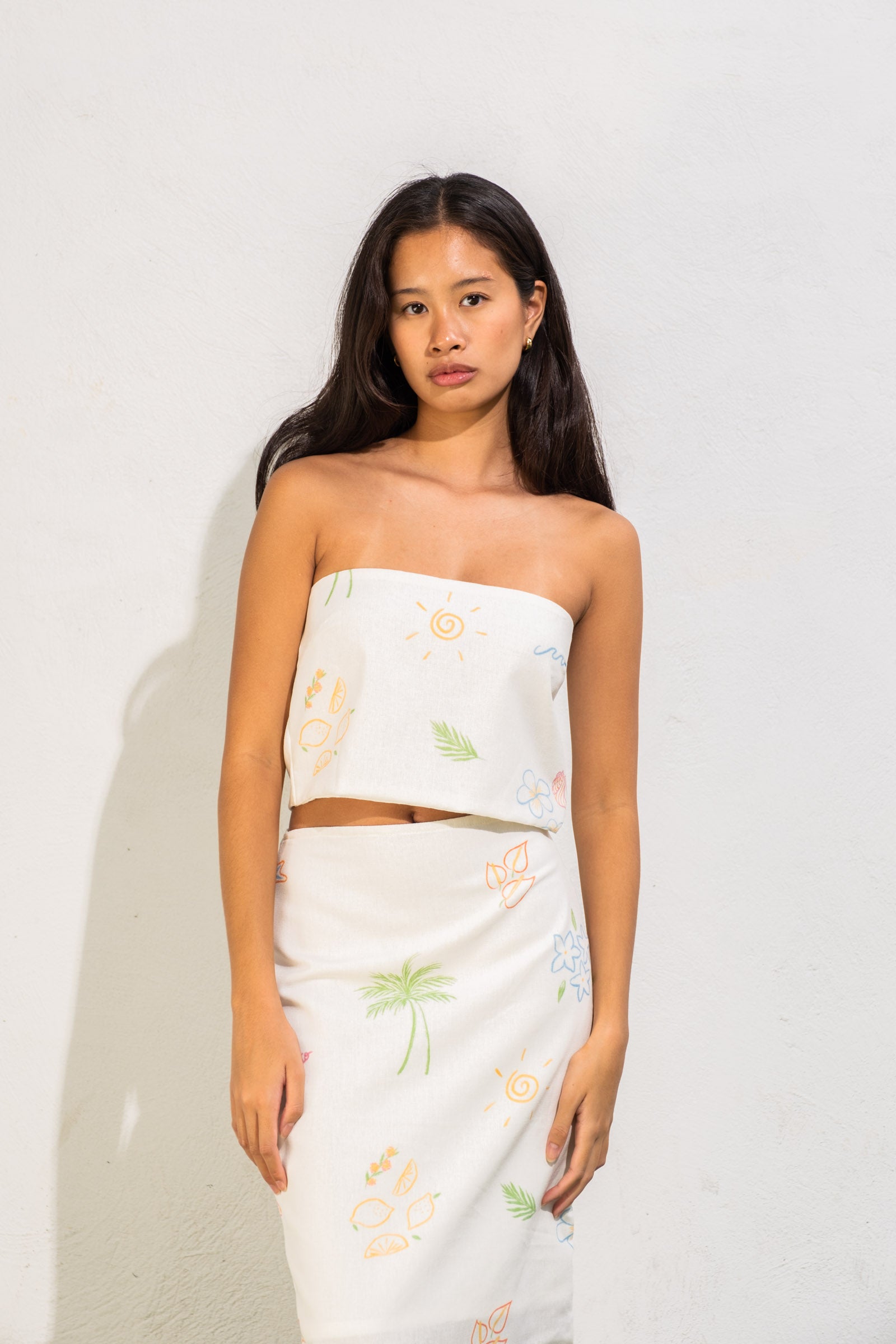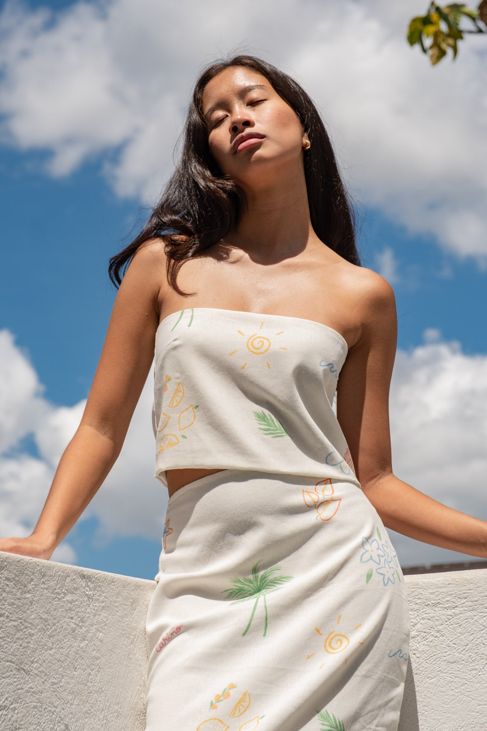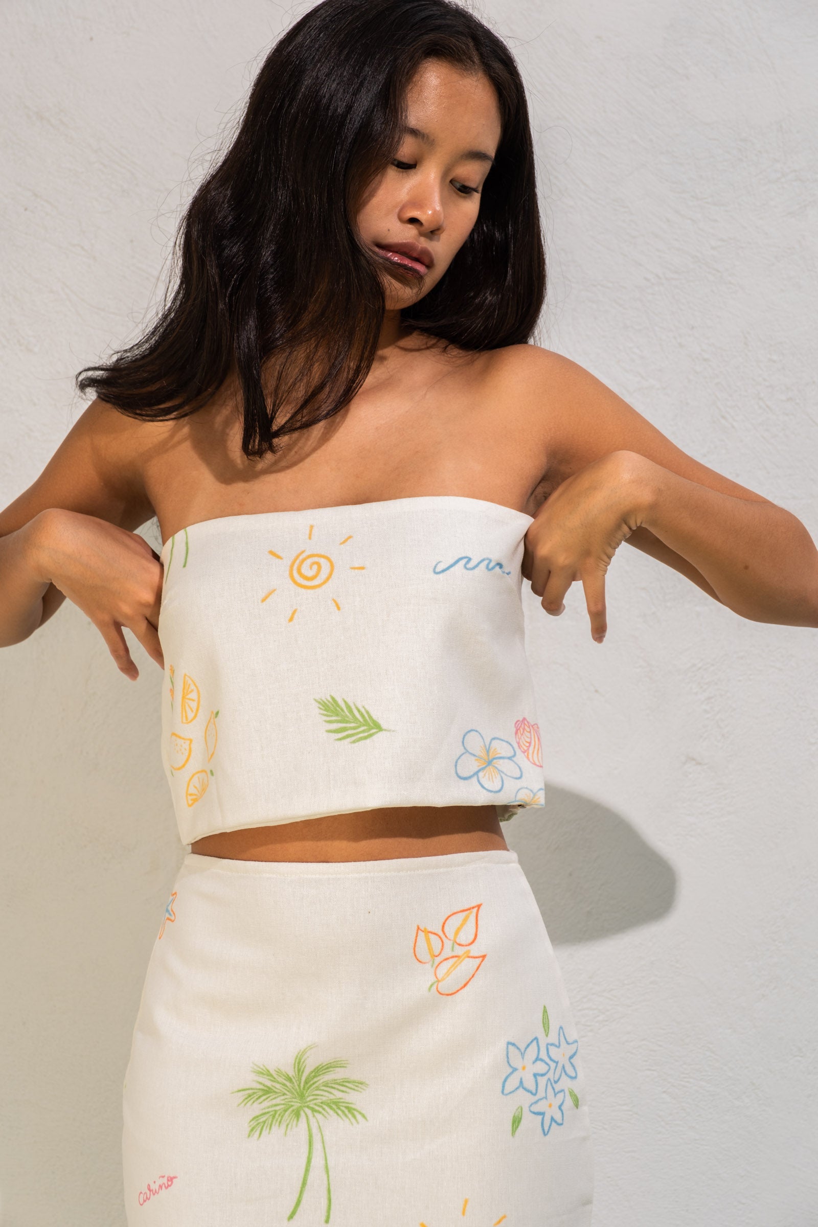 A tube top you can dress up or down. Features a side zipper and adjustable back for easy wear. Can be worn either front or back. Made in exclusive Cariño printed Linen. Models wear Extra Small.