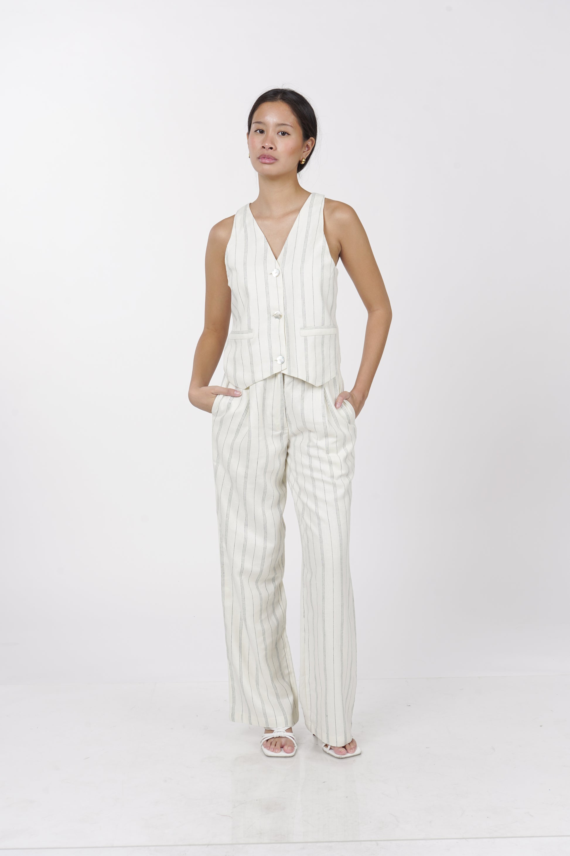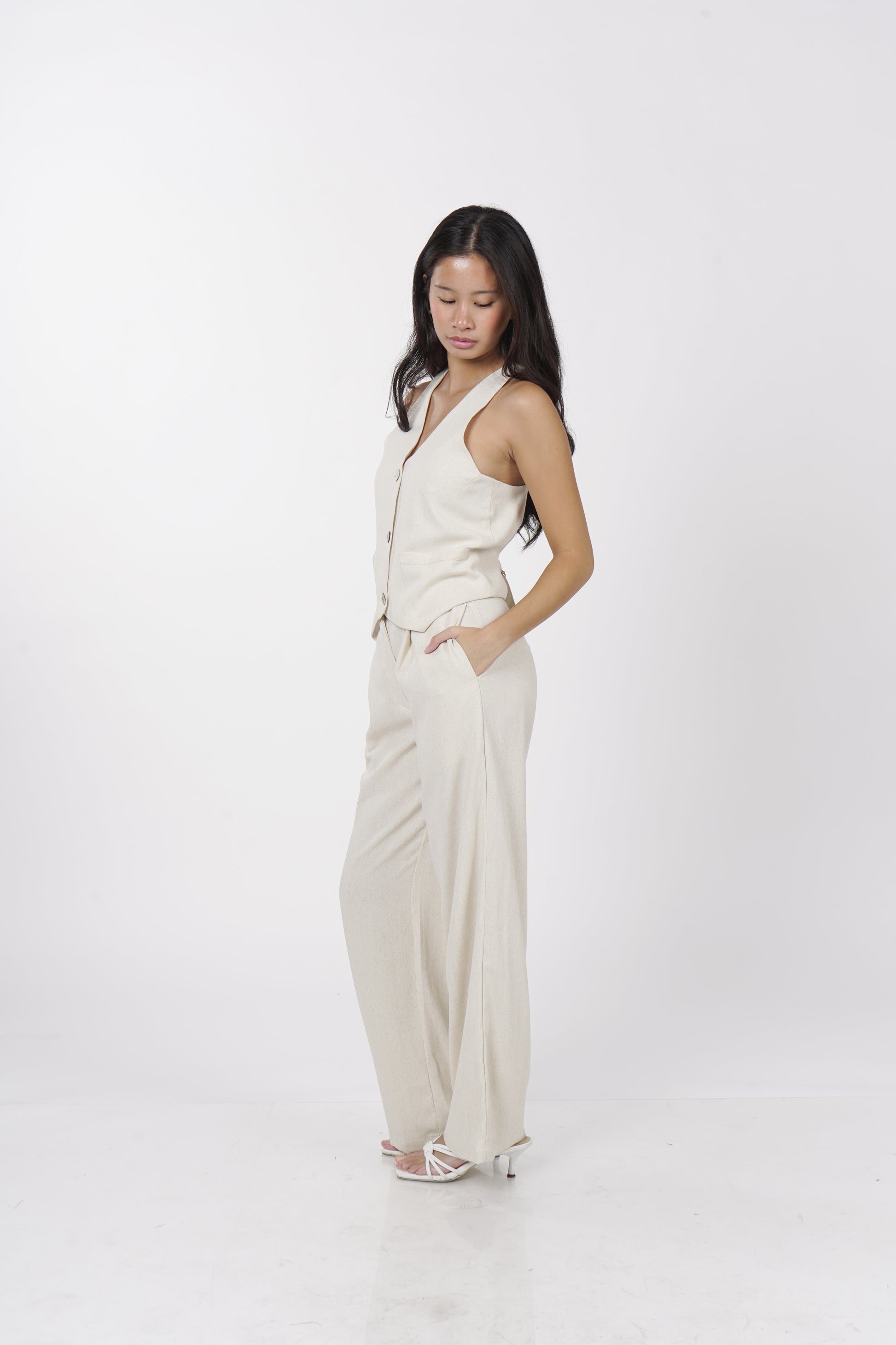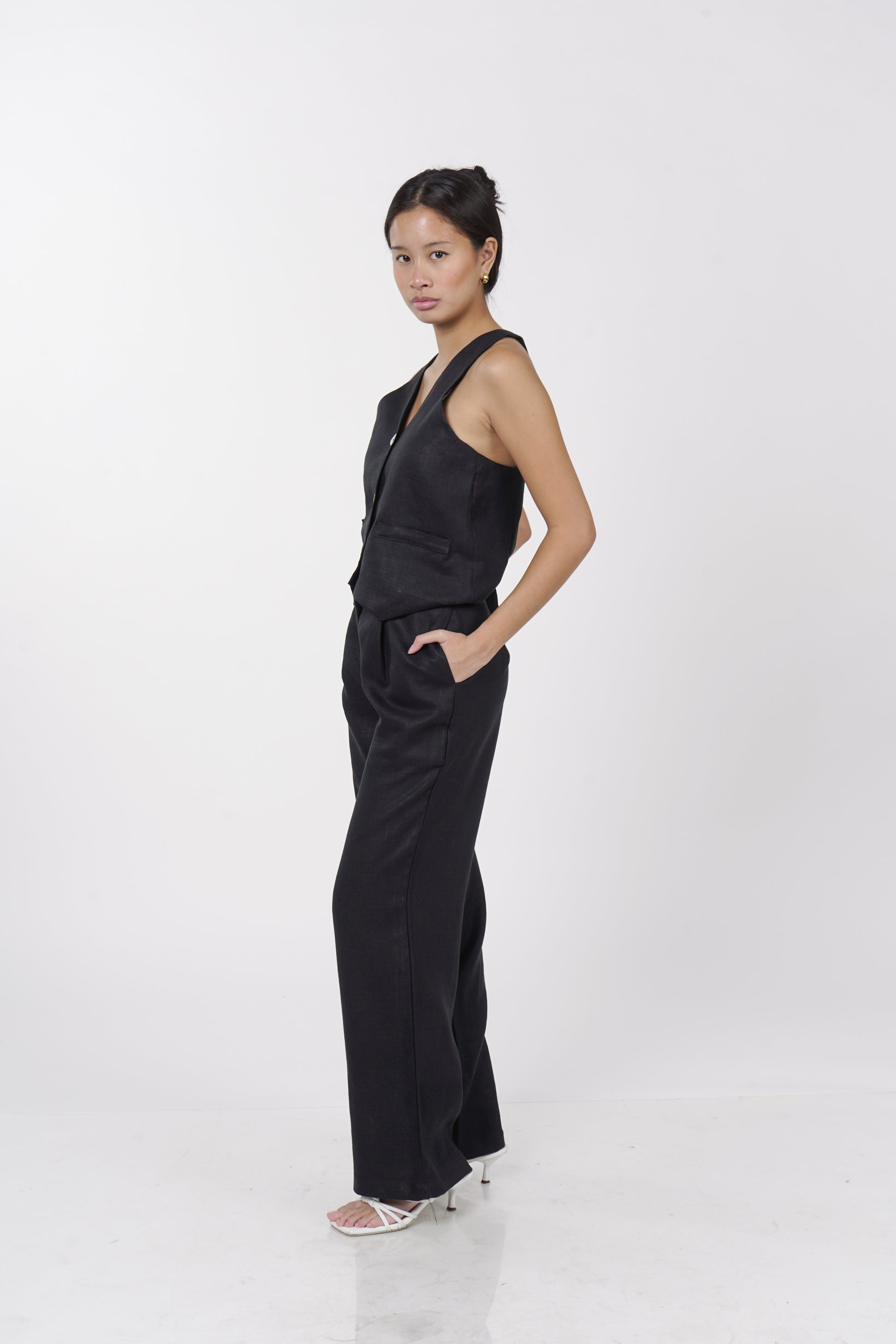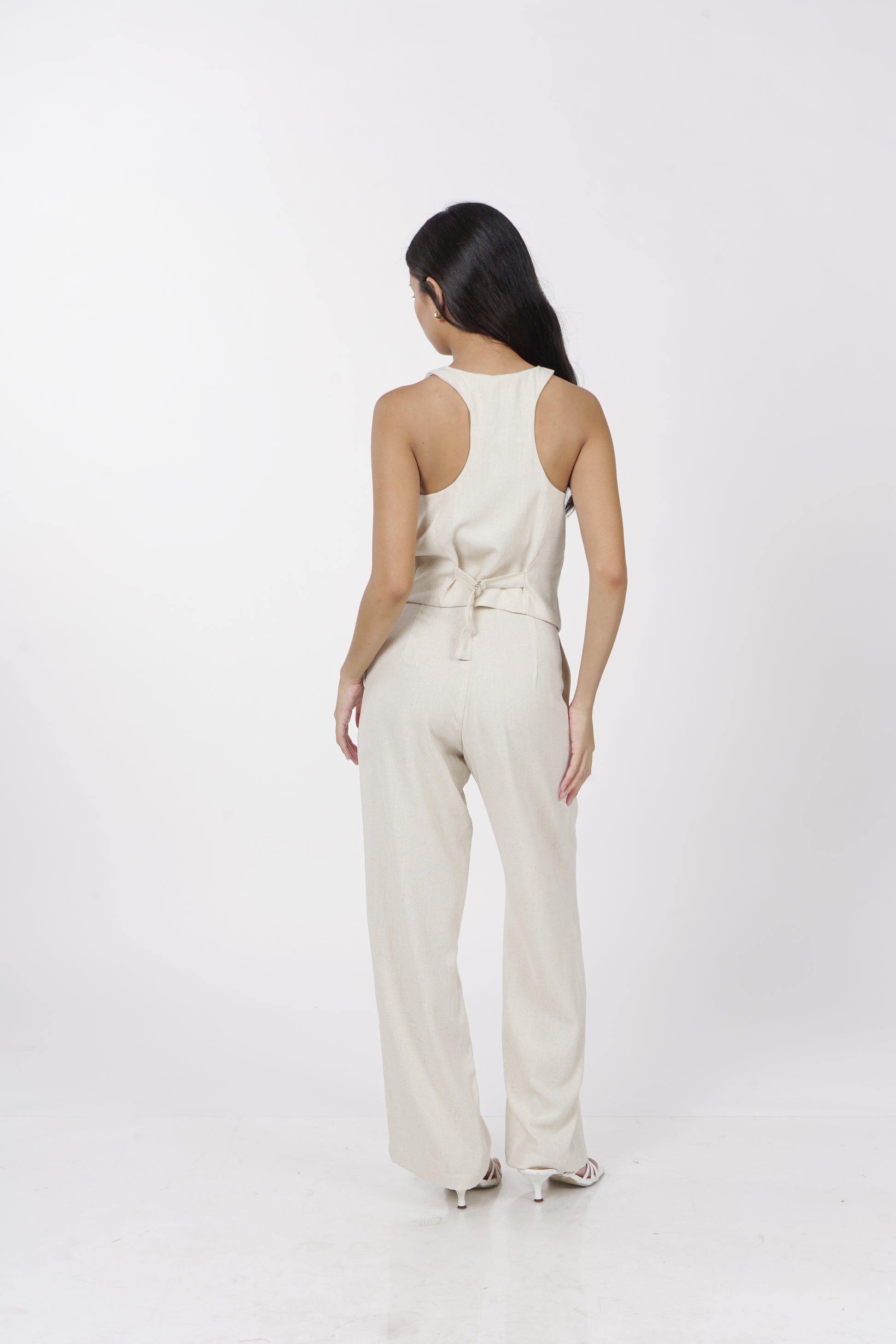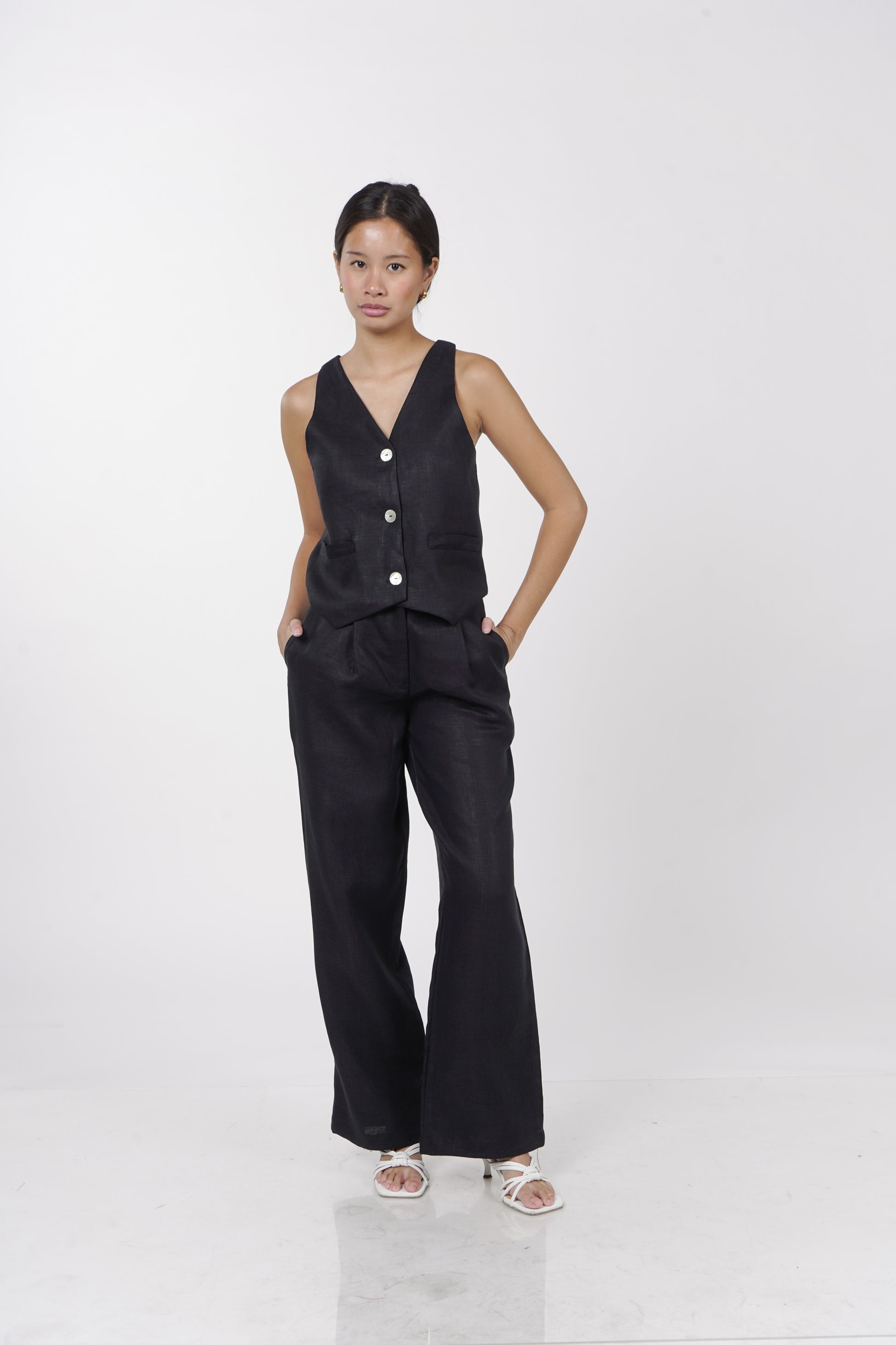 A classic work piece set in your wardrobe. The Anna Pants features a single pleat, side pockets and hook closure. The Anna Vest features a tailored front tails, illusion pockets and an adjustable buckle at the back to tailor the fit. Model wear Extra Small. Made in Linen.