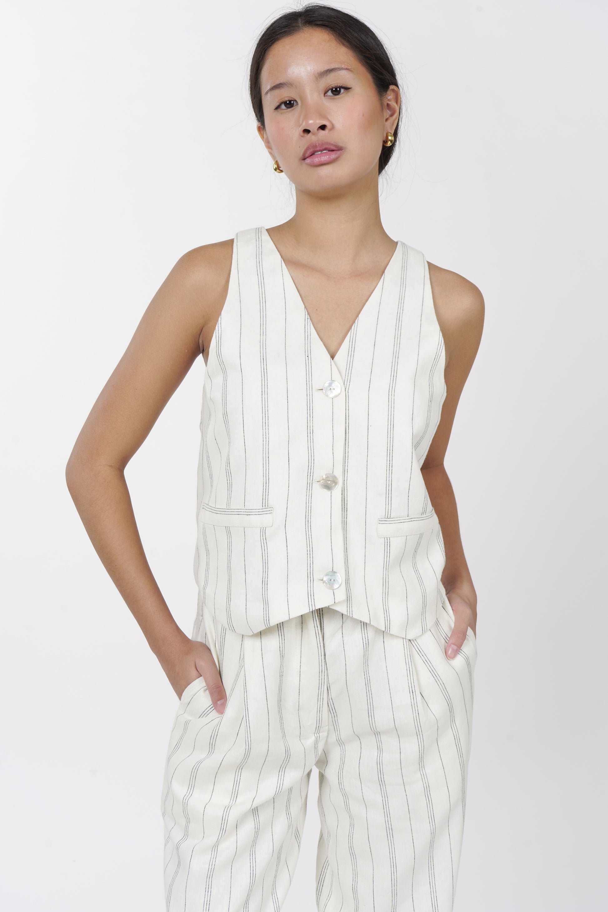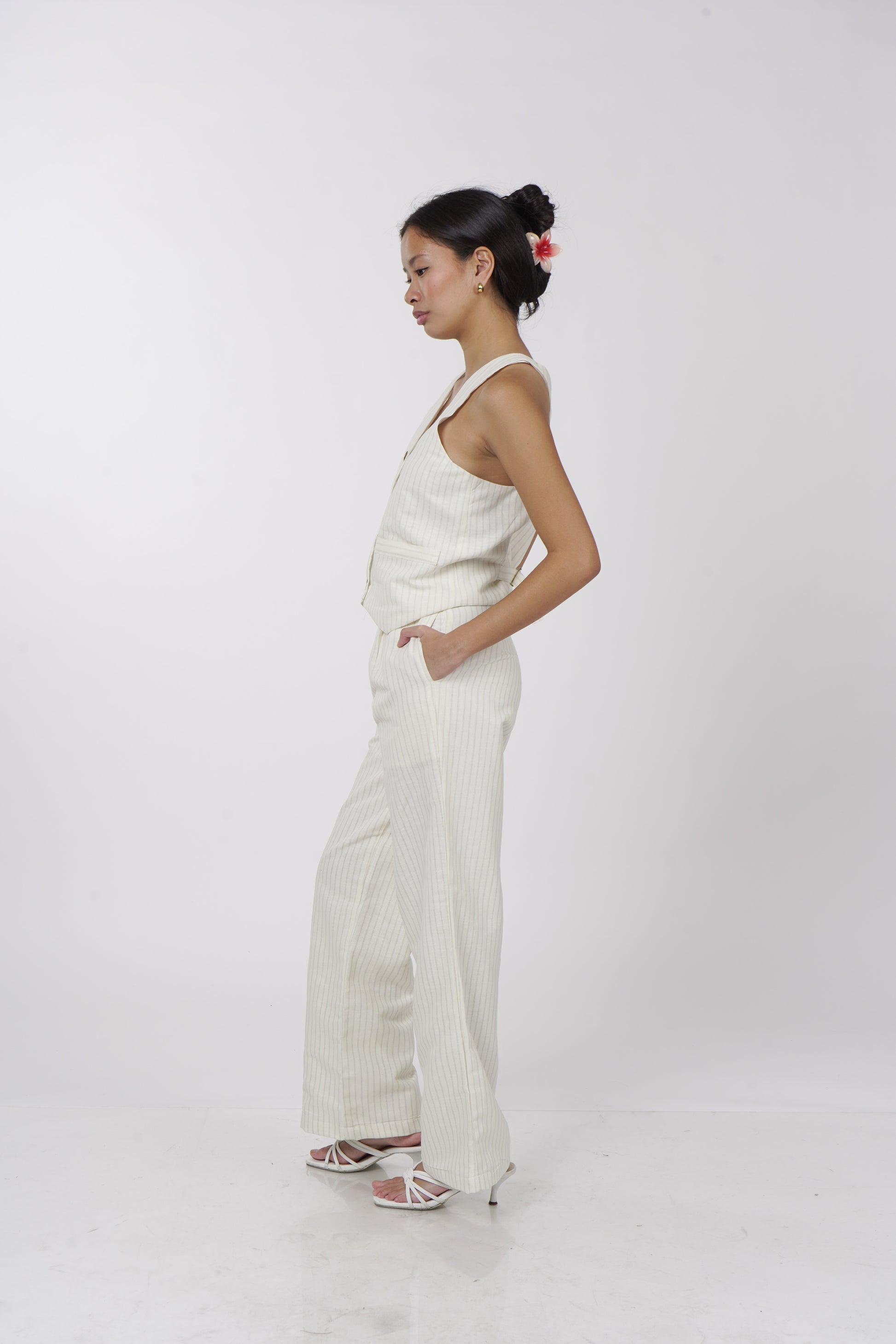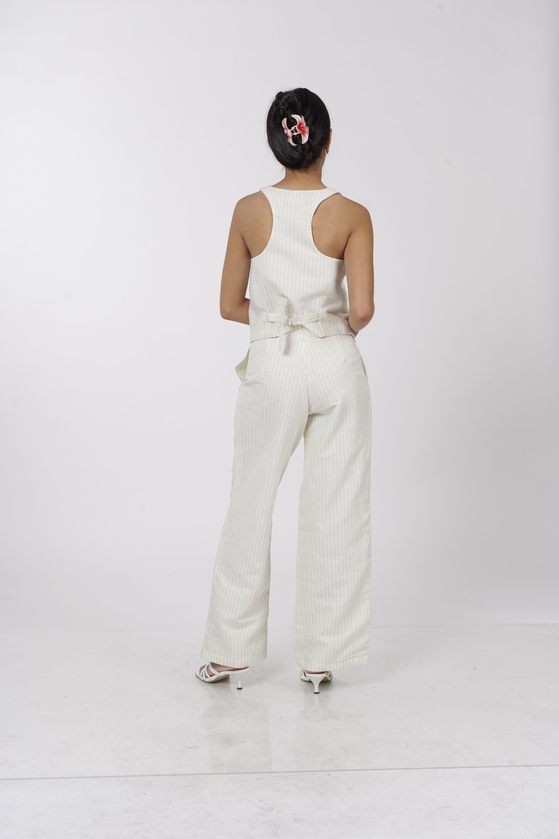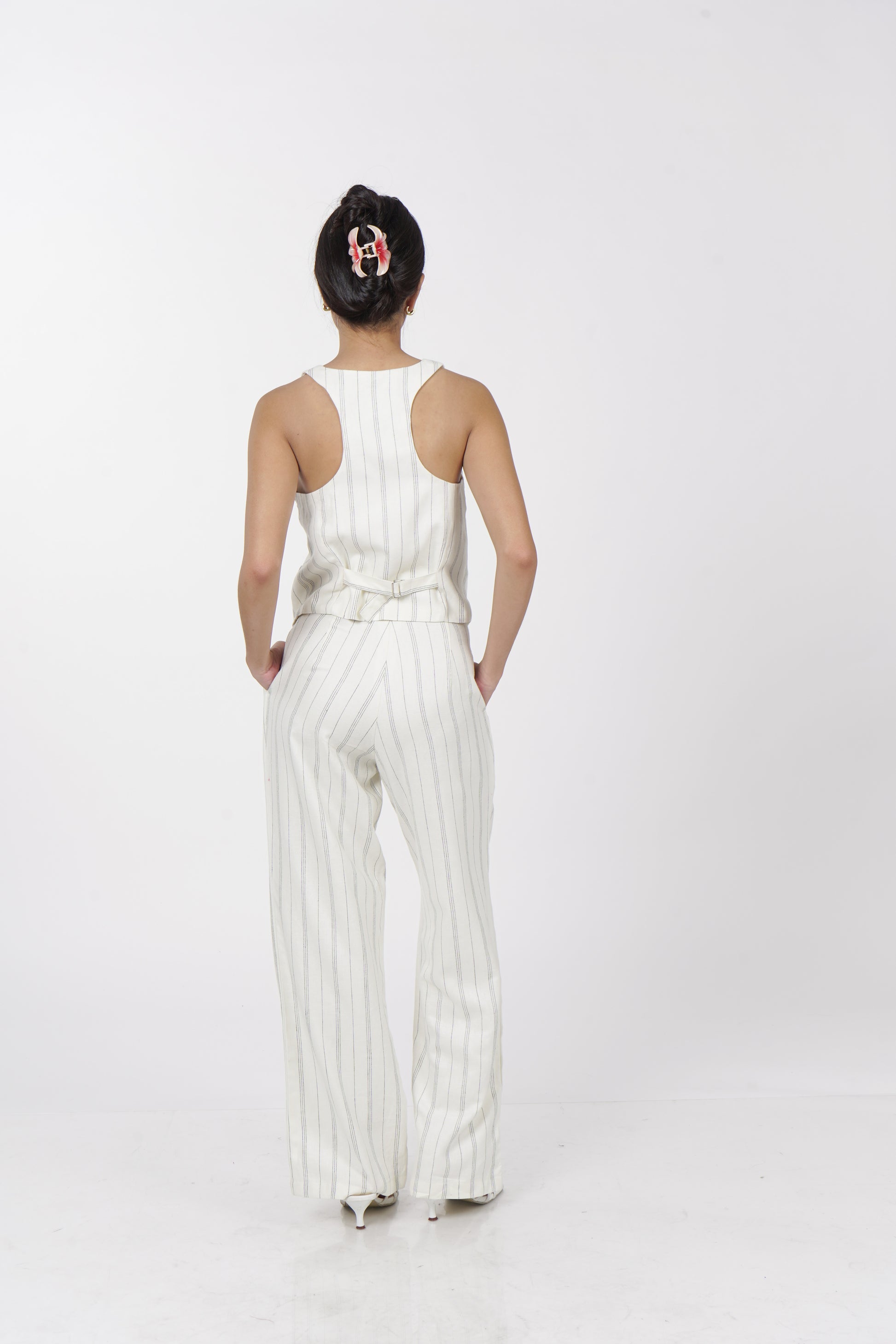 A classic work piece set in your wardrobe. The Anna Pants features a single pleat, side pockets and hook closure. The Anna Vest features a tailored front tails, illusion pockets and an adjustable buckle at the back to tailor the fit. Model wear Extra Small. Made in Linen.