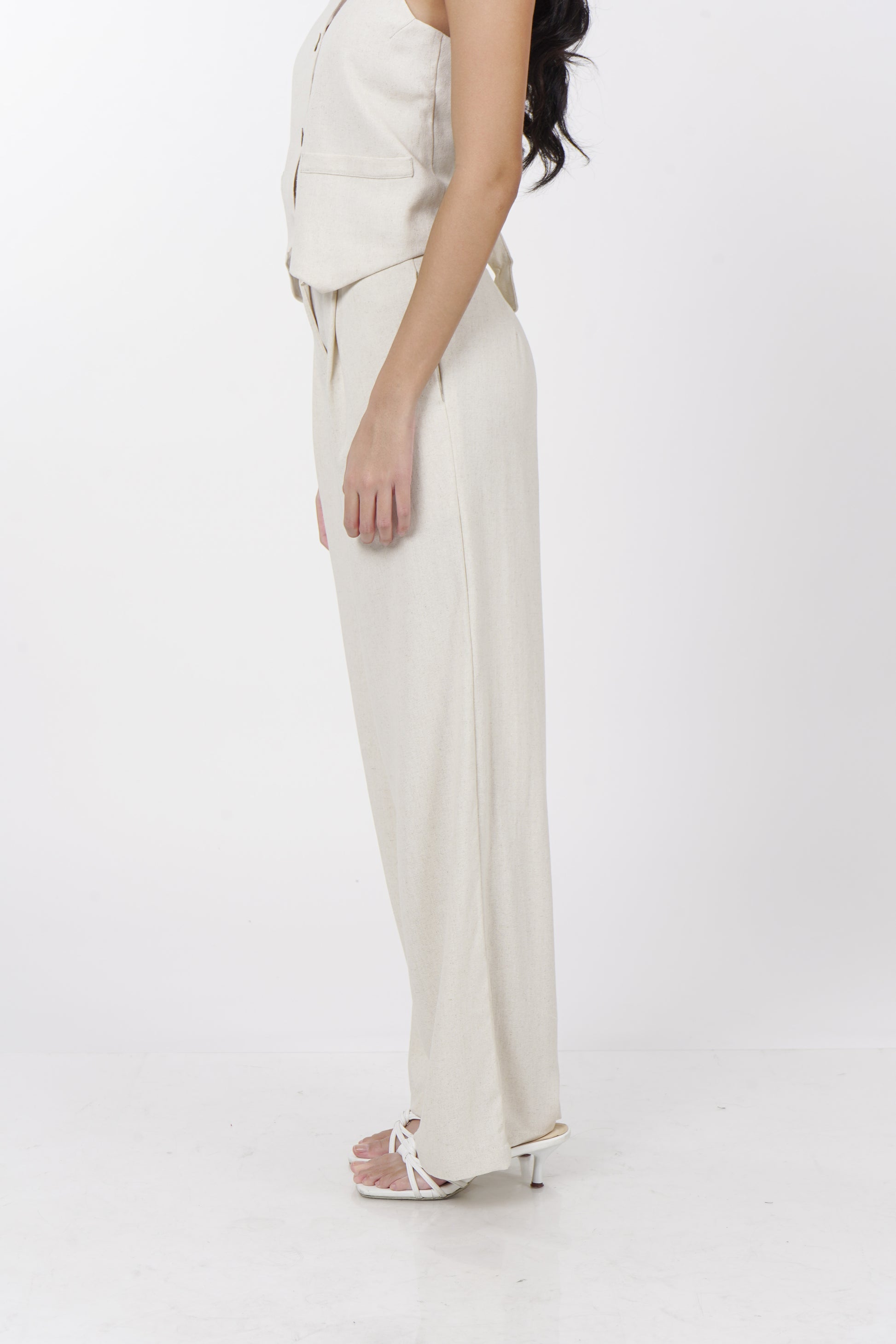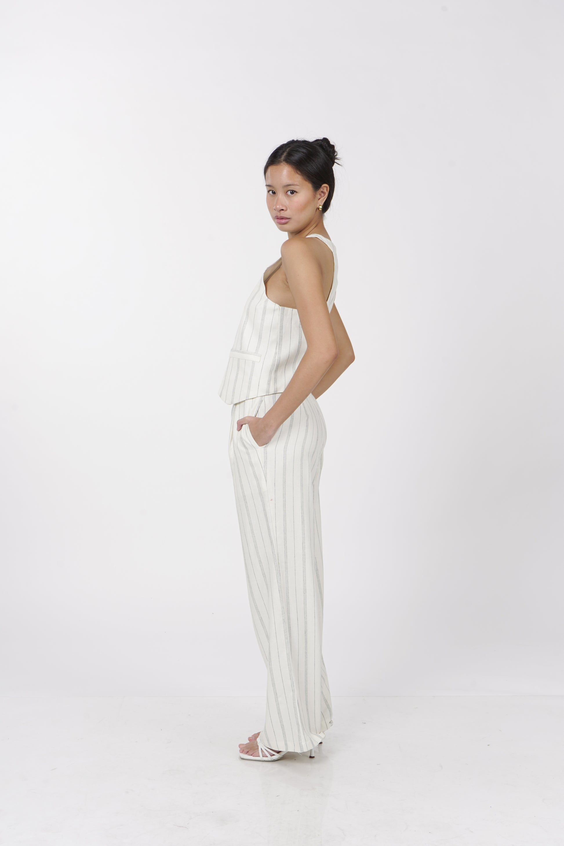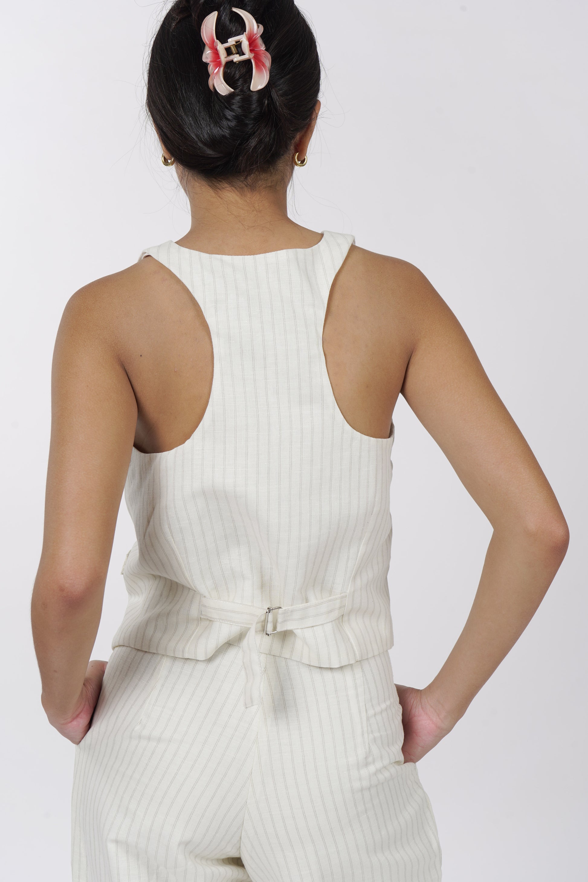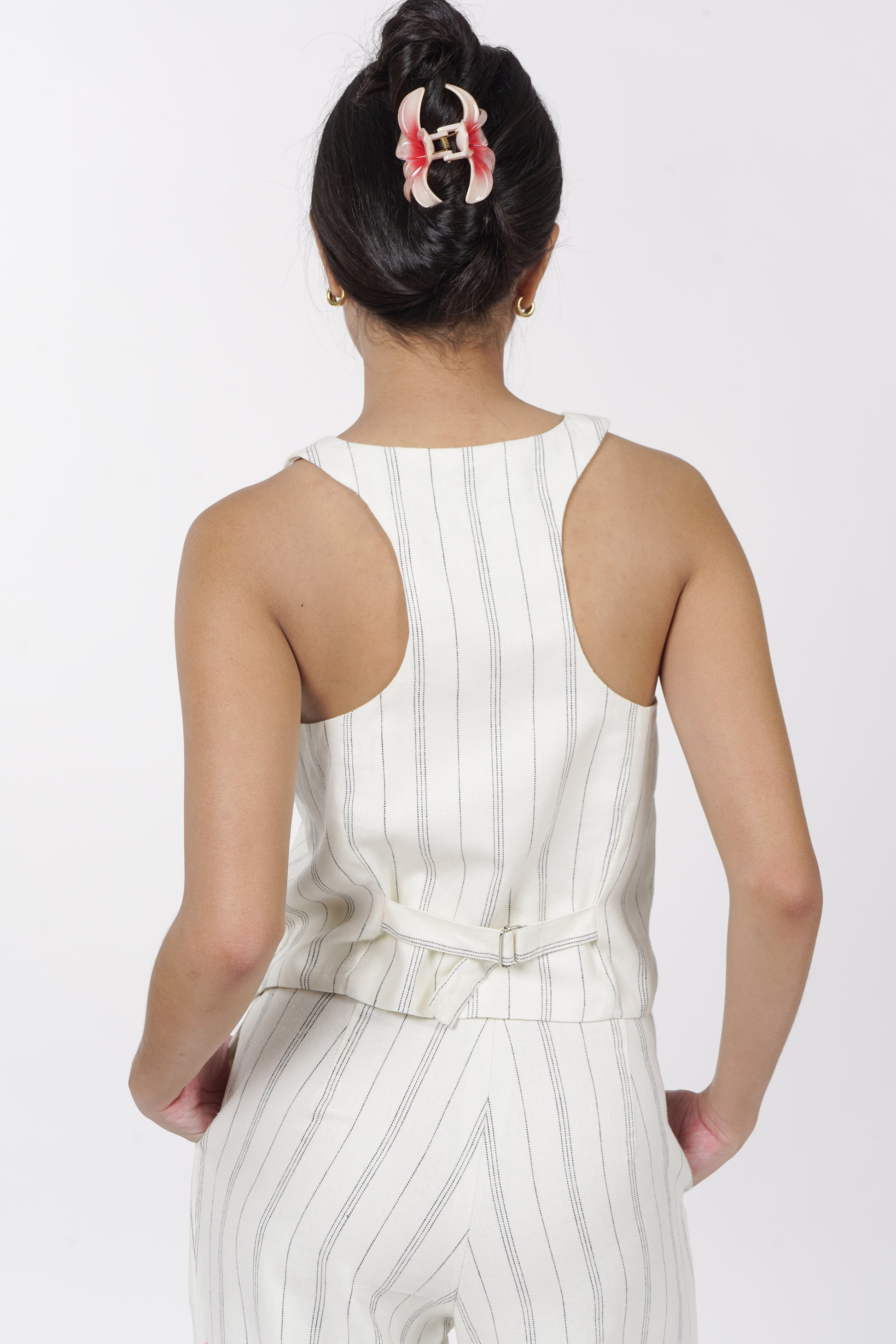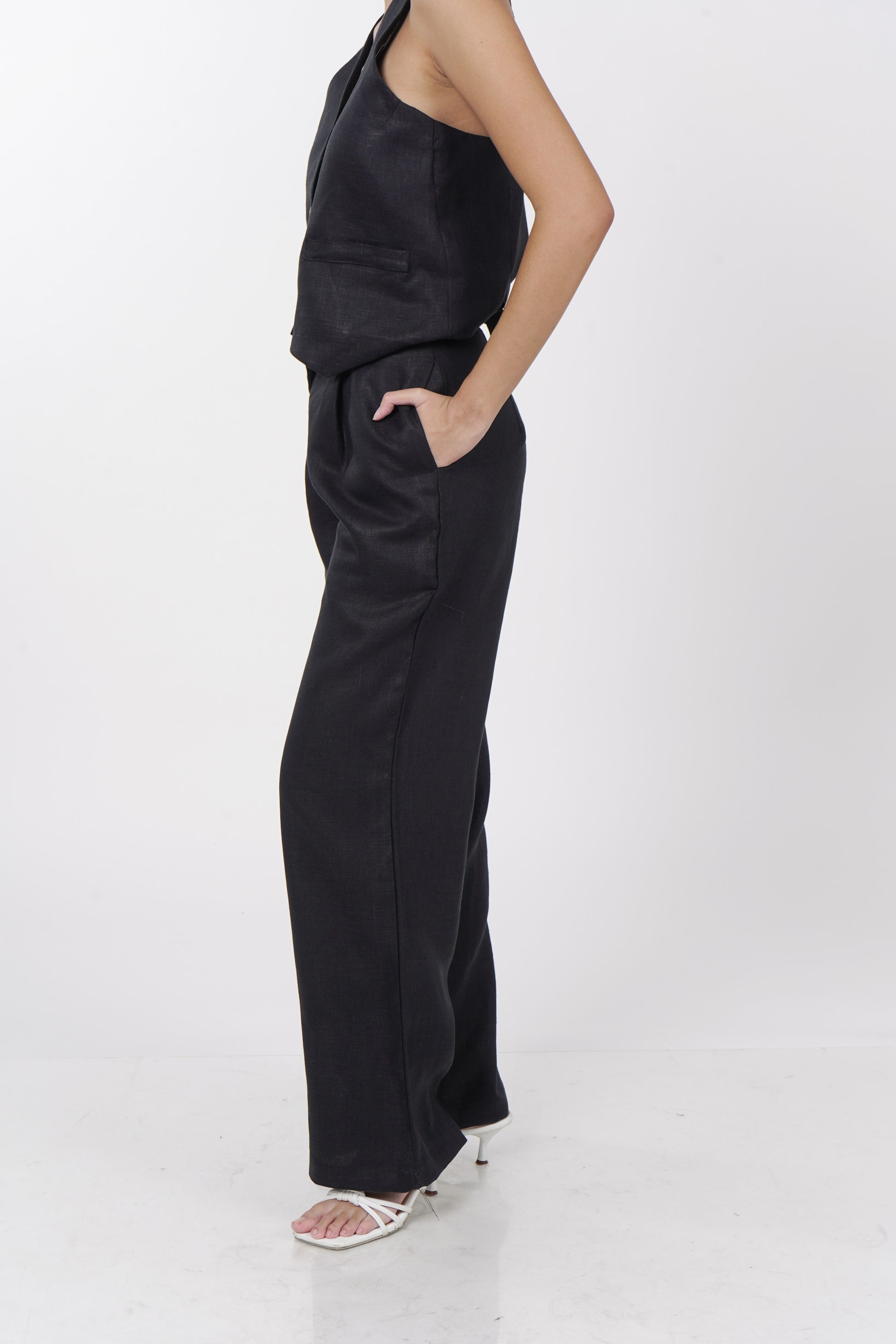 A classic work piece set in your wardrobe. The Anna Pants features a single pleat, side pockets and hook closure. The Anna Vest features a tailored front tails, illusion pockets and an adjustable buckle at the back to tailor the fit. Model wear Extra Small. Made in Linen.