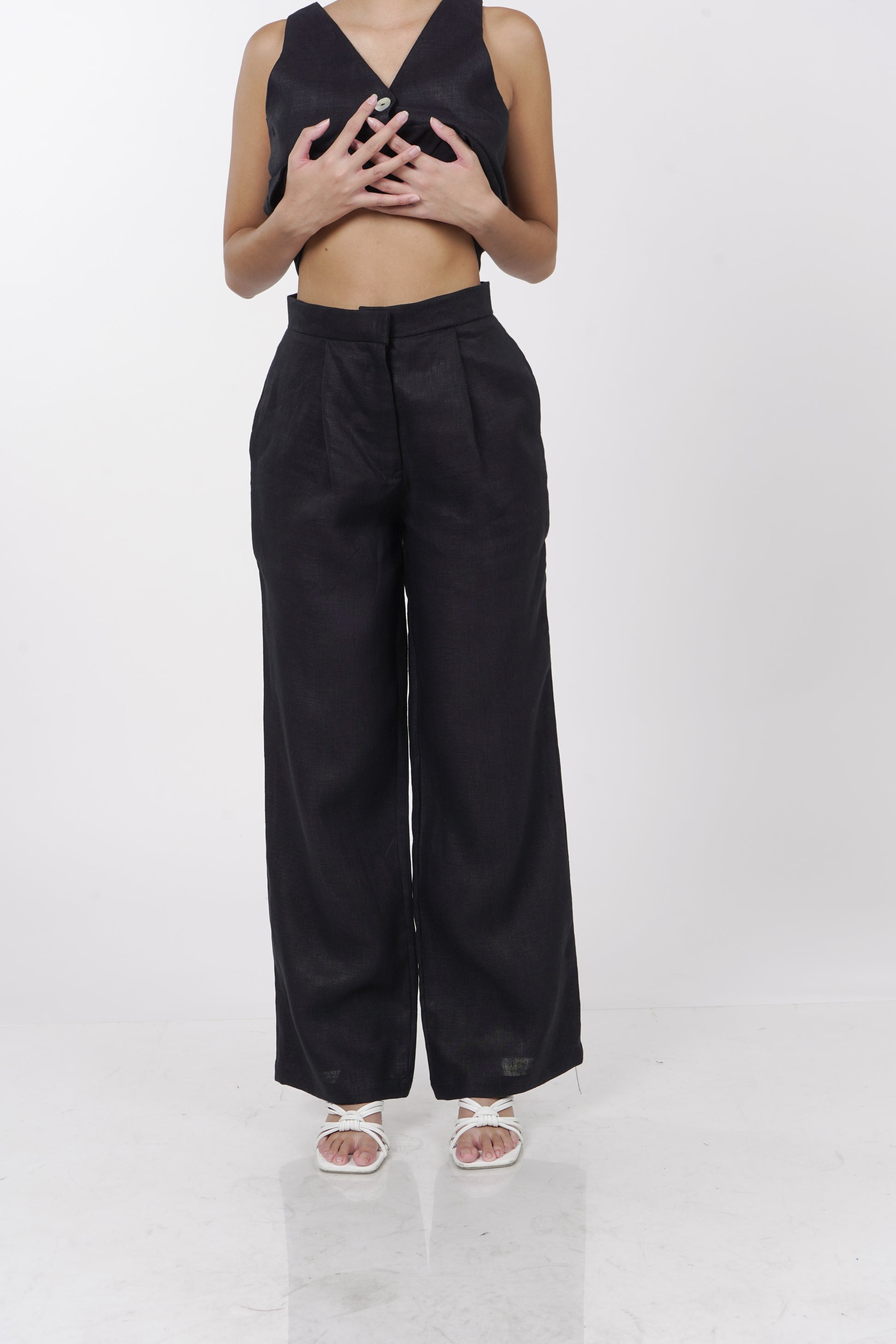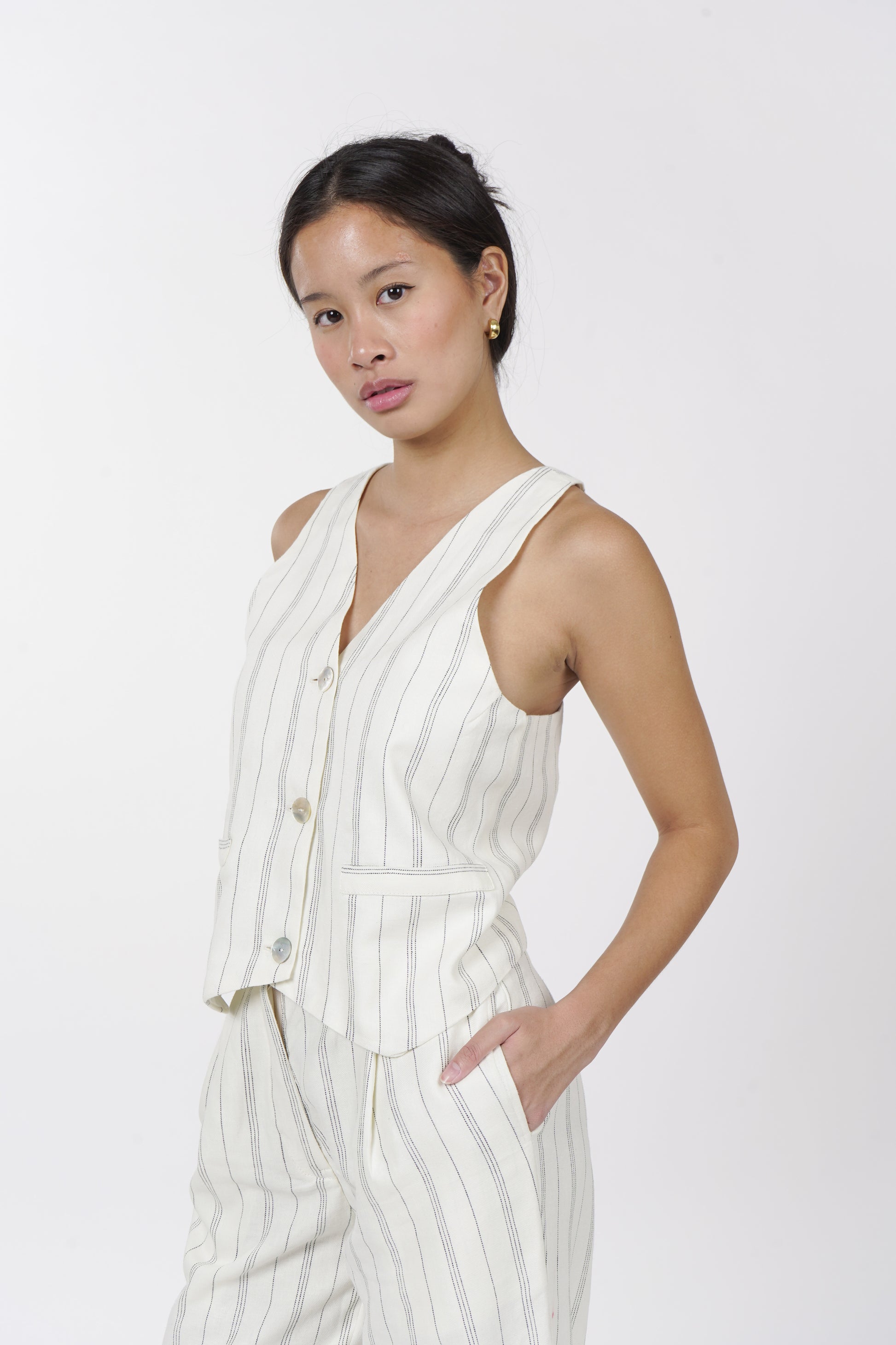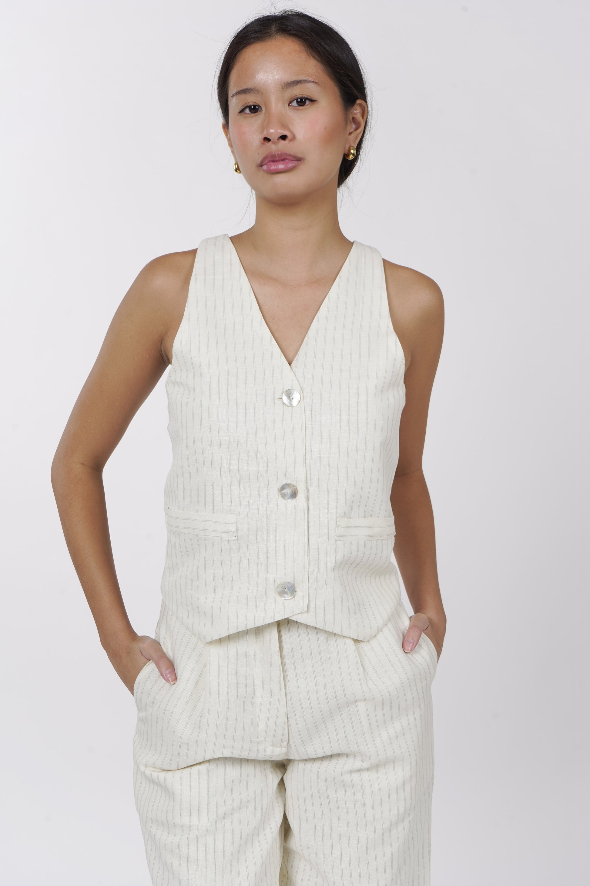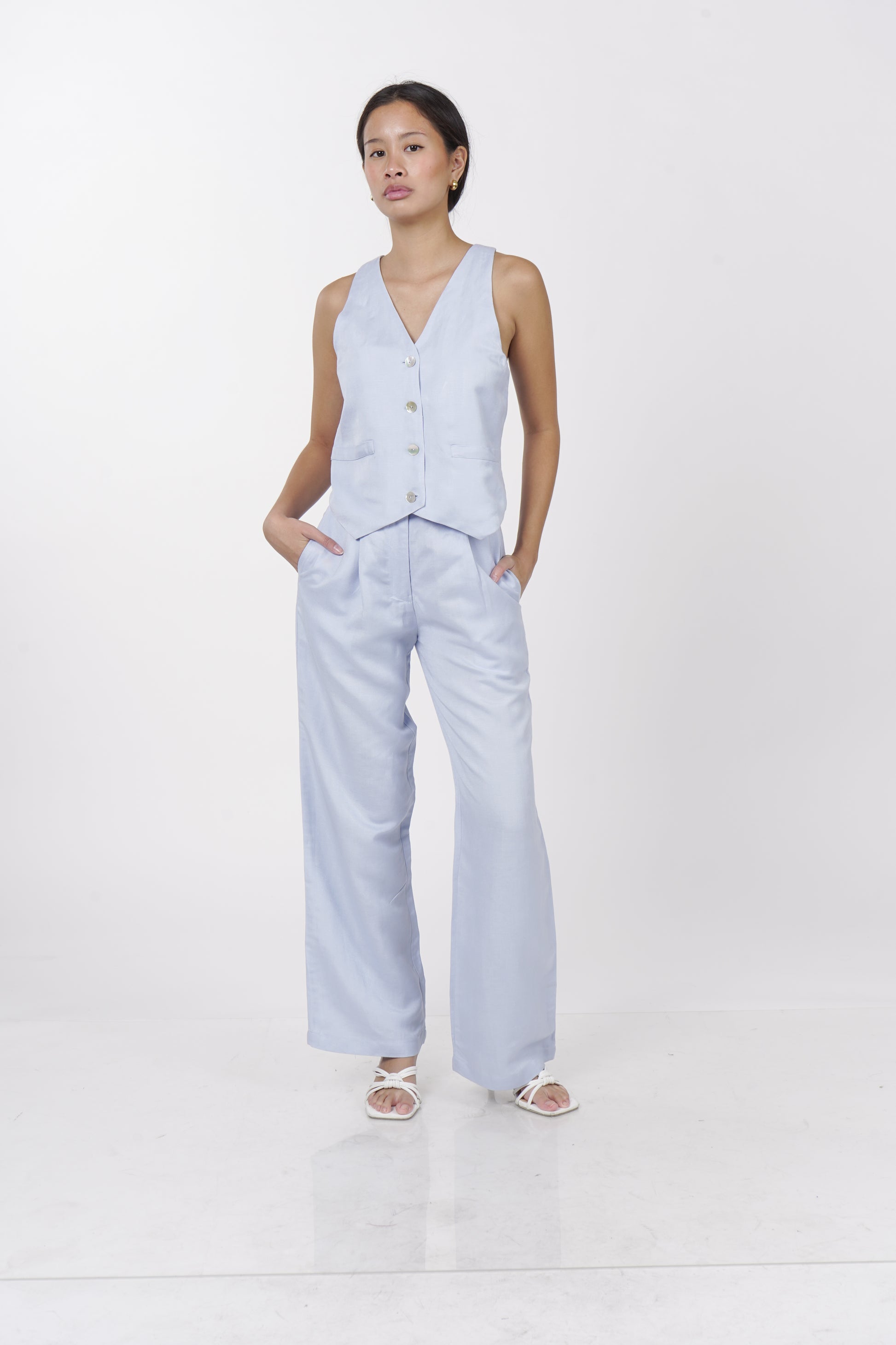 A classic work piece set in your wardrobe. The Anna Pants features a single pleat, side pockets and hook closure. The Anna Vest features a tailored front tails, illusion pockets and an adjustable buckle at the back to tailor the fit. Model wear Extra Small. Made in Linen.