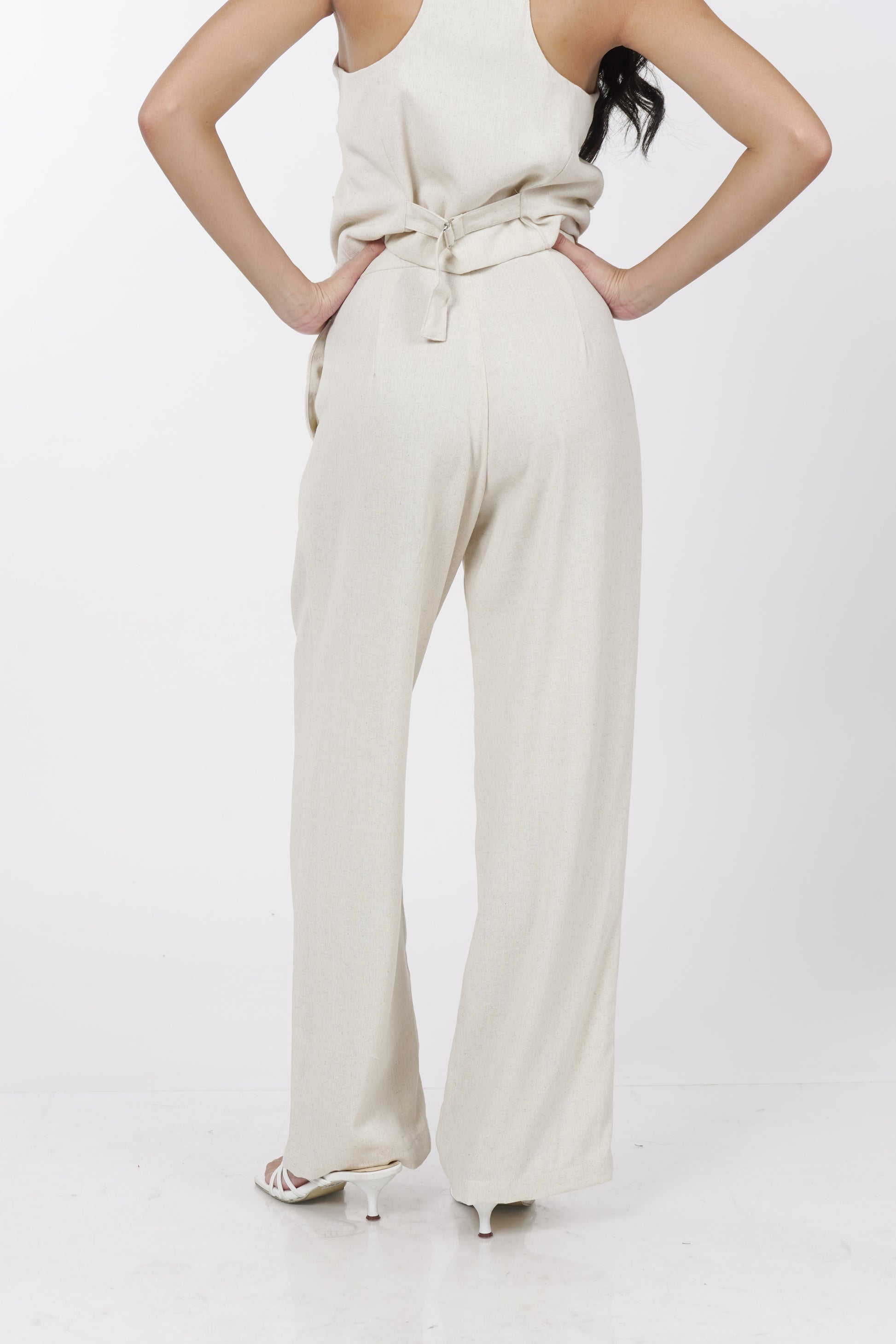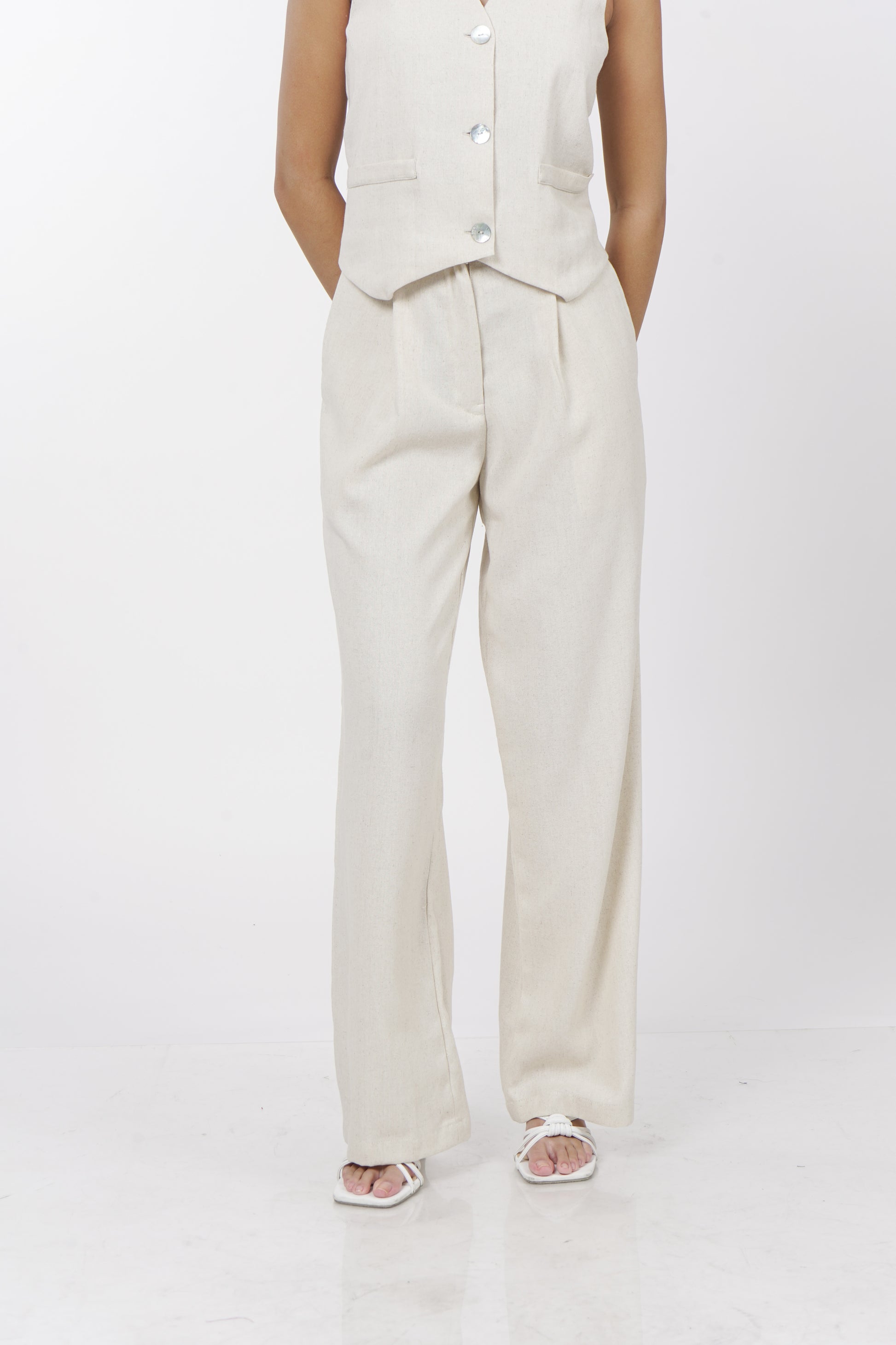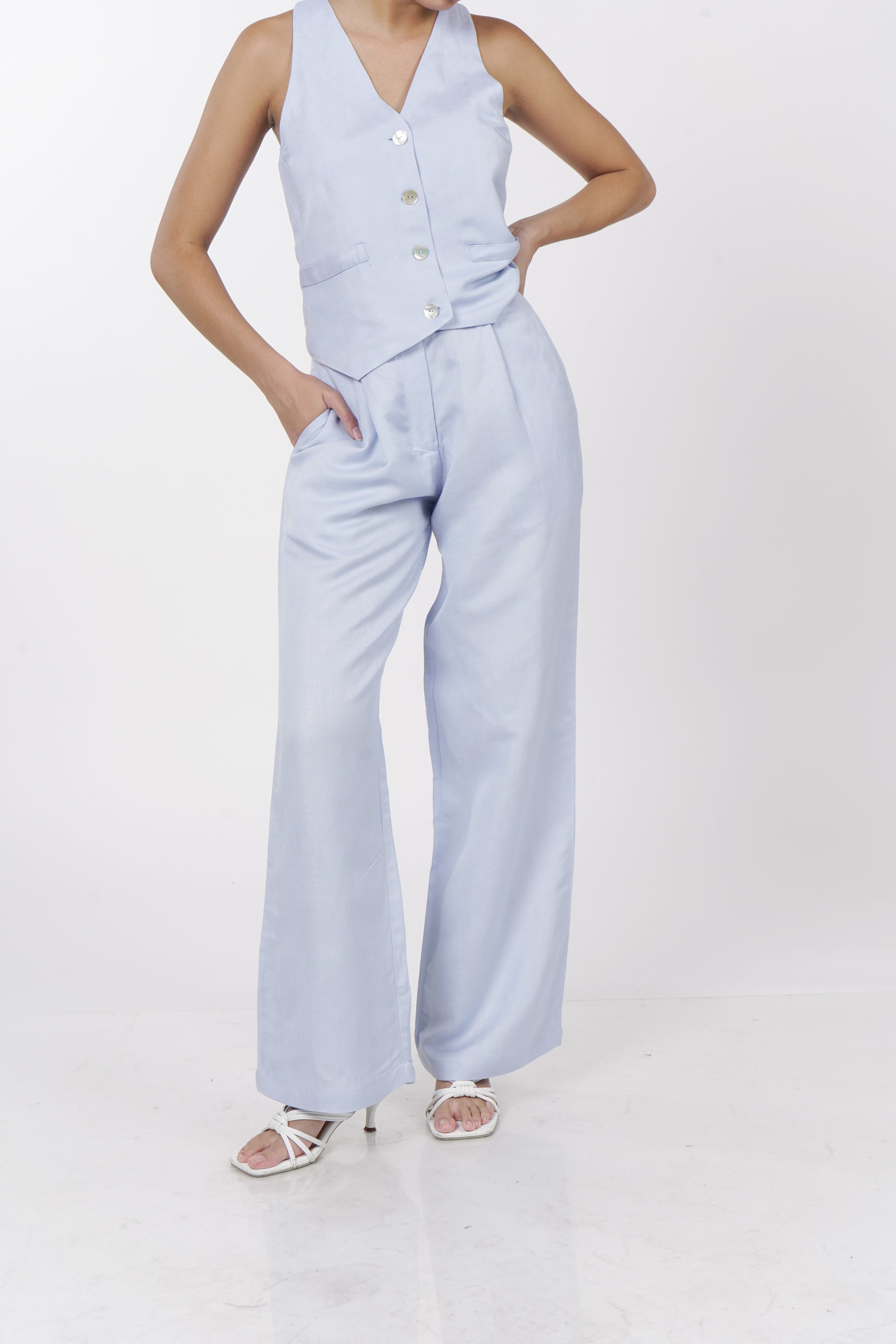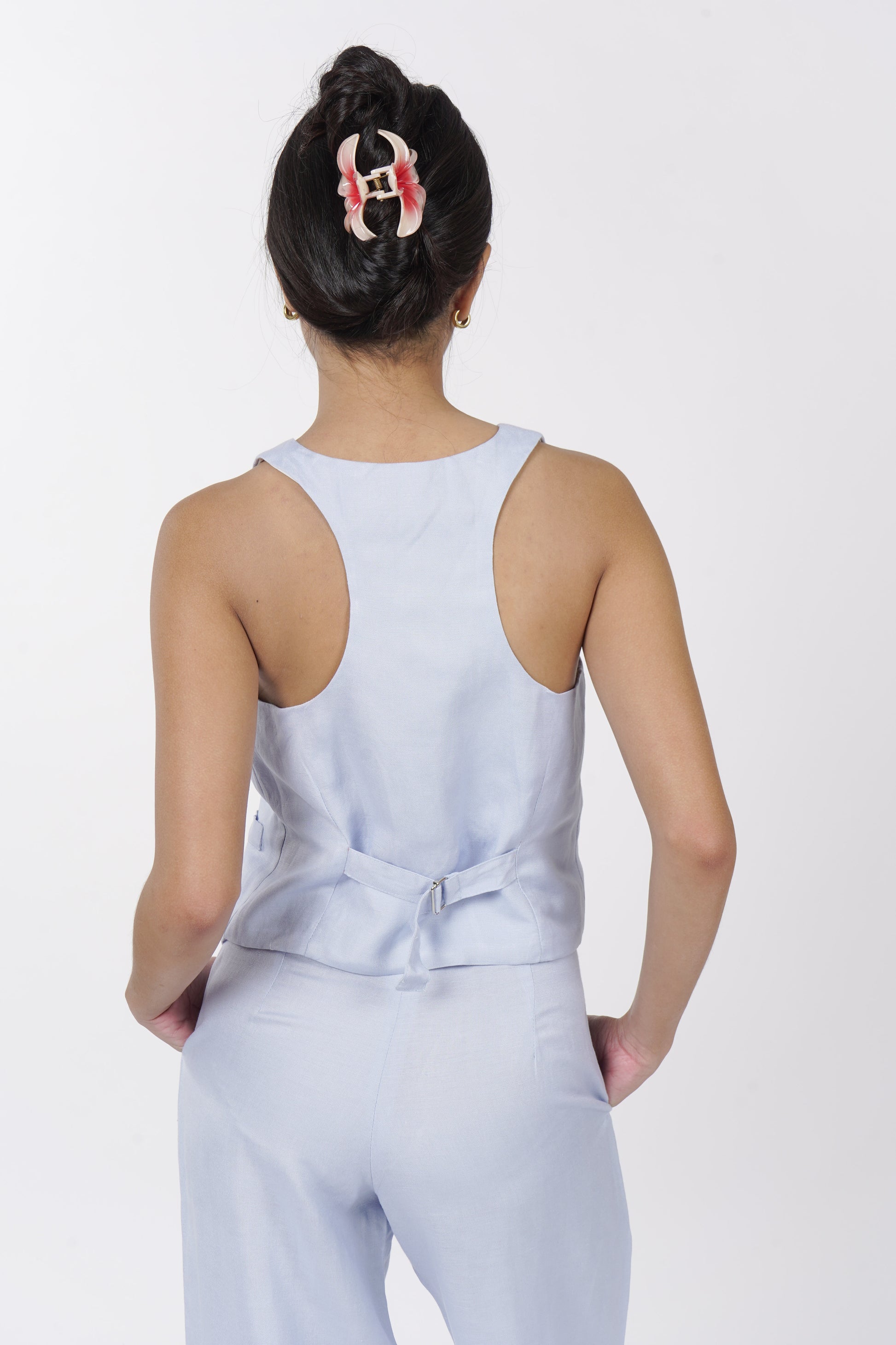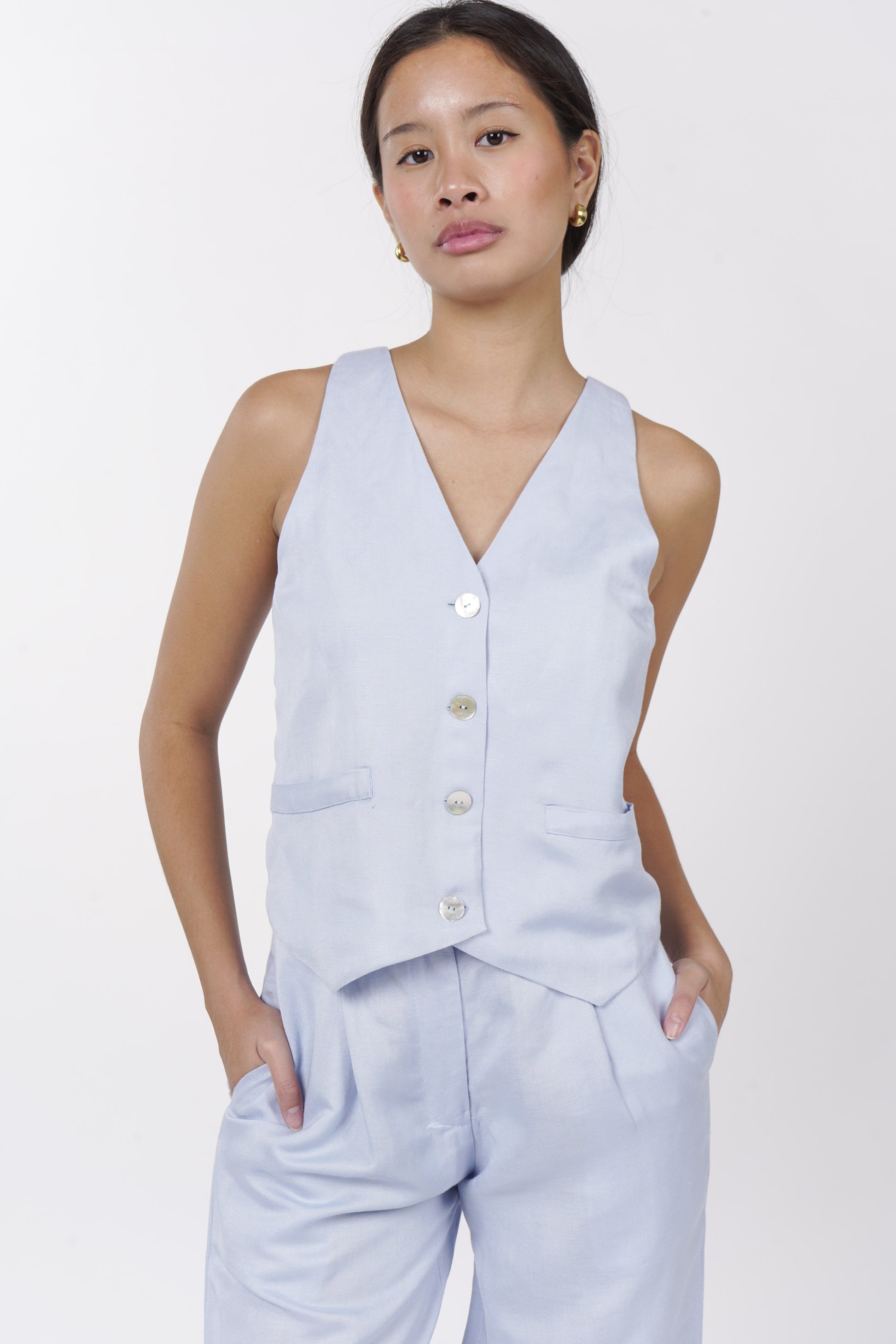 A classic work piece set in your wardrobe. The Anna Pants features a single pleat, side pockets and hook closure. The Anna Vest features a tailored front tails, illusion pockets and an adjustable buckle at the back to tailor the fit. Model wear Extra Small. Made in Linen.