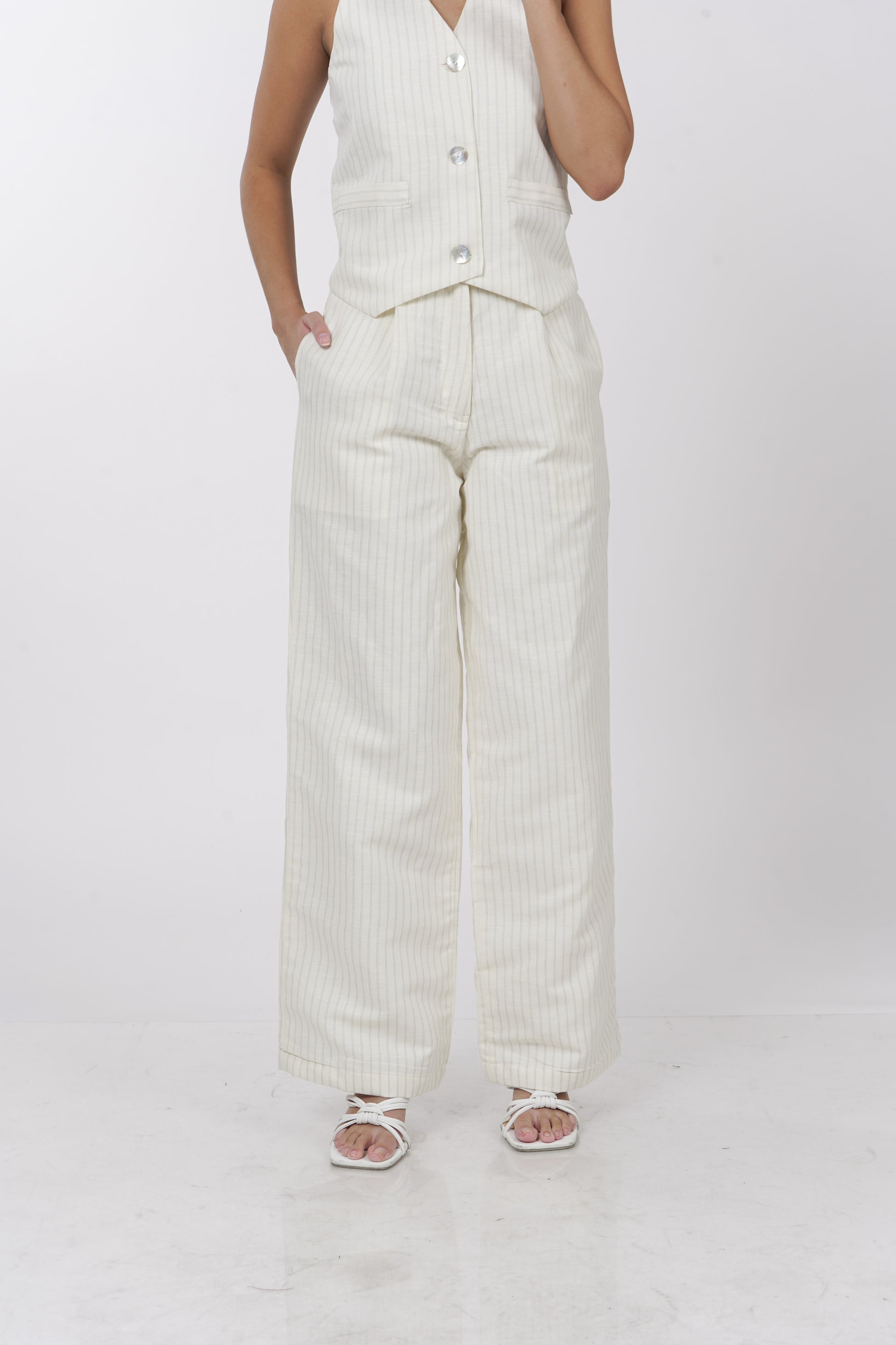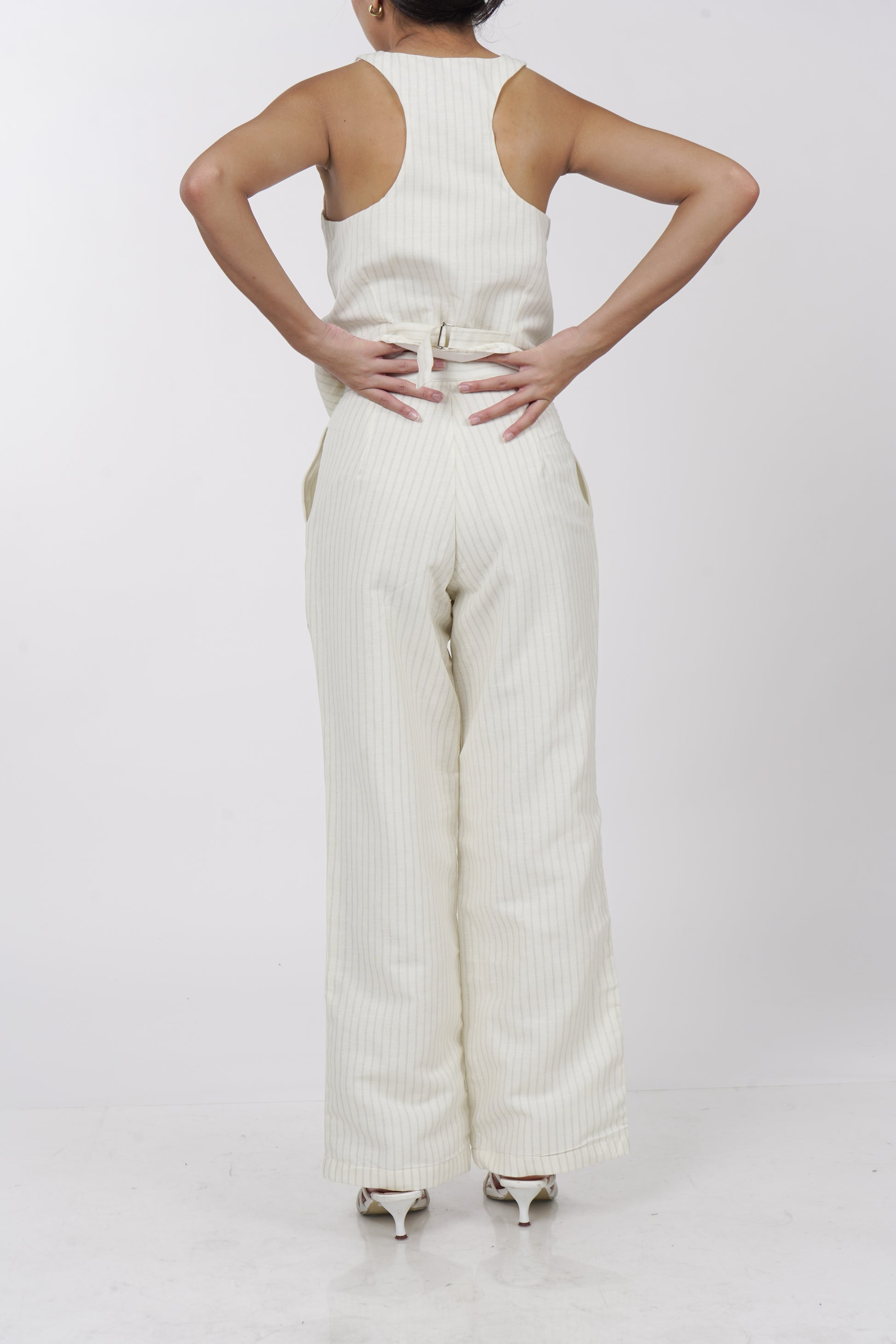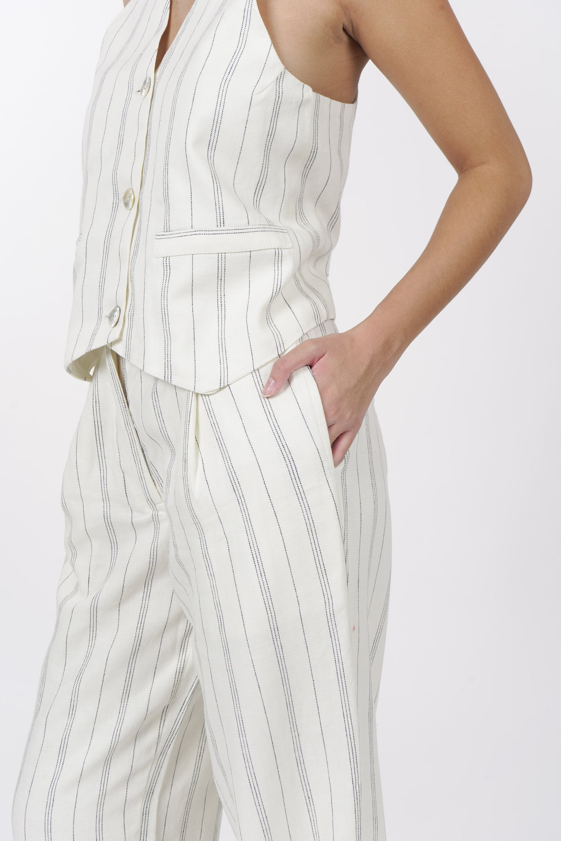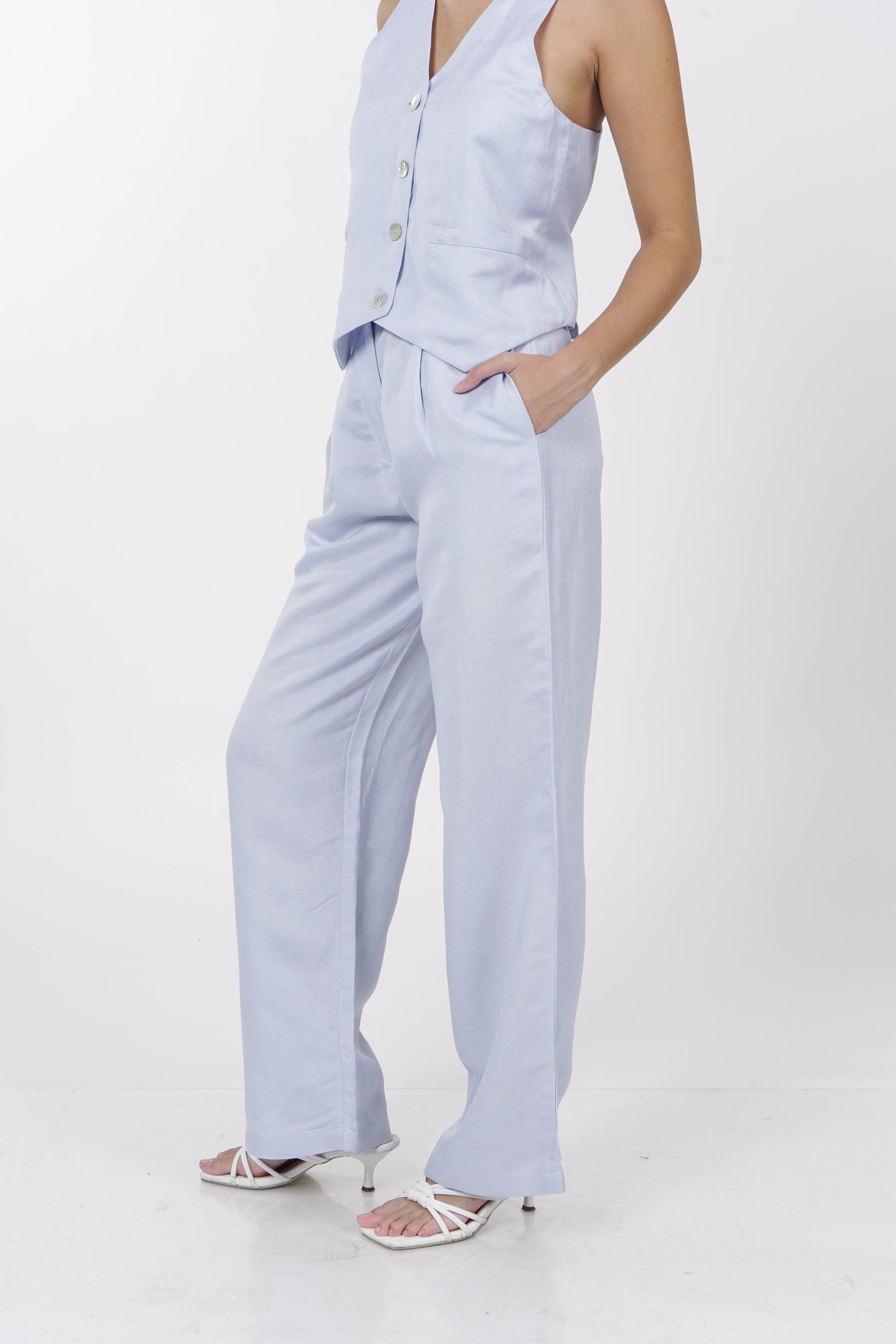 A classic work piece set in your wardrobe. The Anna Pants features a single pleat, side pockets and hook closure. The Anna Vest features a tailored front tails, illusion pockets and an adjustable buckle at the back to tailor the fit. Model wear Extra Small. Made in Linen.
