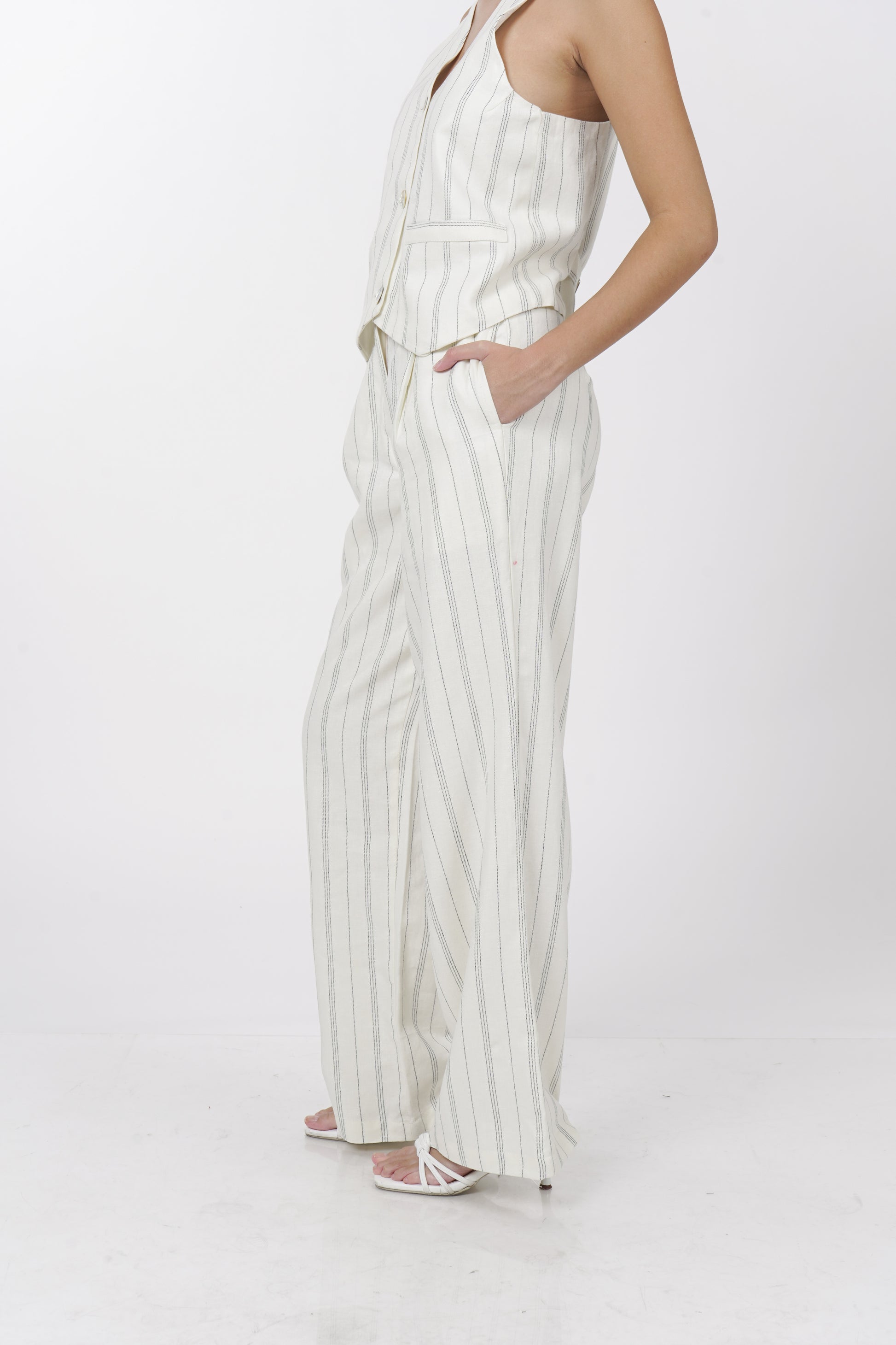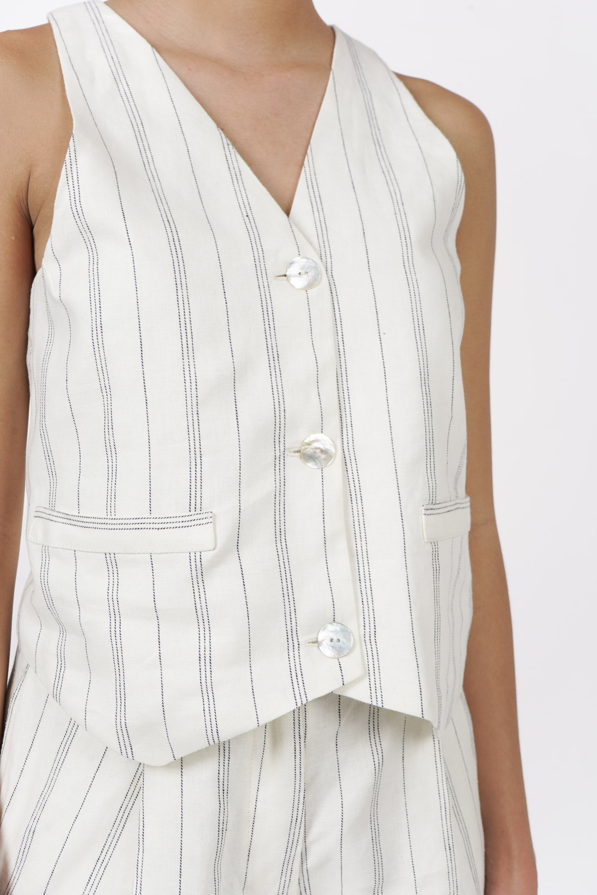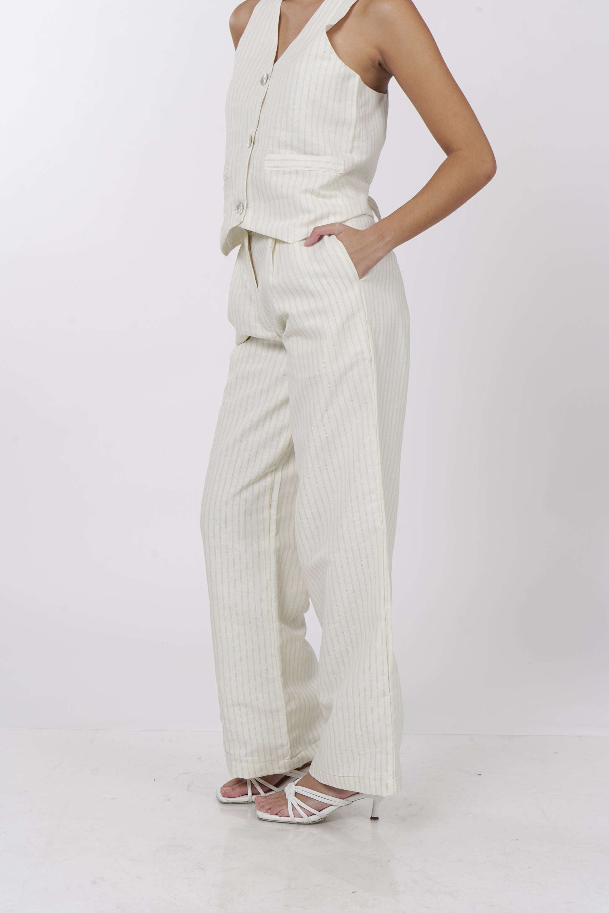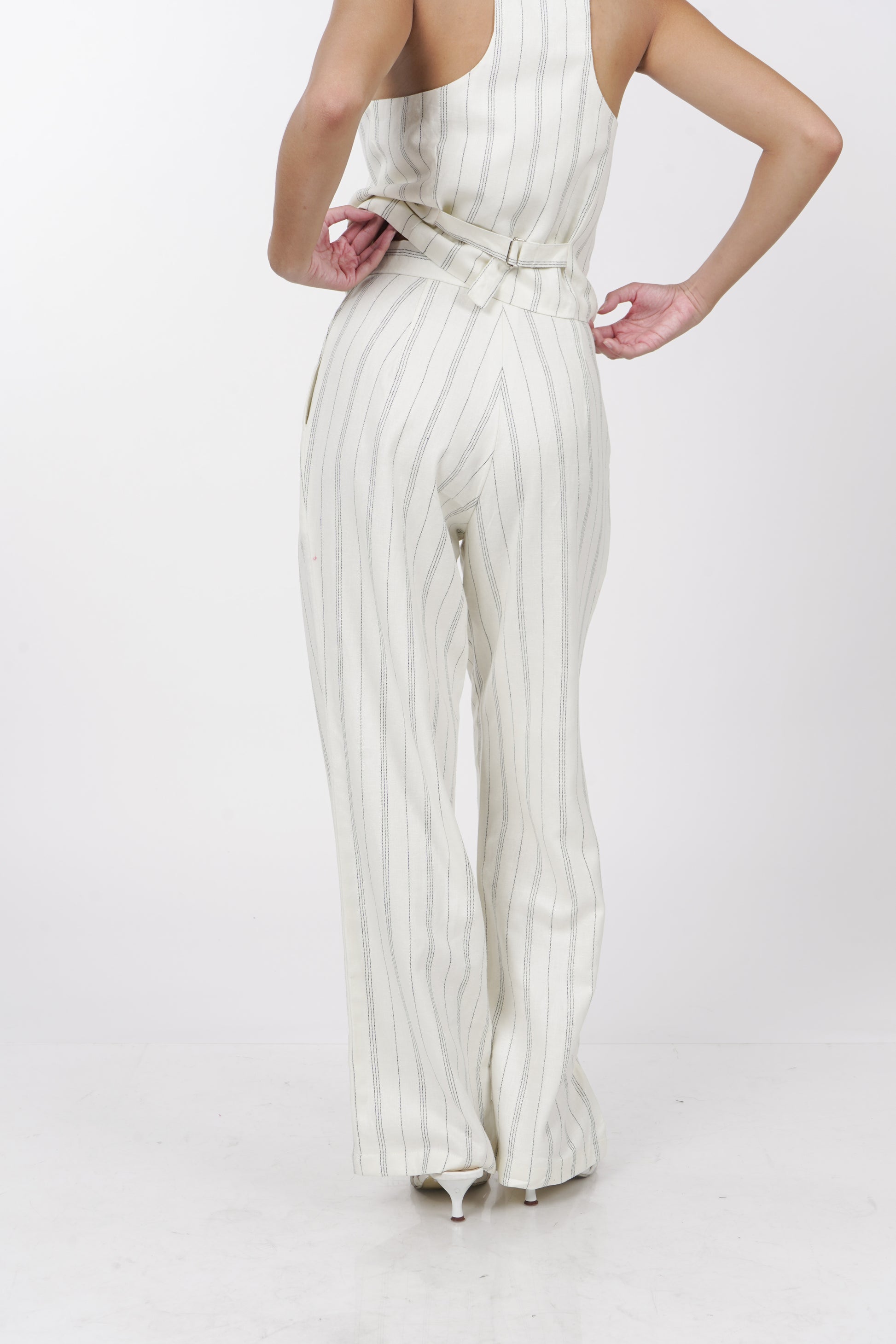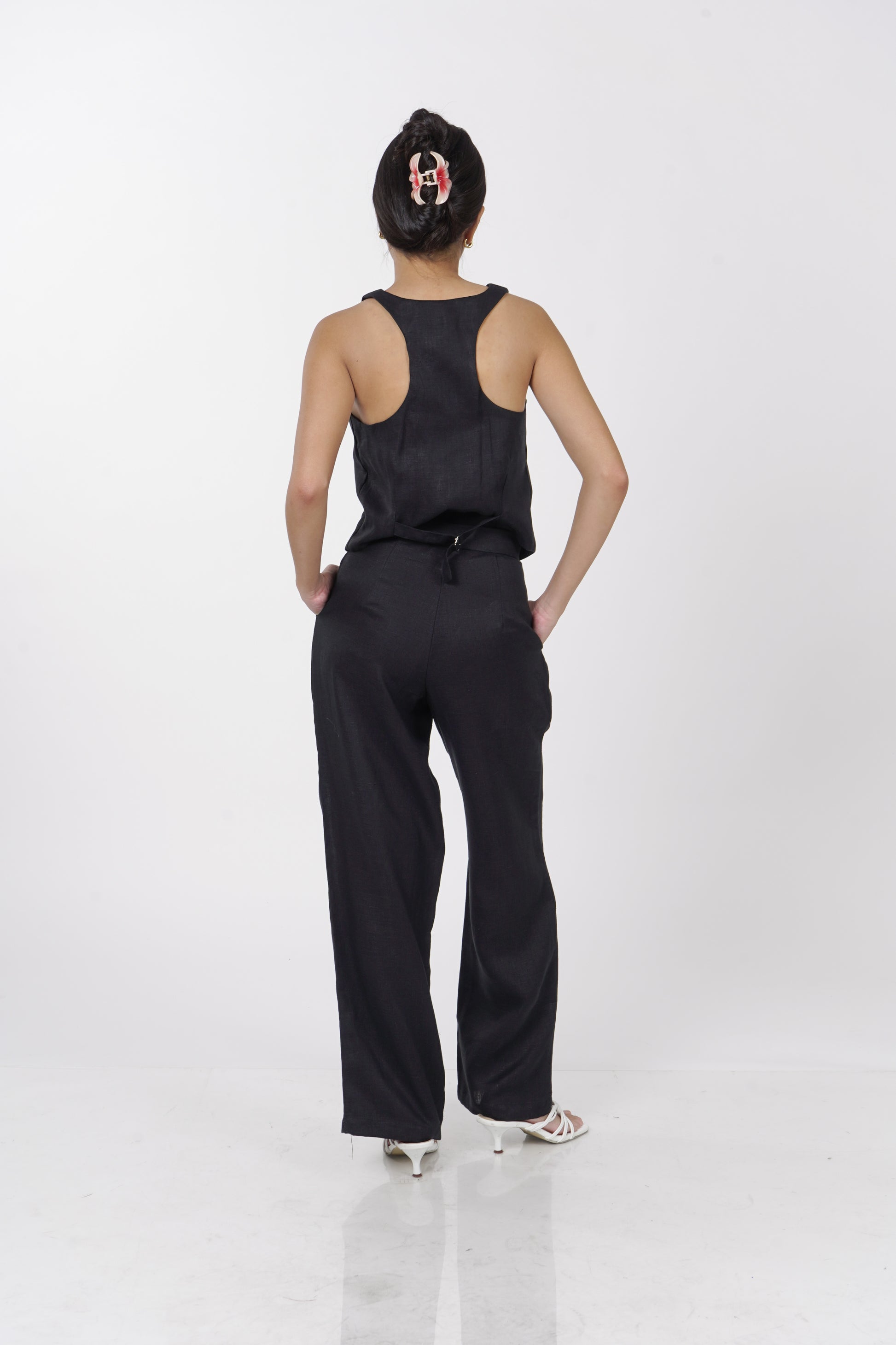 A classic work piece set in your wardrobe. The Anna Pants features a single pleat, side pockets and hook closure. The Anna Vest features a tailored front tails, illusion pockets and an adjustable buckle at the back to tailor the fit. Model wear Extra Small. Made in Linen.
