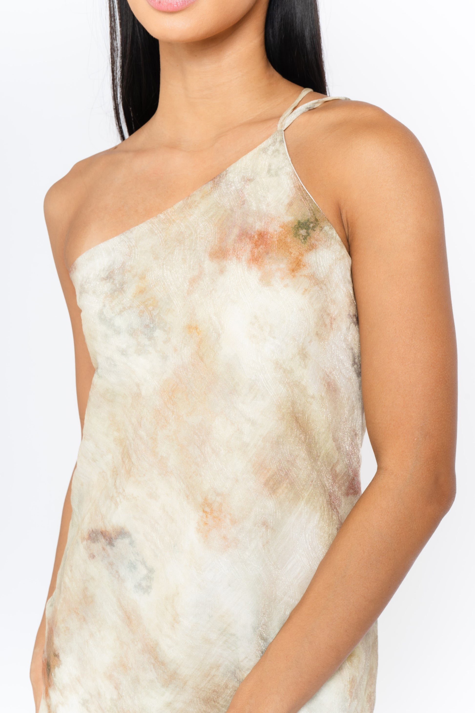 The Aya Maxi Dress features an asymmetrical neckline and hemline with a bias cut for draping silhouette. It is double lined with a side zipper and double adjustable straps. Made in Chiffon. Model wears XS.