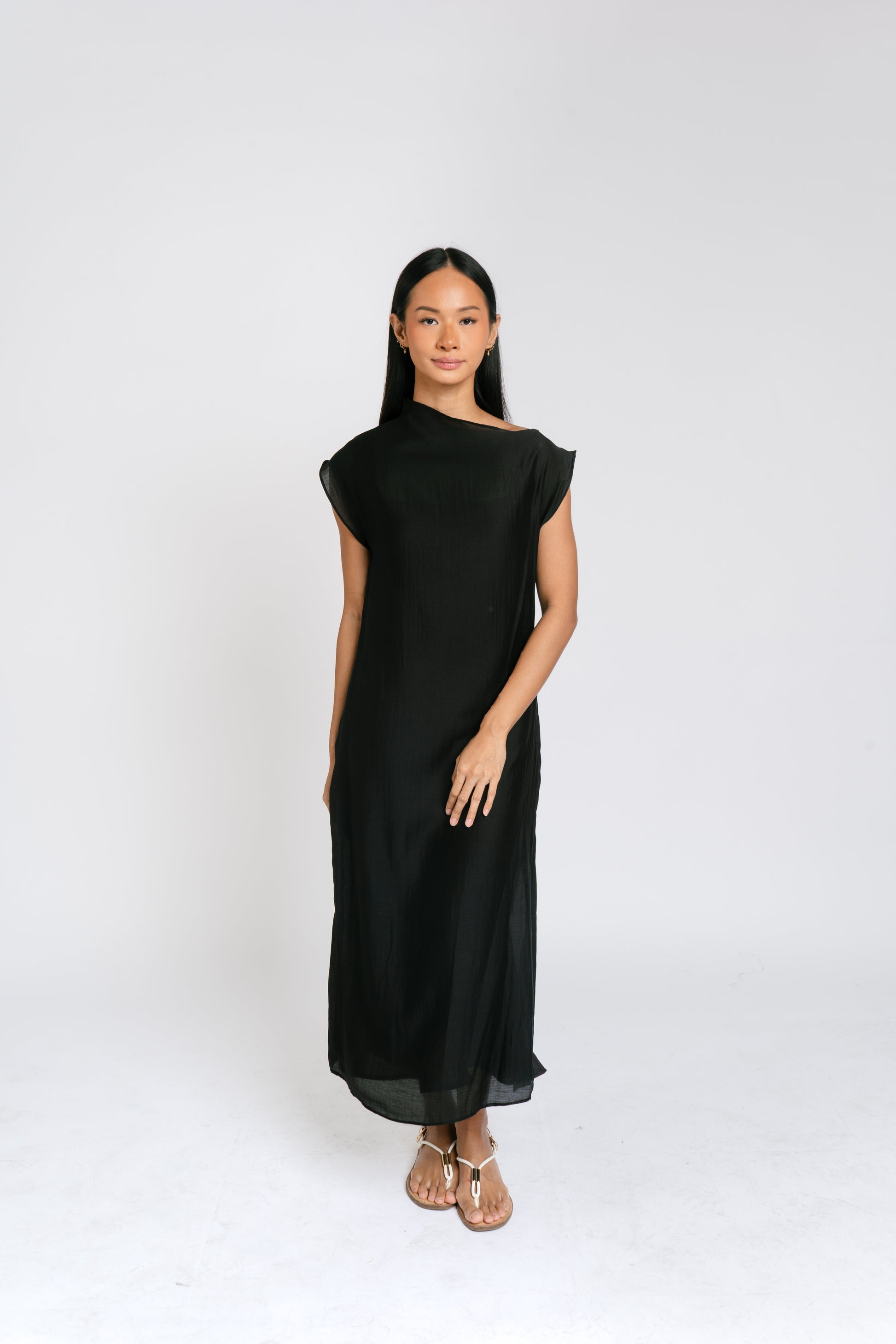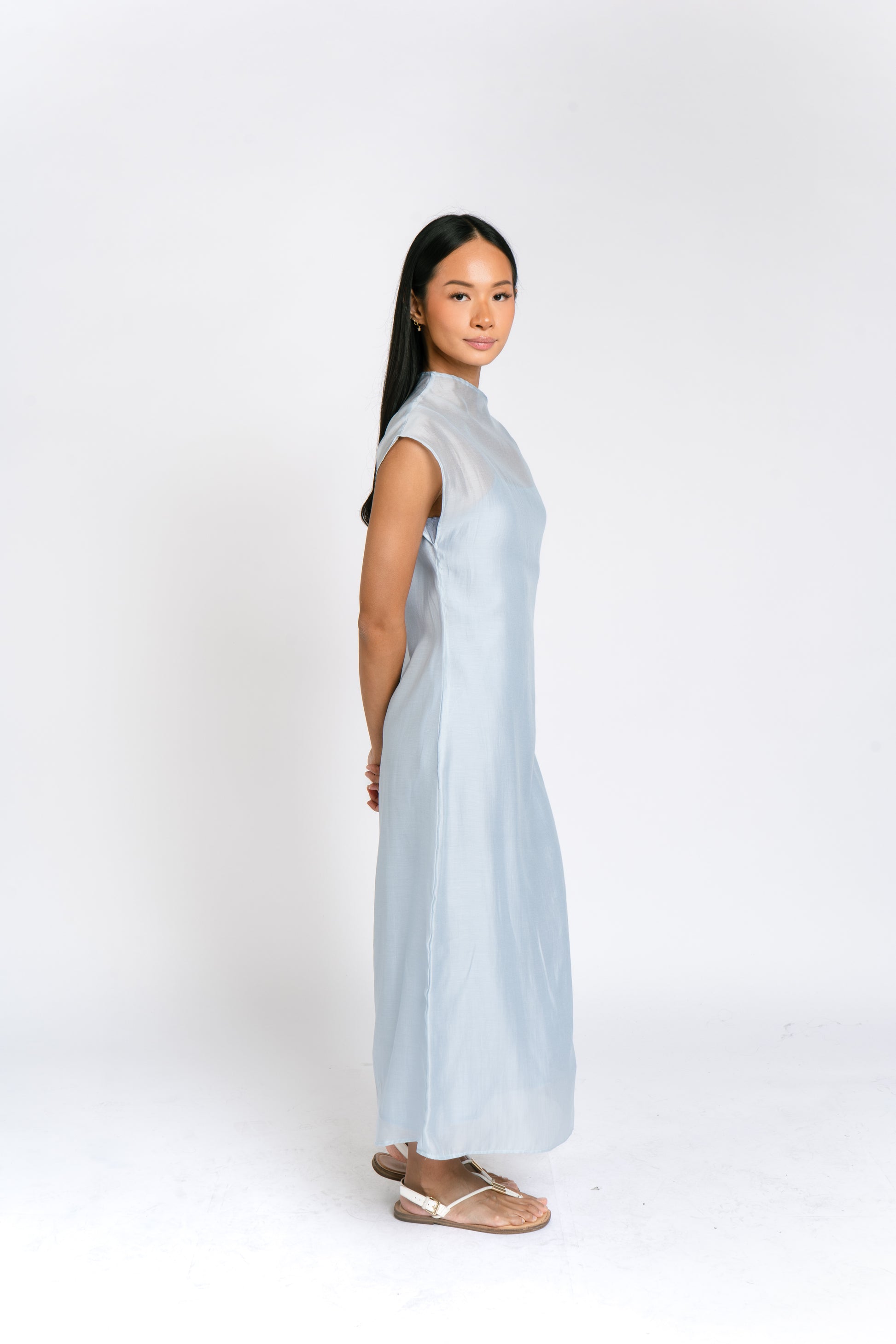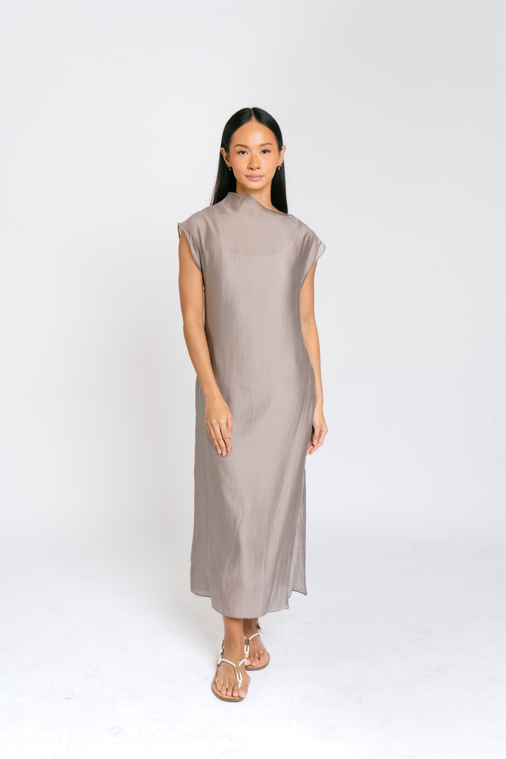The Demi Maxi Dress has a sheer cap sleeve outer layer with an asymmetric neckline opening and size slit. It is paired with a bias cut sleeveless dress inside. Made in Chiffon and Lyocell. Model wears XS.