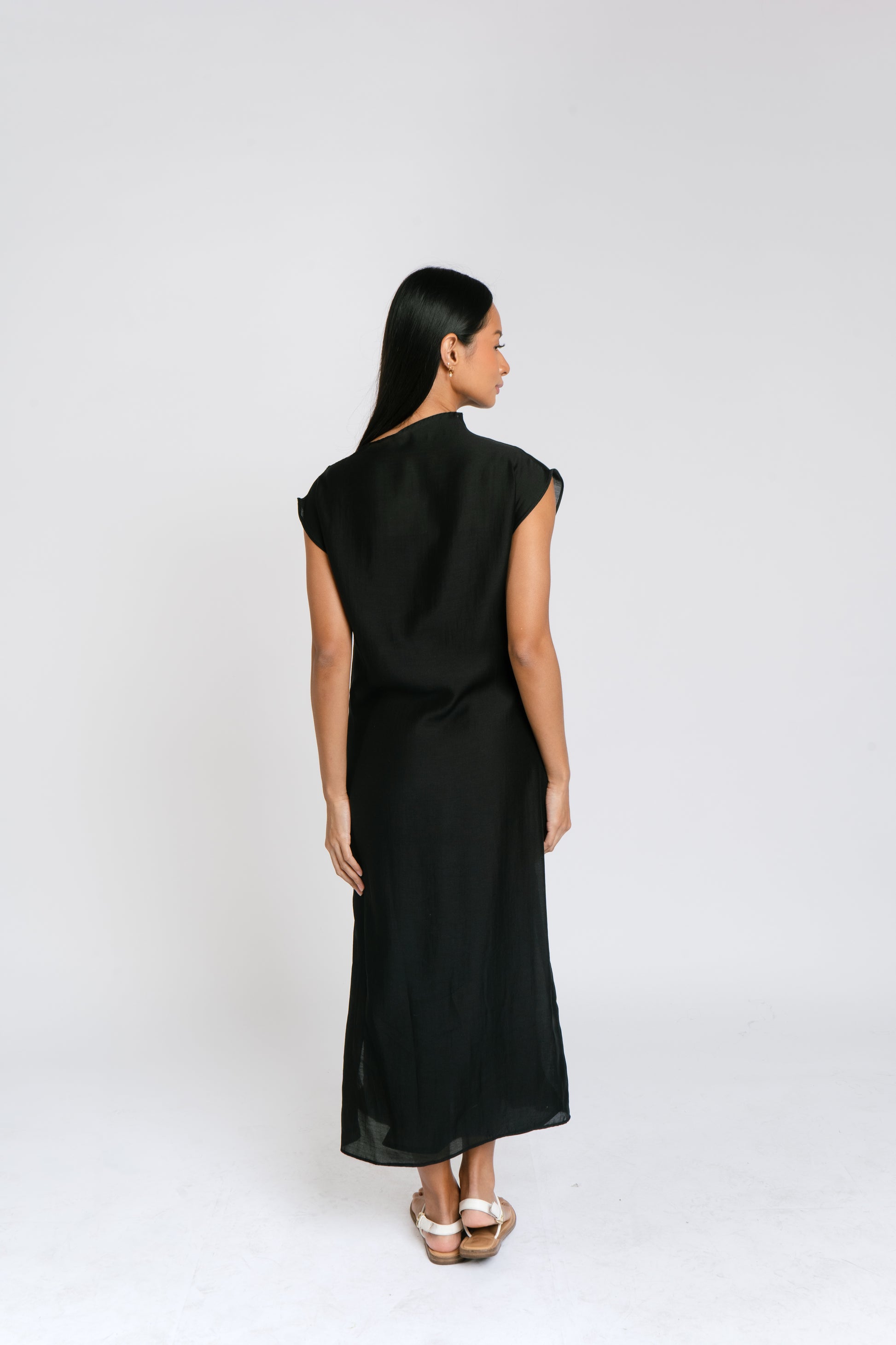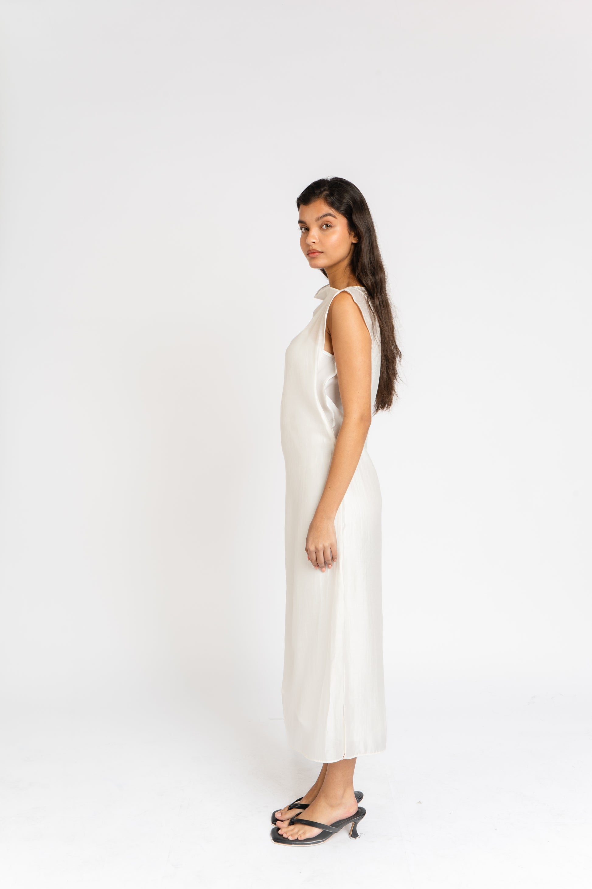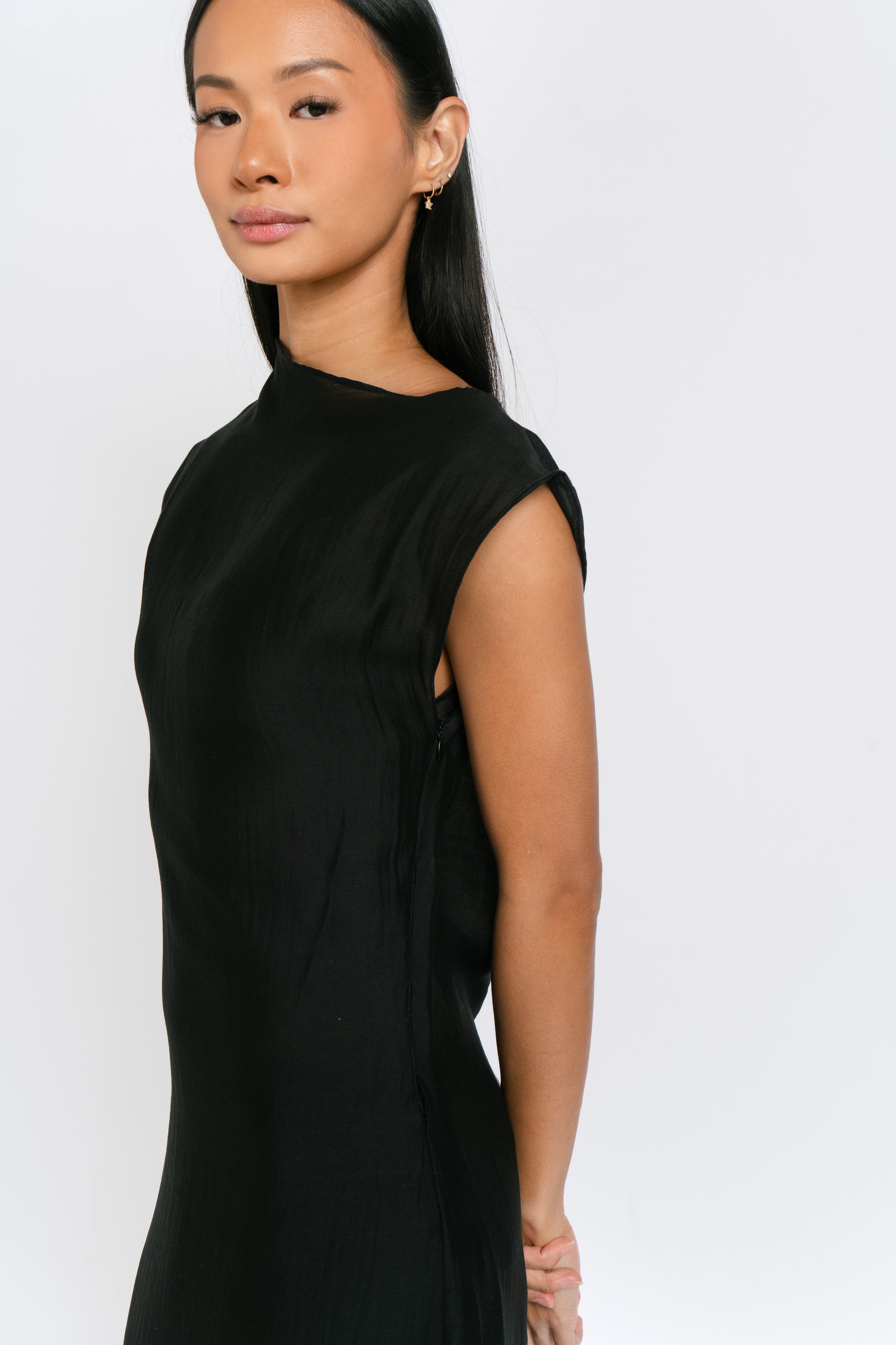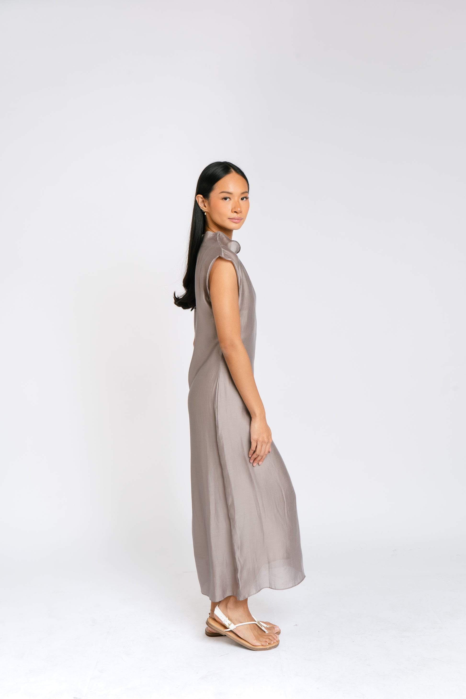 The Demi Maxi Dress has a sheer cap sleeve outer layer with an asymmetric neckline opening and size slit. It is paired with a bias cut sleeveless dress inside. Made in Chiffon and Lyocell. Model wears XS.