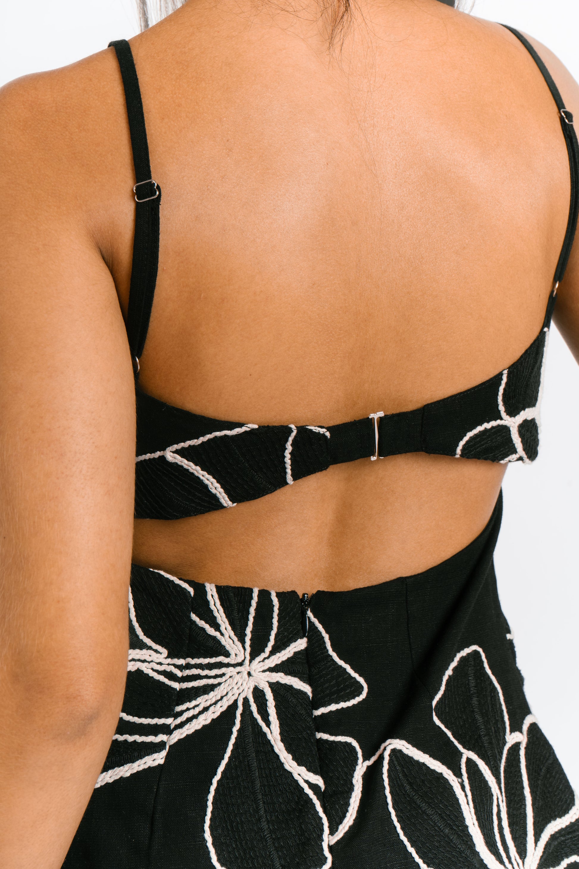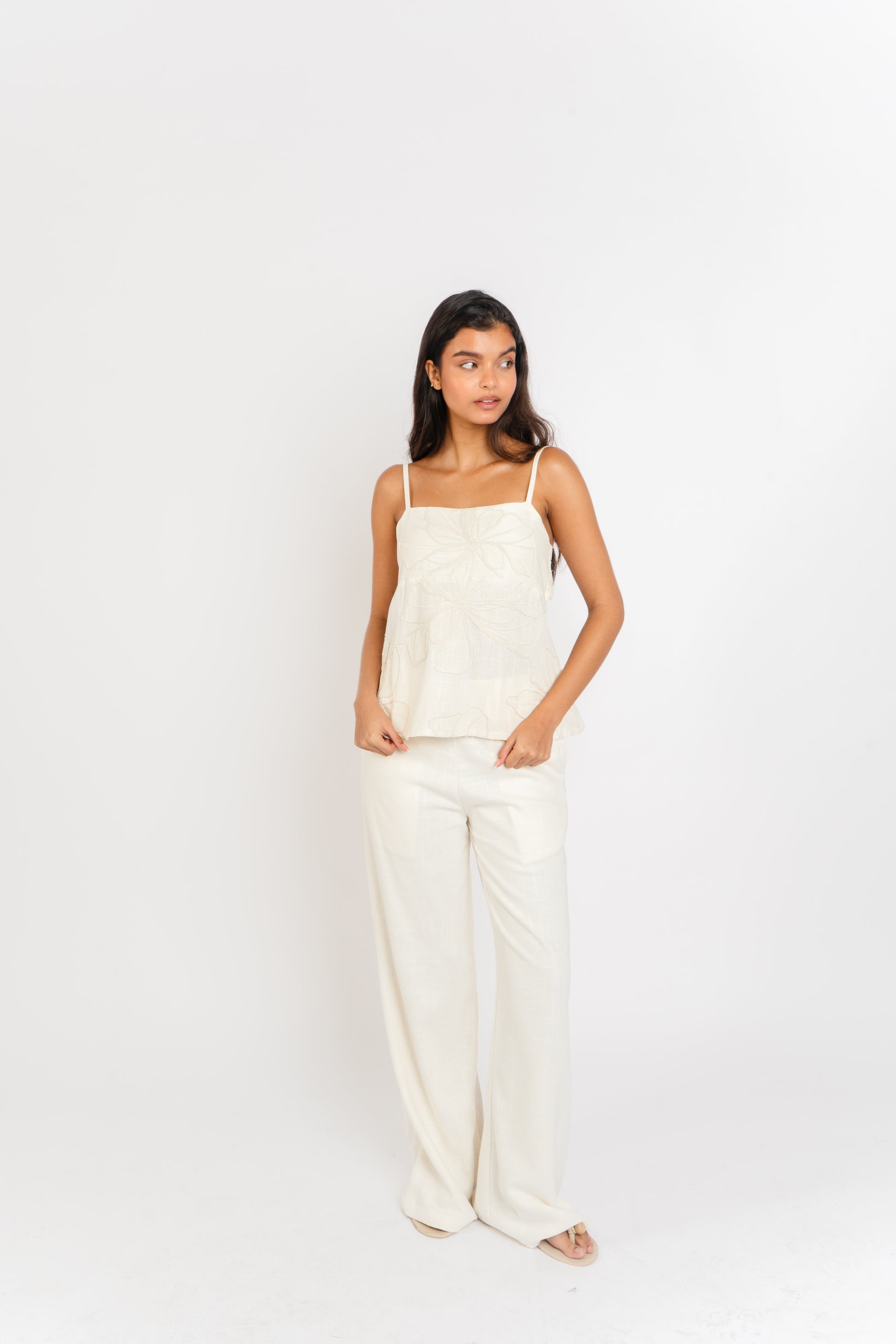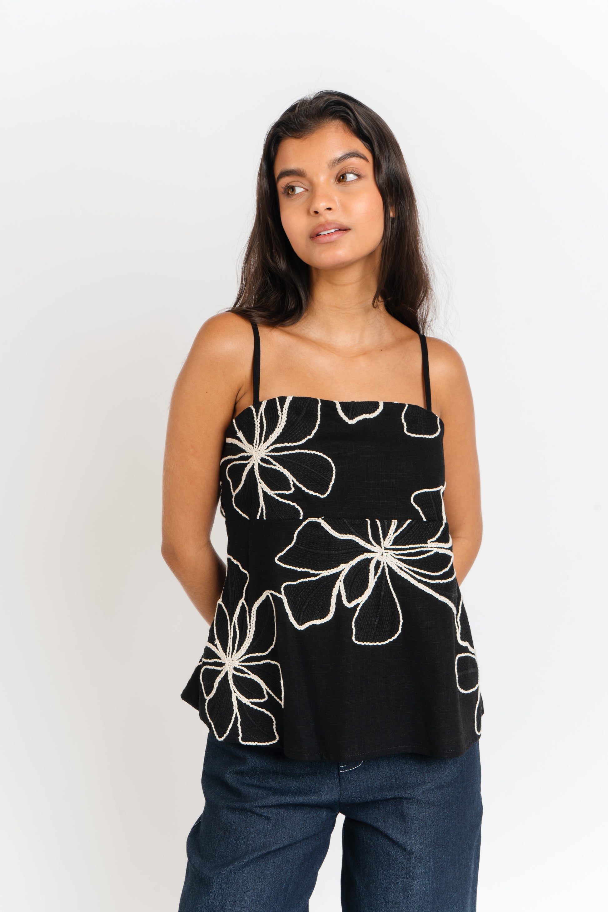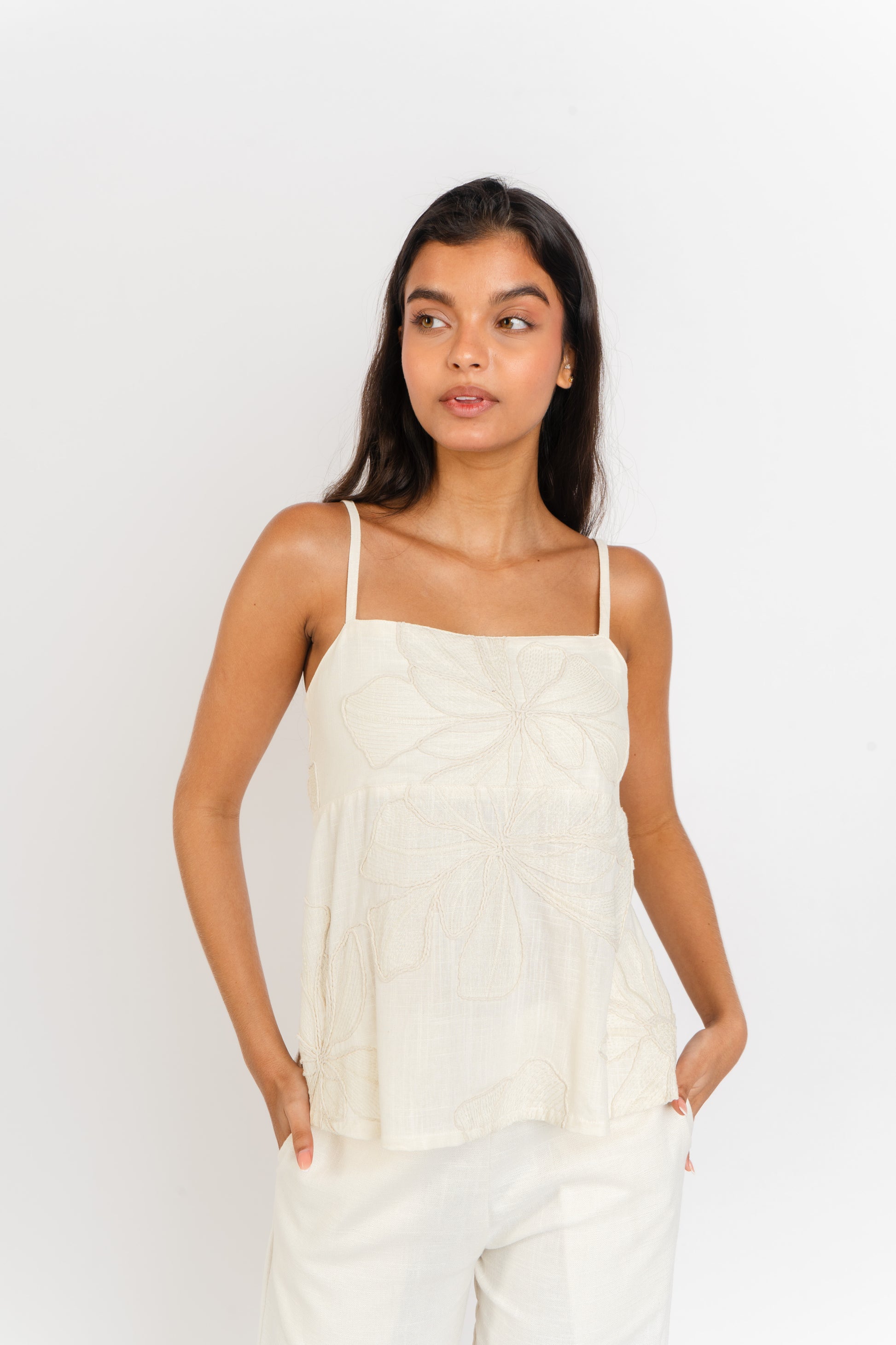 The Rosa Top features a straight neckline with an A line silhouette. The top sports a scoop back with adjustable straps and hook closure to adjust the back strap. The top is lined. Made in Linen with Embroidery. Model wears XS.