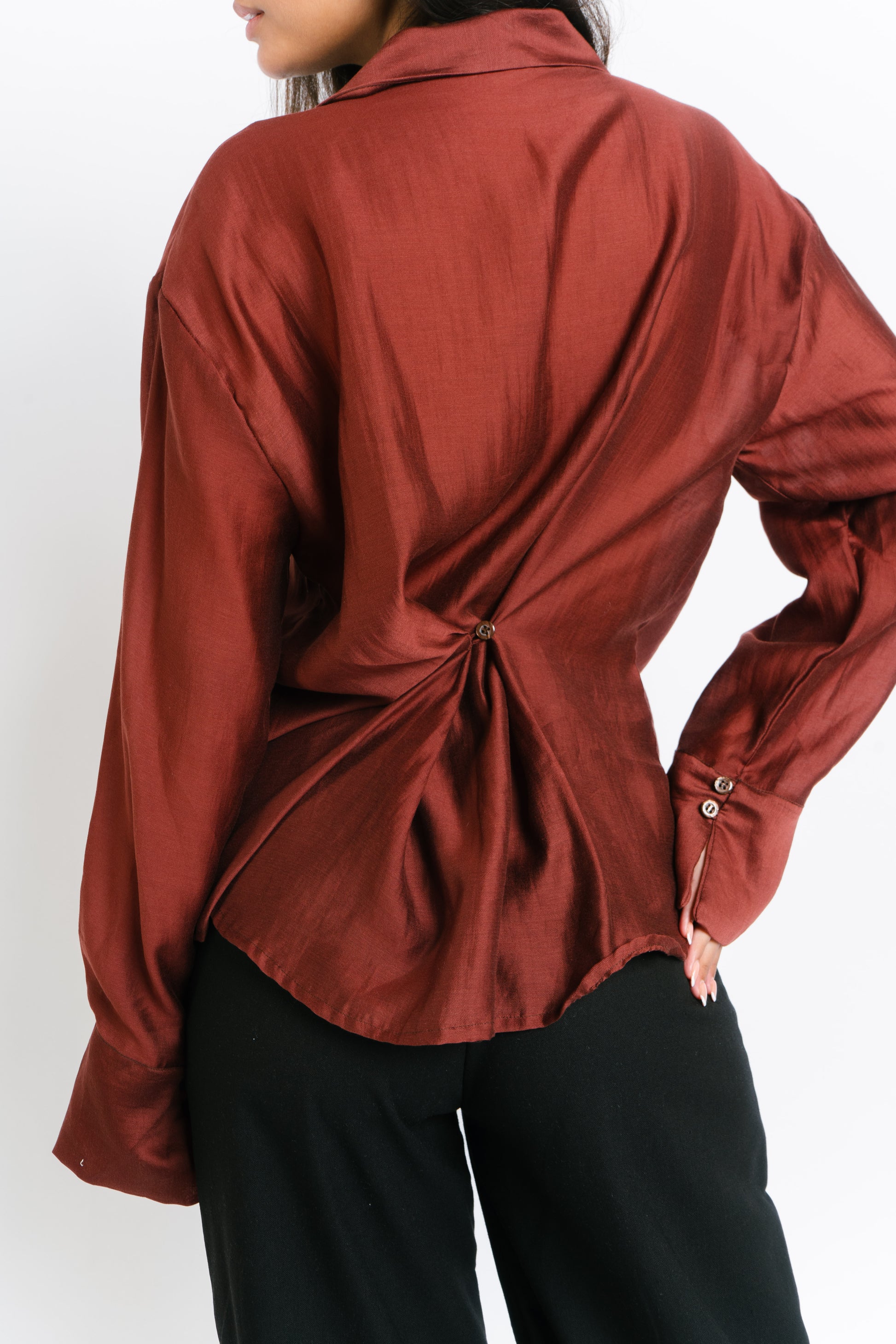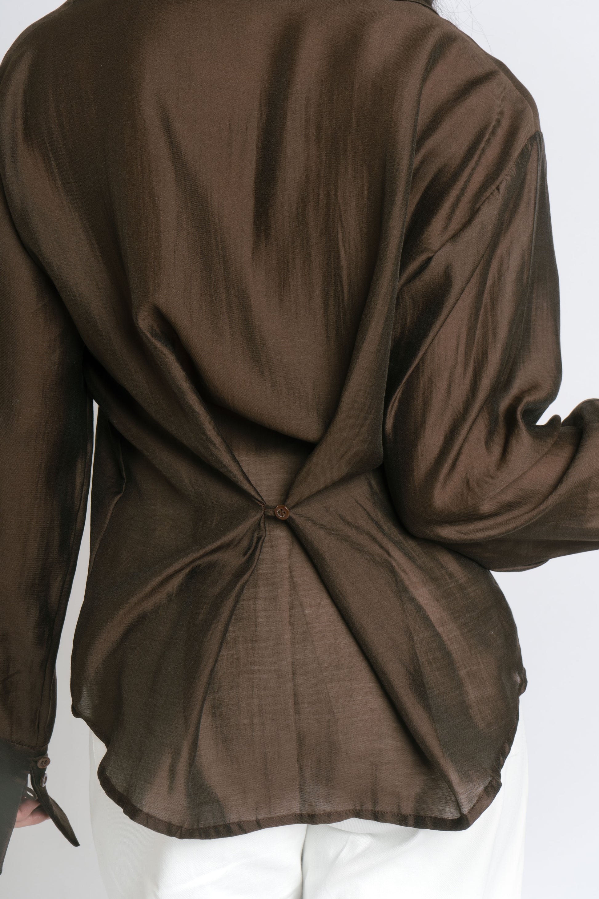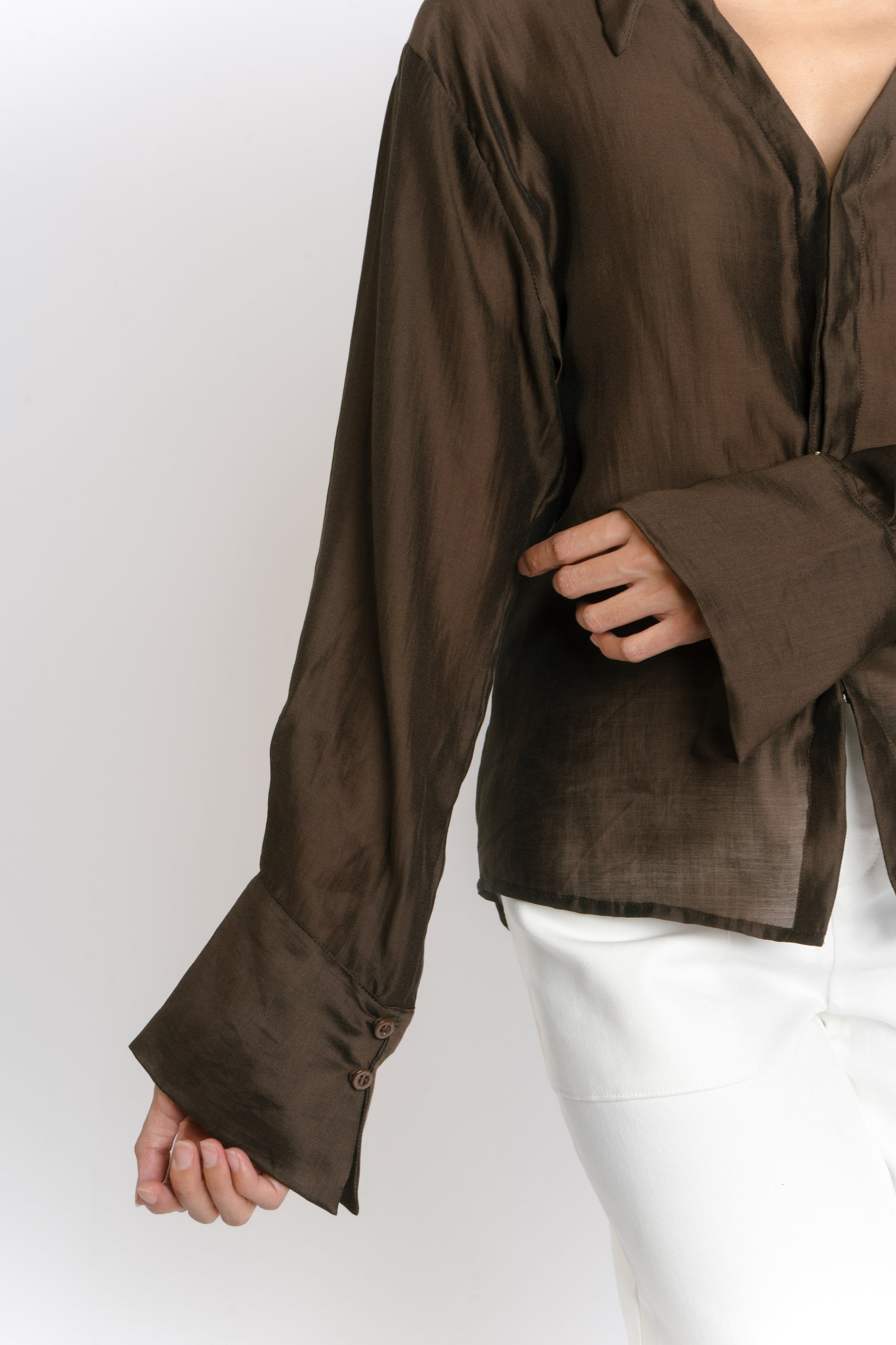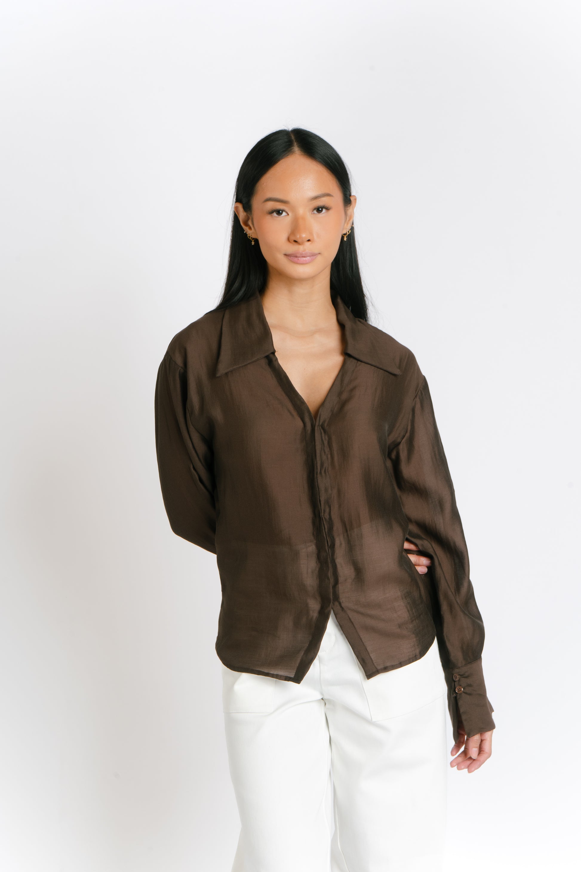 The Irina Polo is an oversized longsleeve polo with hook closures and a back button and loop to achieve a cinched waist. Made in Chiffon. Fabric is semi sheer. Model wears XS.