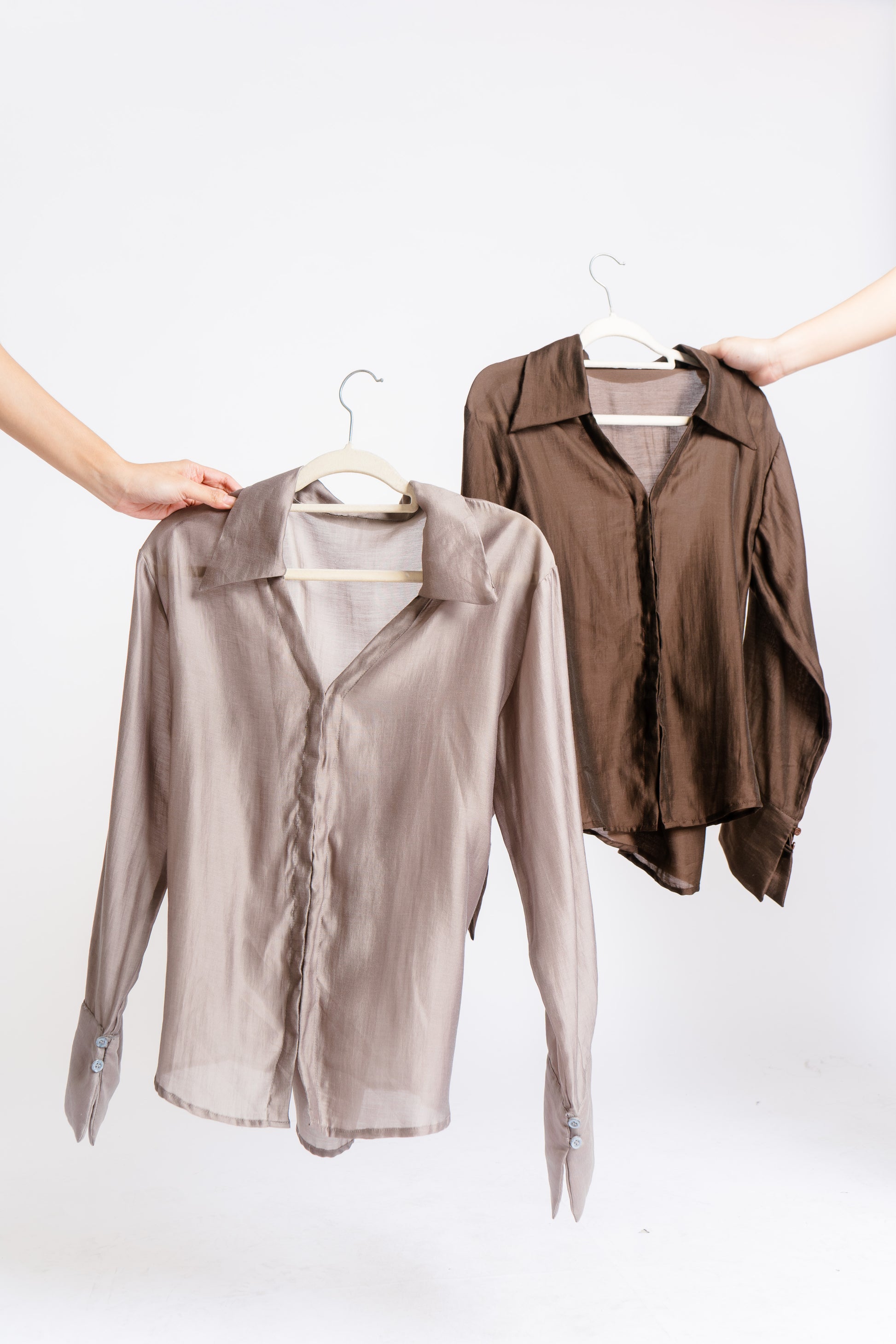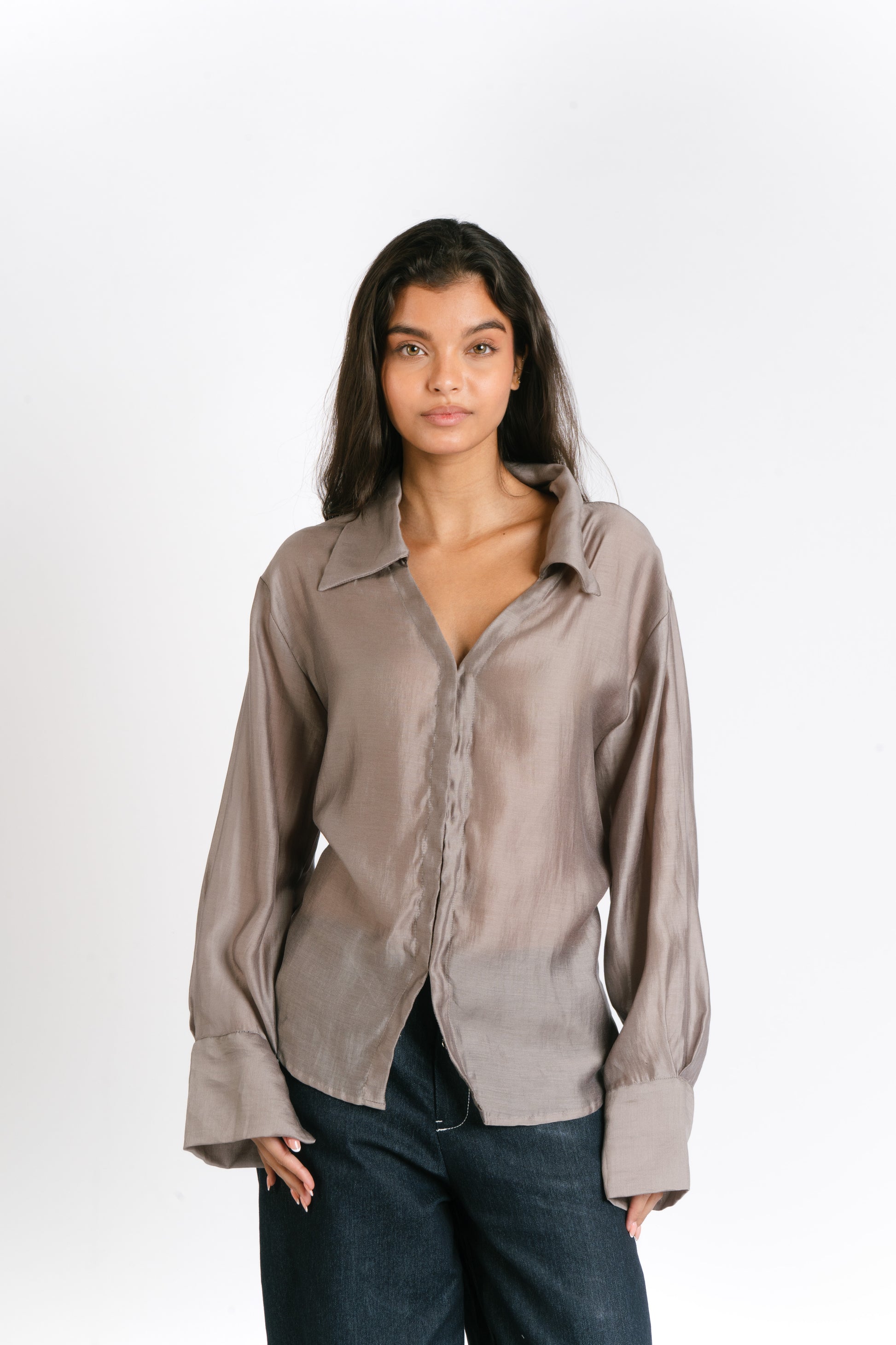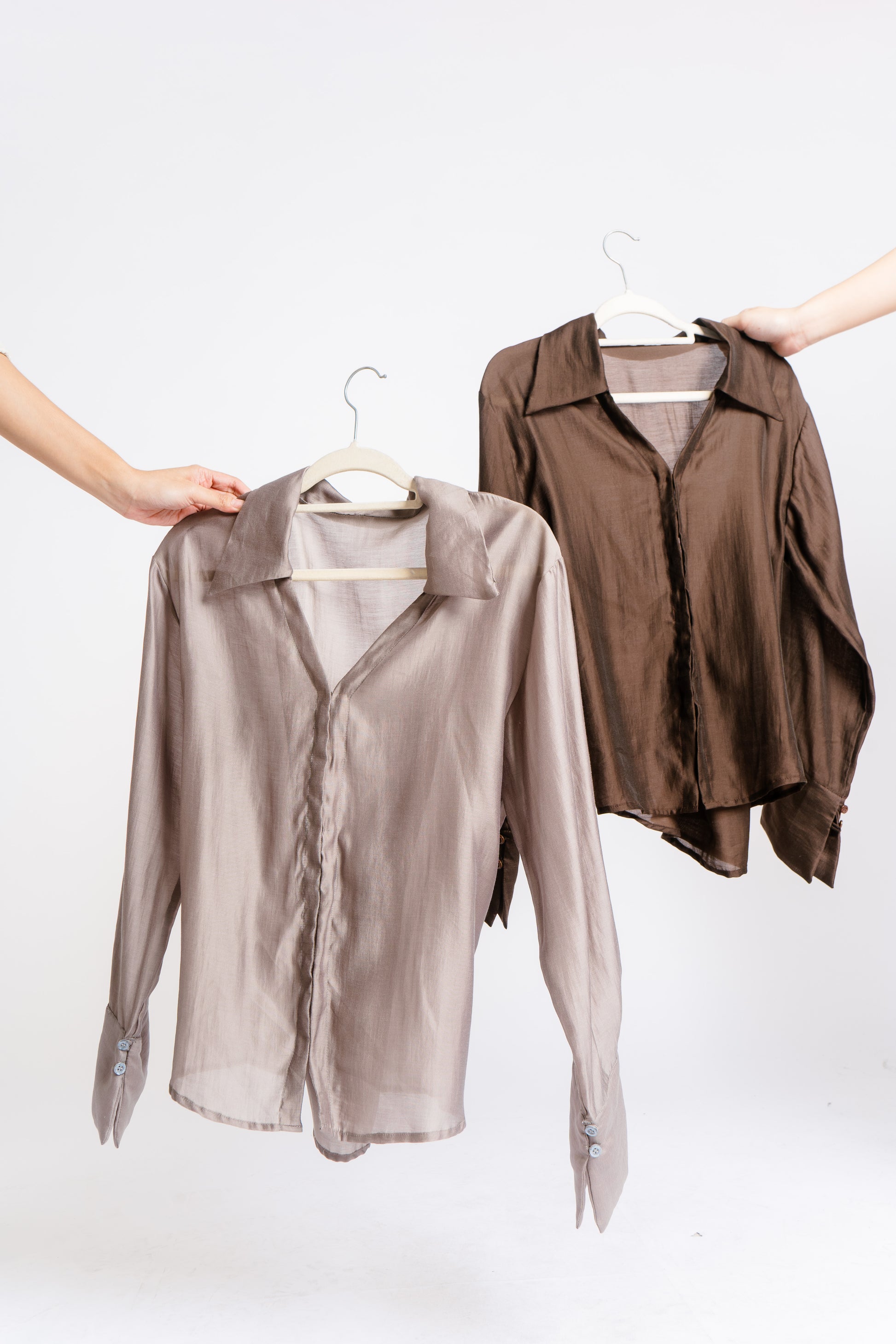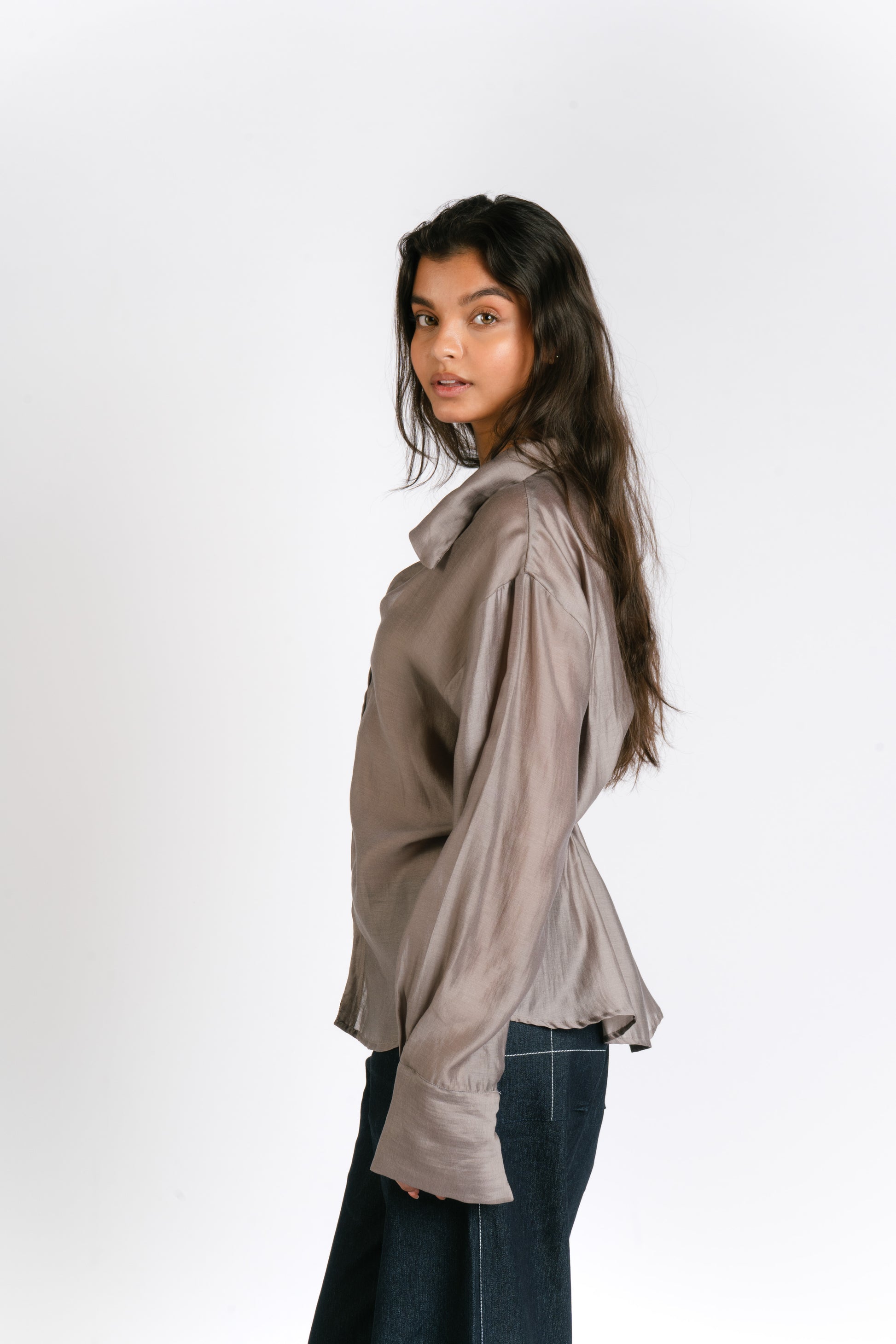 The Irina Polo is an oversized longsleeve polo with hook closures and a back button and loop to achieve a cinched waist. Made in Chiffon. Fabric is semi sheer. Model wears XS.