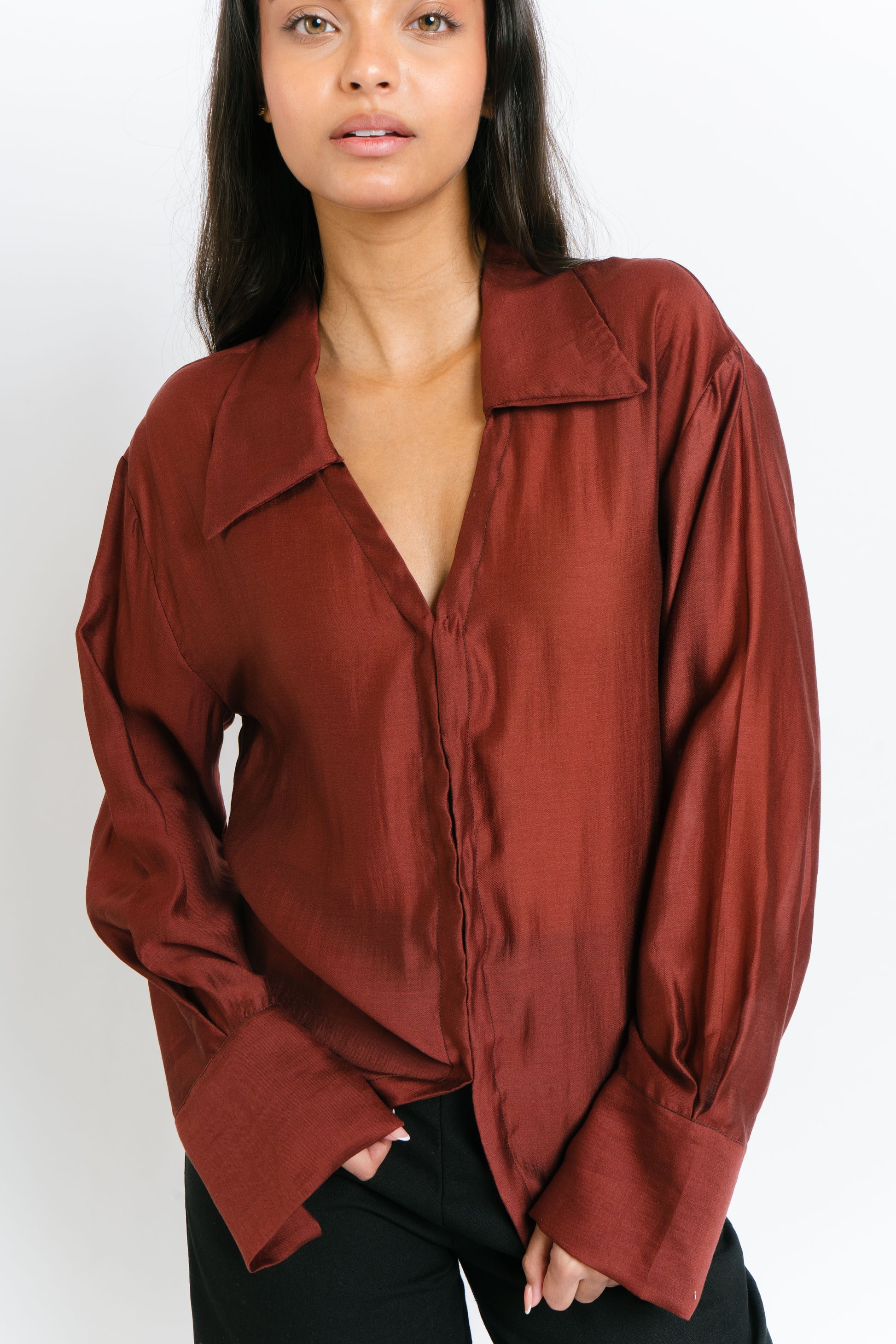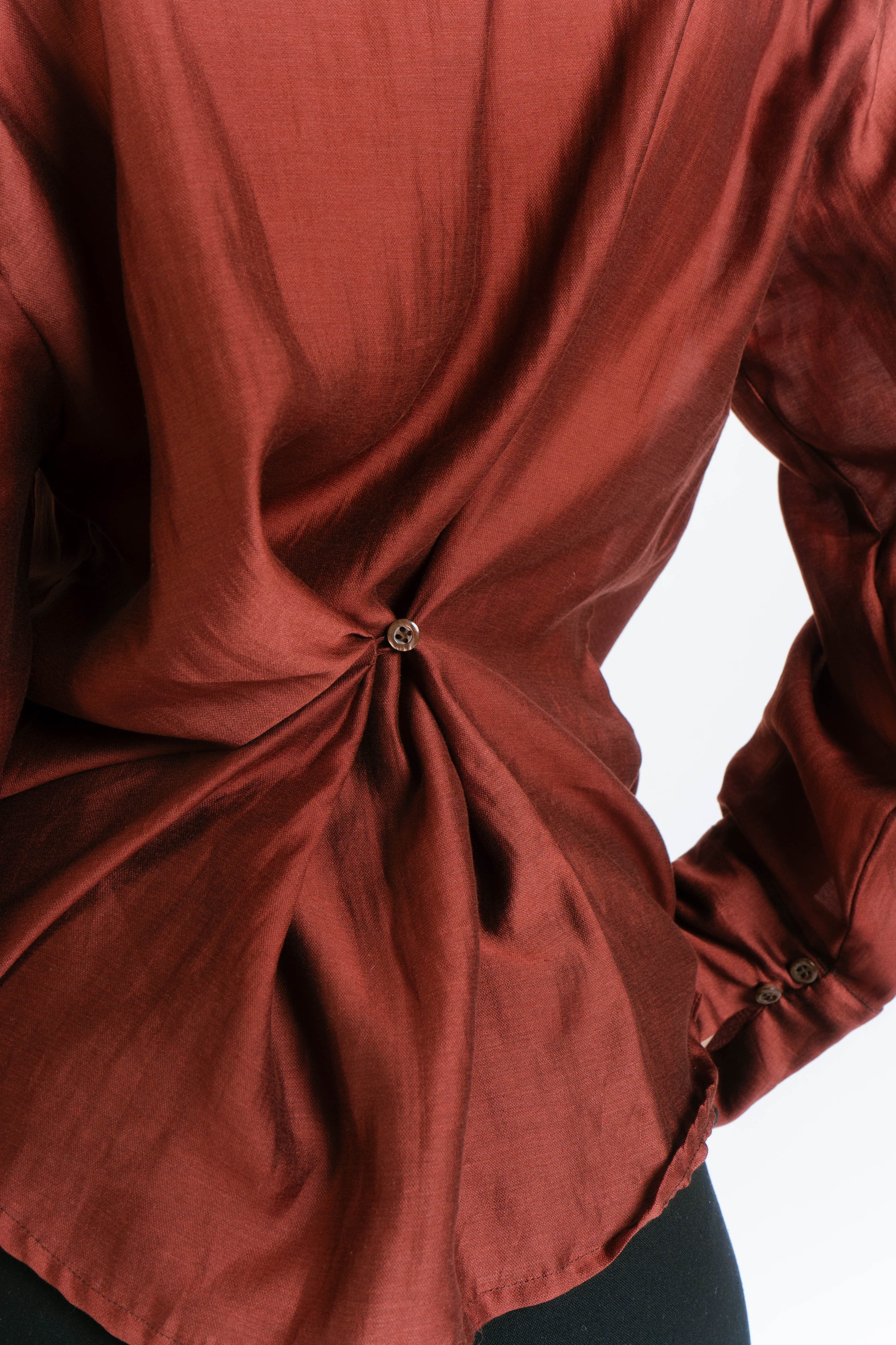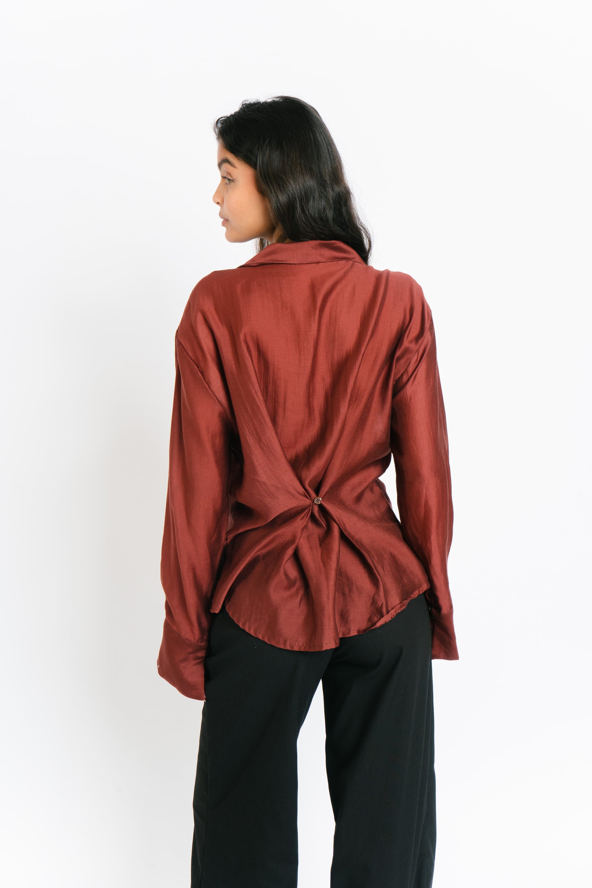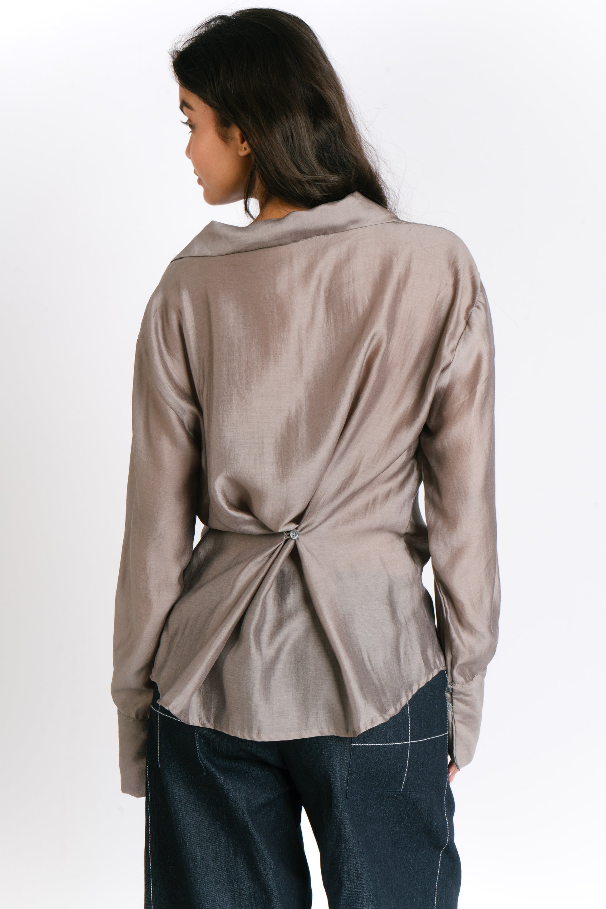 The Irina Polo is an oversized longsleeve polo with hook closures and a back button and loop to achieve a cinched waist. Made in Chiffon. Fabric is semi sheer. Model wears XS.