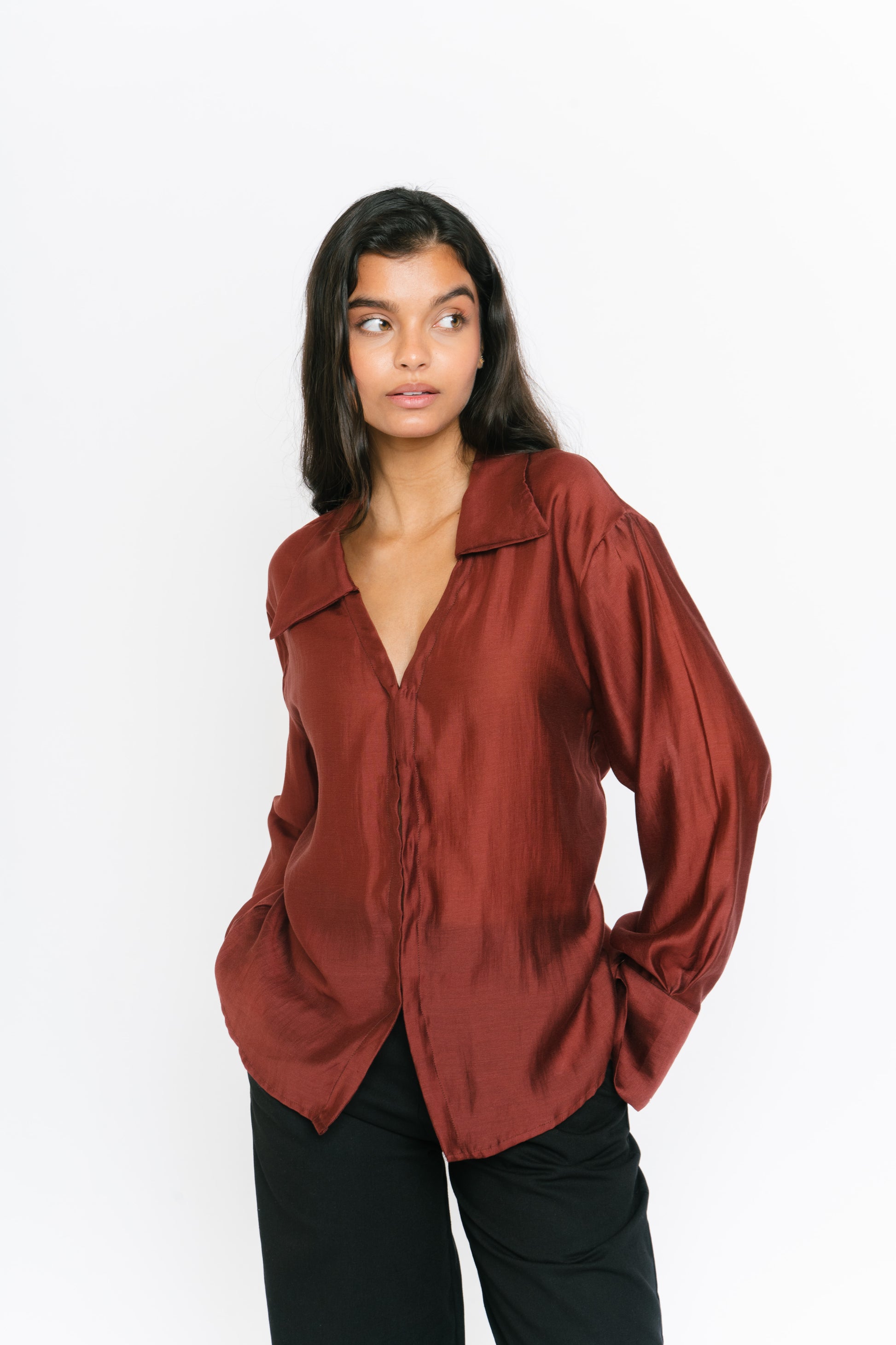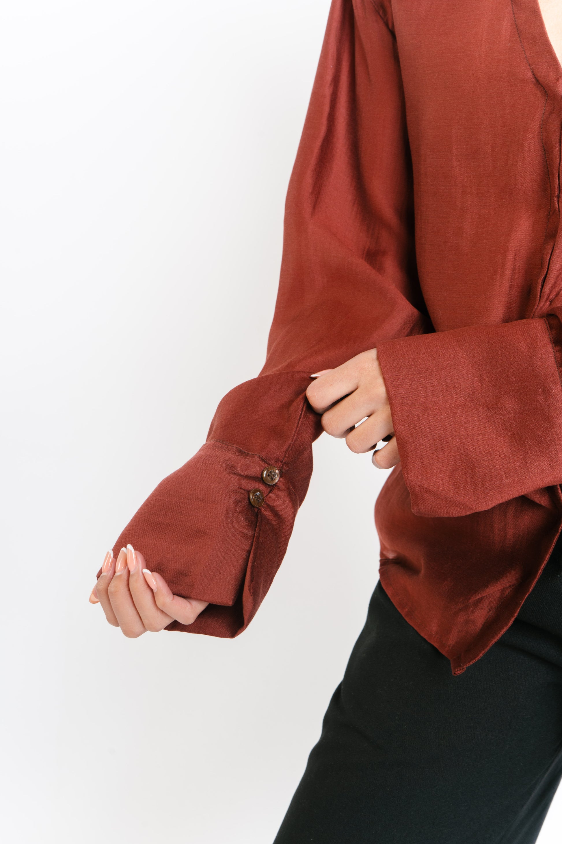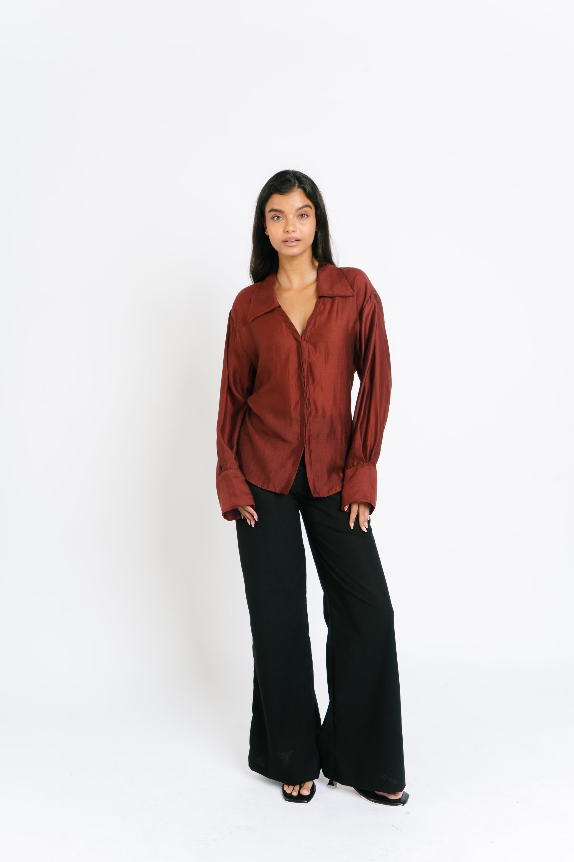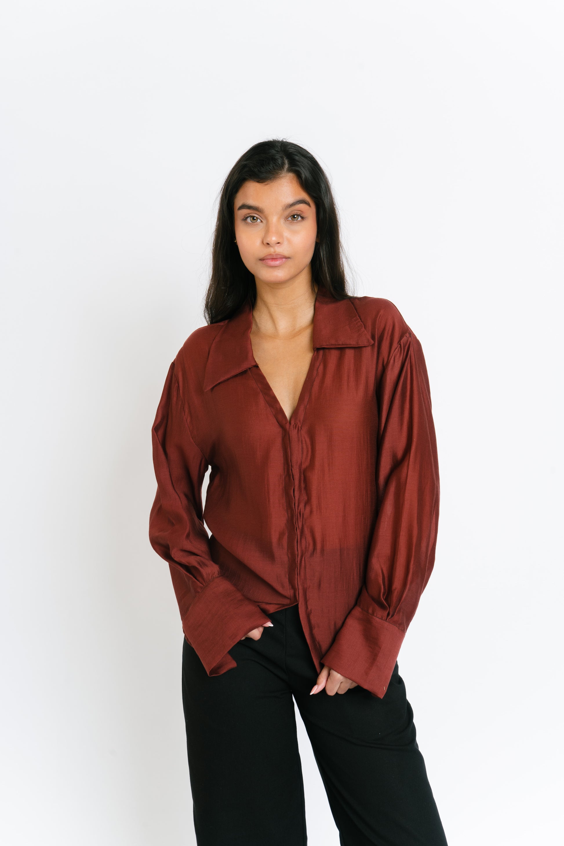 The Irina Polo is an oversized longsleeve polo with hook closures and a back button and loop to achieve a cinched waist. Made in Chiffon. Fabric is semi sheer. Model wears XS.