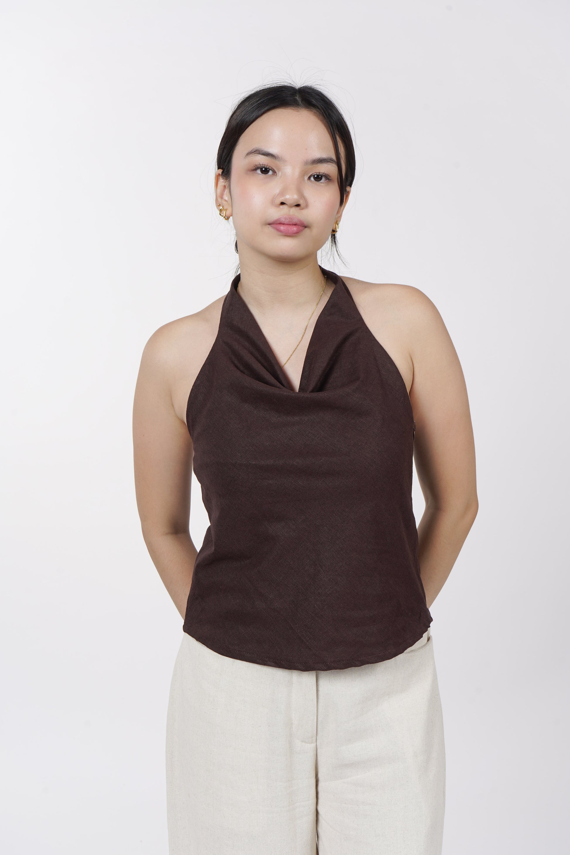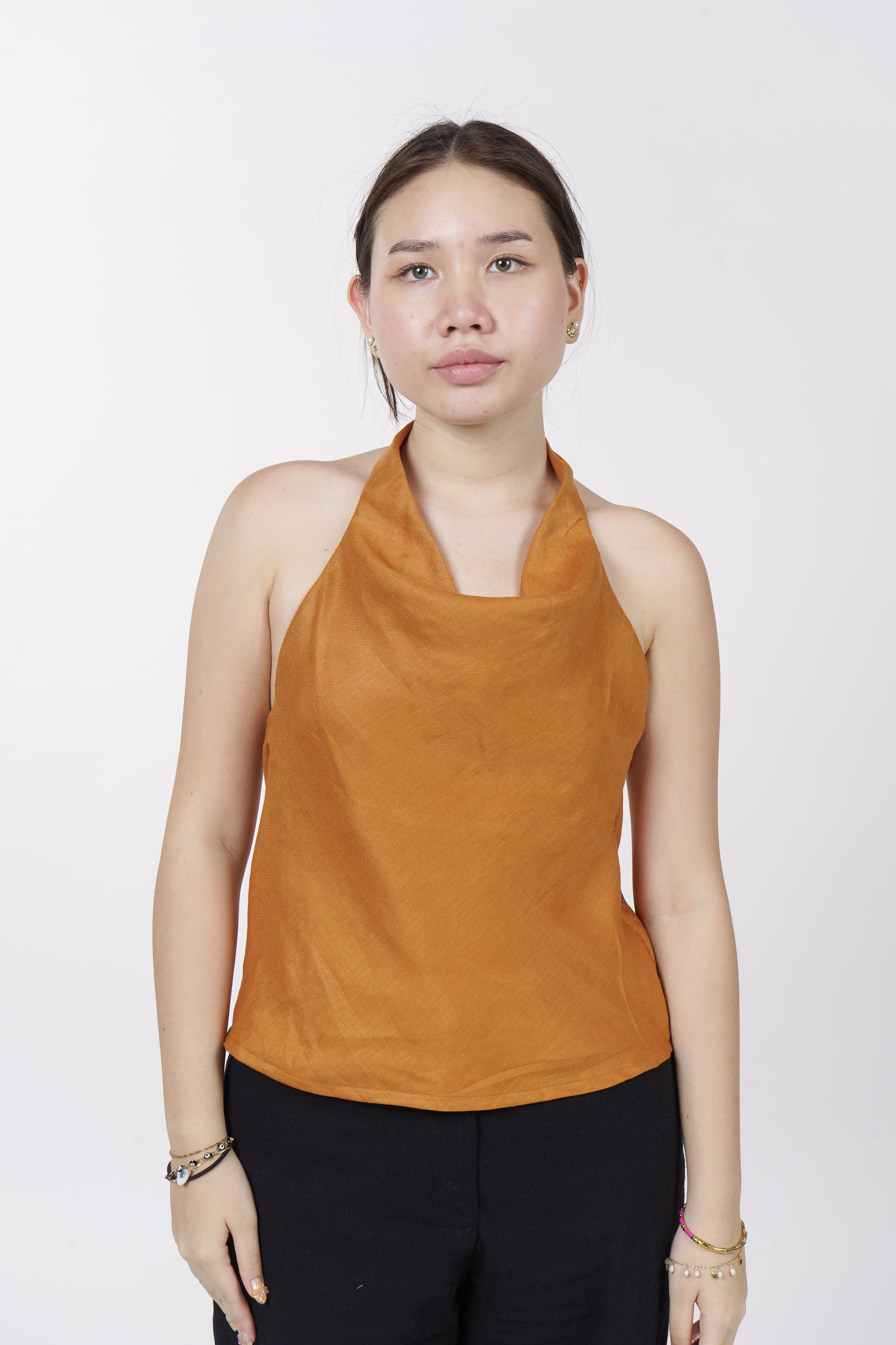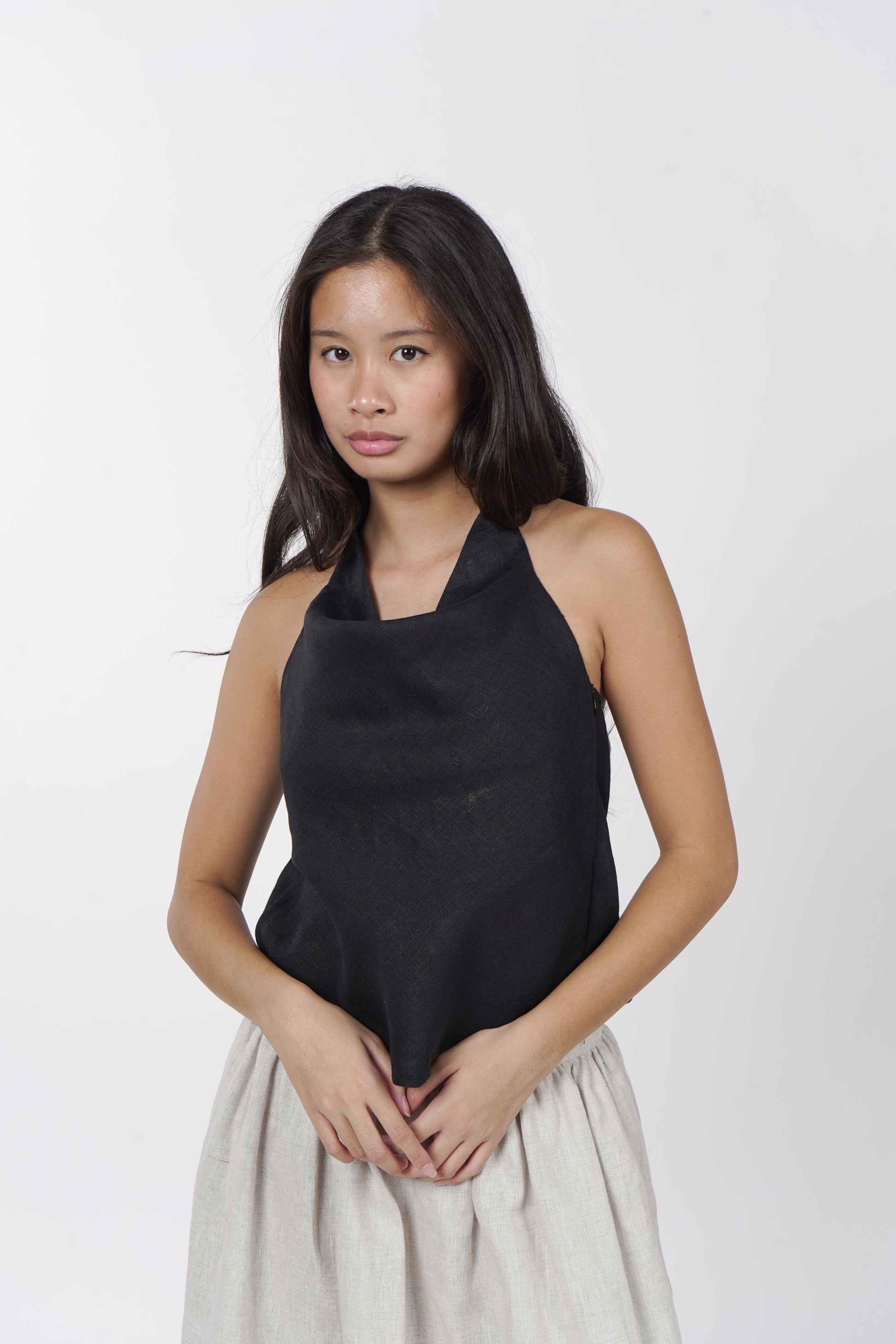 The Ivana Top features a halter cowl neck neckline with a low back. Best Paired with the Mira Pants or Thea Maxi Skirt. Made in Linen. Model wears Extra Small.