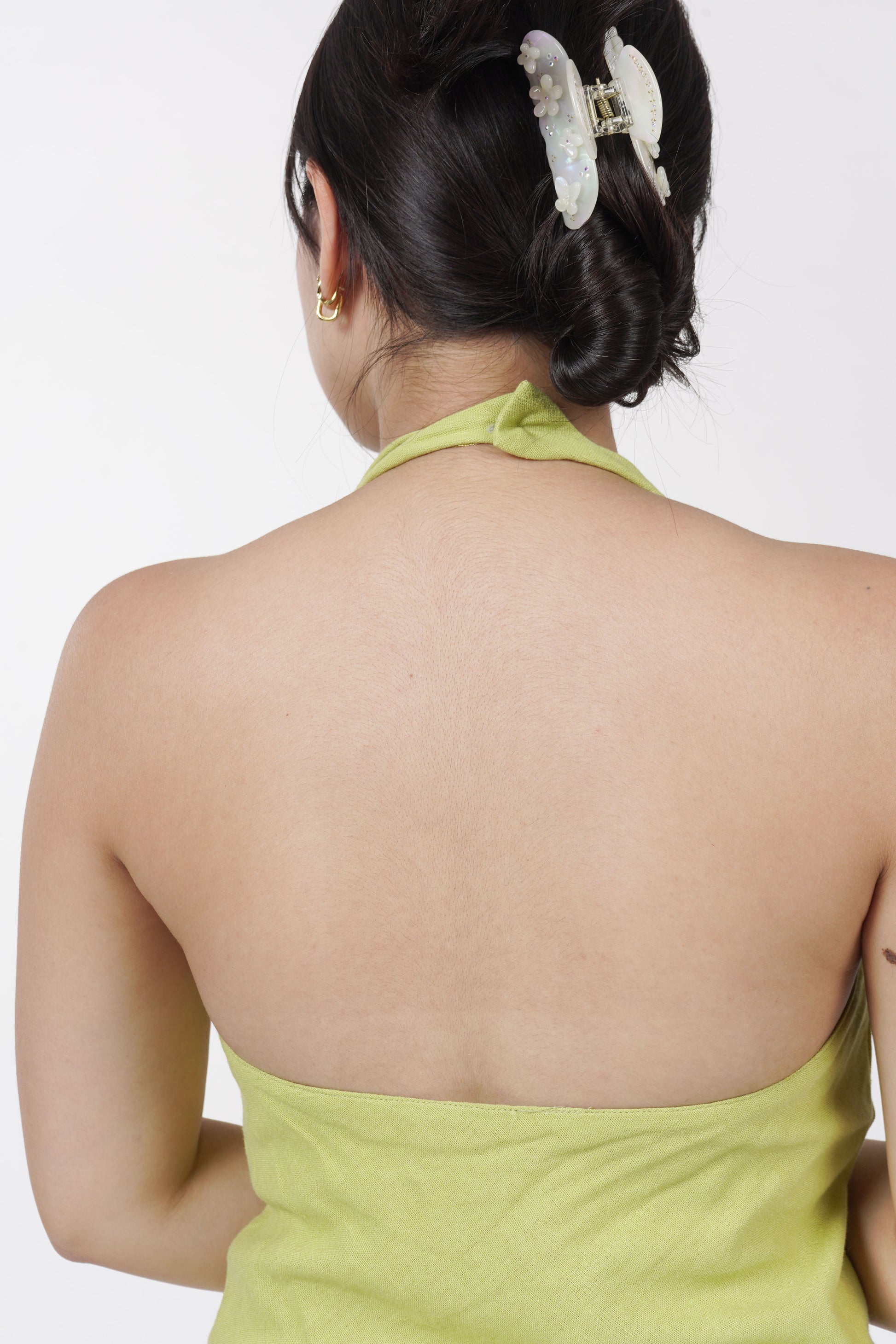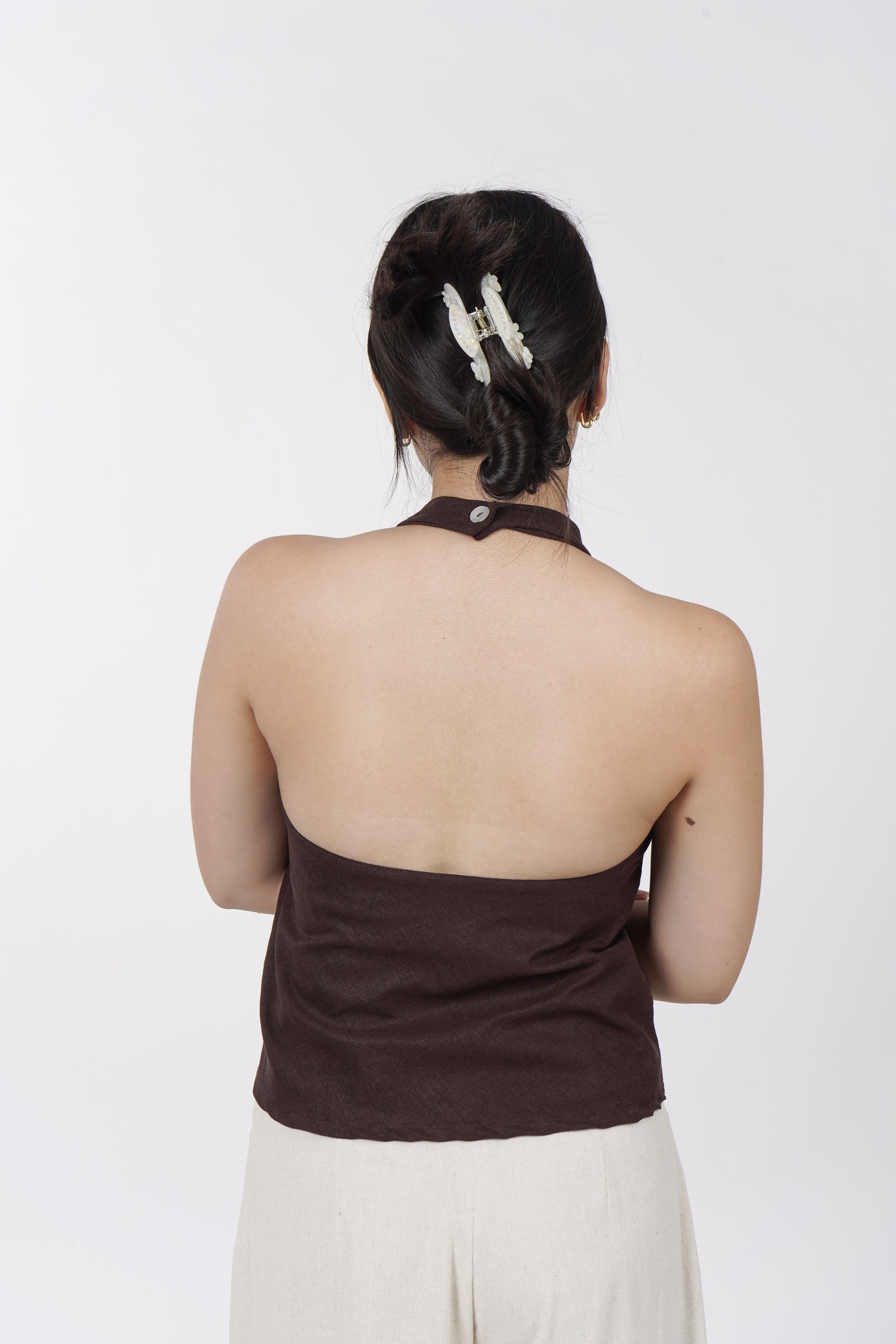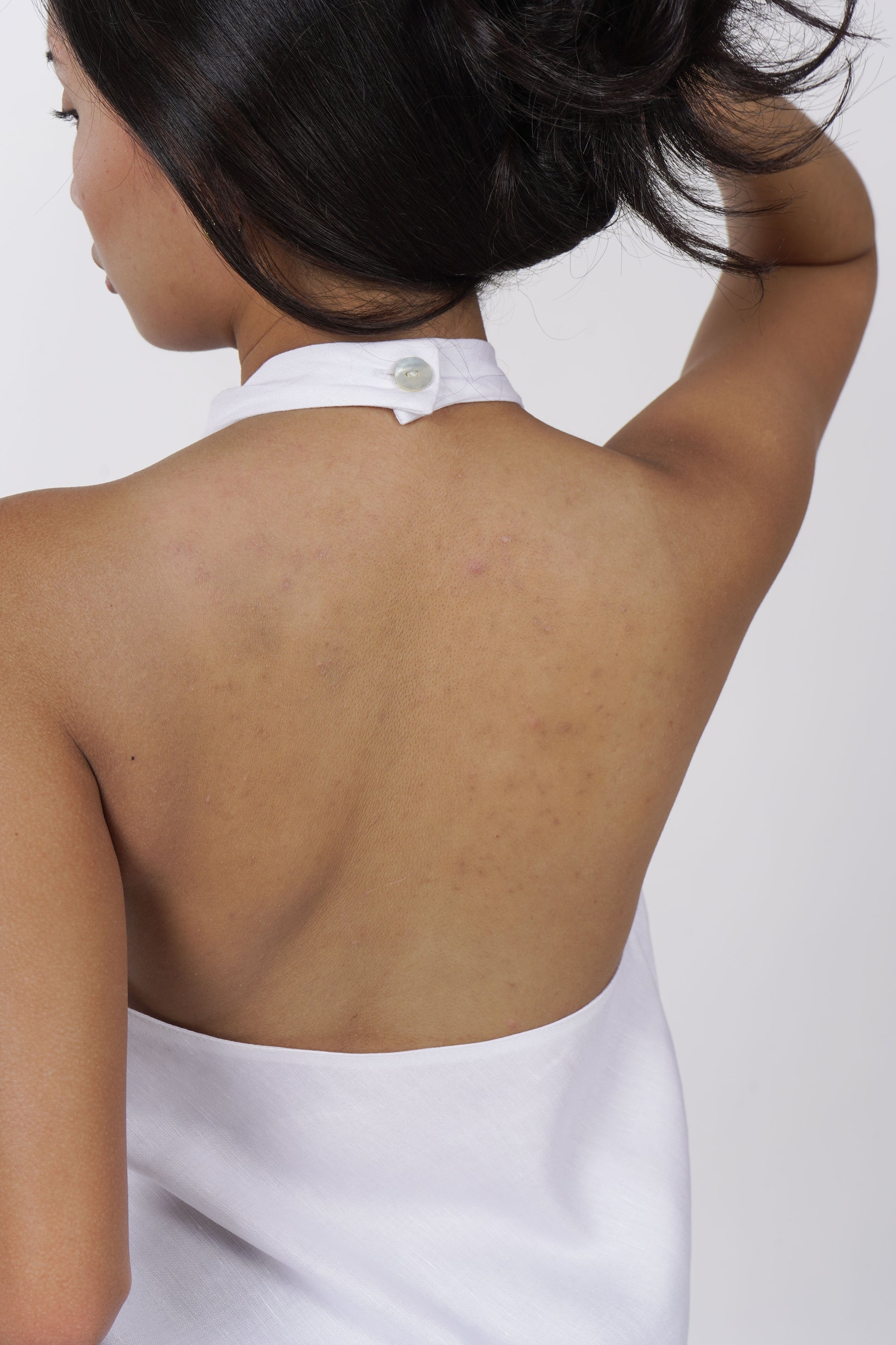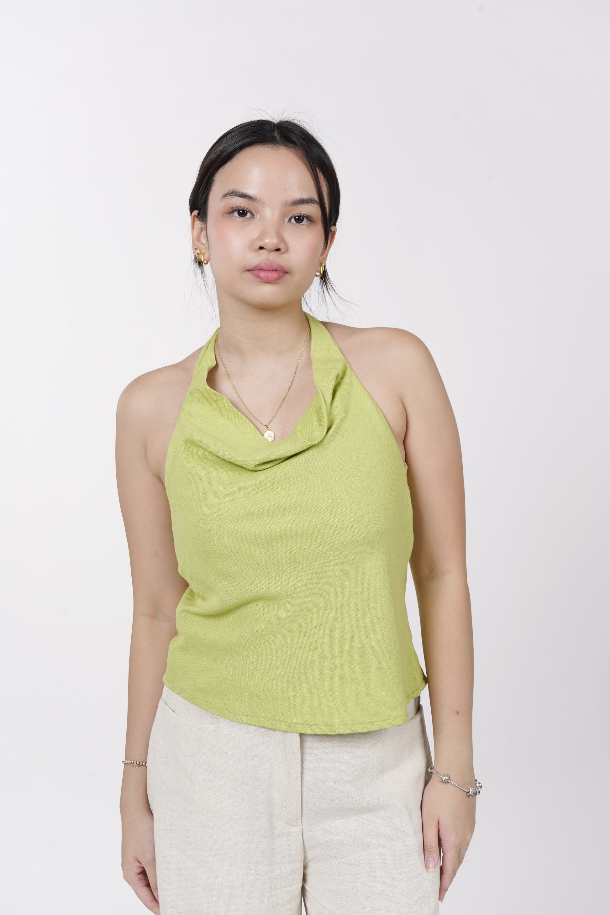 The Ivana Top features a halter cowl neck neckline with a low back. Best Paired with the Mira Pants or Thea Maxi Skirt. Made in Linen. Model wears Extra Small.