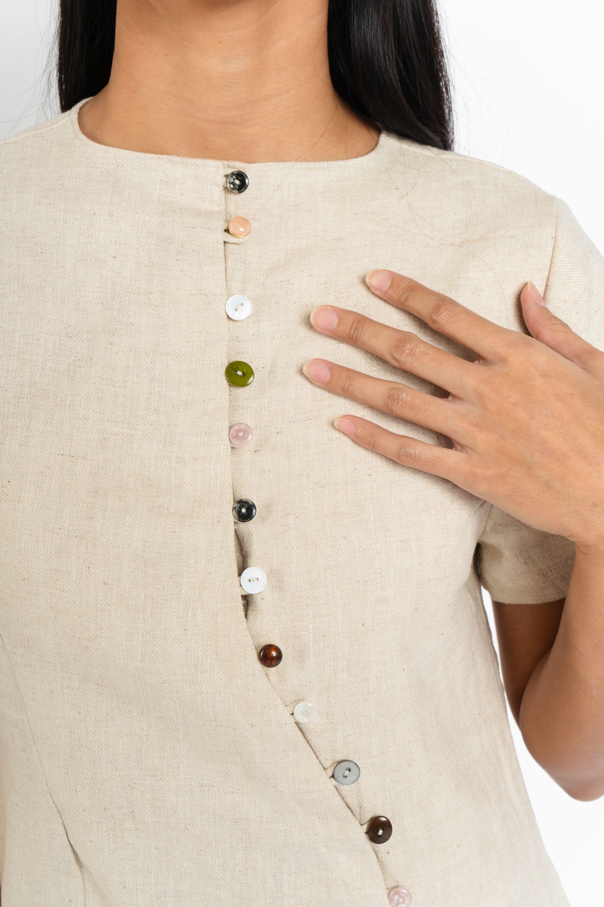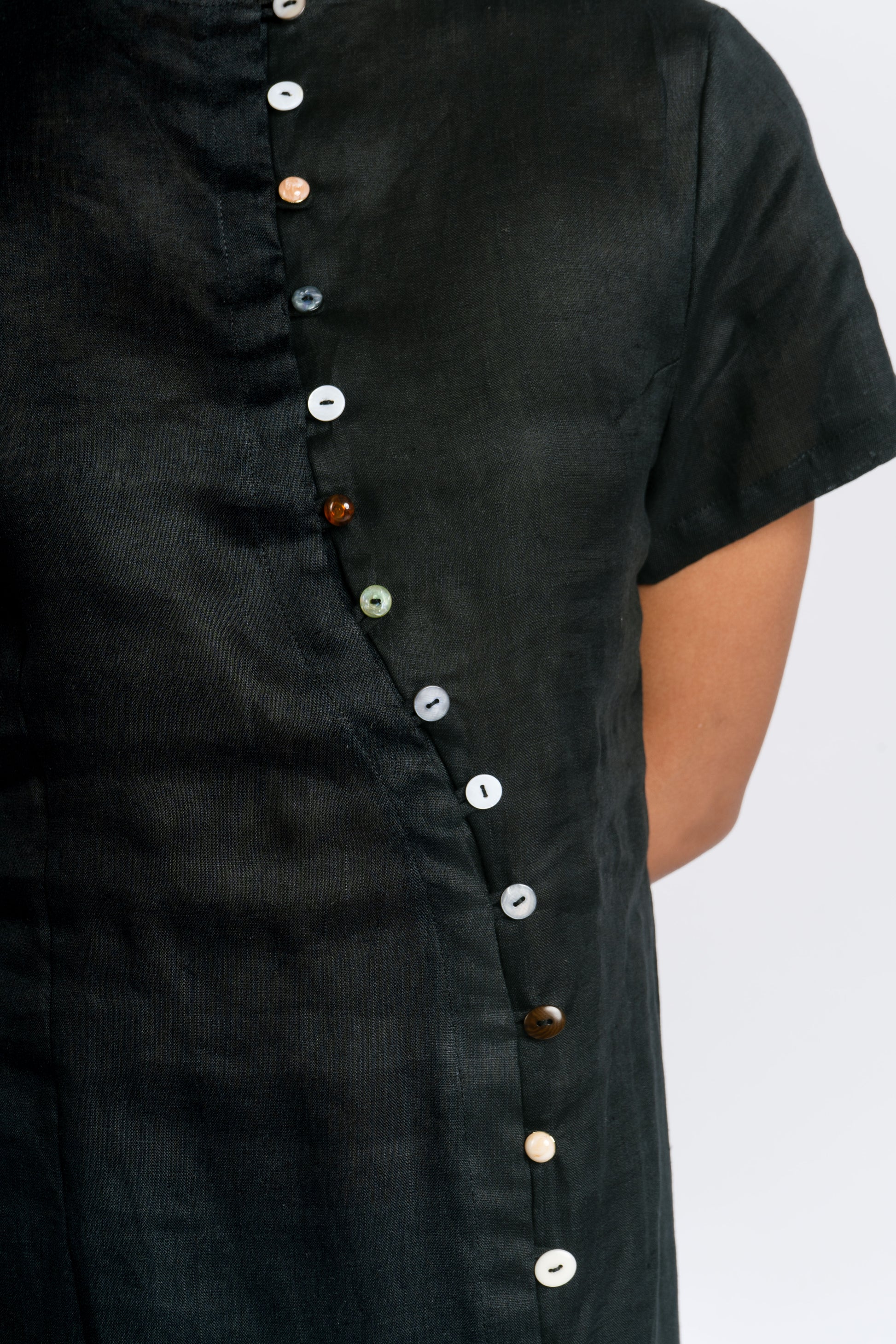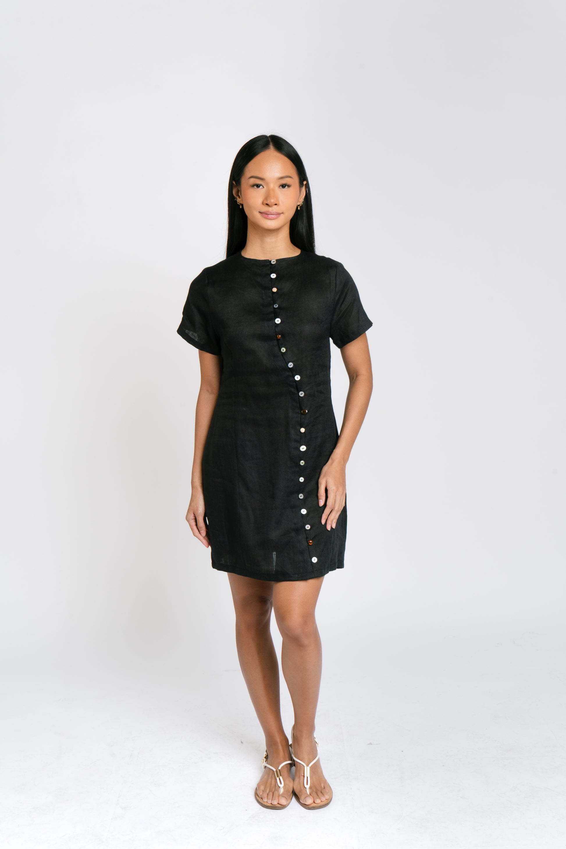 The Kaira Dress features a high neckline with a fitted silhouette. It features a wave pattern button opening with varying button styles and colors and button loops. Button patterns may change depending on the item. Made in Linen. Models wears XS.