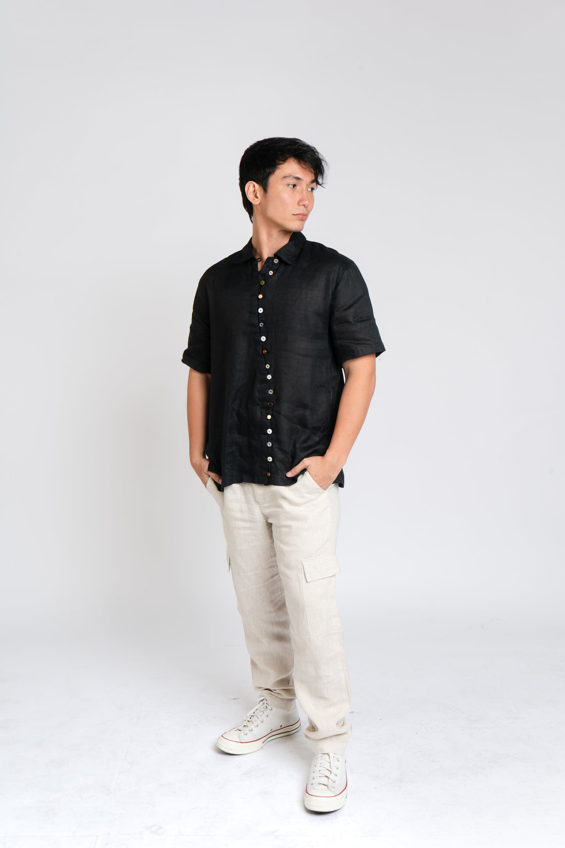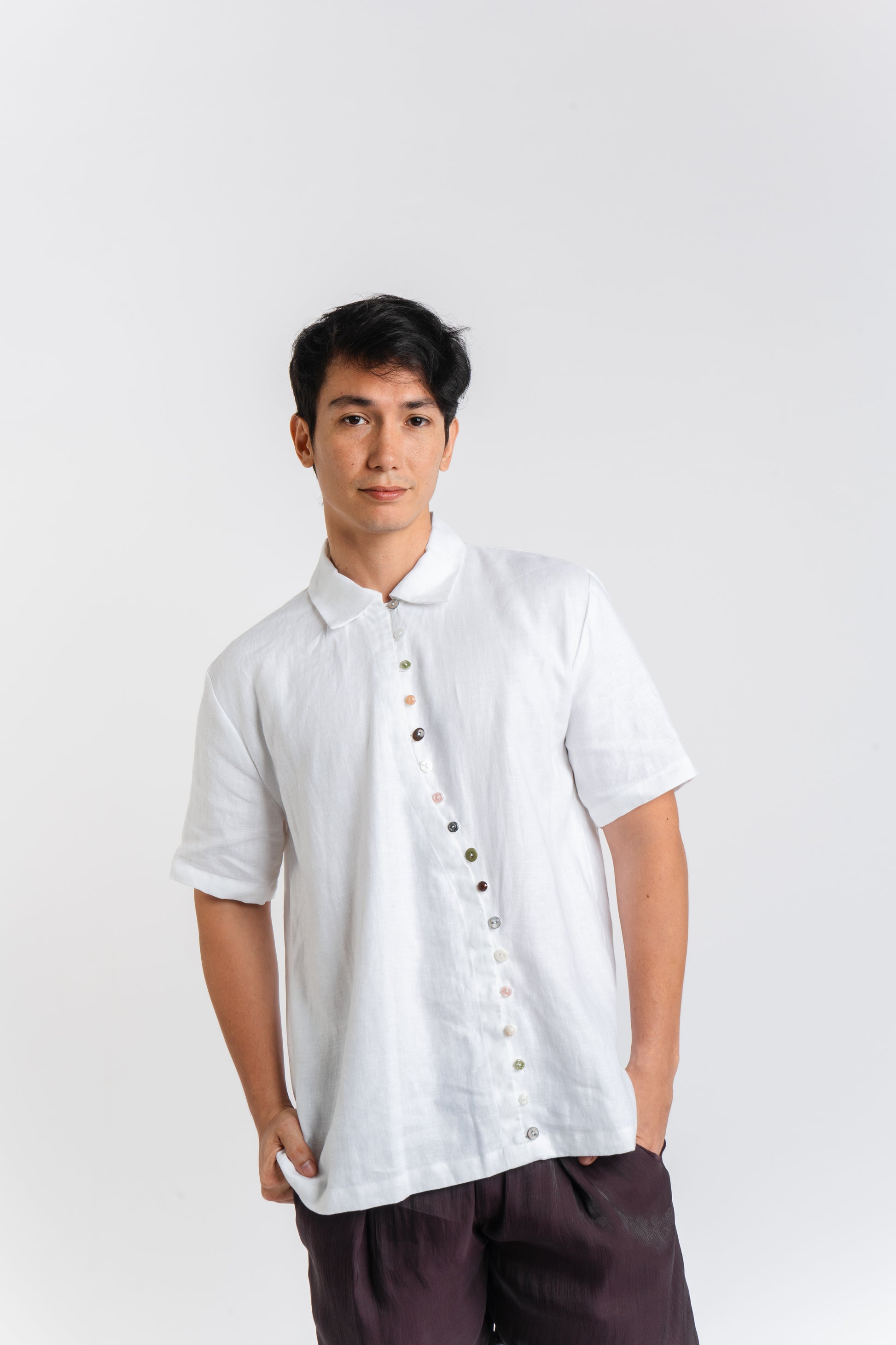 The Kairo Polo is collared top a wave pattern button opening with varying button styles and colors and button loops. Button patterns may change depending on the item. Made in Linen. Model wears M.