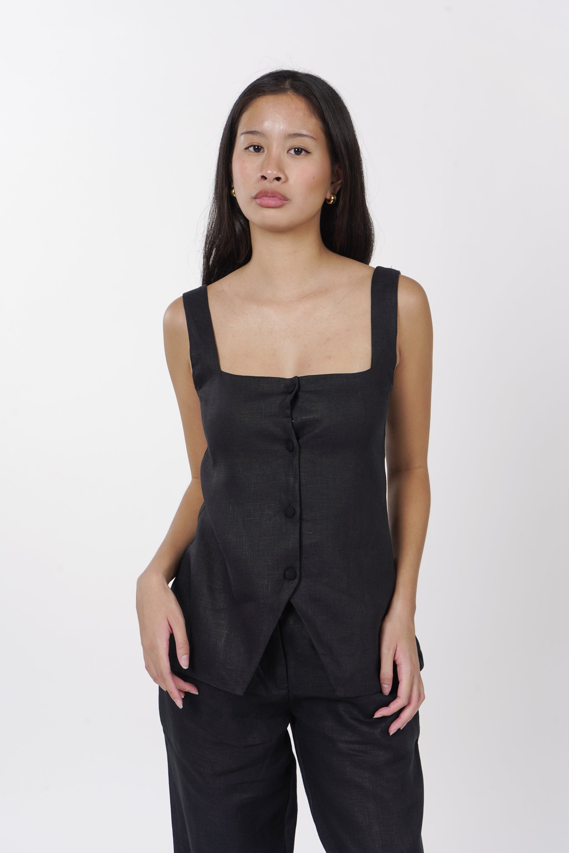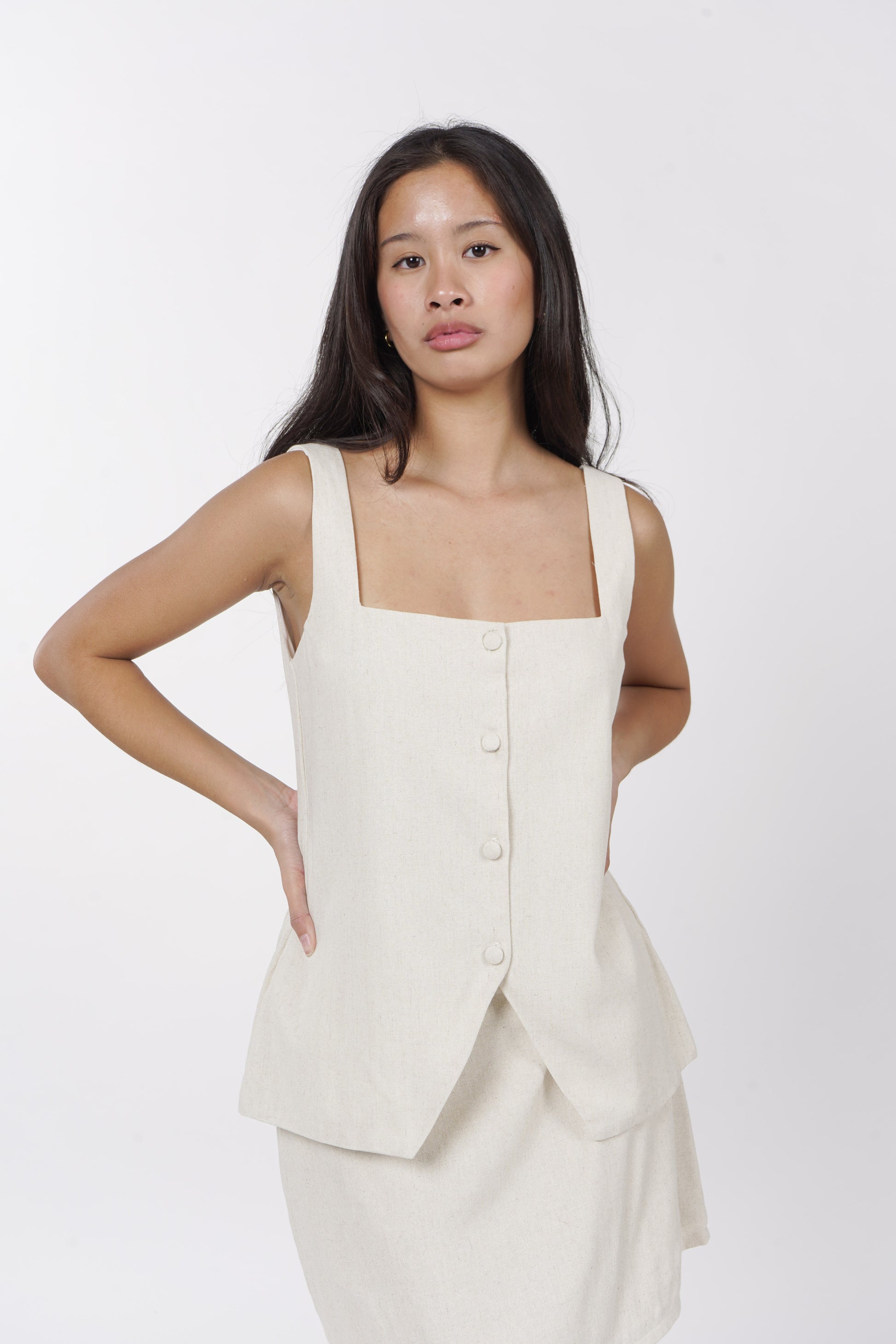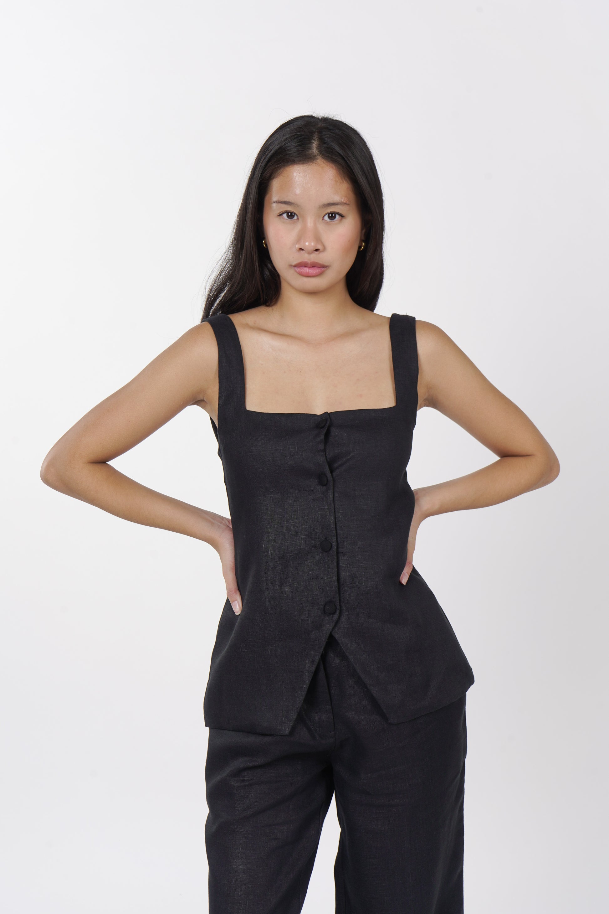A classy day to night top. The Lara Vest features a square neckline, covered buttons, a flared hemline and back slit. Best paired with the Lara Mini Skirt or Anna Pants. Model wear Extra Small. Made in Linen.