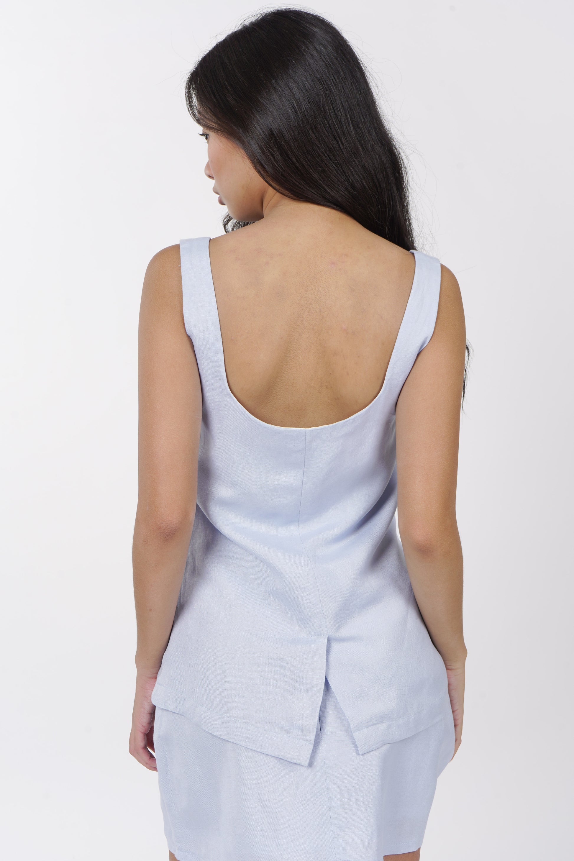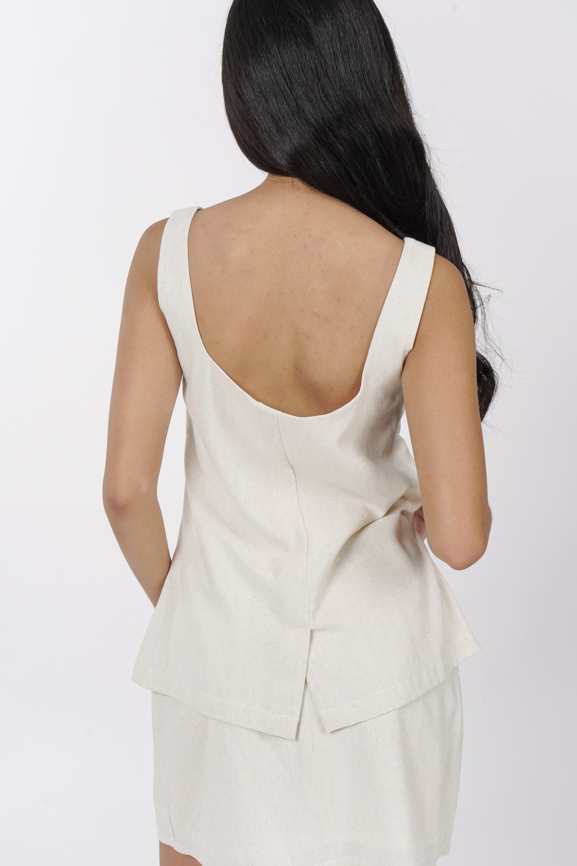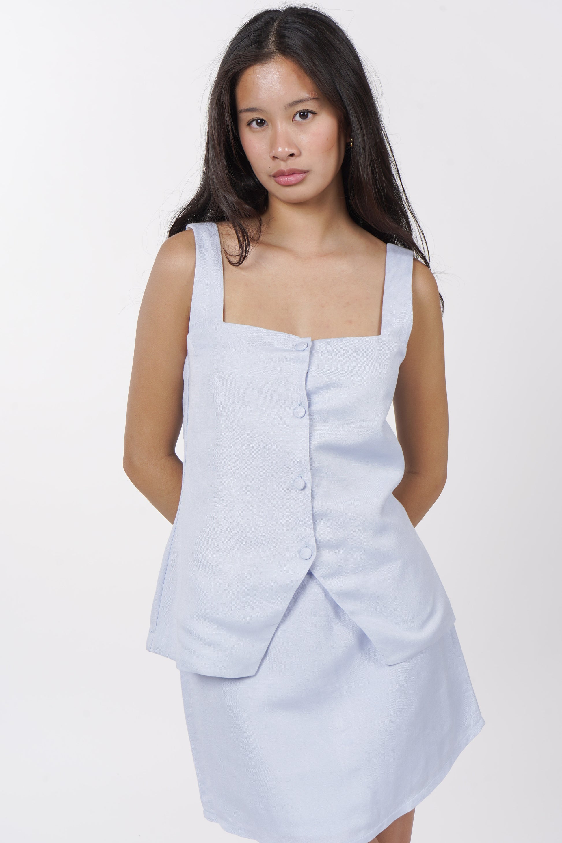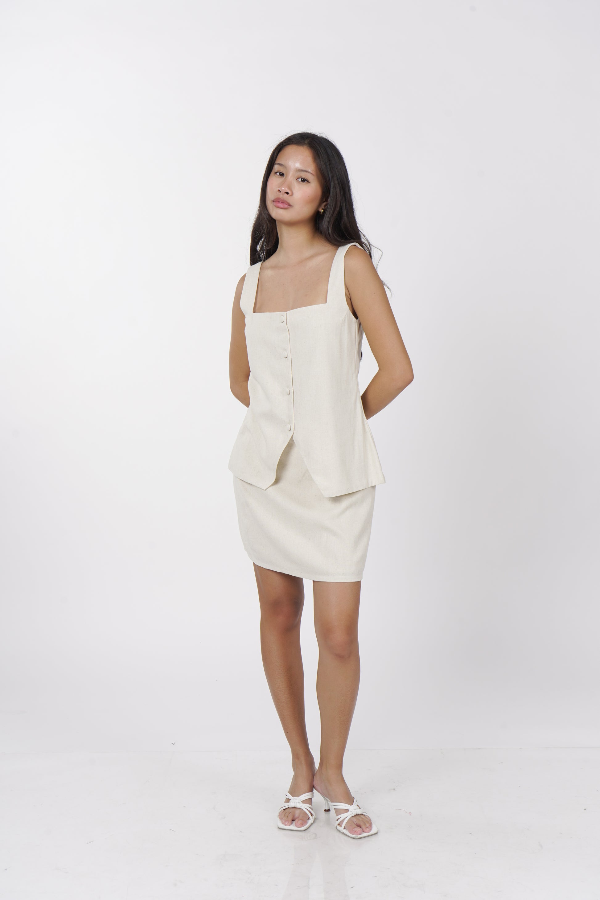 A classy day to night top. The Lara Vest features a square neckline, covered buttons, a flared hemline and back slit. Best paired with the Lara Mini Skirt or Anna Pants. Model wear Extra Small. Made in Linen.