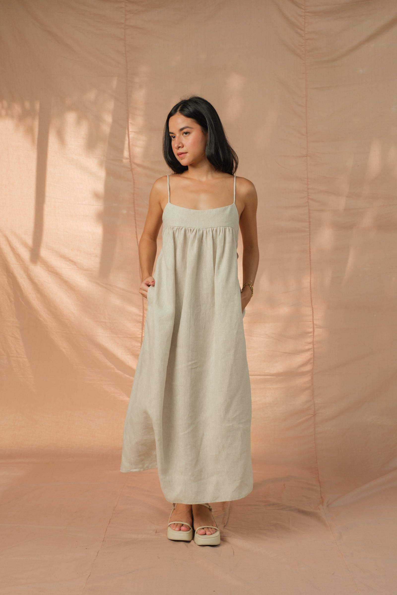Flowy maxi dress with front ruffle details. Comes with hidden pockets, fixed straps and back tie detail. Models wear Extra Small and Medium.